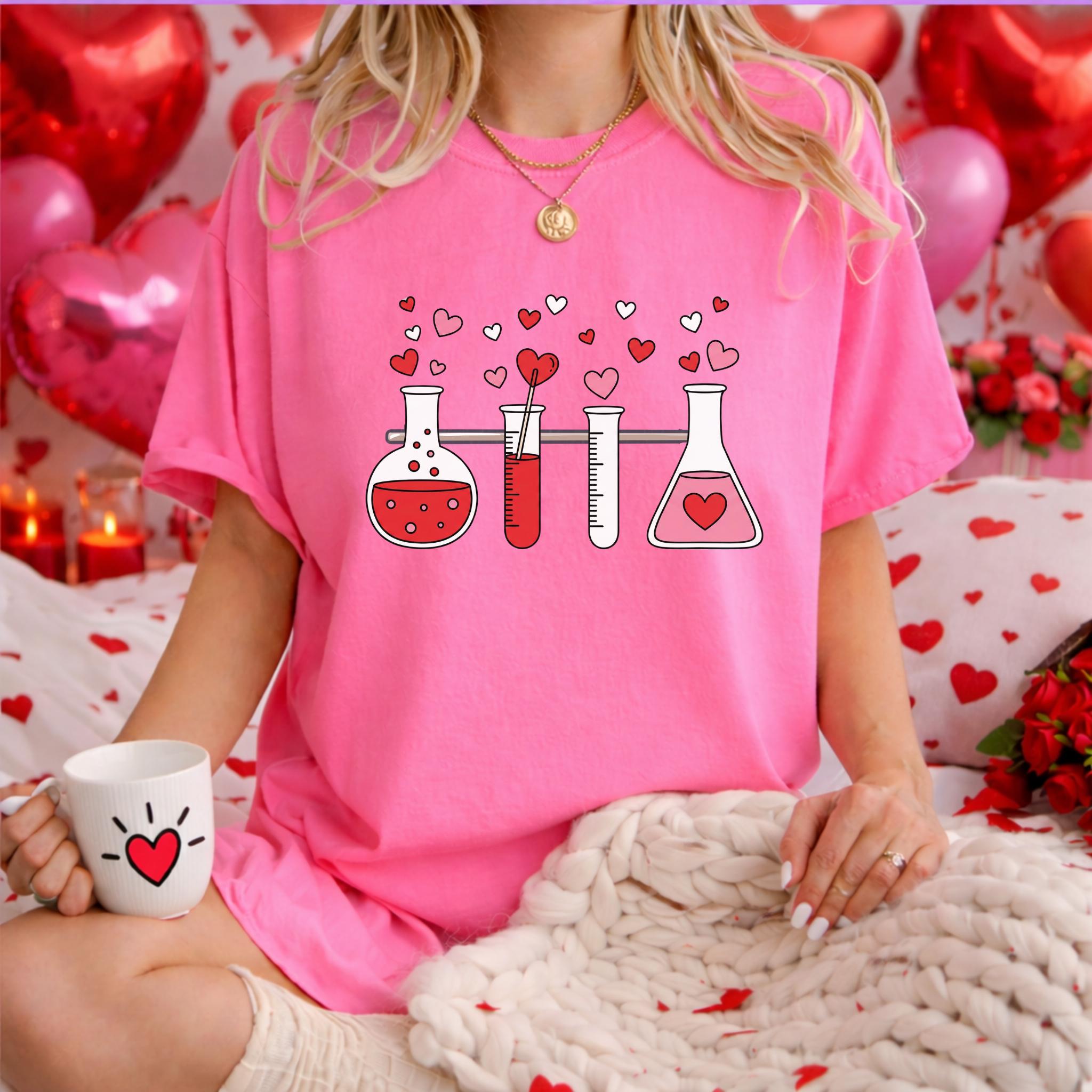 Valentine's Day Science T-Shirt with cute chemistry flasks and hearts – a perfect love-themed tee for science lovers and STEM fans.