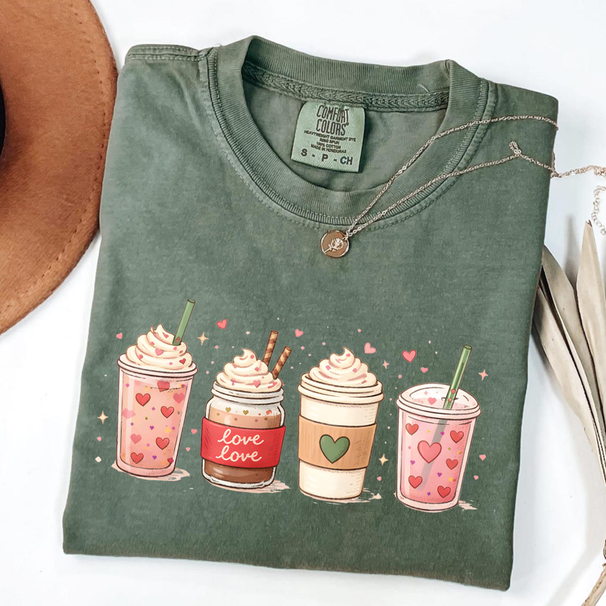 Valentine's Day Coffee T-Shirt with cute latte and coffee cups – a cozy love-themed tee for coffee lovers and cute aesthetic fans.