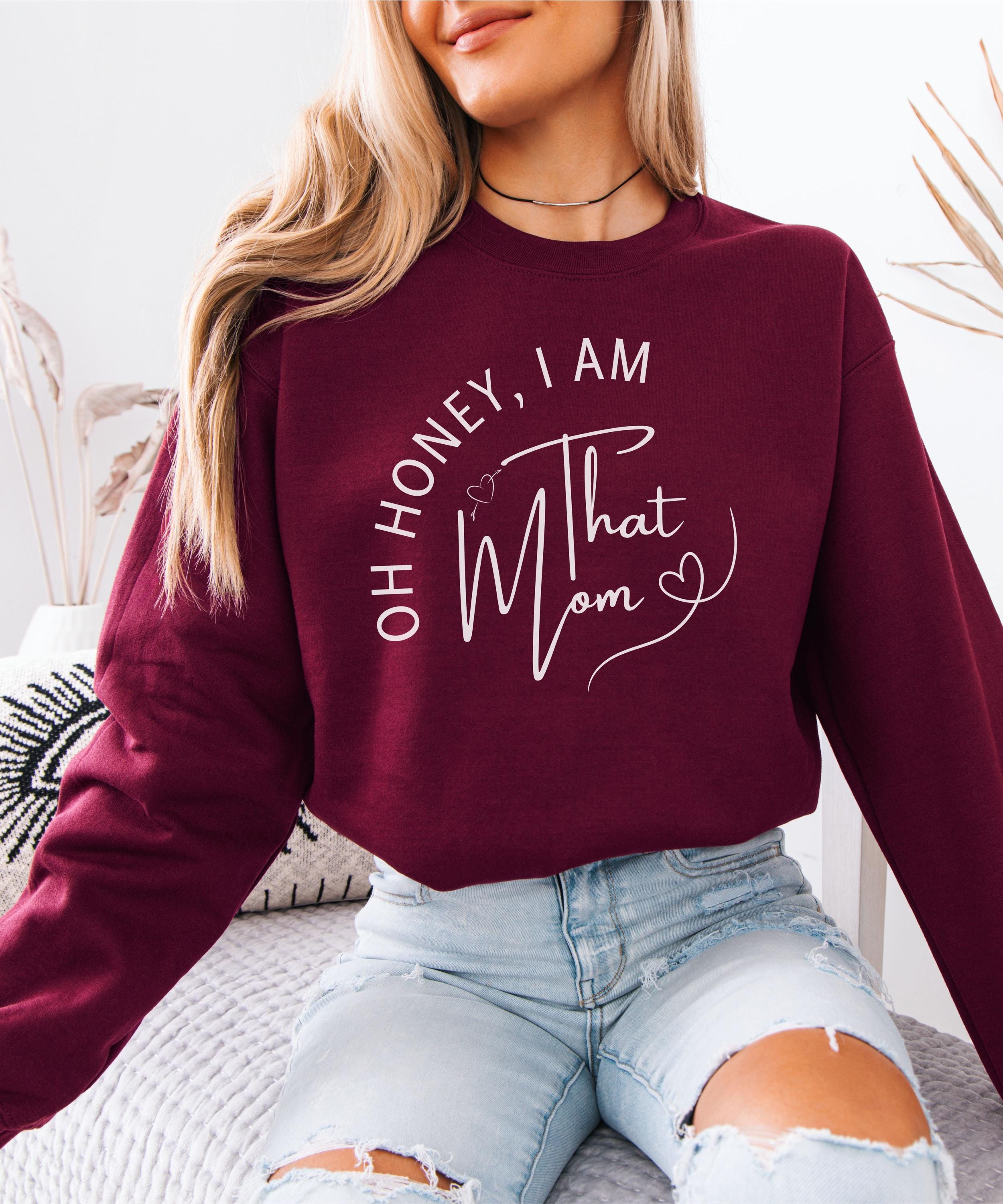 Celebrate your confident mom energy with this "Oh Honey, I Am That Mom" sweatshirt – a bold and trendy statement piece perfect for every proud, sassy, and stylish mama. Designed with a modern script font and paired with a deep burgundy tone, this cozy crewneck makes a fabulous gift for Mother’s Day, baby showers, birthdays, or just because!