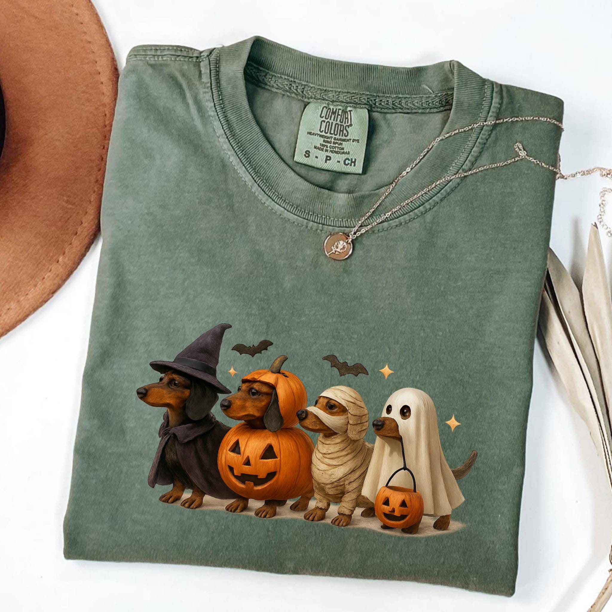 Ideal for dog moms, dachshund lovers, and Halloween enthusiasts, this tee combines cute and festive vibes, making it a perfect October outfit or gift idea.
