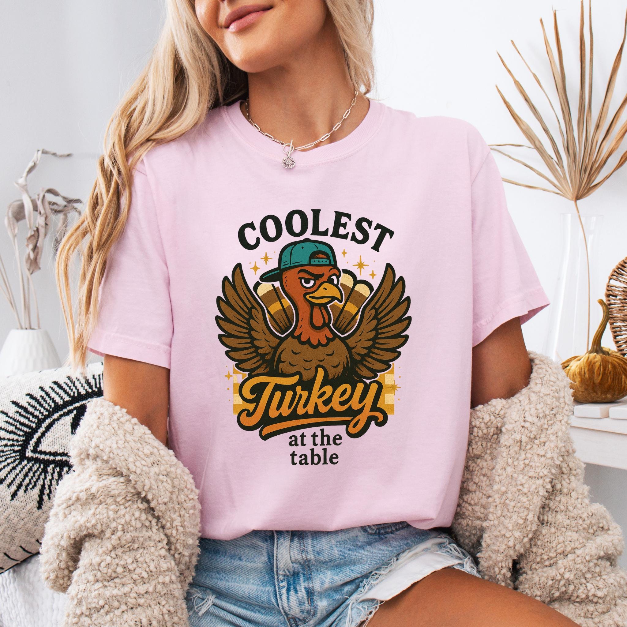 Be the star of the feast with this Coolest Turkey at the Table T-shirt! Featuring a funny cartoon turkey rocking a backwards cap, this hilarious Thanksgiving graphic tee is perfect for anyone who loves holiday humor.