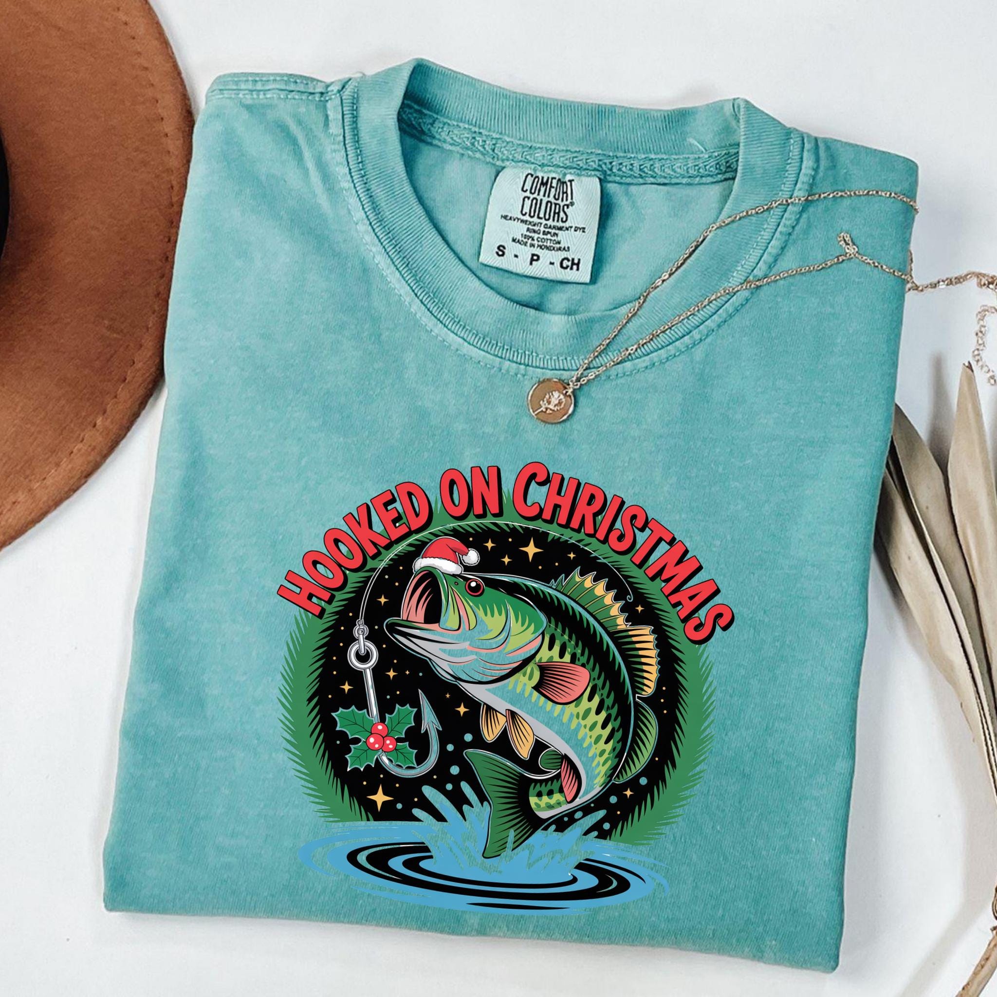 Celebrate the holidays in style with this Hooked on Christmas Fishing T-shirt! Featuring a colorful bass wearing a Santa hat and a festive fishing hook, this fun graphic tee is perfect for fishermen and holiday lovers alike.