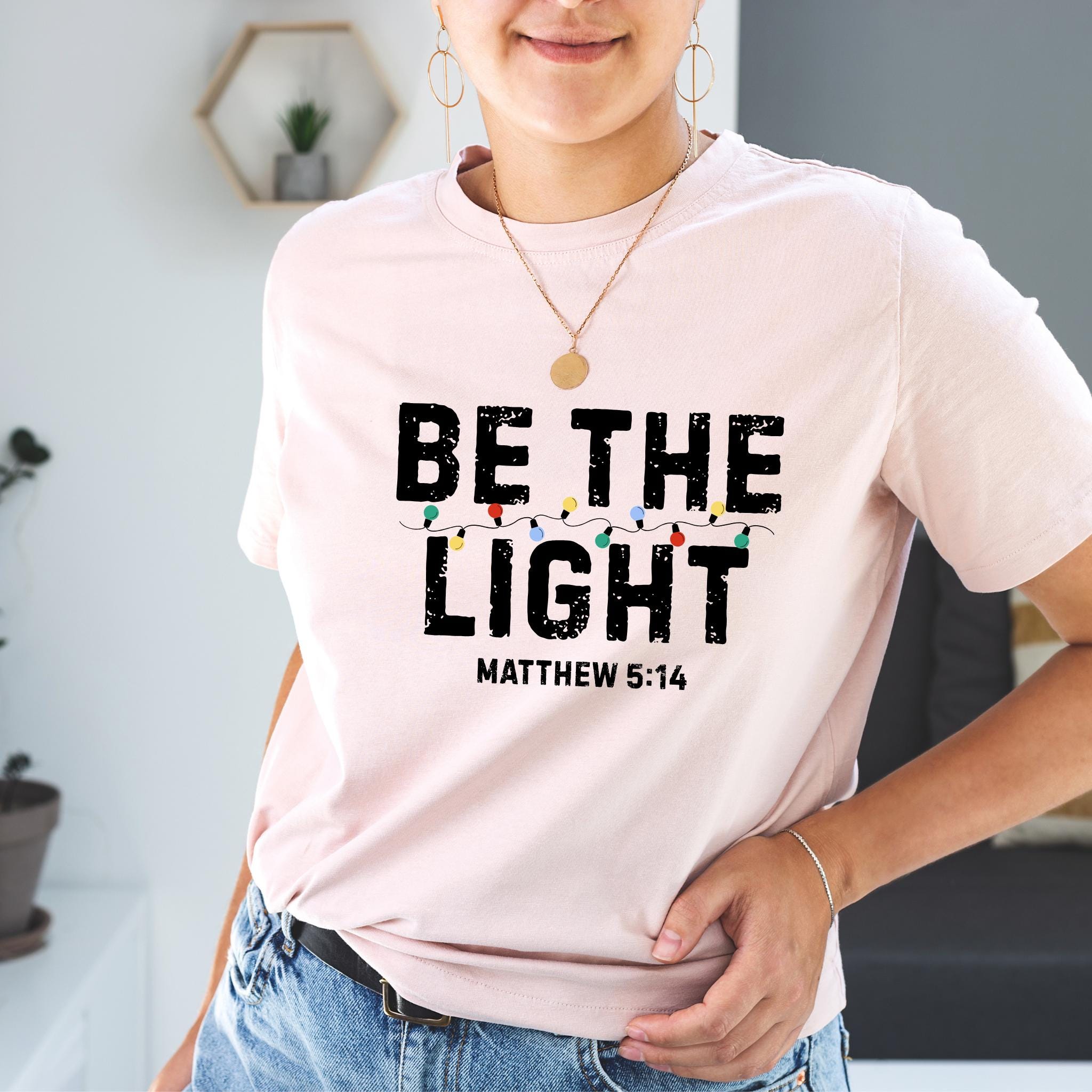 Shine bright this holiday season with our Christian Christmas shirt featuring the inspiring scripture: โBe The Light โ Matthew 5:14โ. Decorated with festive Christmas lights, this shirt is the perfect way to share your faith and joy during the holidays.