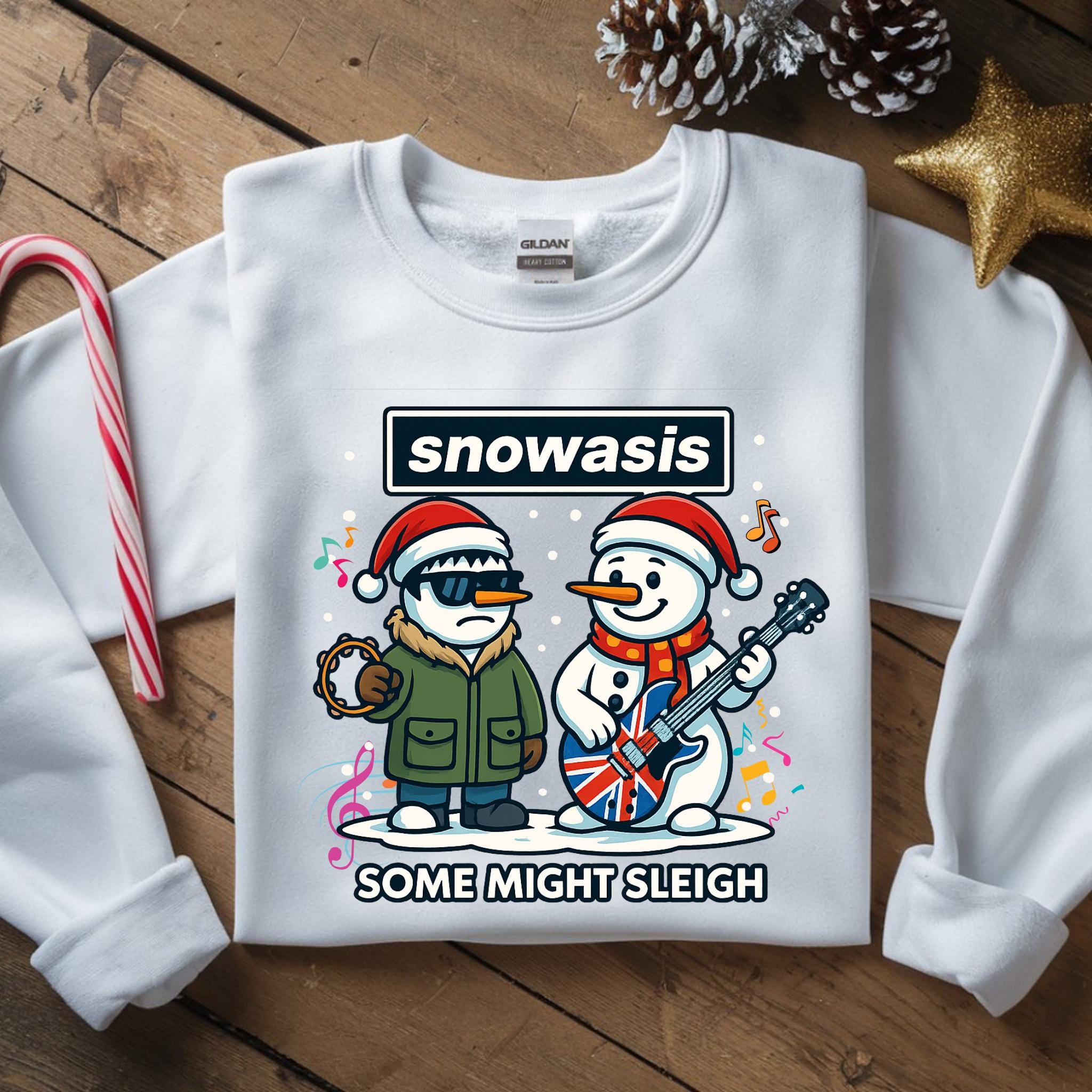 This Snowasis “Some Might Sleigh” Christmas sweatshirt features two cool snowmen styled as a parody music duo — one with sunglasses and a tambourine, the other with a Union Jack guitar. Perfect for music fans, Christmas parties, and ugly sweater events.