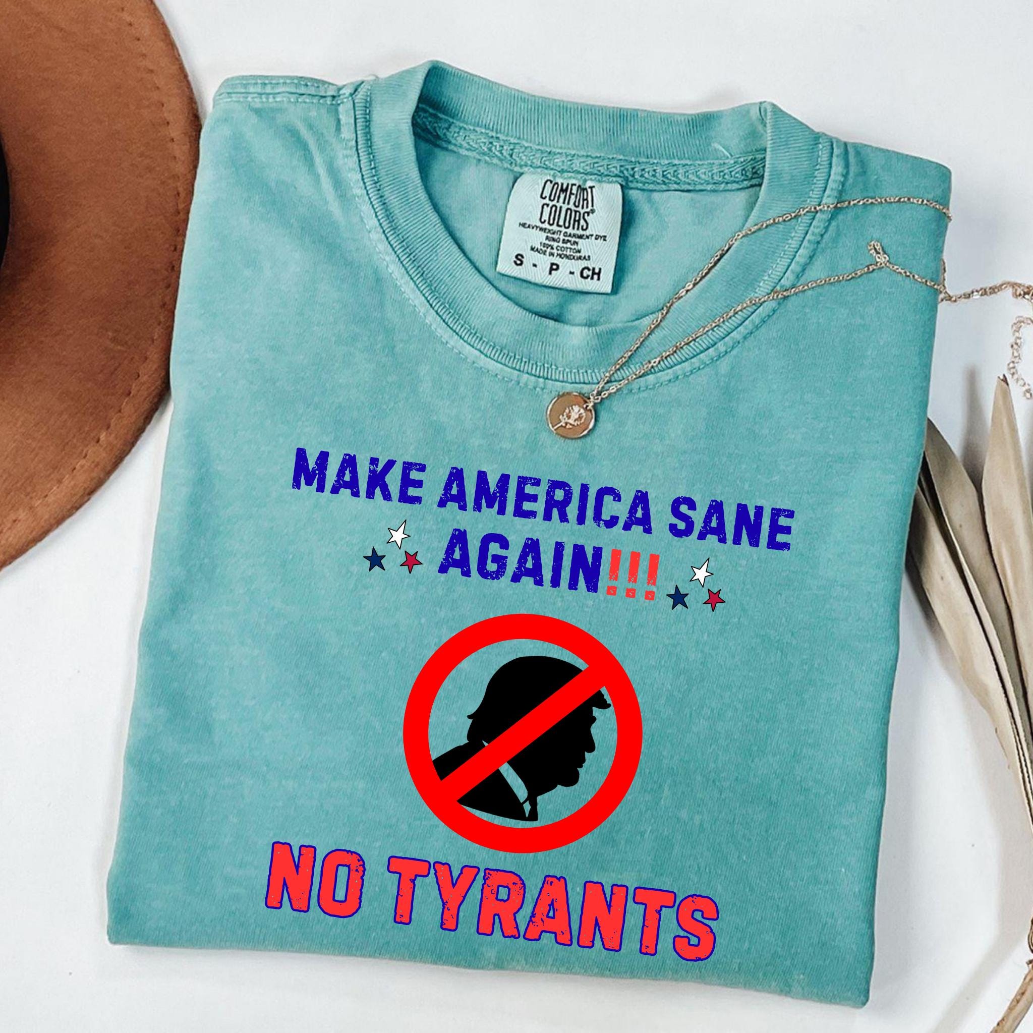 This bold “Make America Sane Again – No Tyrants” T-Shirt is the perfect way to express your voice. Featuring a vintage-style typography with patriotic red, white, and blue tones, this design makes a clear statement: no dictators, no tyranny, only freedom and reason.