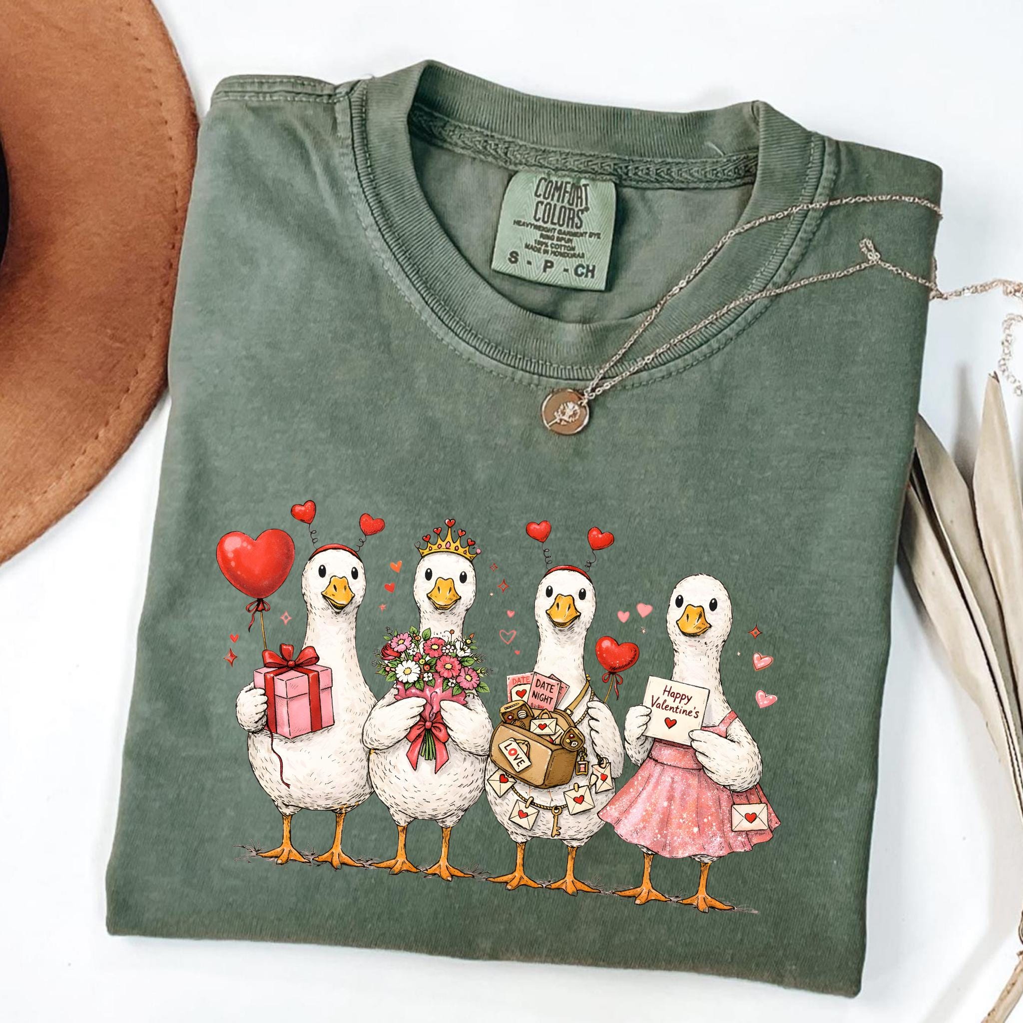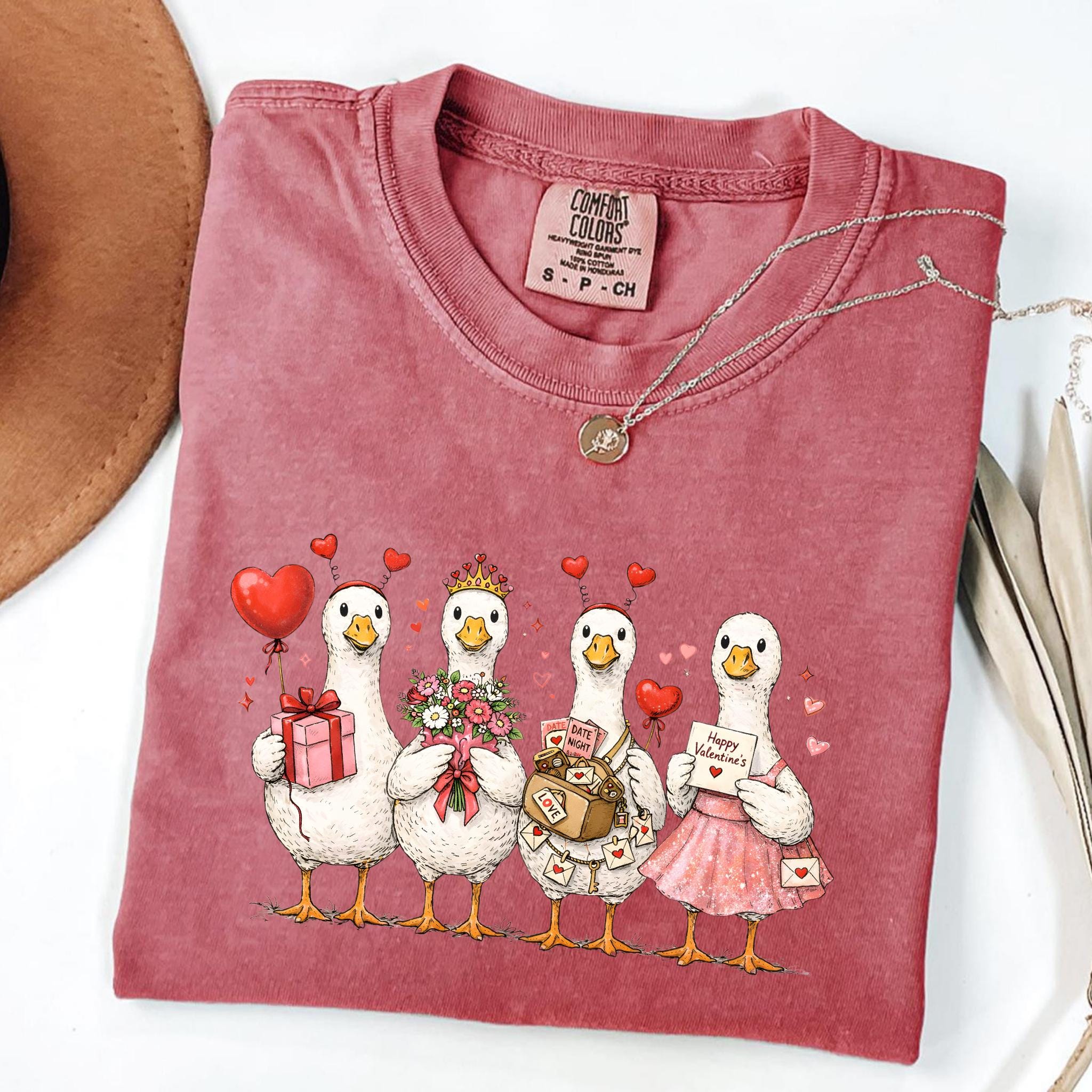 This cute goose Valentine design features a charming group of illustrated geese holding gifts, flowers, letters, and hearts, creating a warm and whimsical Valentine’s Day scene. Each character adds personality, making the design feel playful, sweet, and full of love.