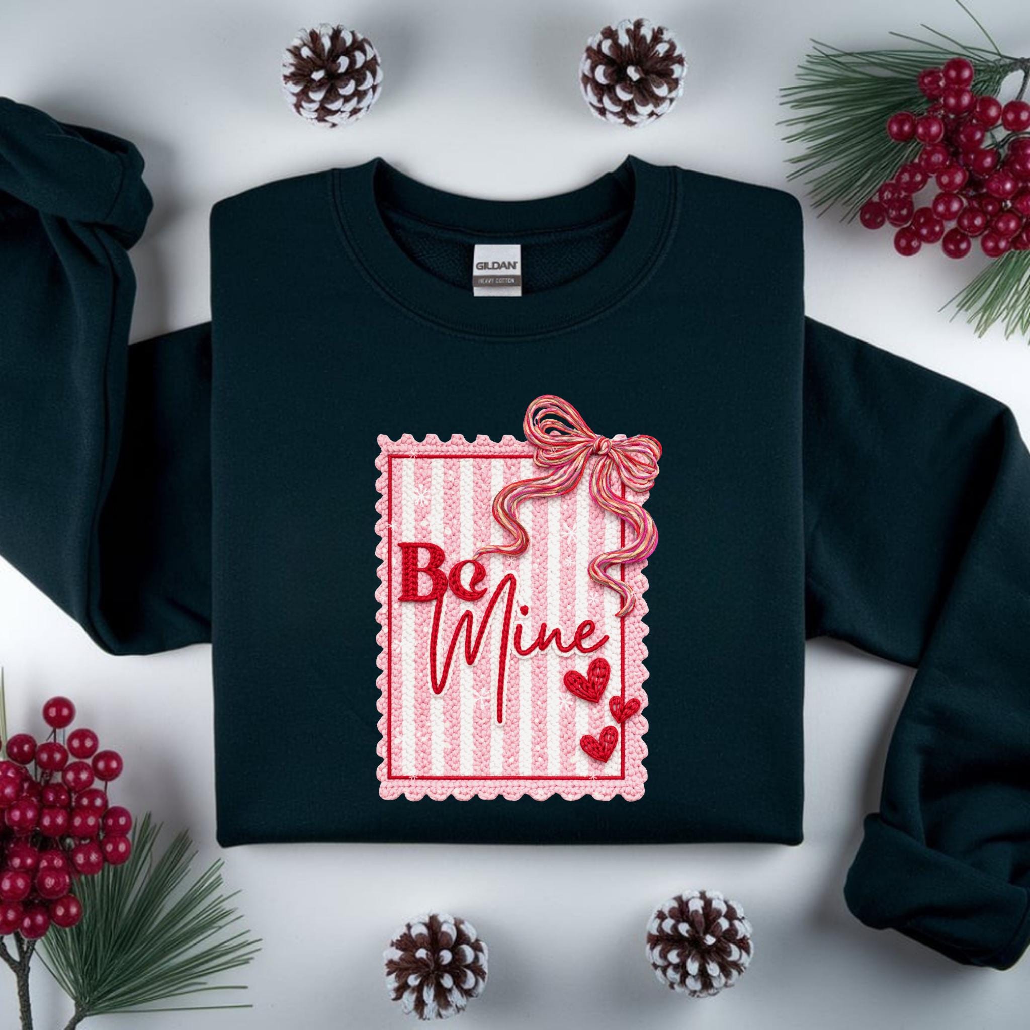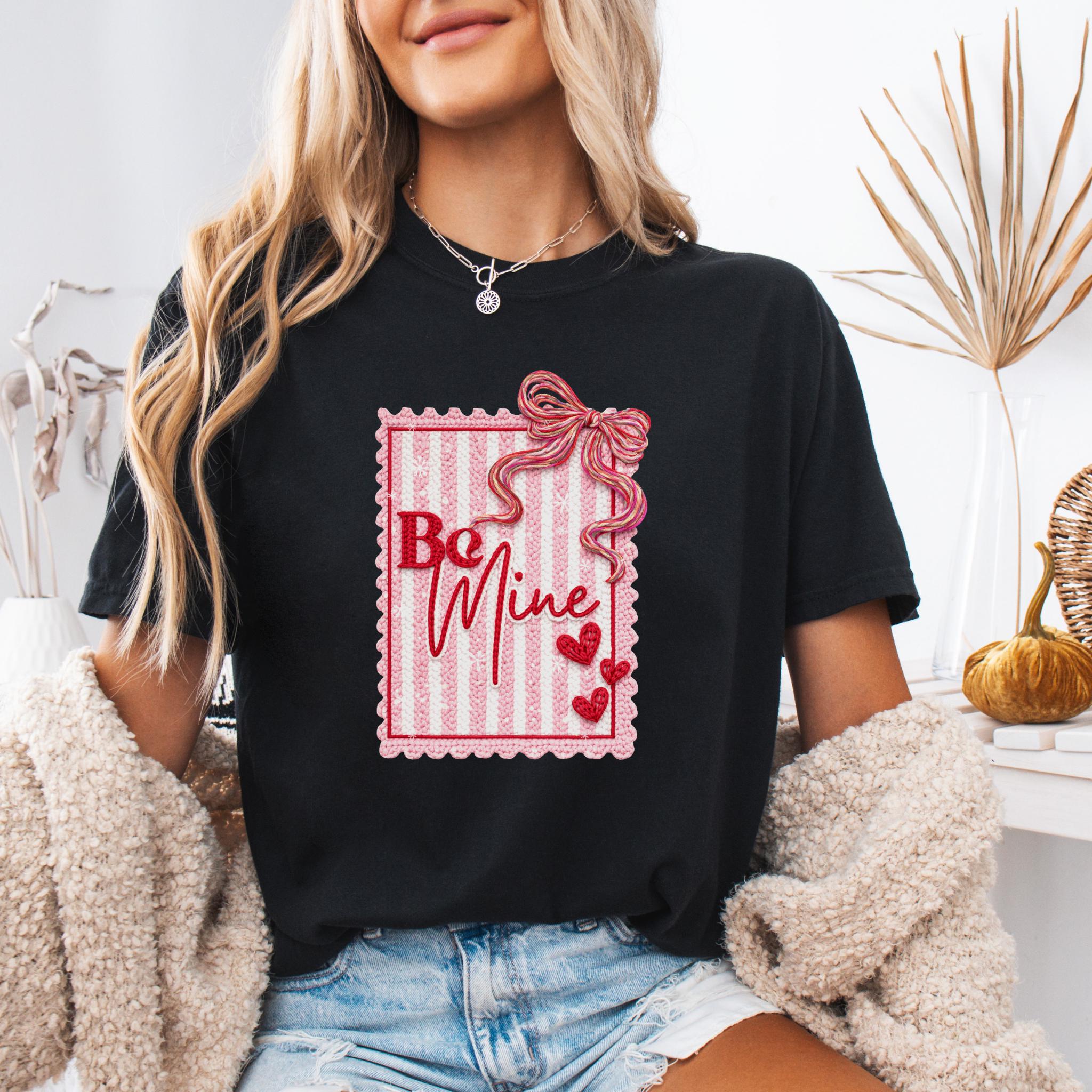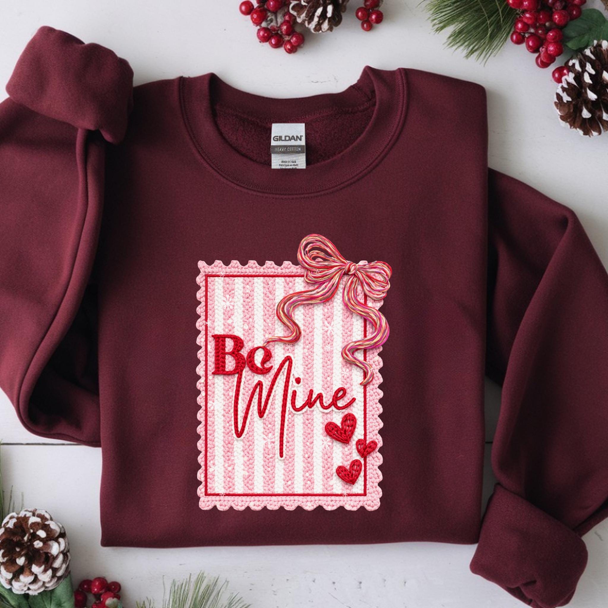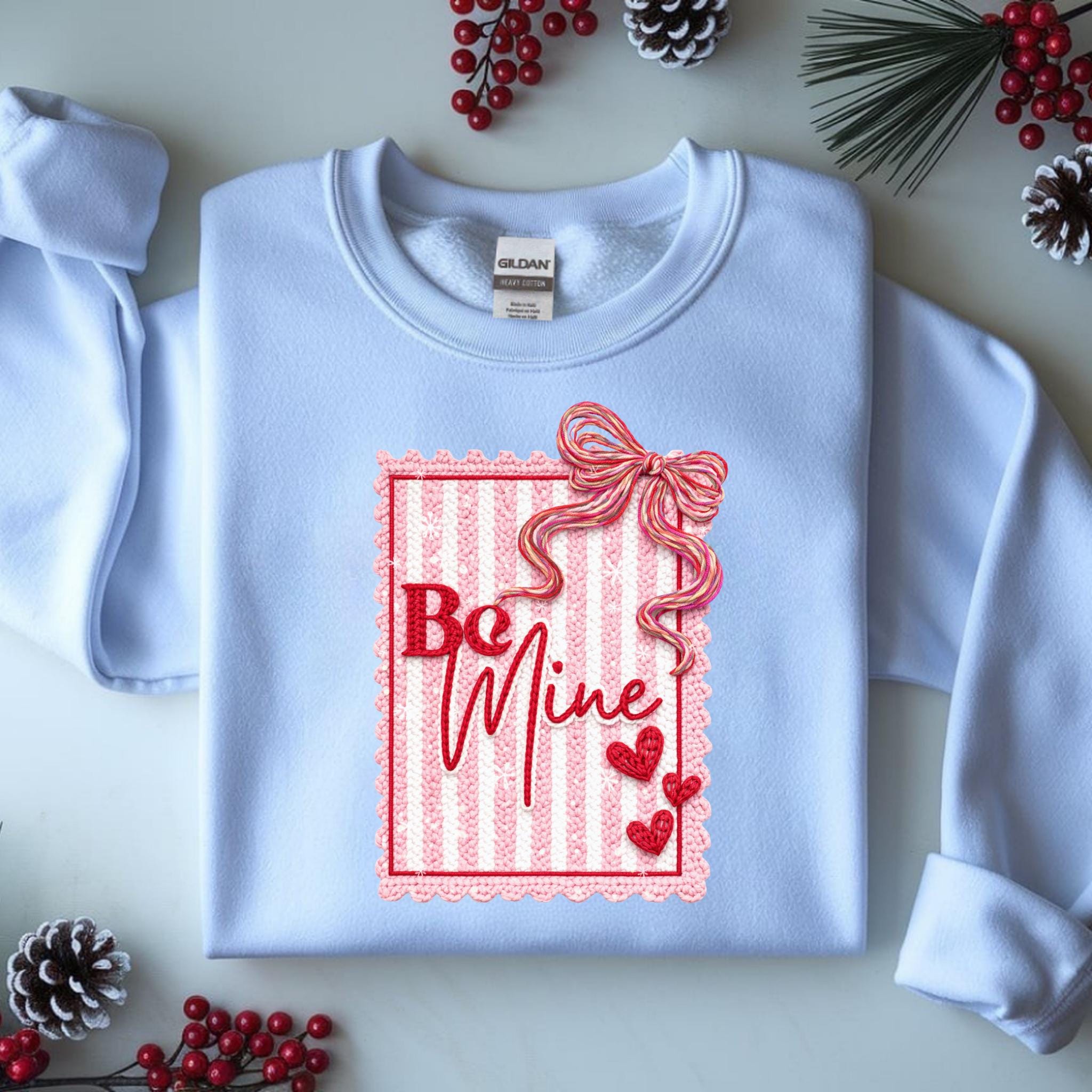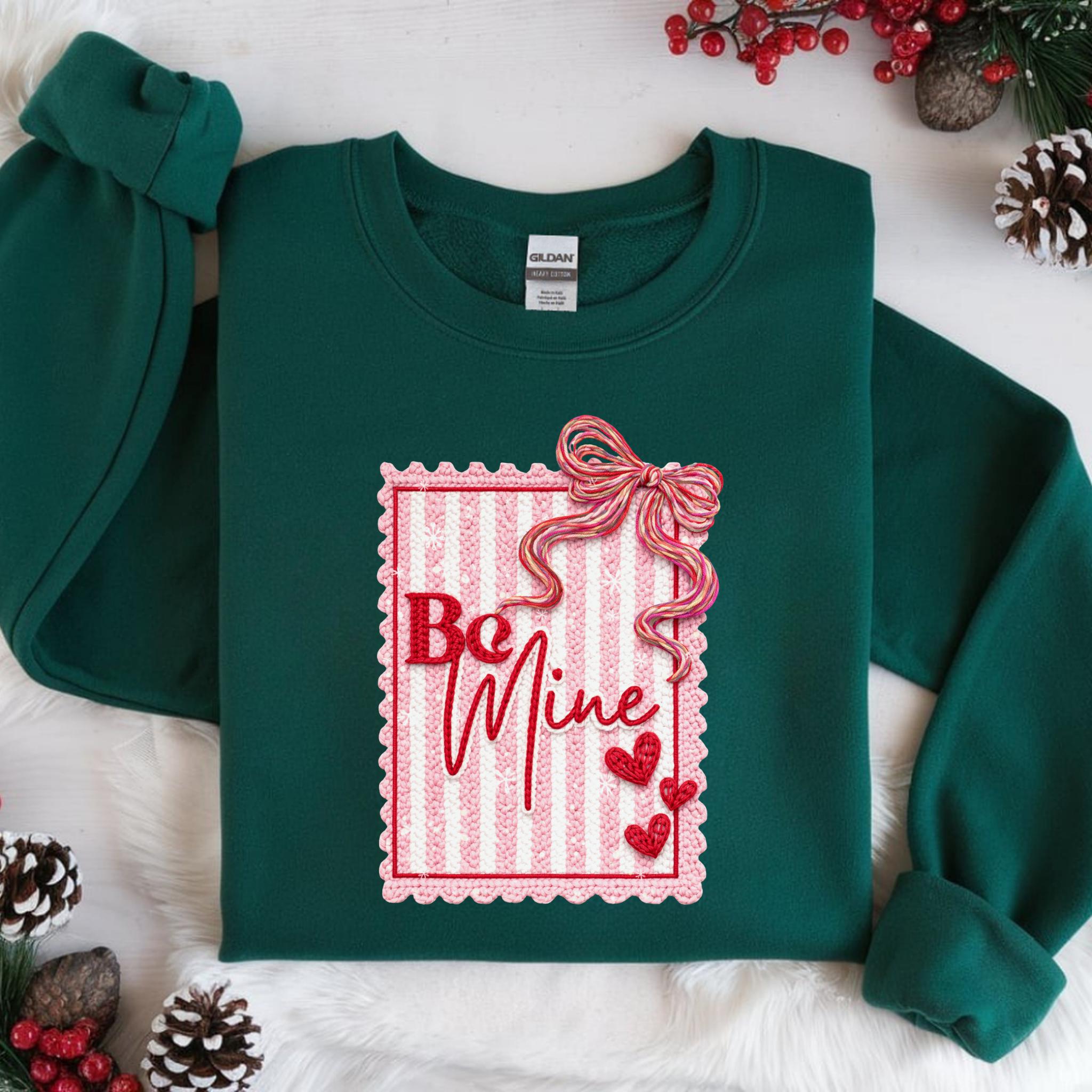 This Be Mine Valentine Sweatshirt features a charming faux yarn Valentine design with soft textures, heart details, and a cozy handmade aesthetic. The illustration mimics the look of stitched and faux yarn-crafted elements, creating a warm and romantic feel that’s perfect for Valentine’s Day and beyond.