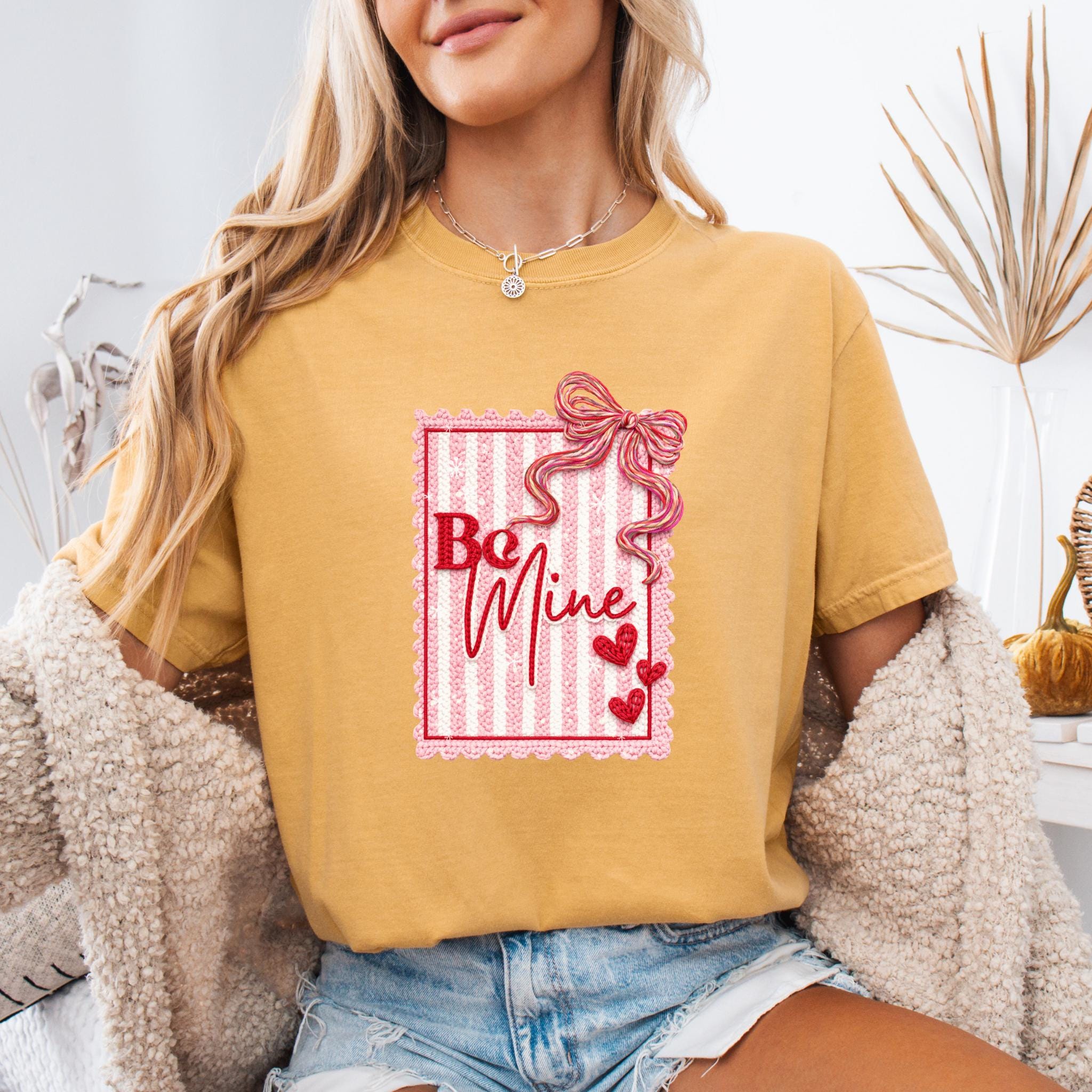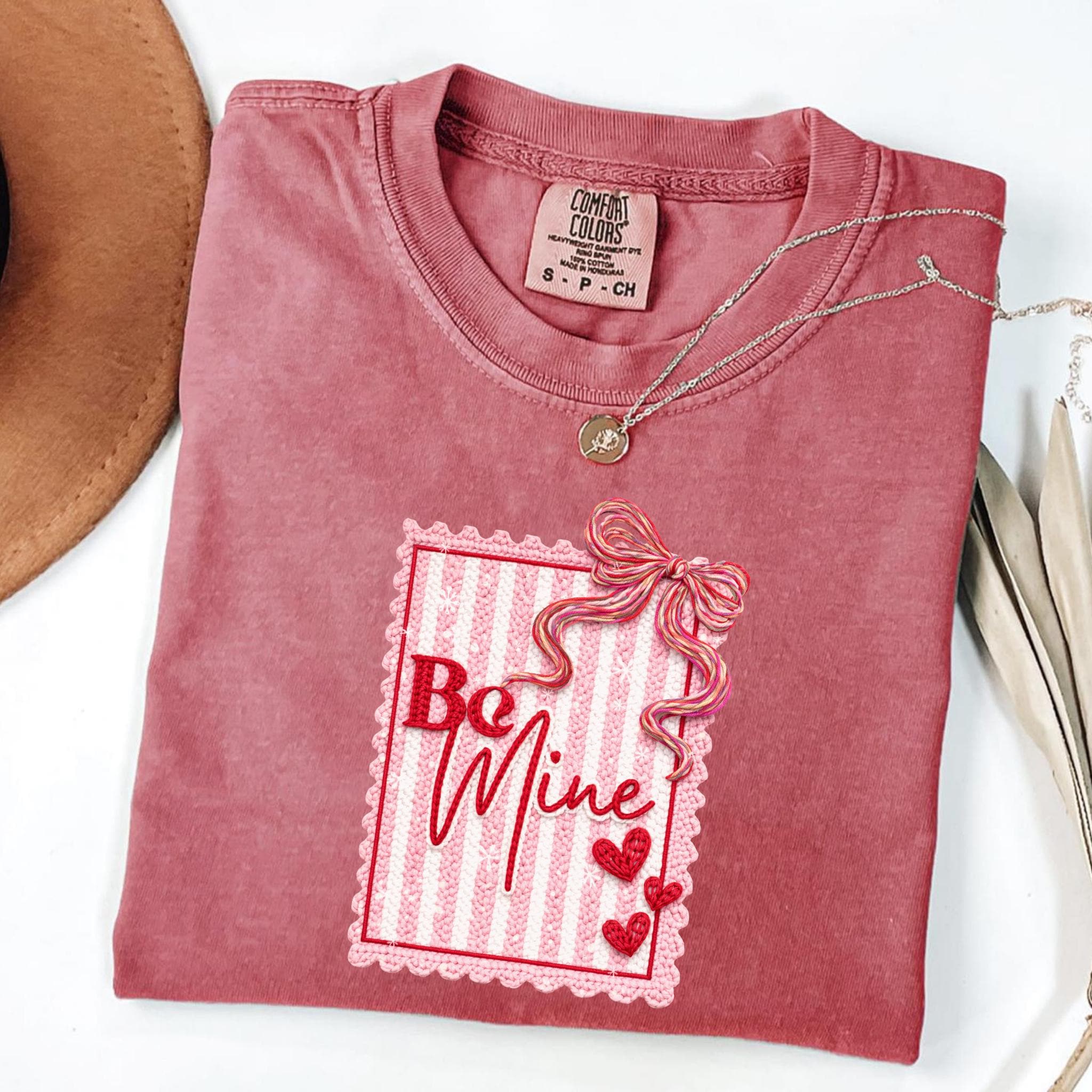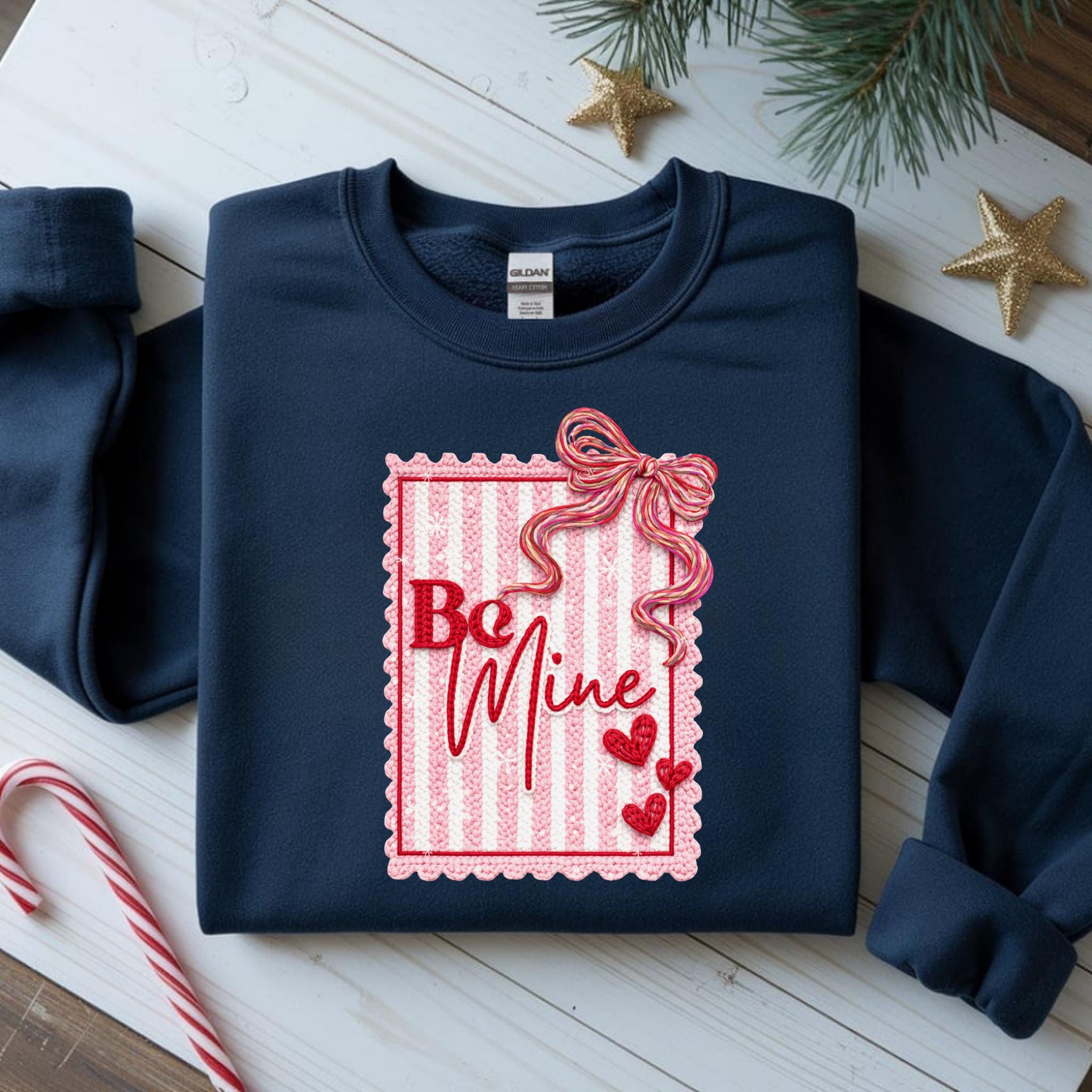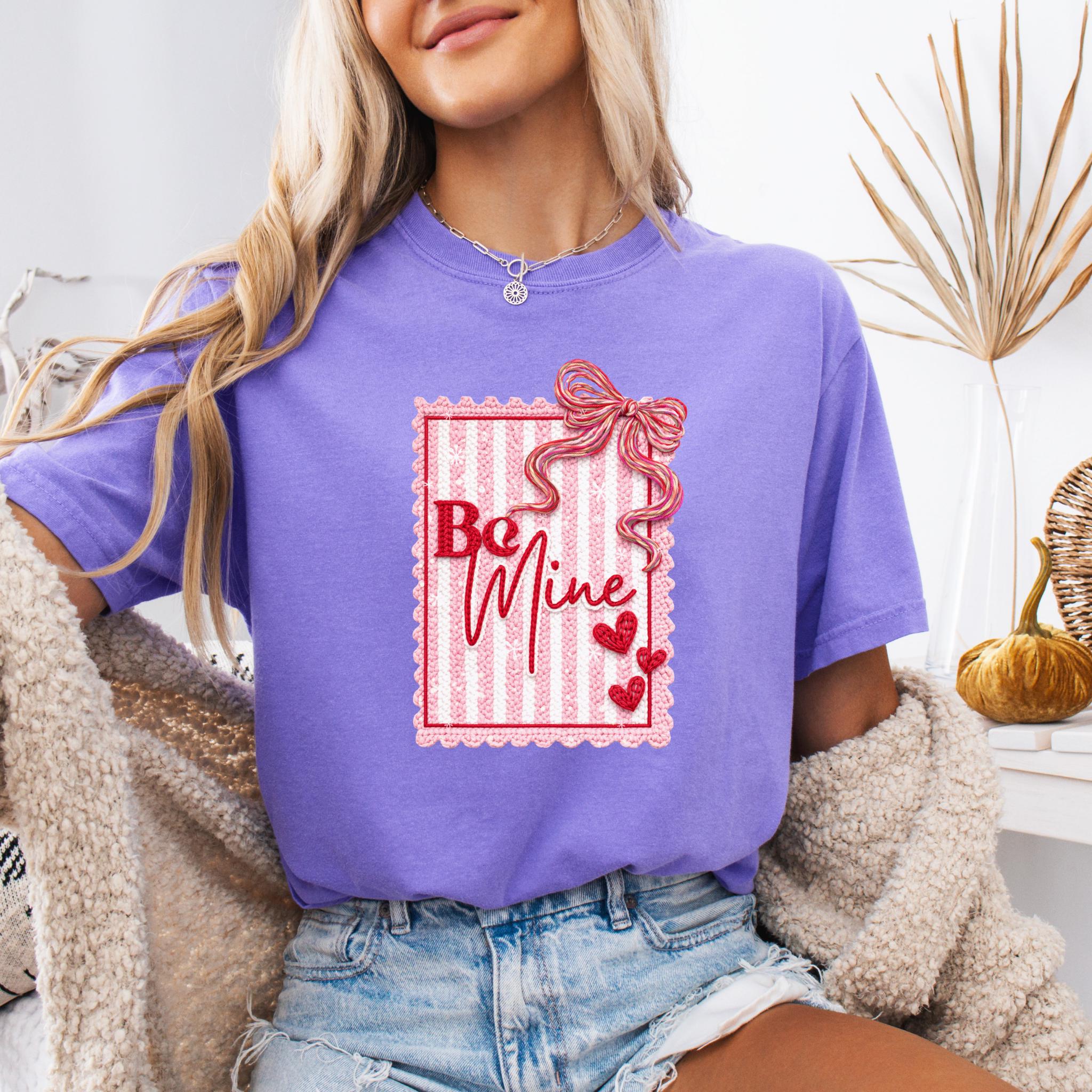 This Be Mine Valentine Sweatshirt features a charming faux yarn Valentine design with soft textures, heart details, and a cozy handmade aesthetic. The illustration mimics the look of stitched and faux yarn-crafted elements, creating a warm and romantic feel that’s perfect for Valentine’s Day and beyond.