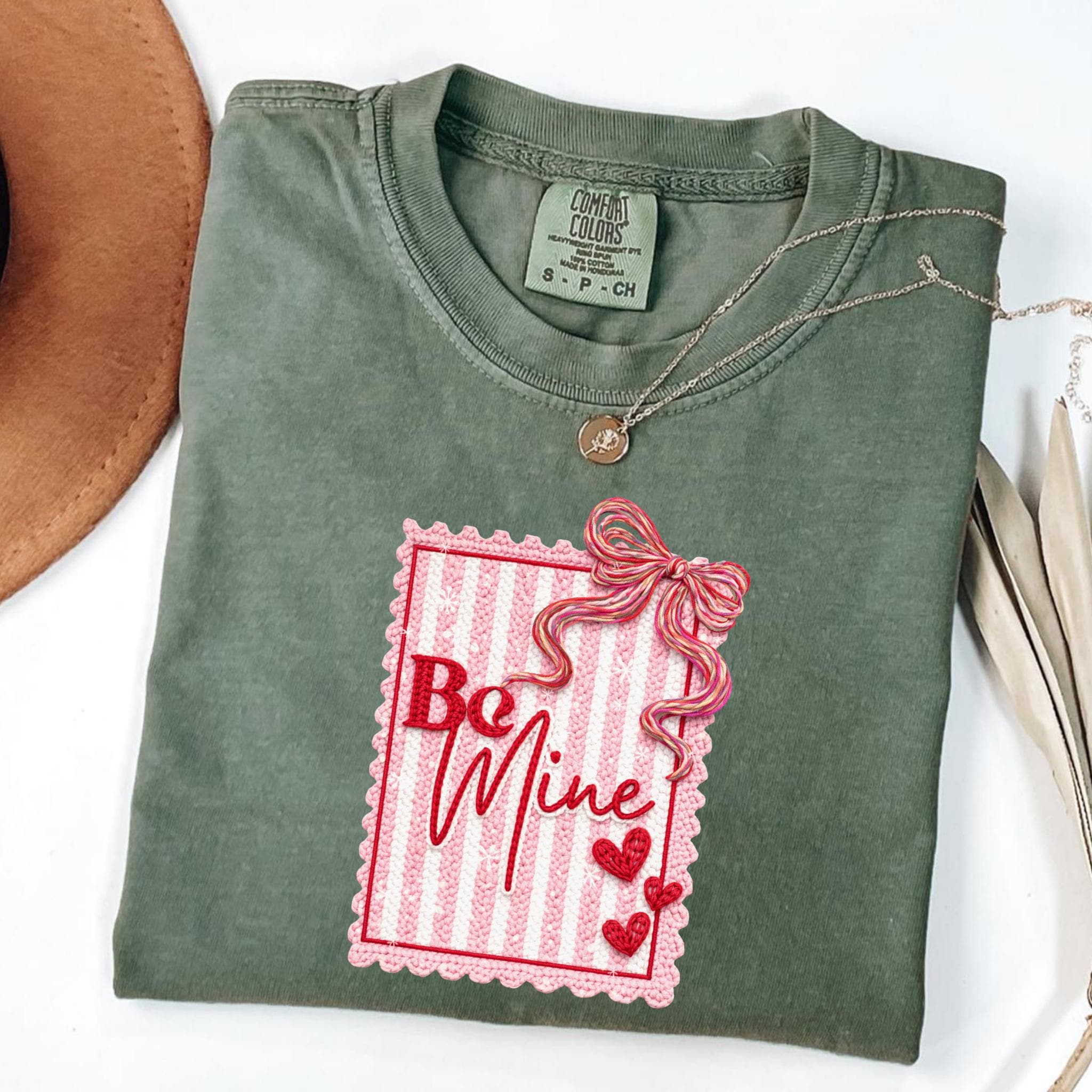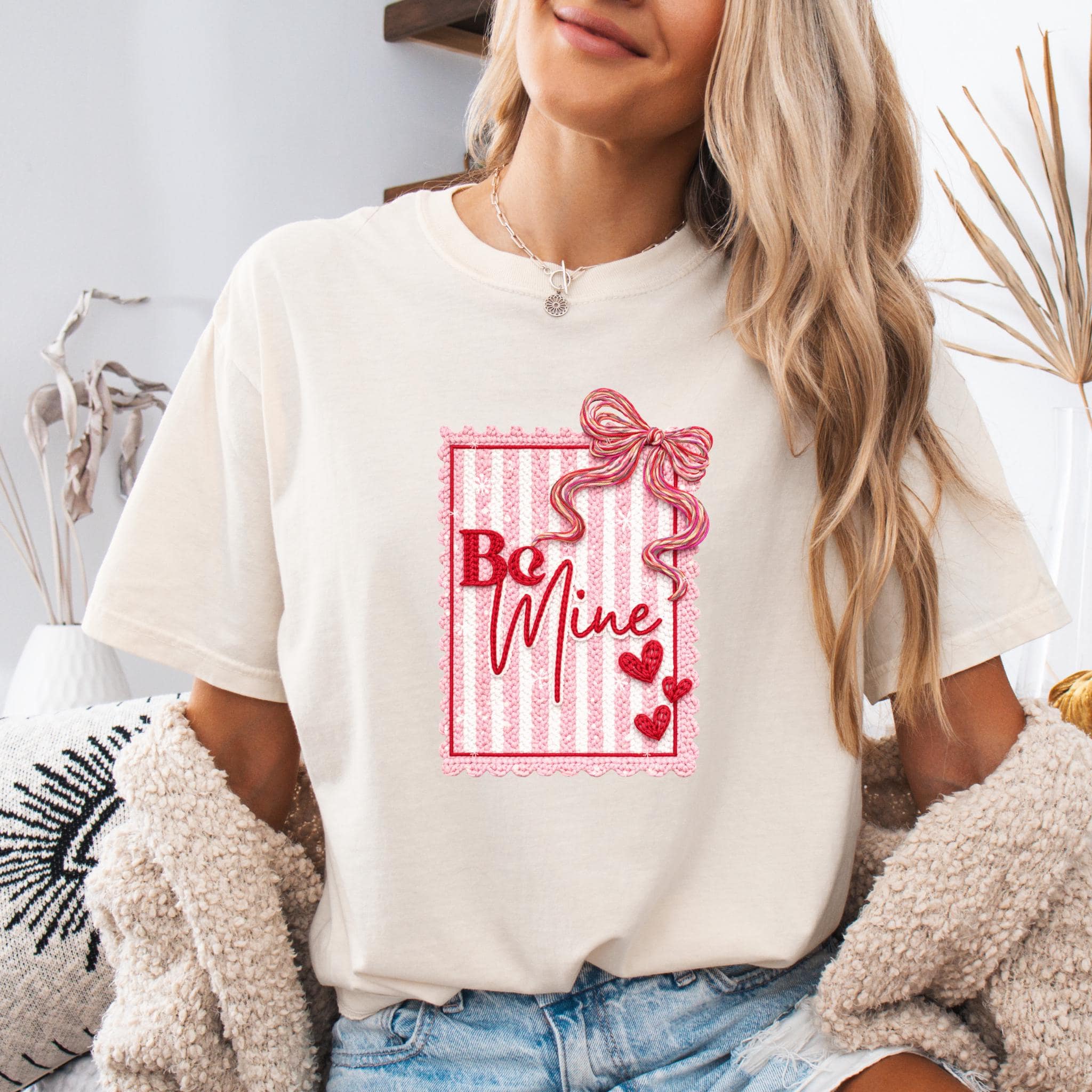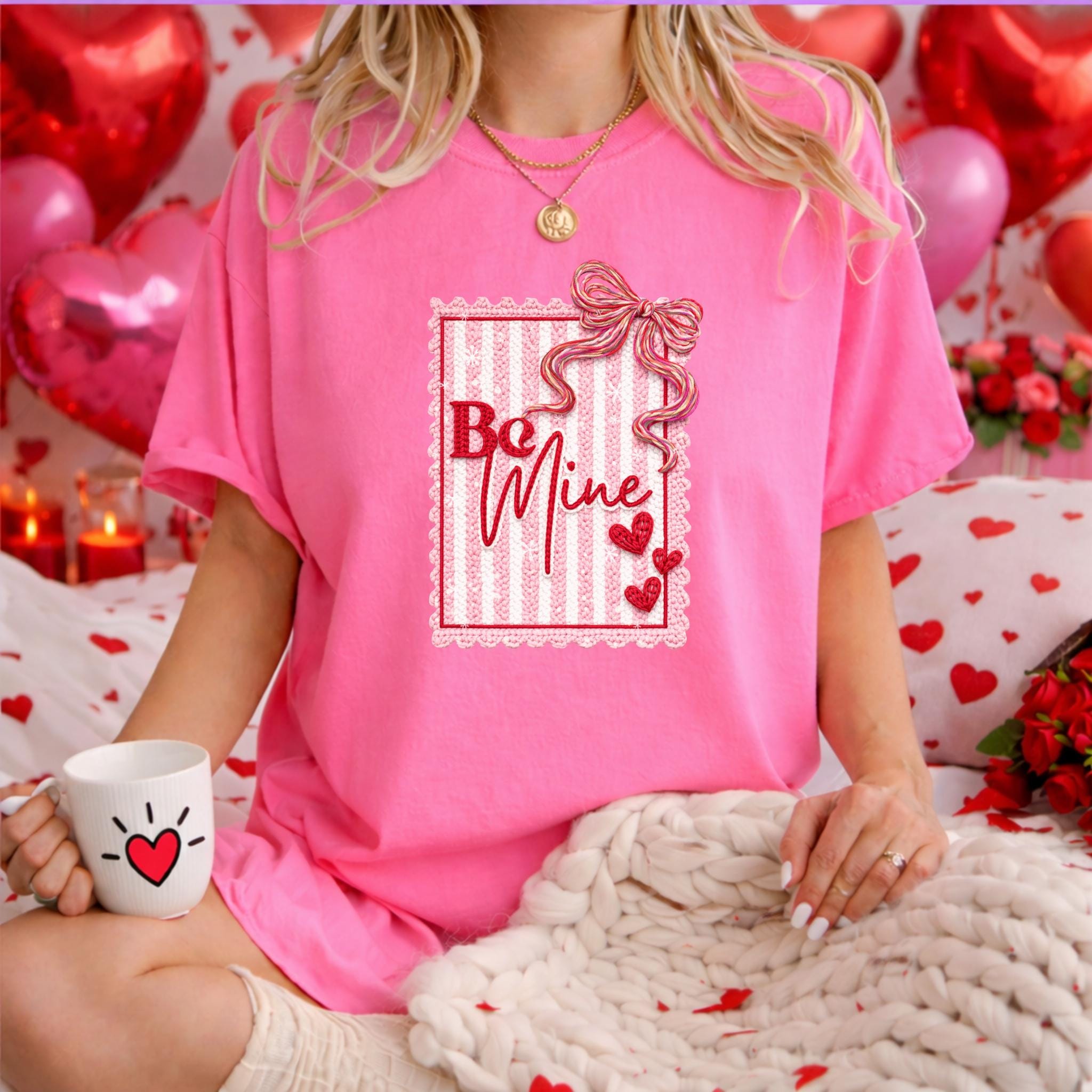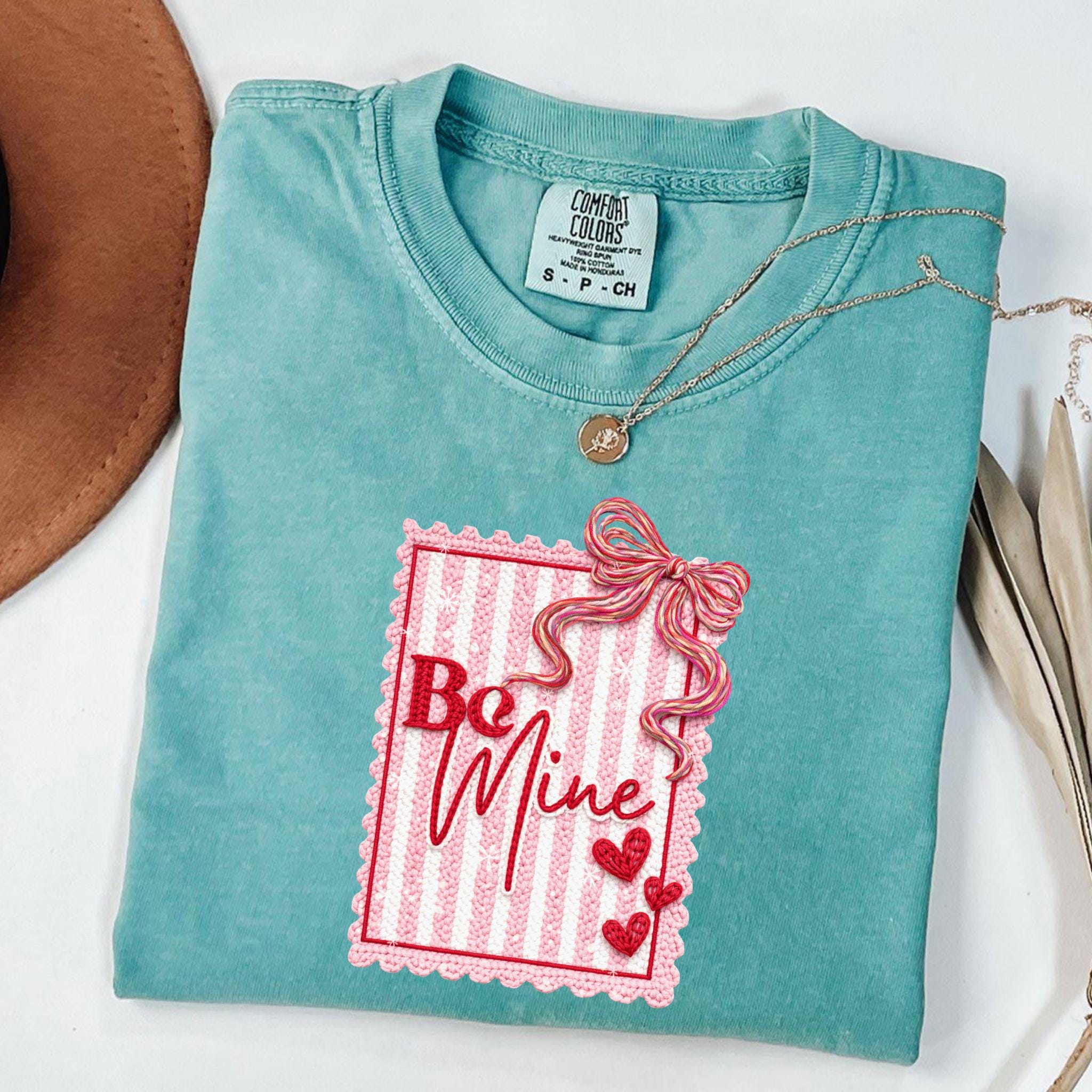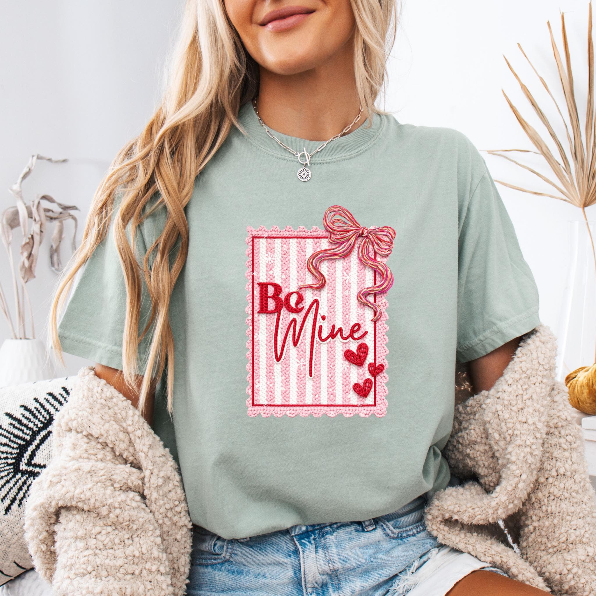 This Be Mine Valentine Sweatshirt features a charming faux yarn Valentine design with soft textures, heart details, and a cozy handmade aesthetic. The illustration mimics the look of stitched and faux yarn-crafted elements, creating a warm and romantic feel that’s perfect for Valentine’s Day and beyond.