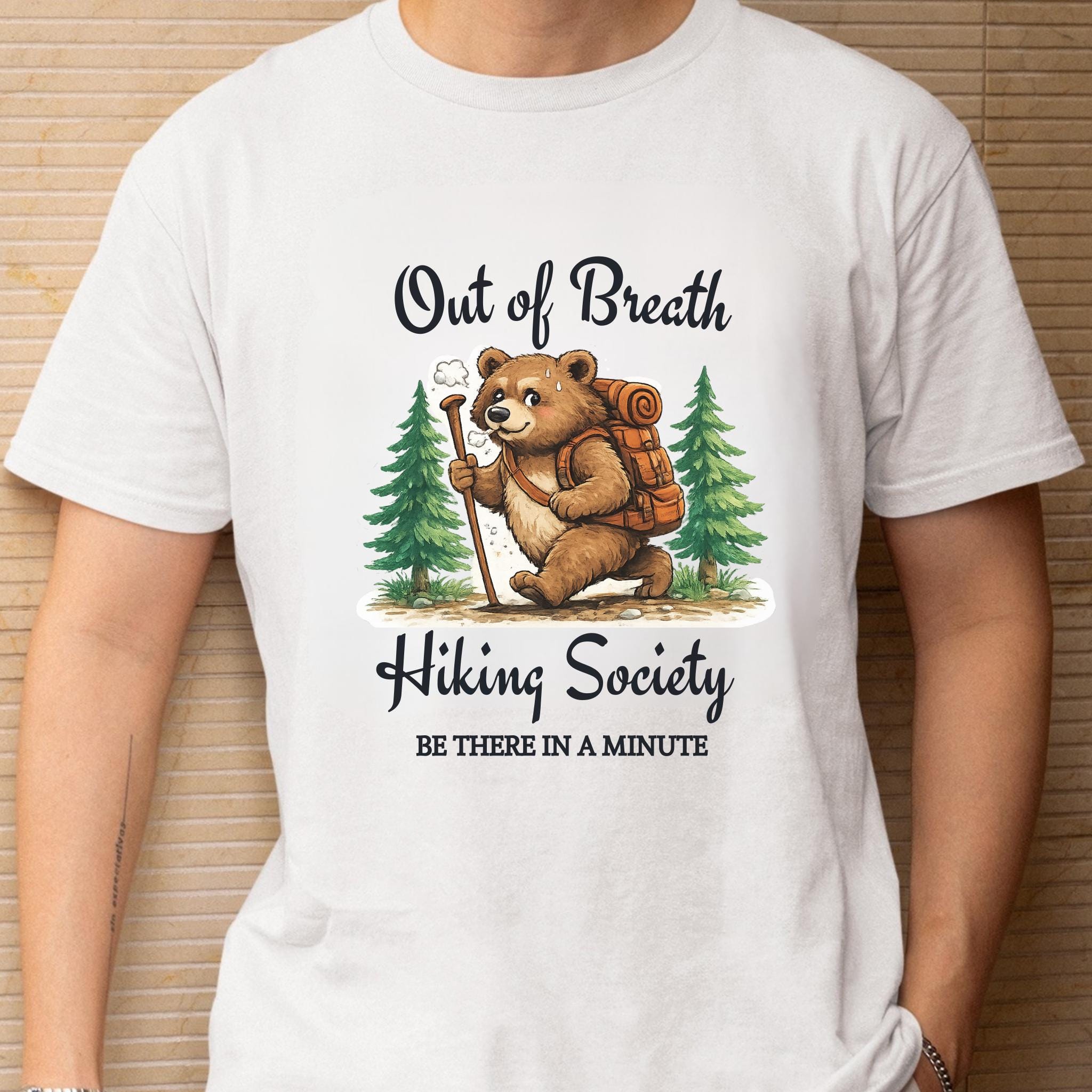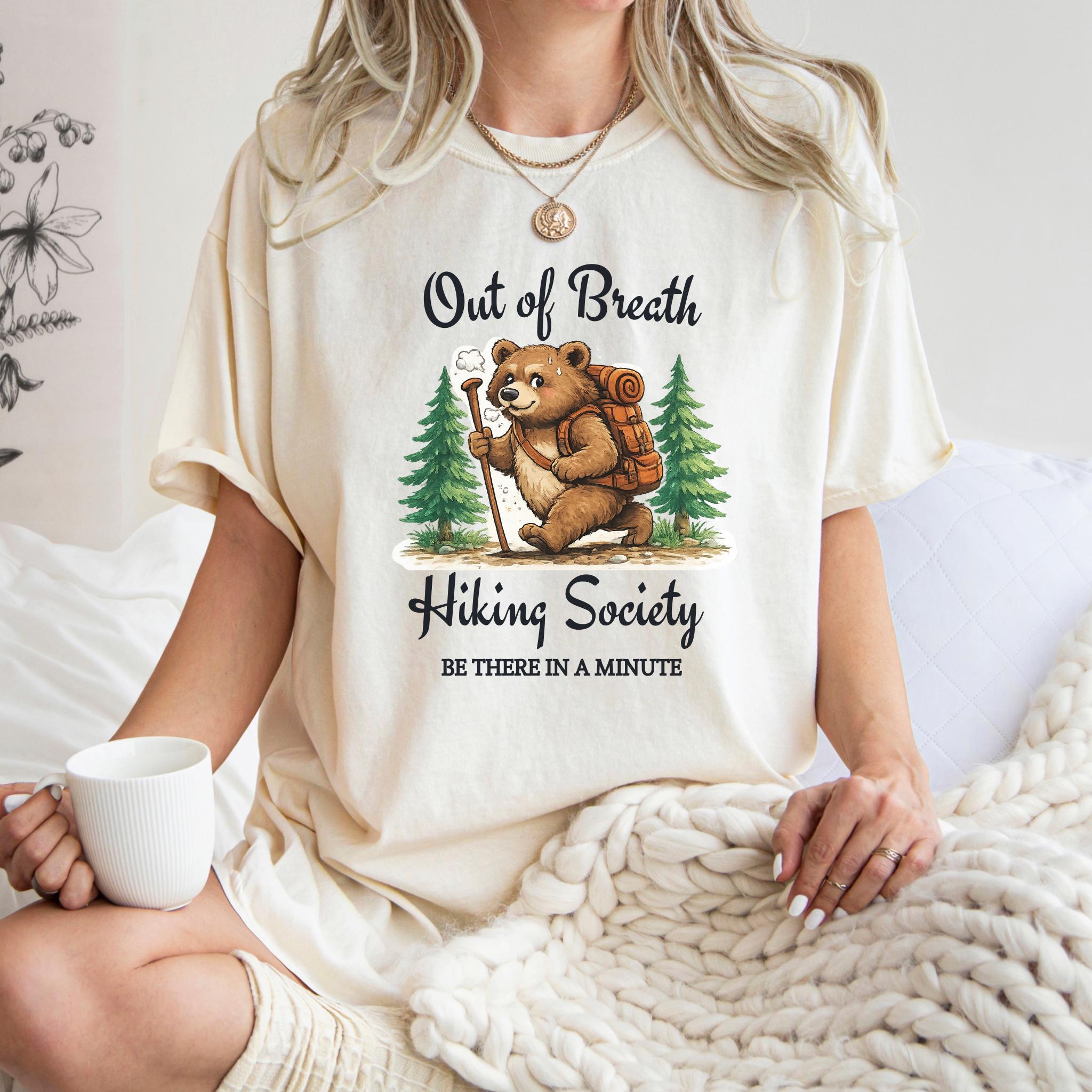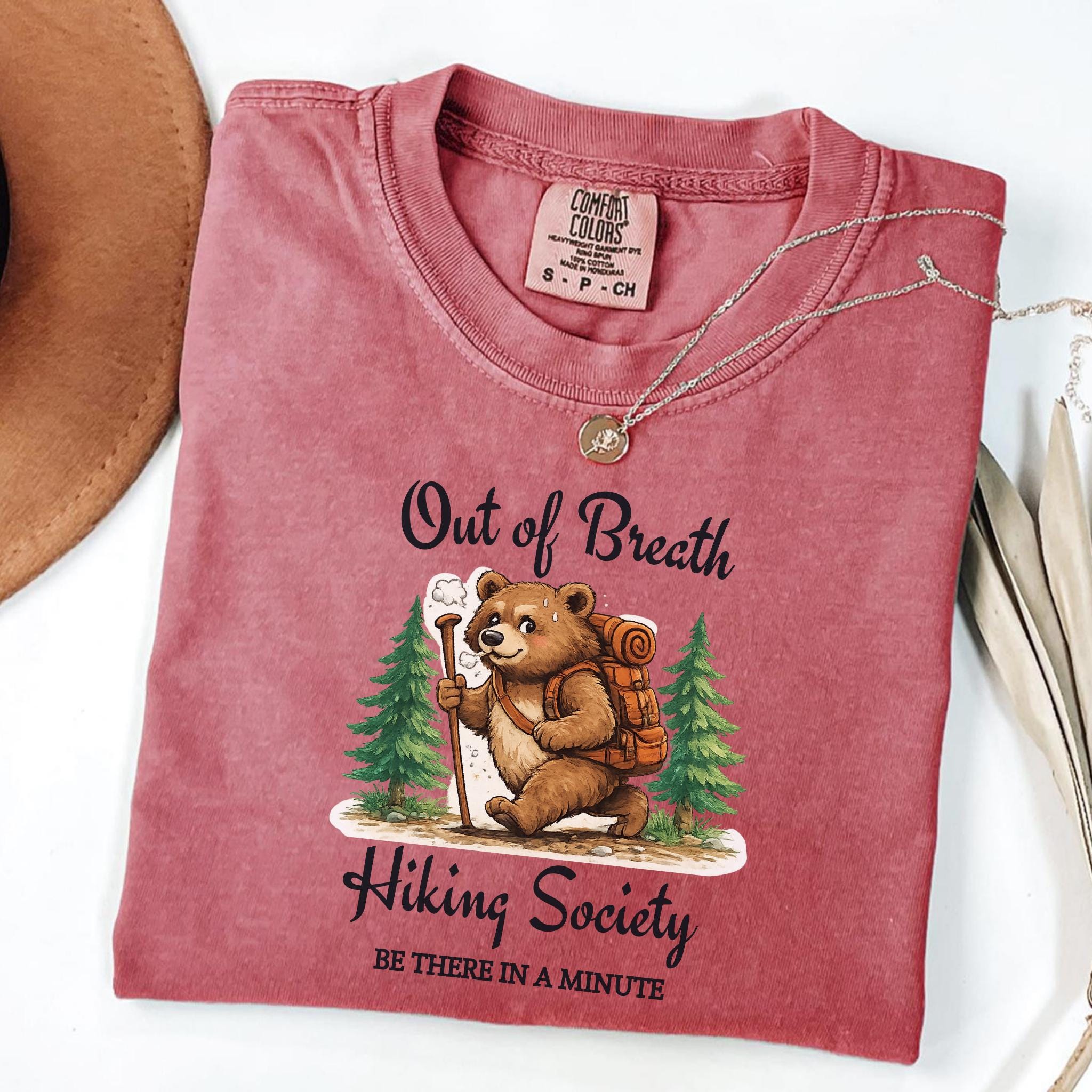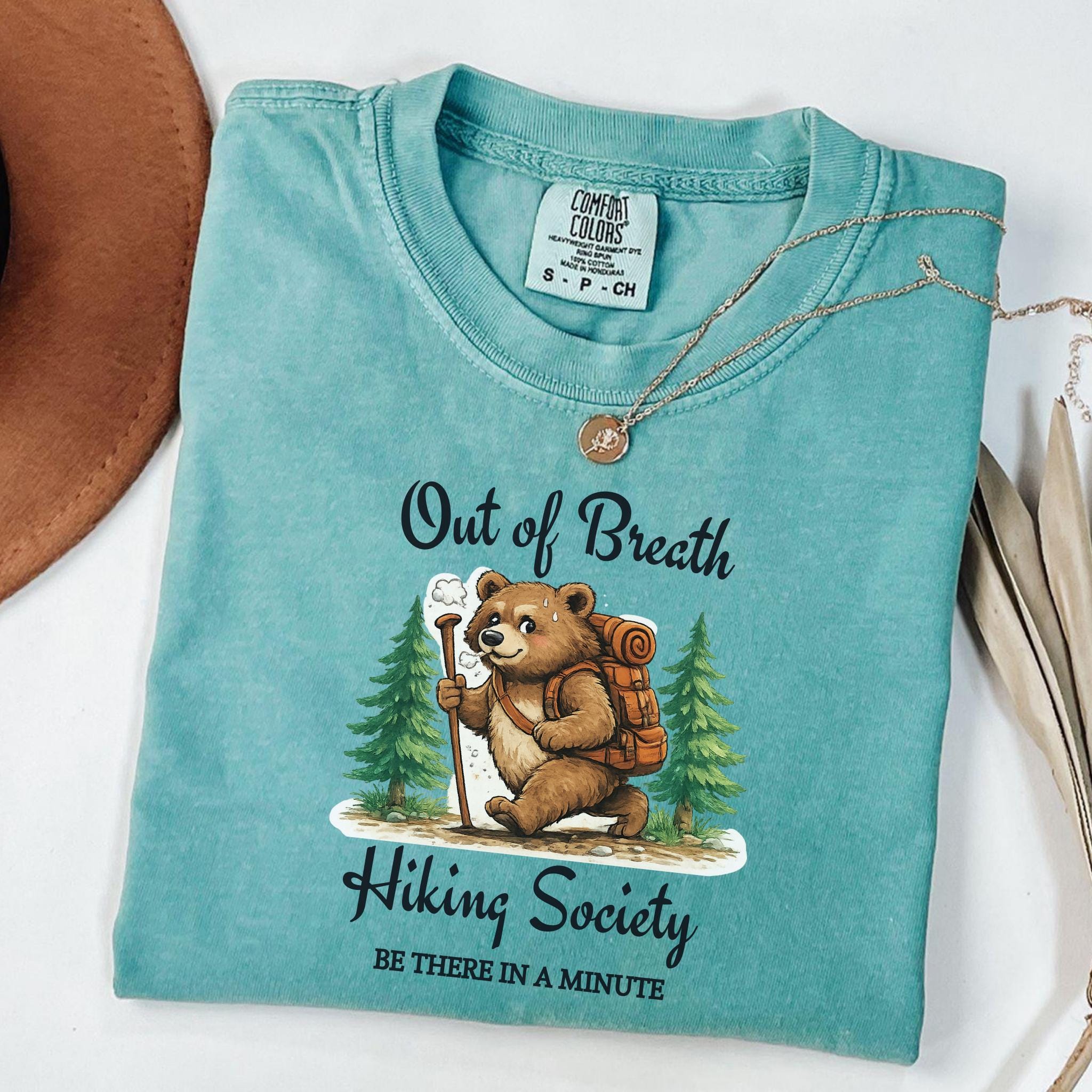 This Out of Breath Hiking Society T-Shirt features a charming illustration of a tired but determined bear hiking through the forest, paired with a humorous slogan that every outdoor lover can relate to. Designed for hikers who appreciate nature, adventure, and a little humor along the trail.