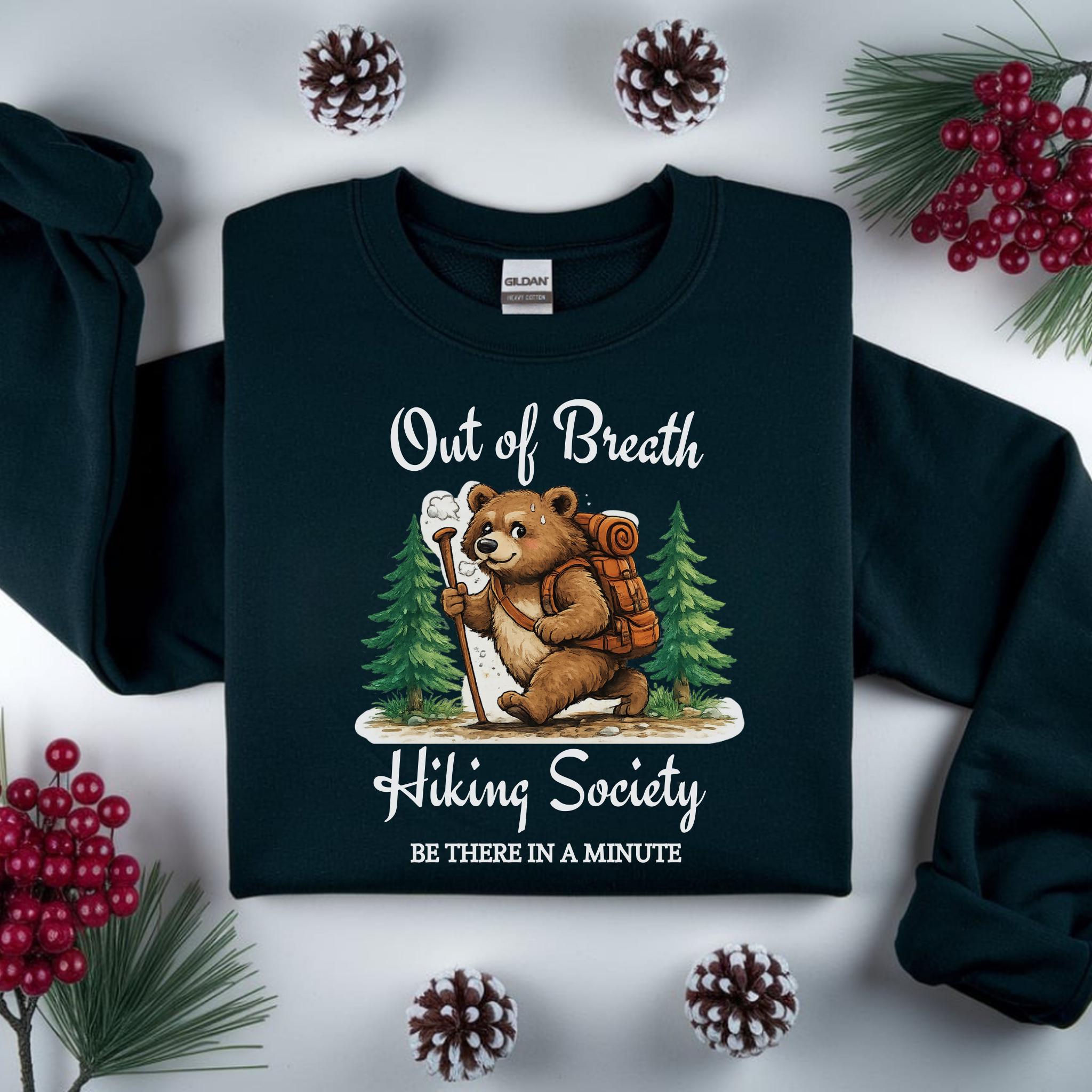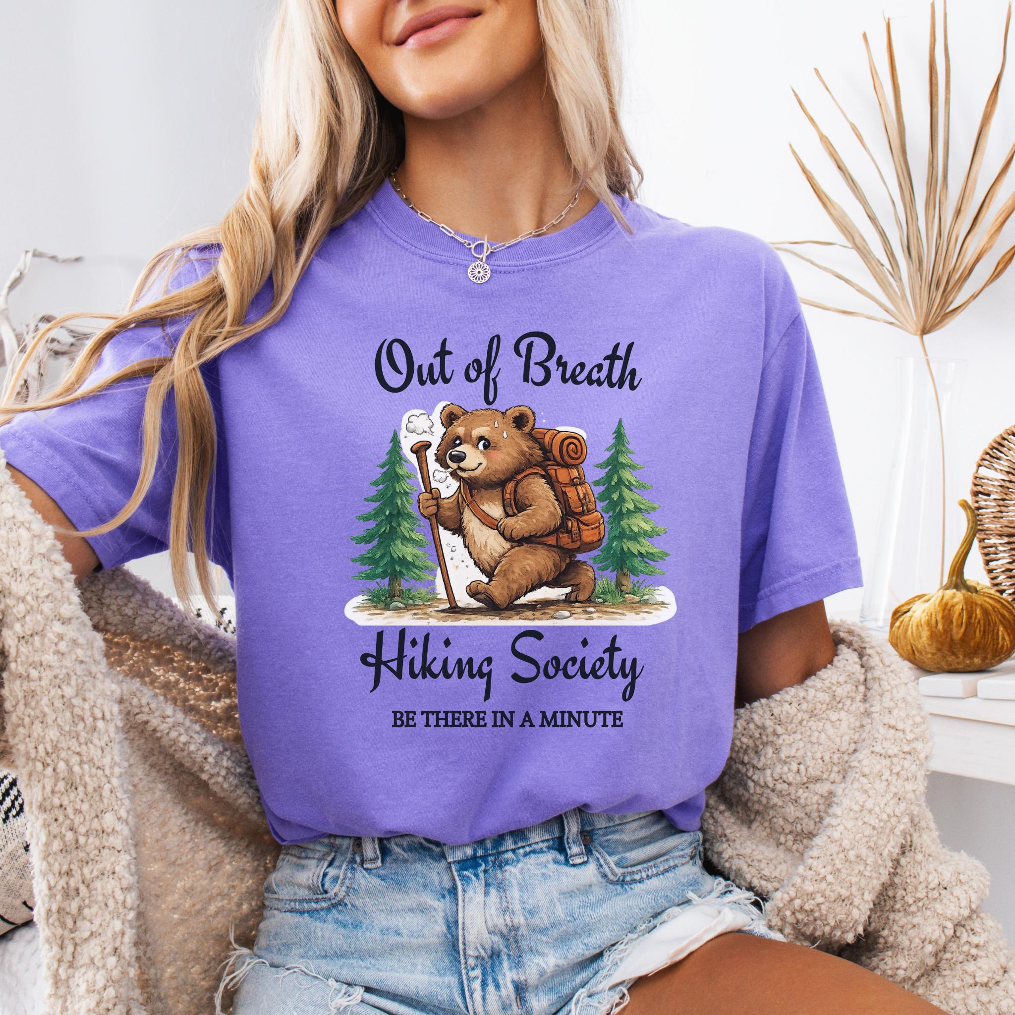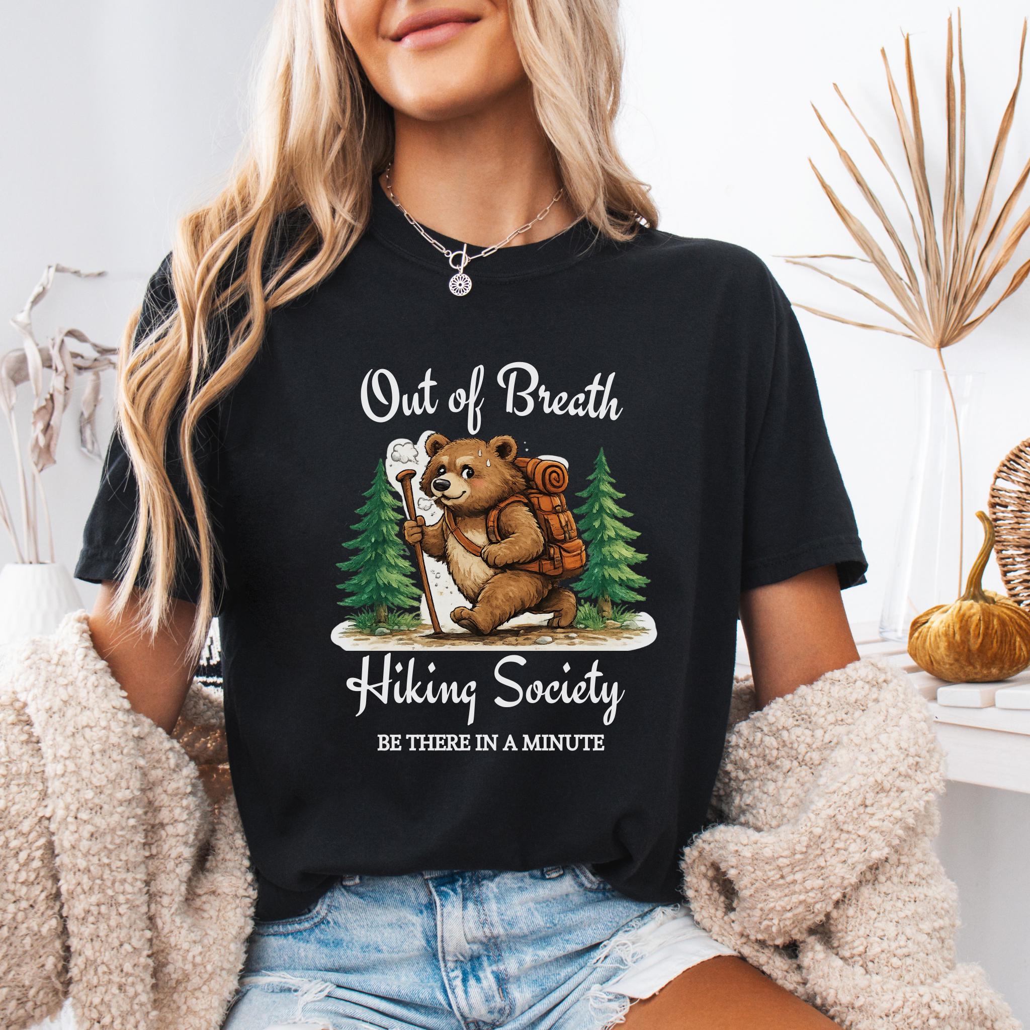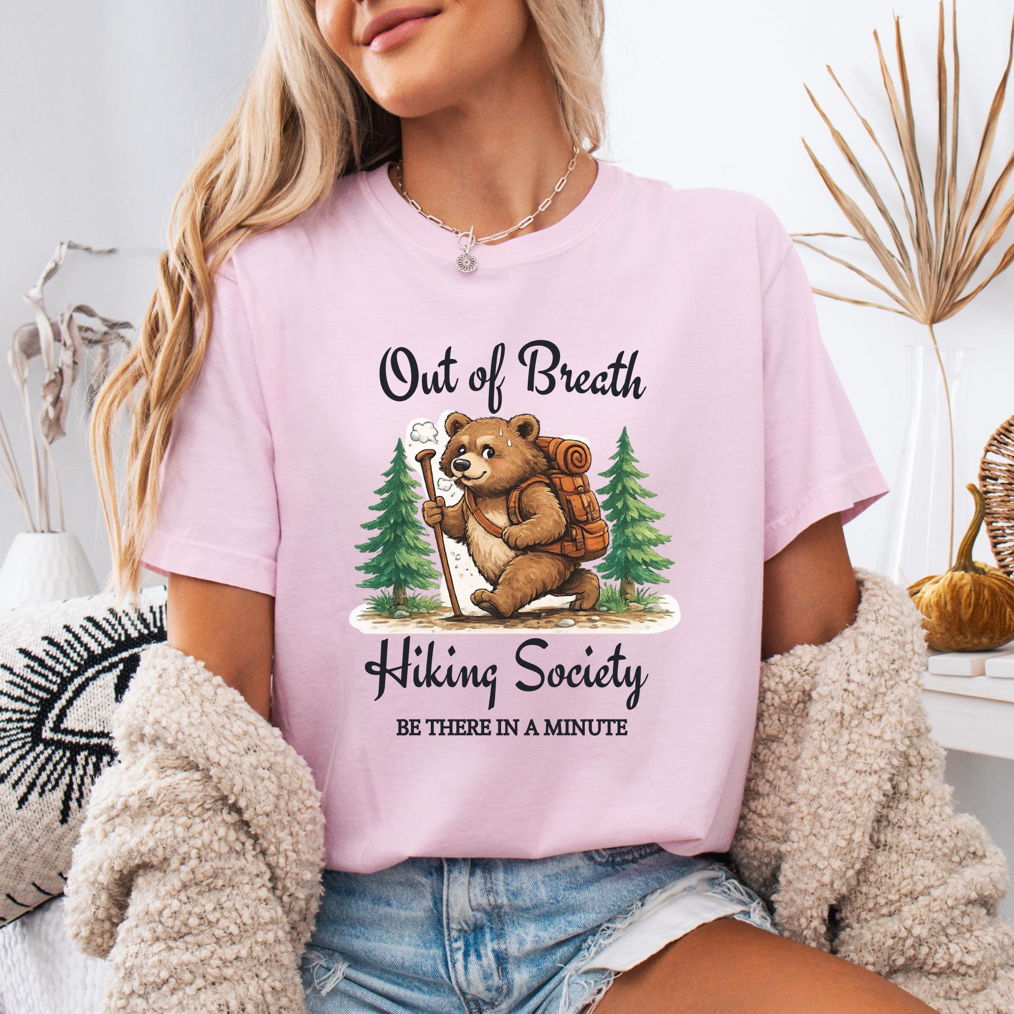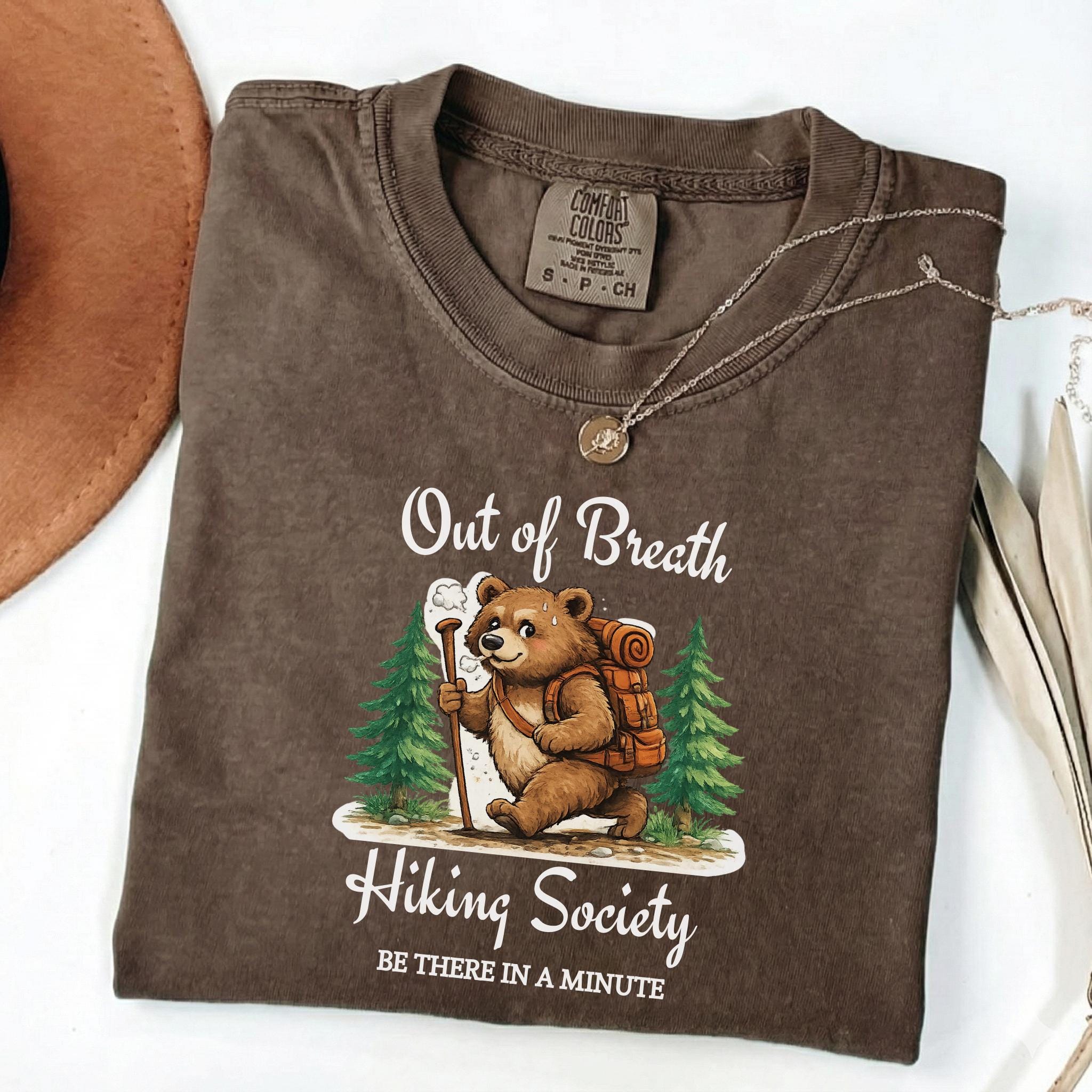This Out of Breath Hiking Society T-Shirt features a charming illustration of a tired but determined bear hiking through the forest, paired with a humorous slogan that every outdoor lover can relate to. Designed for hikers who appreciate nature, adventure, and a little humor along the trail.