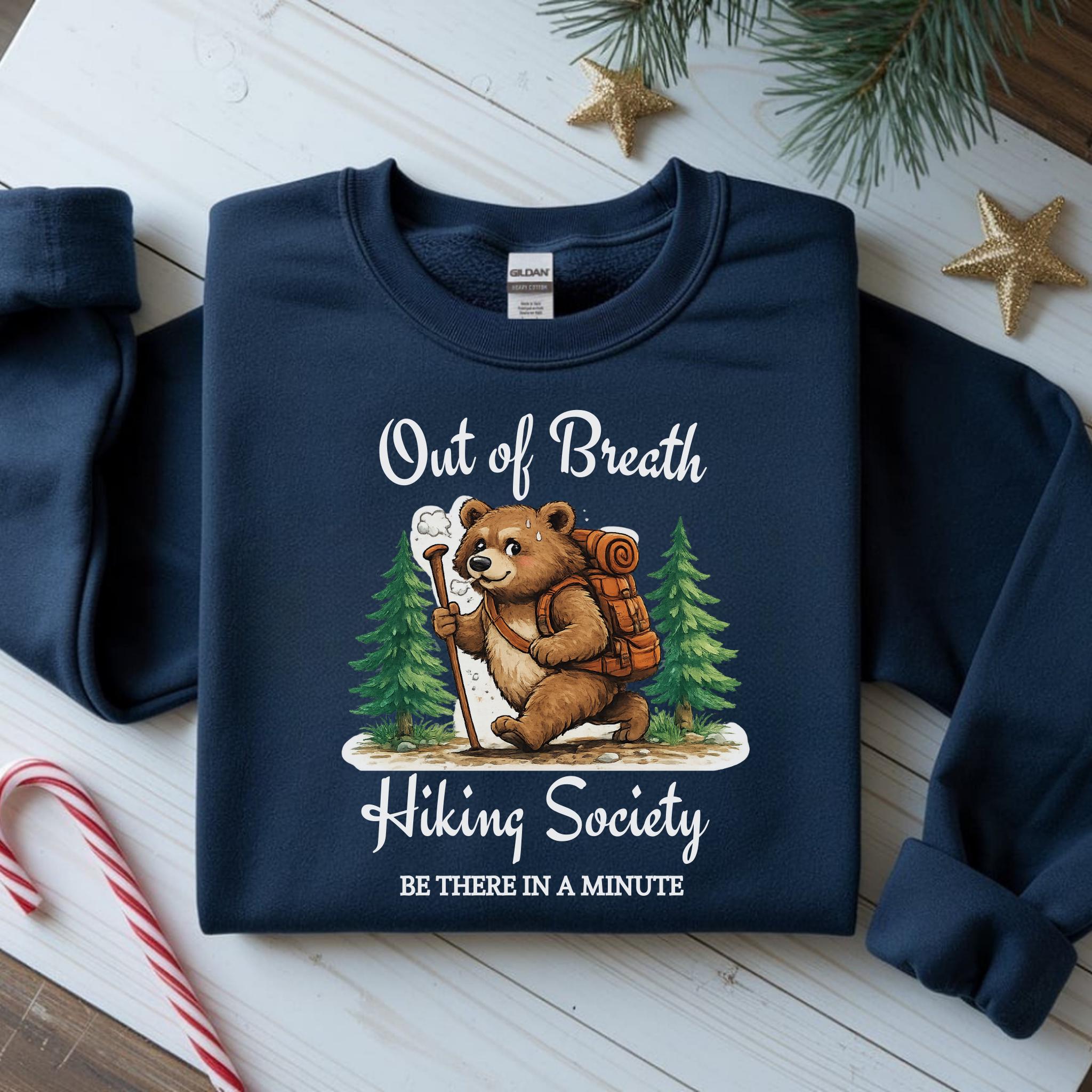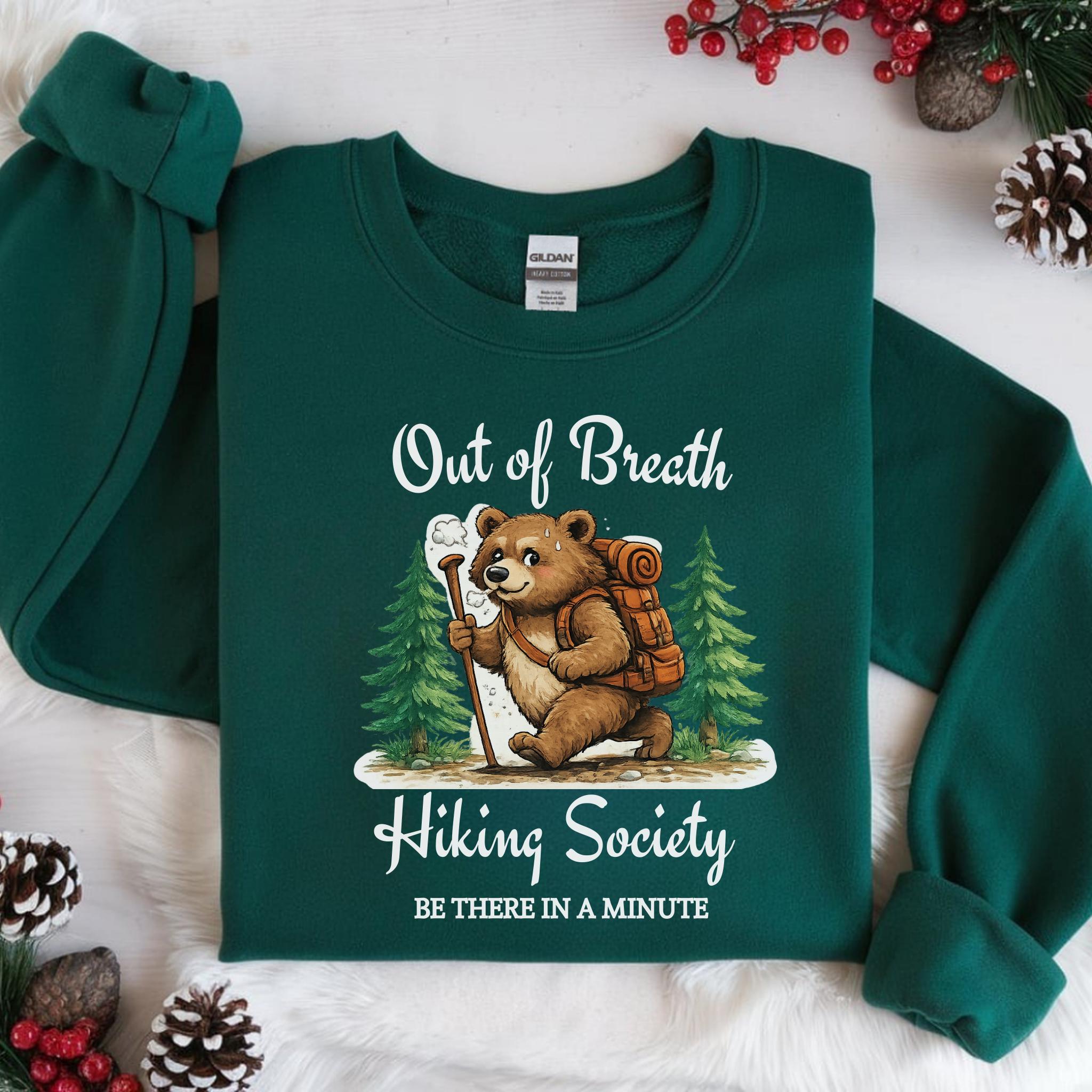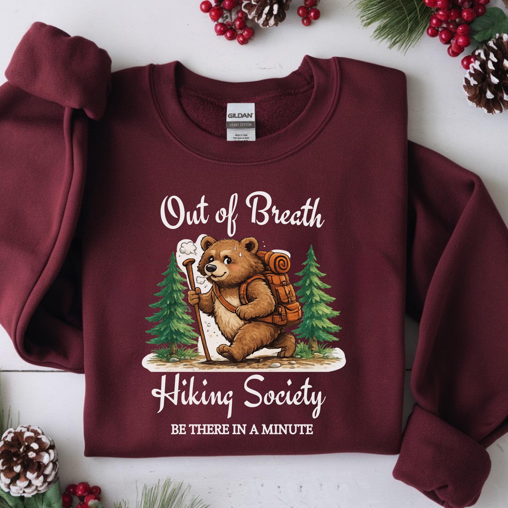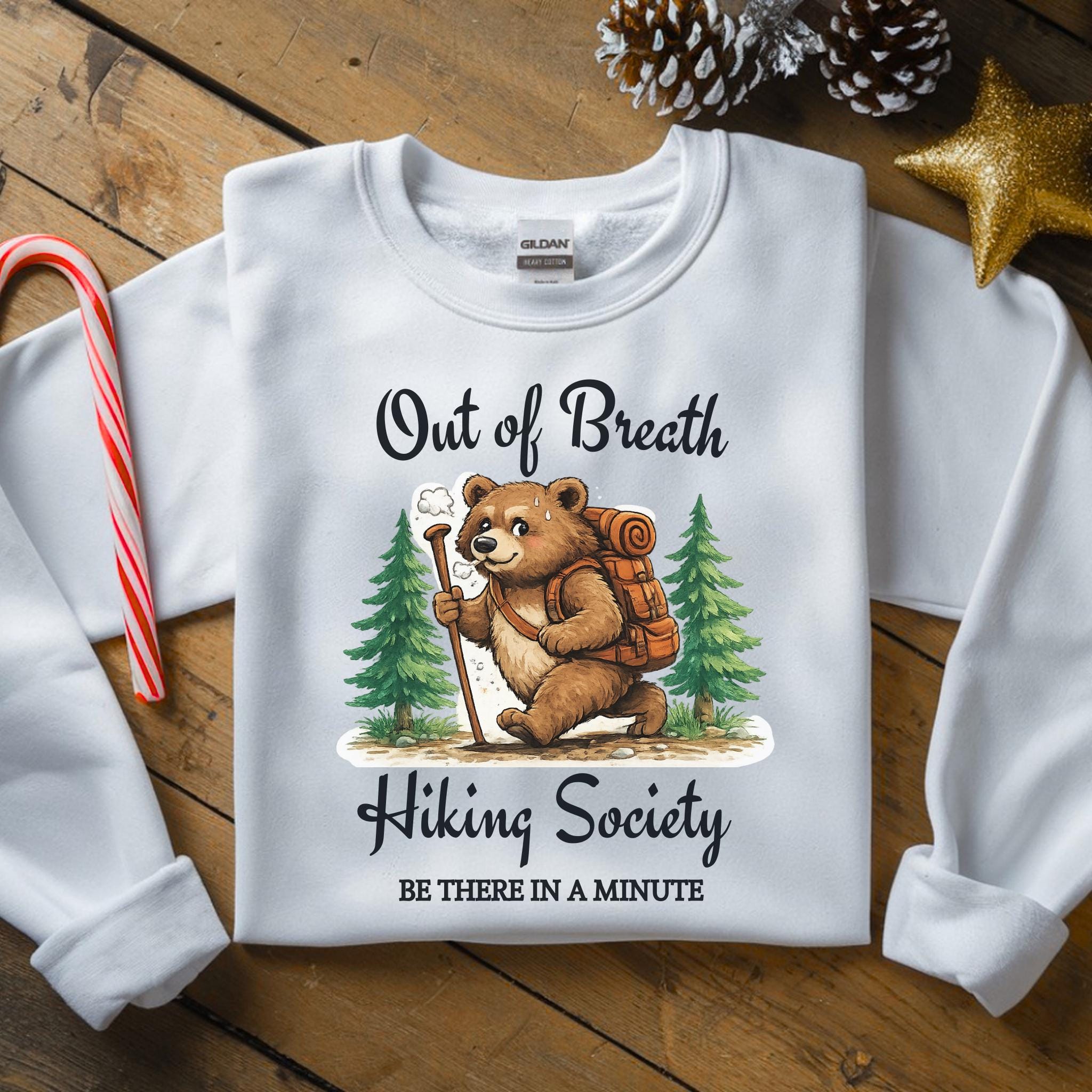 This Out of Breath Hiking Society T-Shirt features a charming illustration of a tired but determined bear hiking through the forest, paired with a humorous slogan that every outdoor lover can relate to. Designed for hikers who appreciate nature, adventure, and a little humor along the trail.