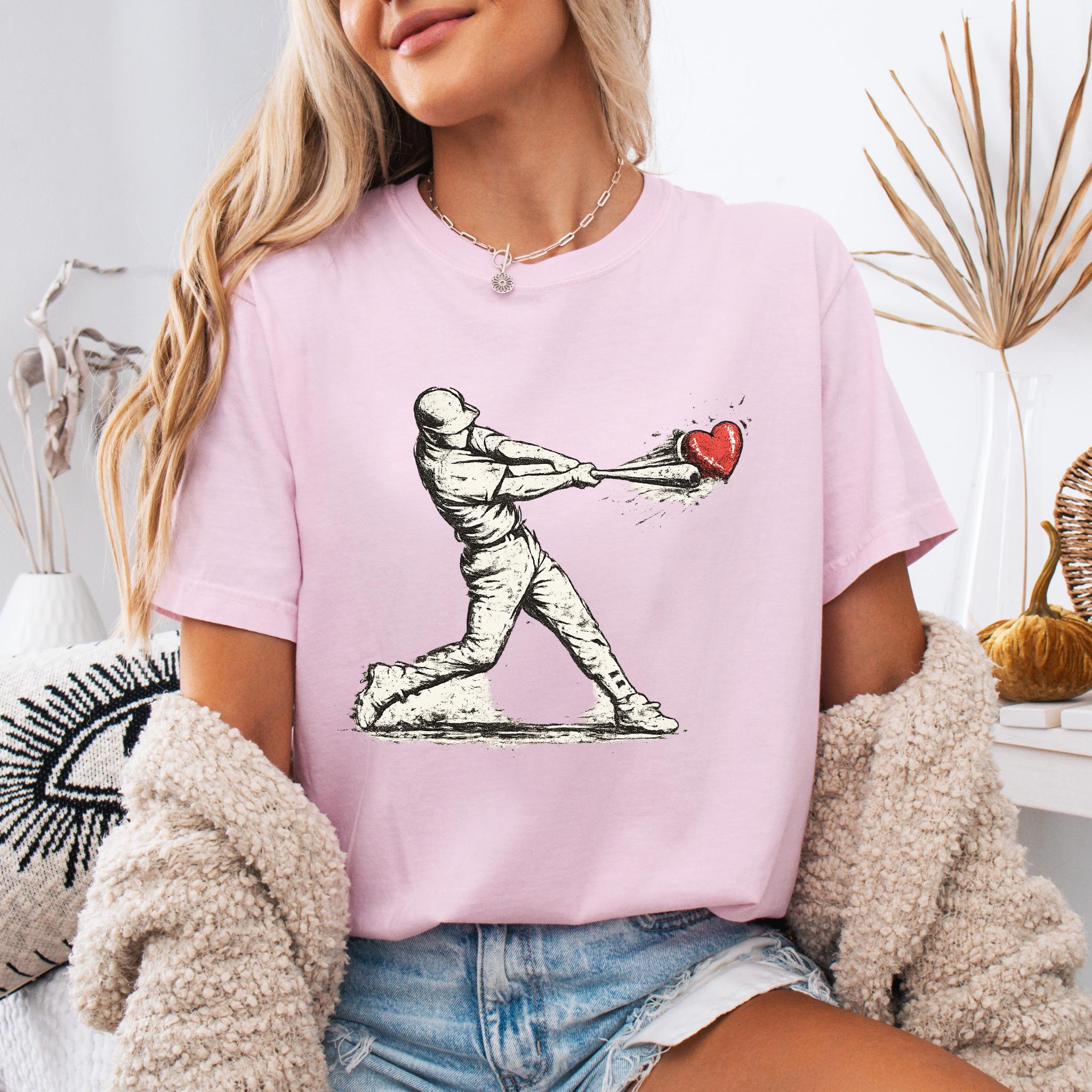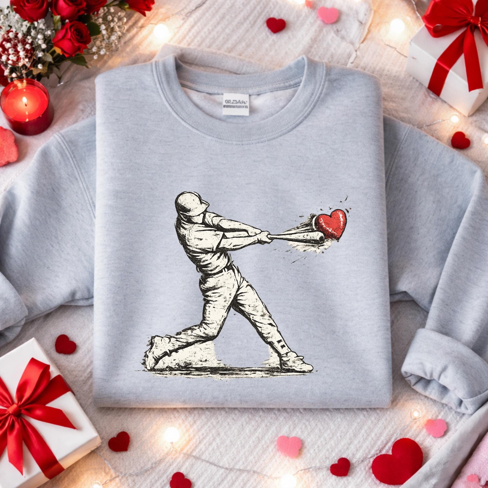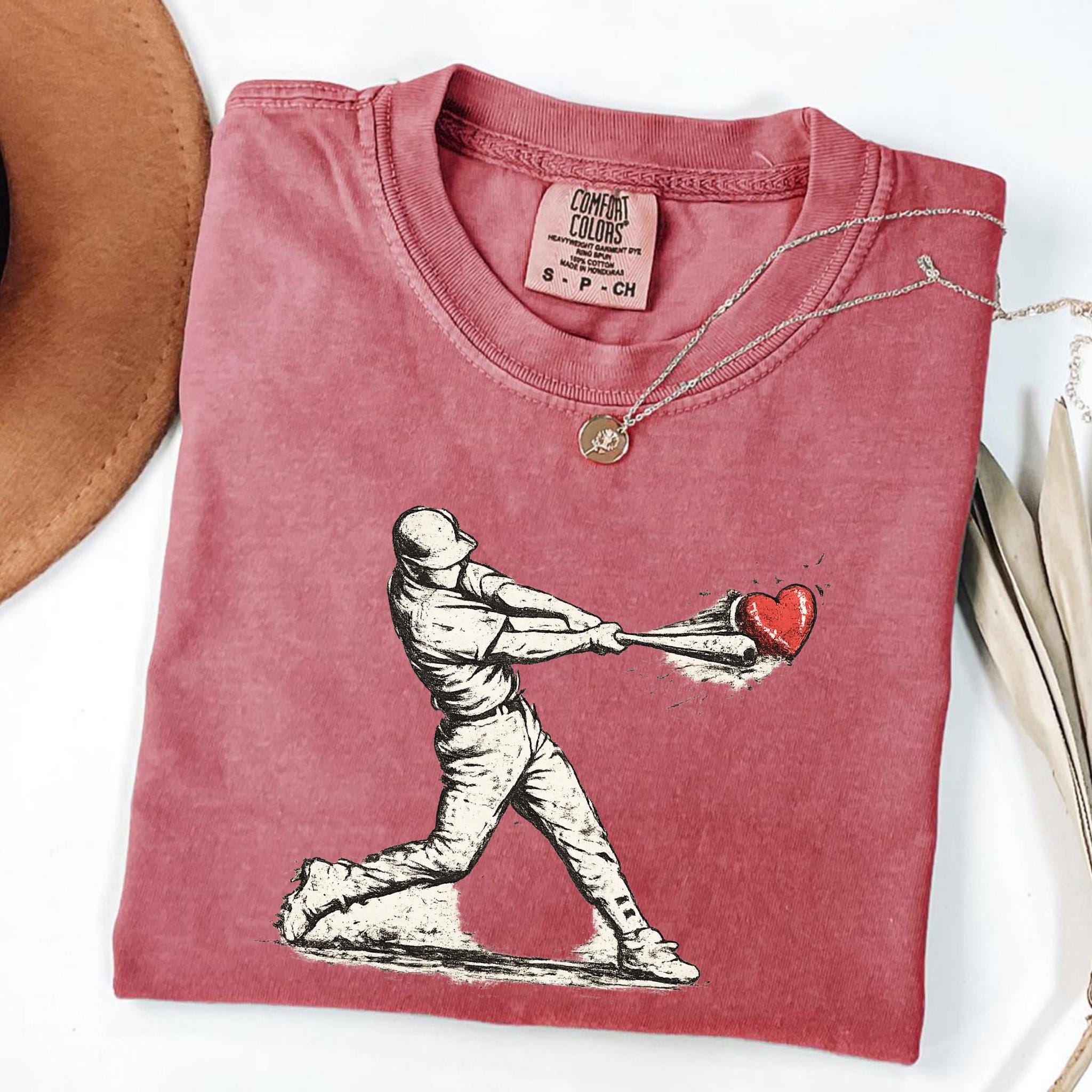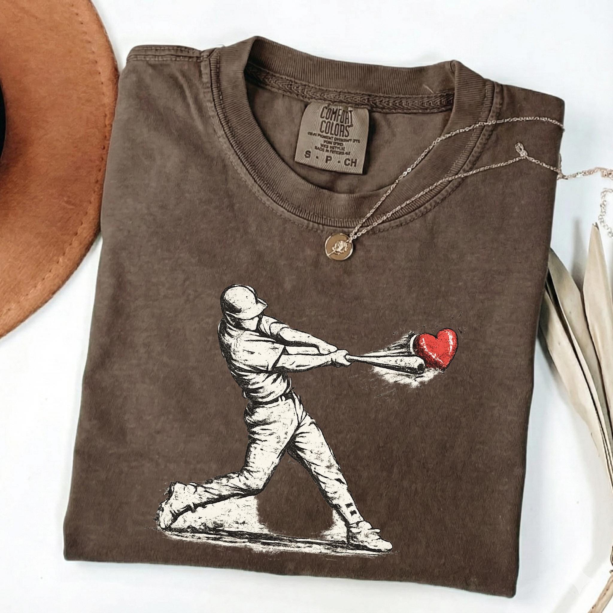 This Valentine's Day Baseball Batter Silhouette Shirt features a striking hand-drawn illustration of a baseball player swinging a bat directly into a heart — a powerful visual metaphor for love, passion, and emotional impact. The minimalist black-and-red artwork creates a bold contrast that instantly captures attention.