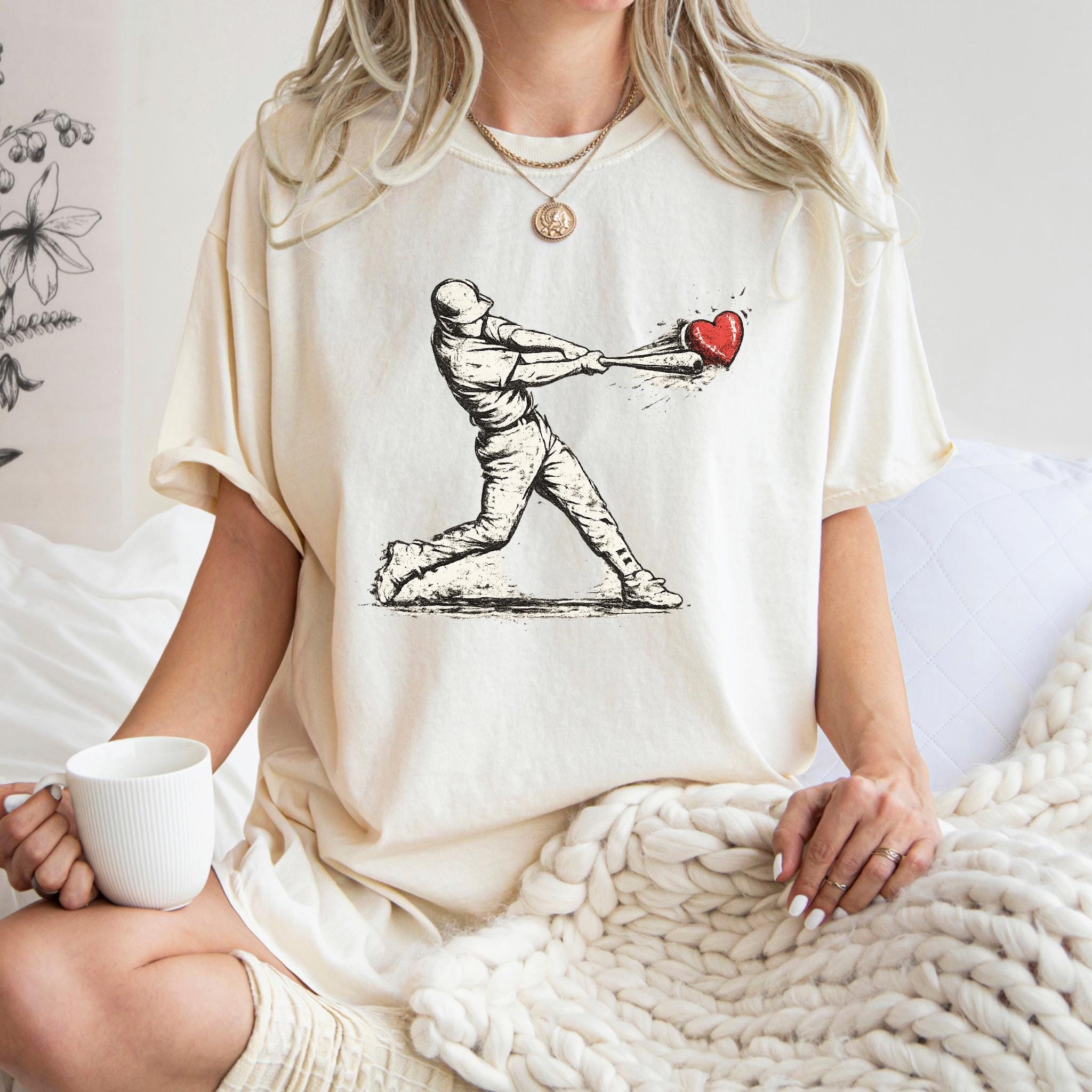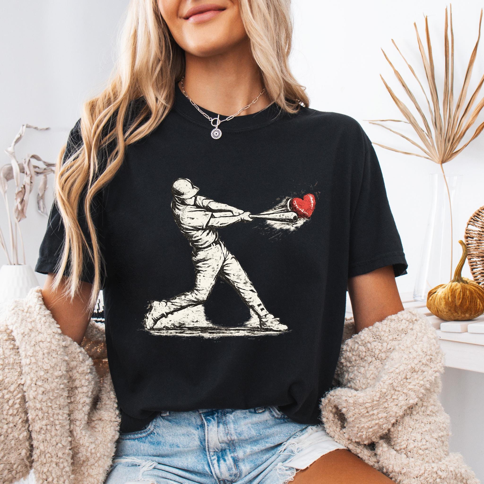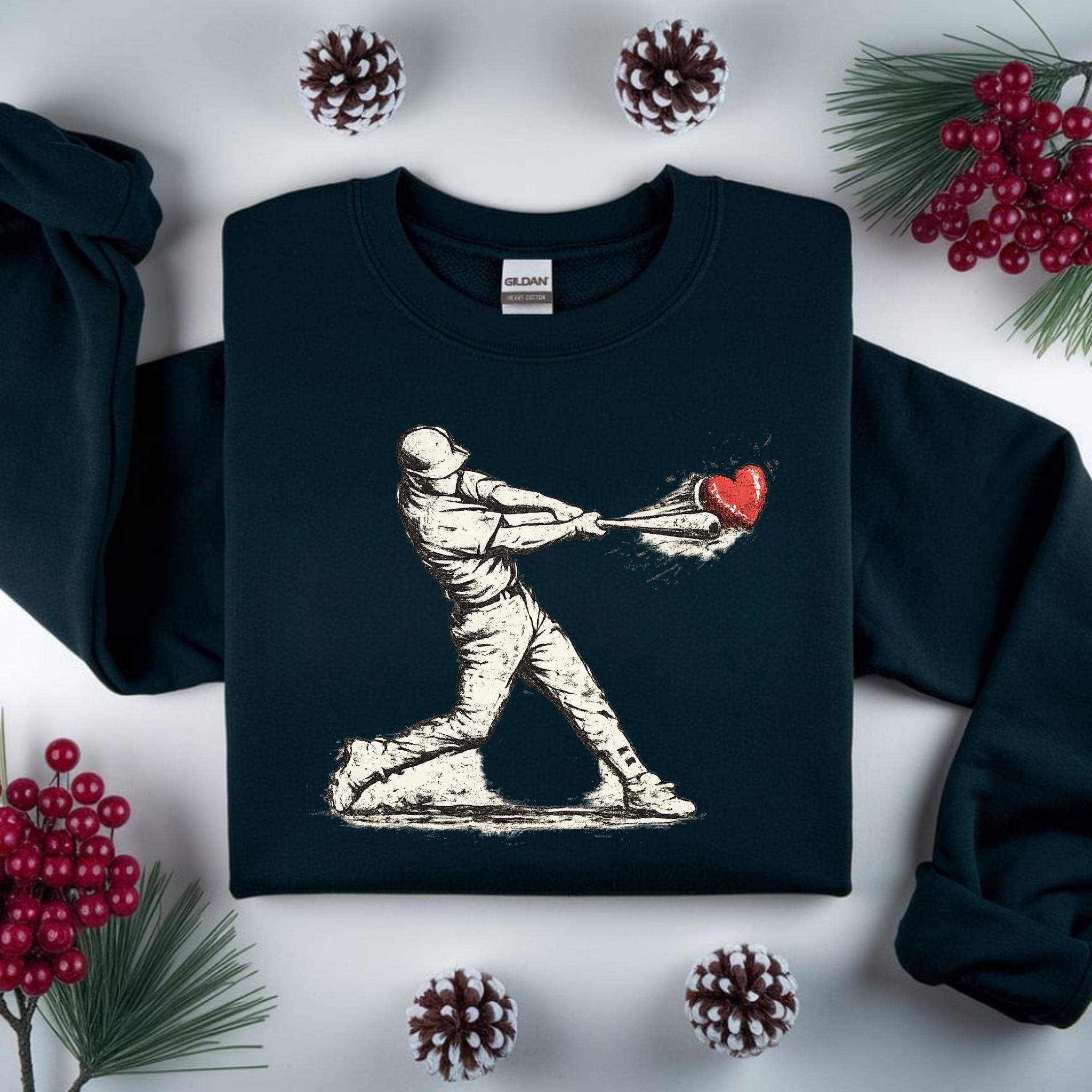 This Valentine's Day Baseball Batter Silhouette Shirt features a striking hand-drawn illustration of a baseball player swinging a bat directly into a heart — a powerful visual metaphor for love, passion, and emotional impact. The minimalist black-and-red artwork creates a bold contrast that instantly captures attention.