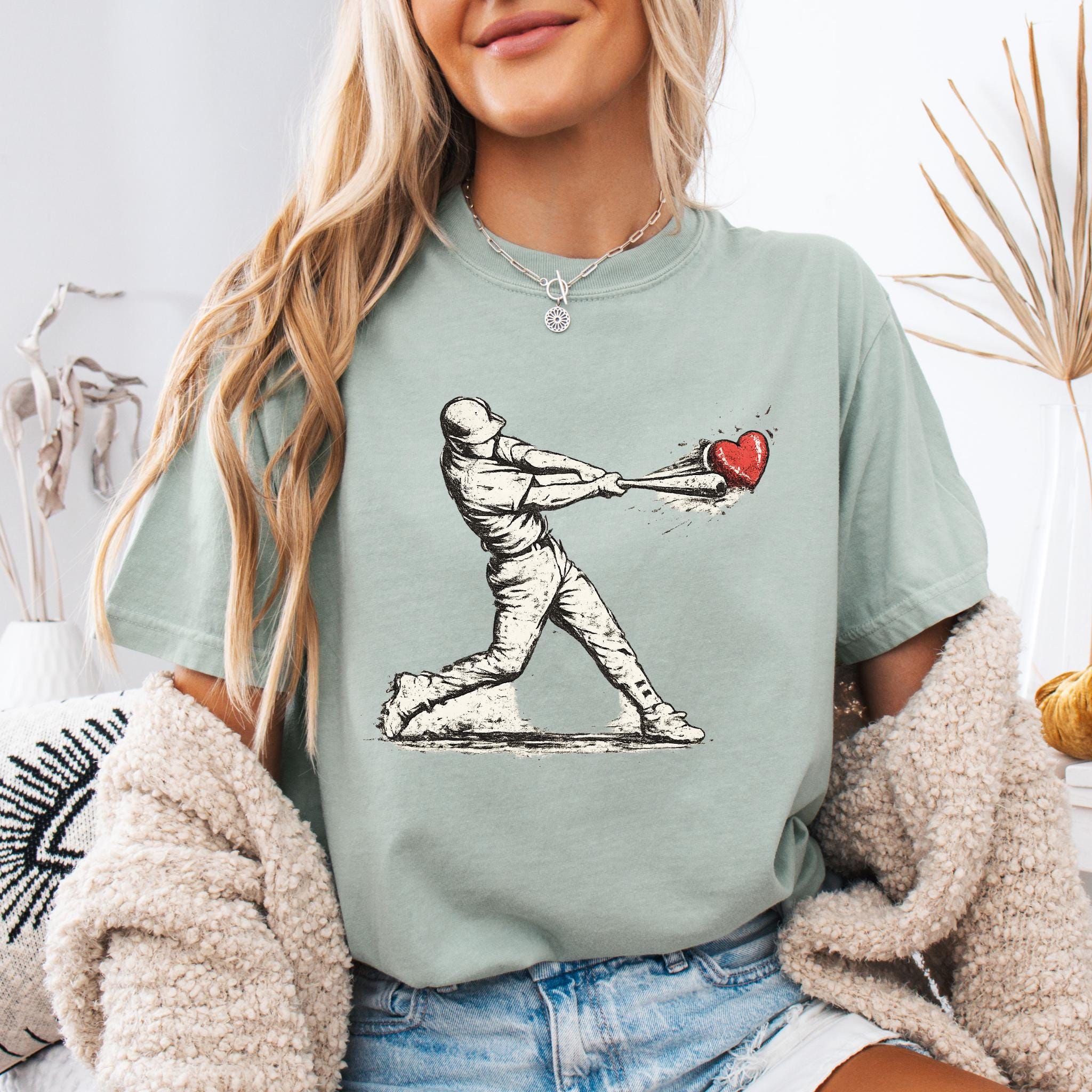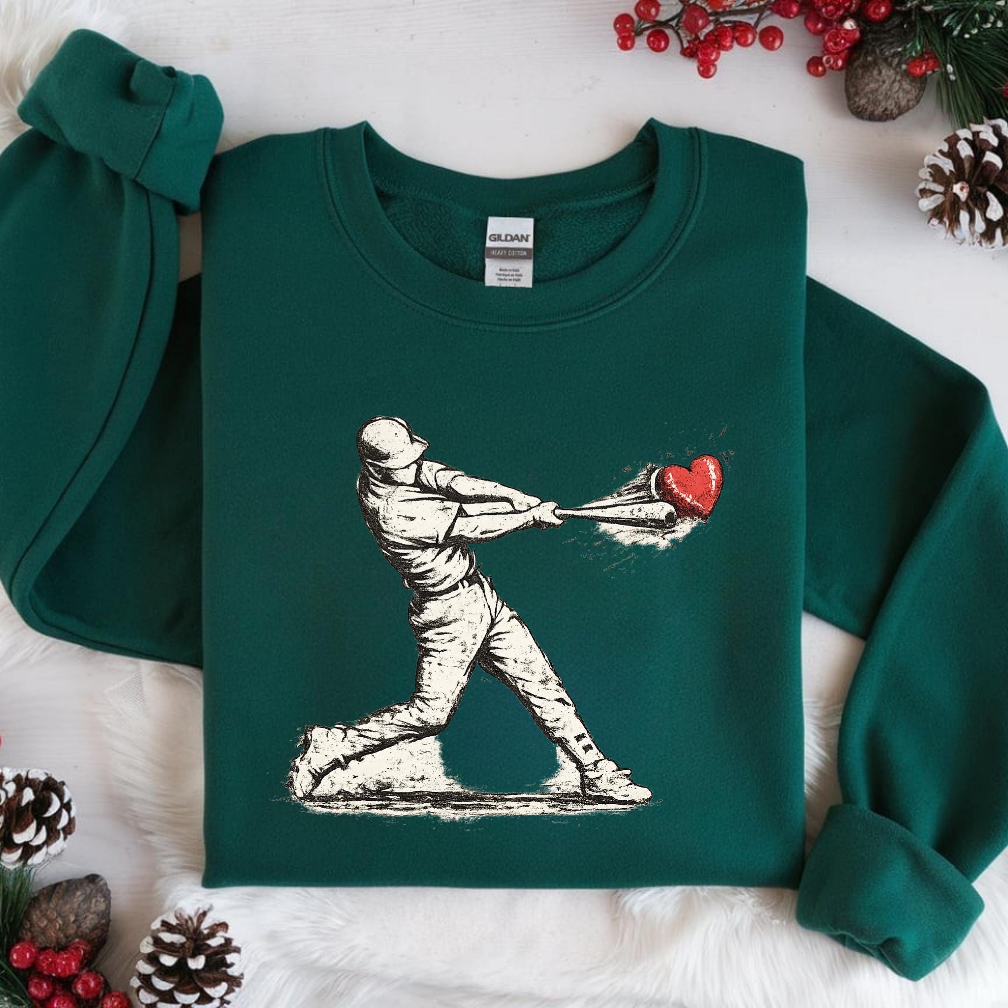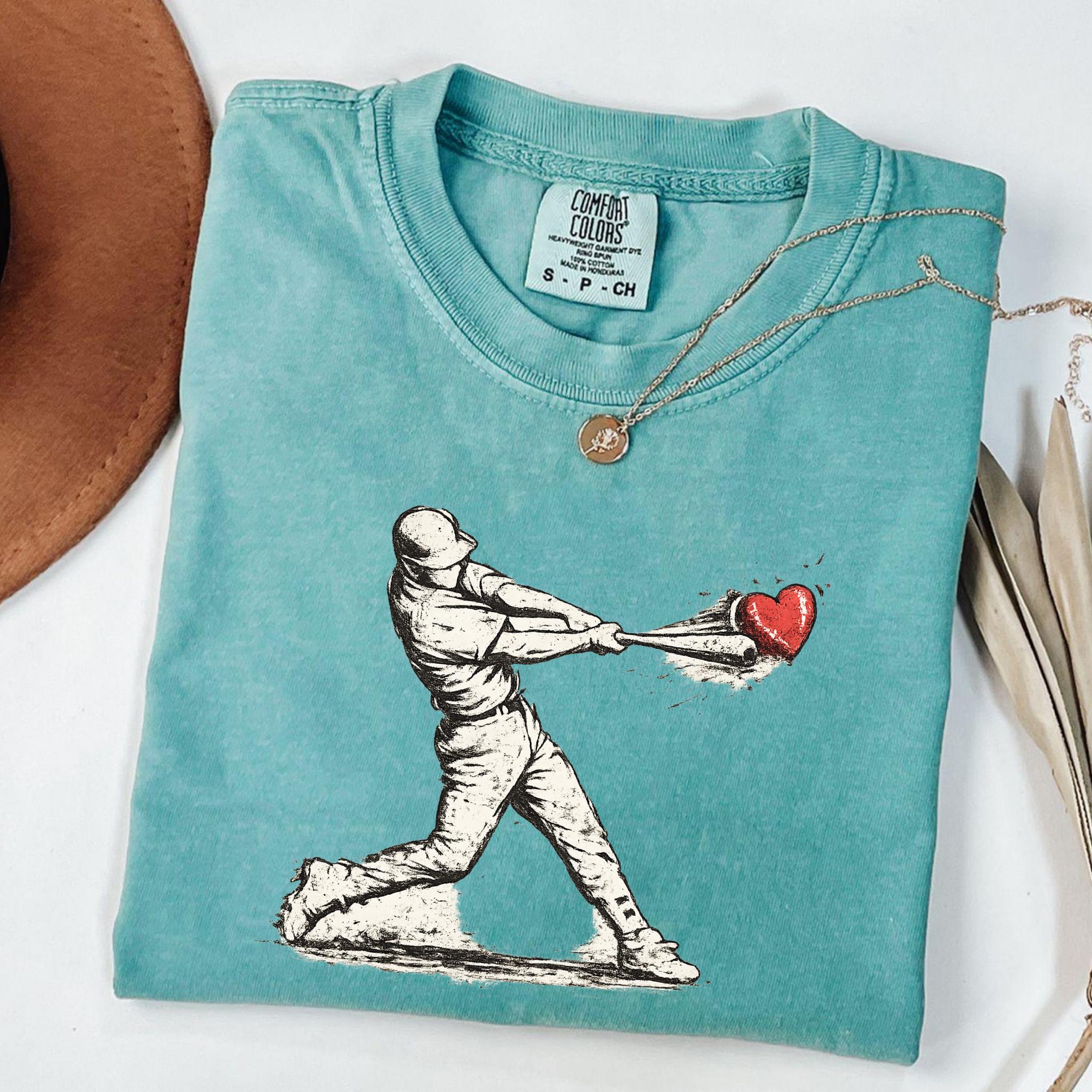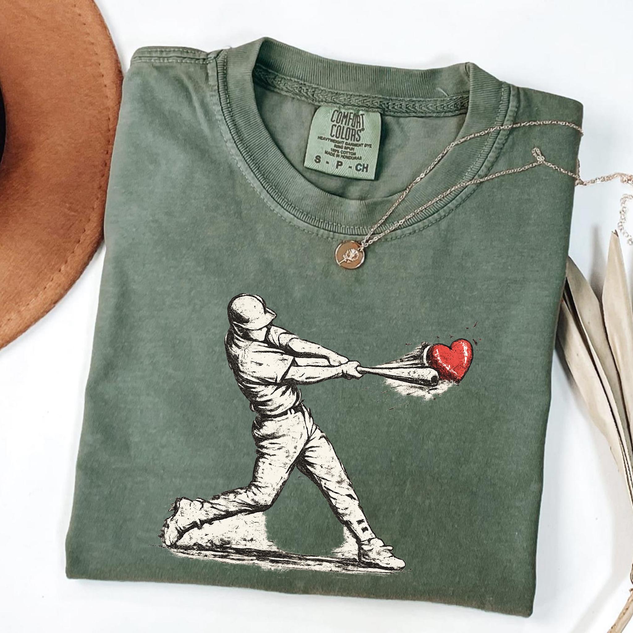 This Valentine's Day Baseball Batter Silhouette Shirt features a striking hand-drawn illustration of a baseball player swinging a bat directly into a heart — a powerful visual metaphor for love, passion, and emotional impact. The minimalist black-and-red artwork creates a bold contrast that instantly captures attention.