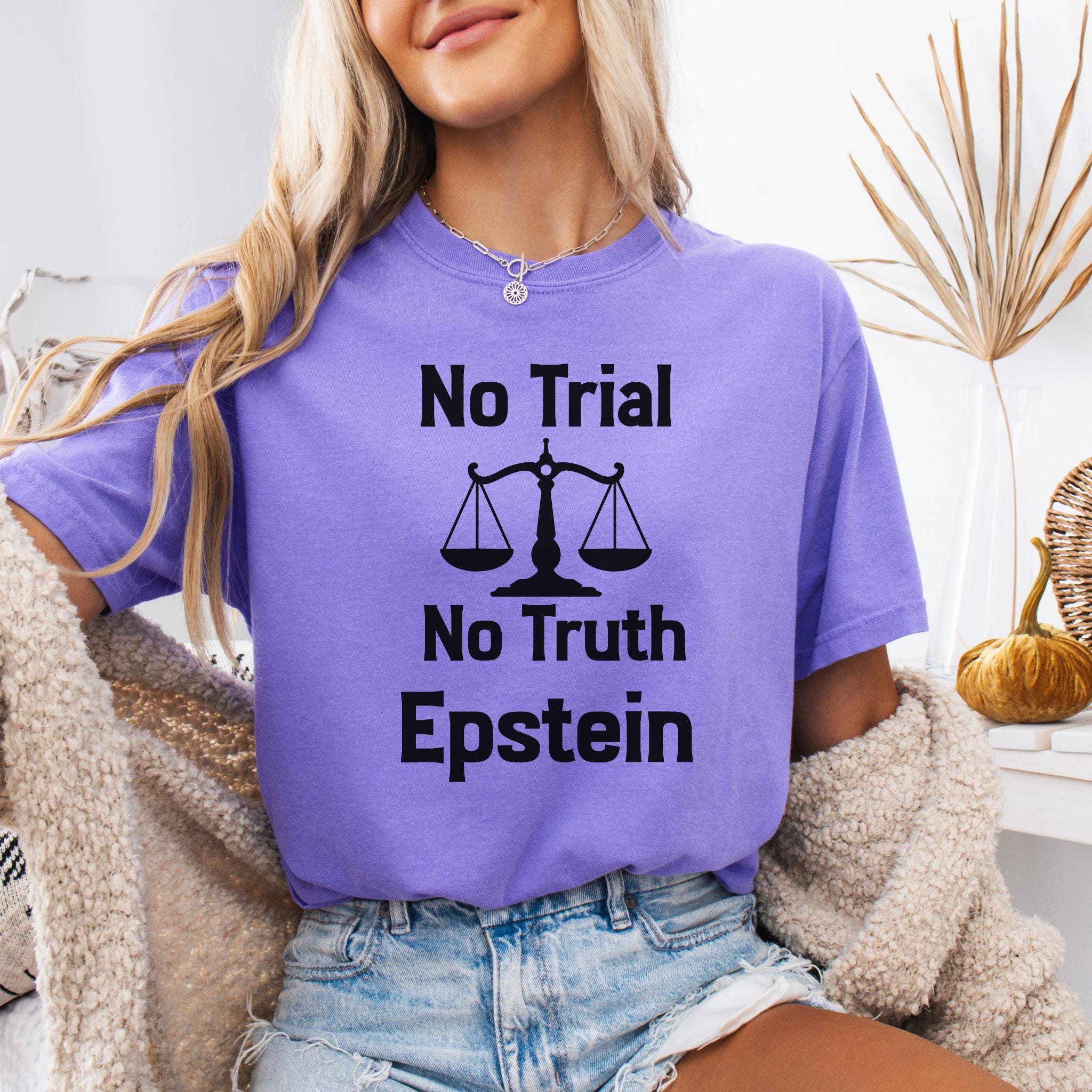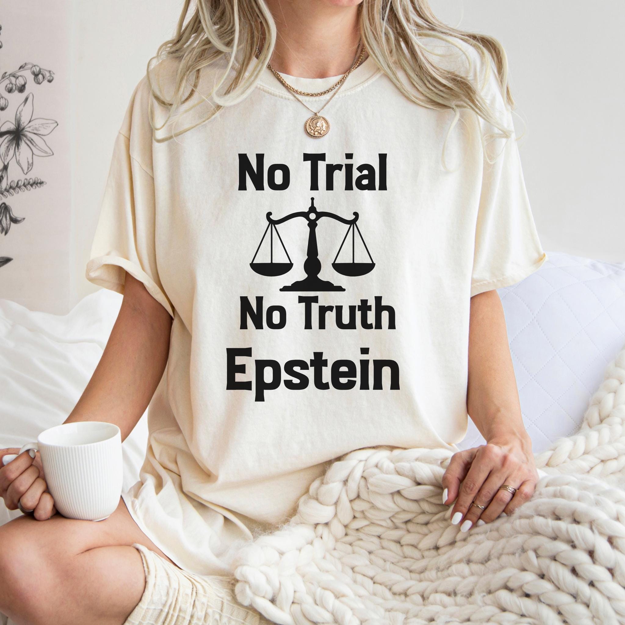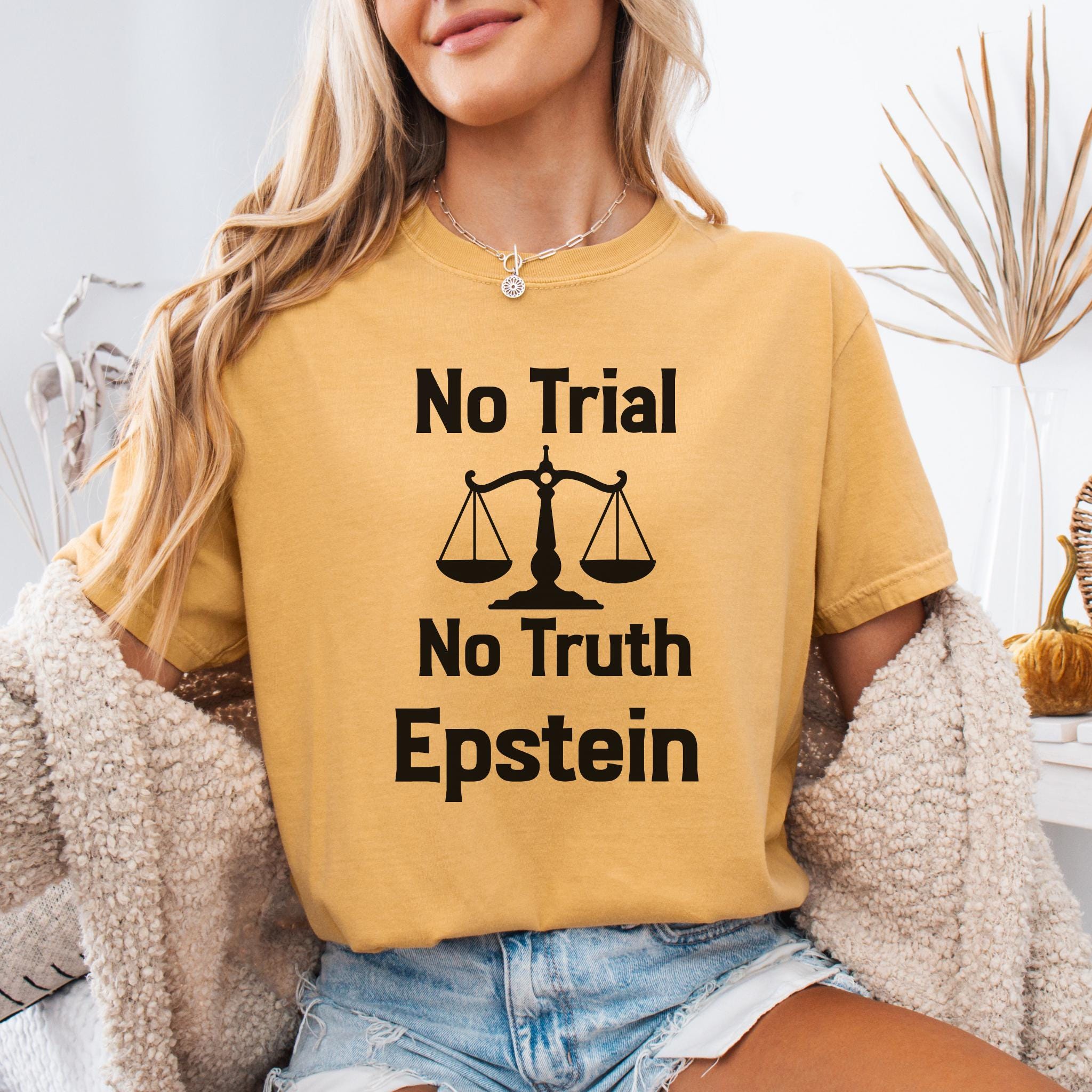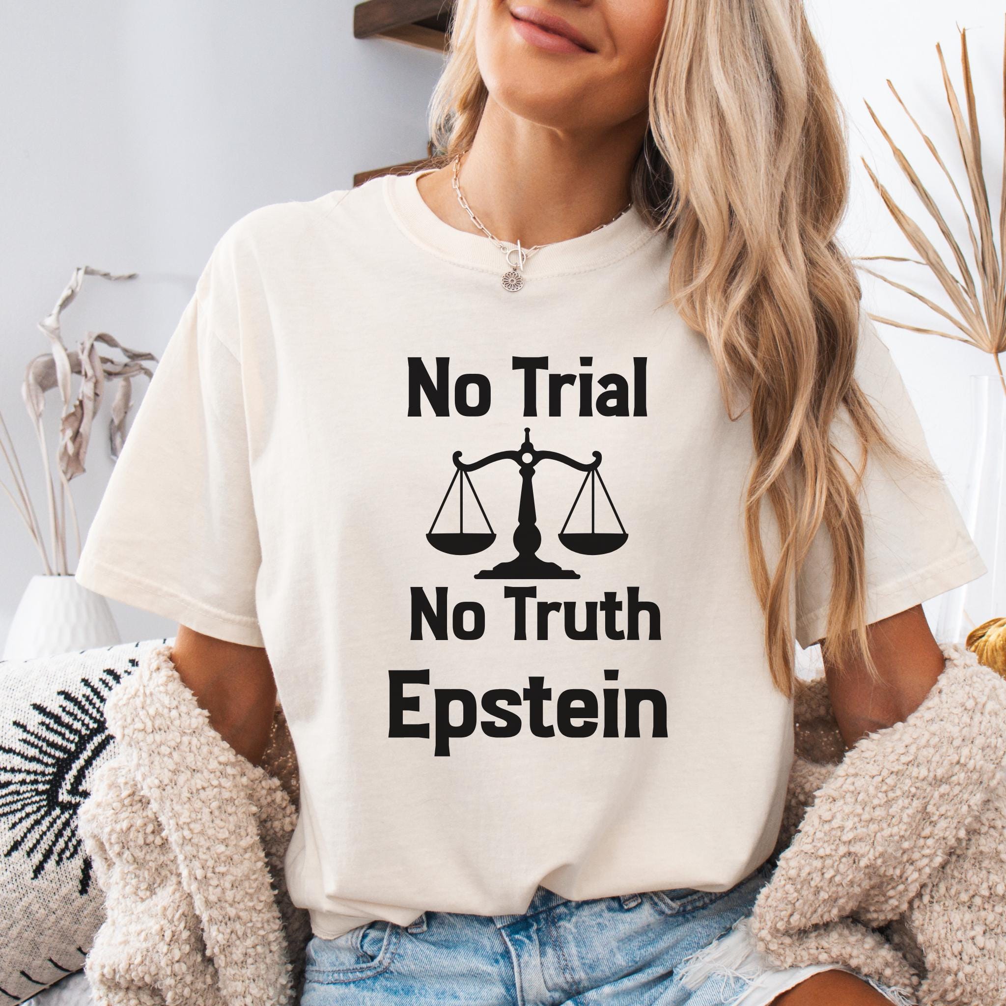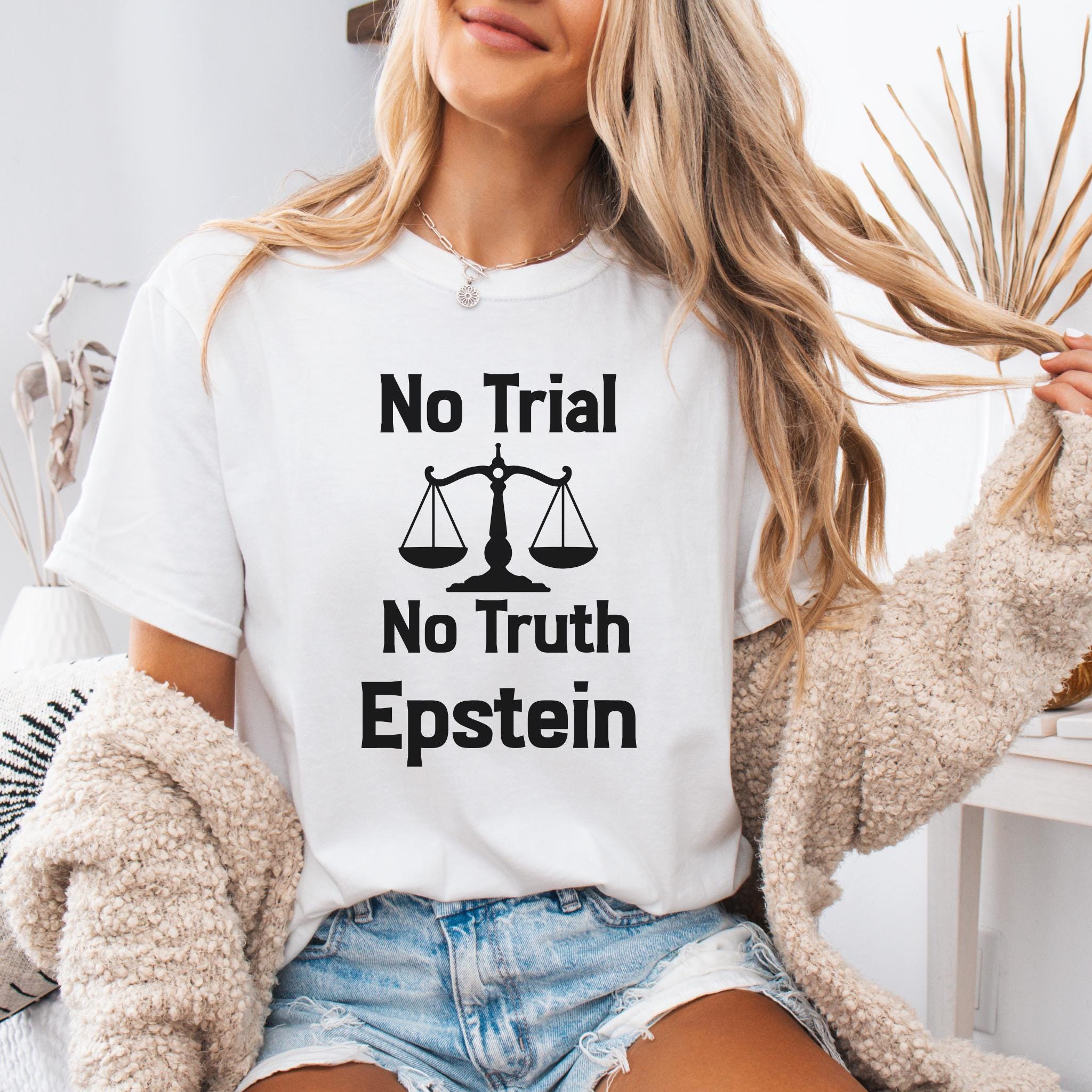 This No Trial No Truth protest Epstein t-shirt is a bold statement piece designed to raise awareness about justice, accountability, and transparency. Featuring a powerful balance scale graphic, this design reflects public frustration with systems that fail to deliver truth and accountability.