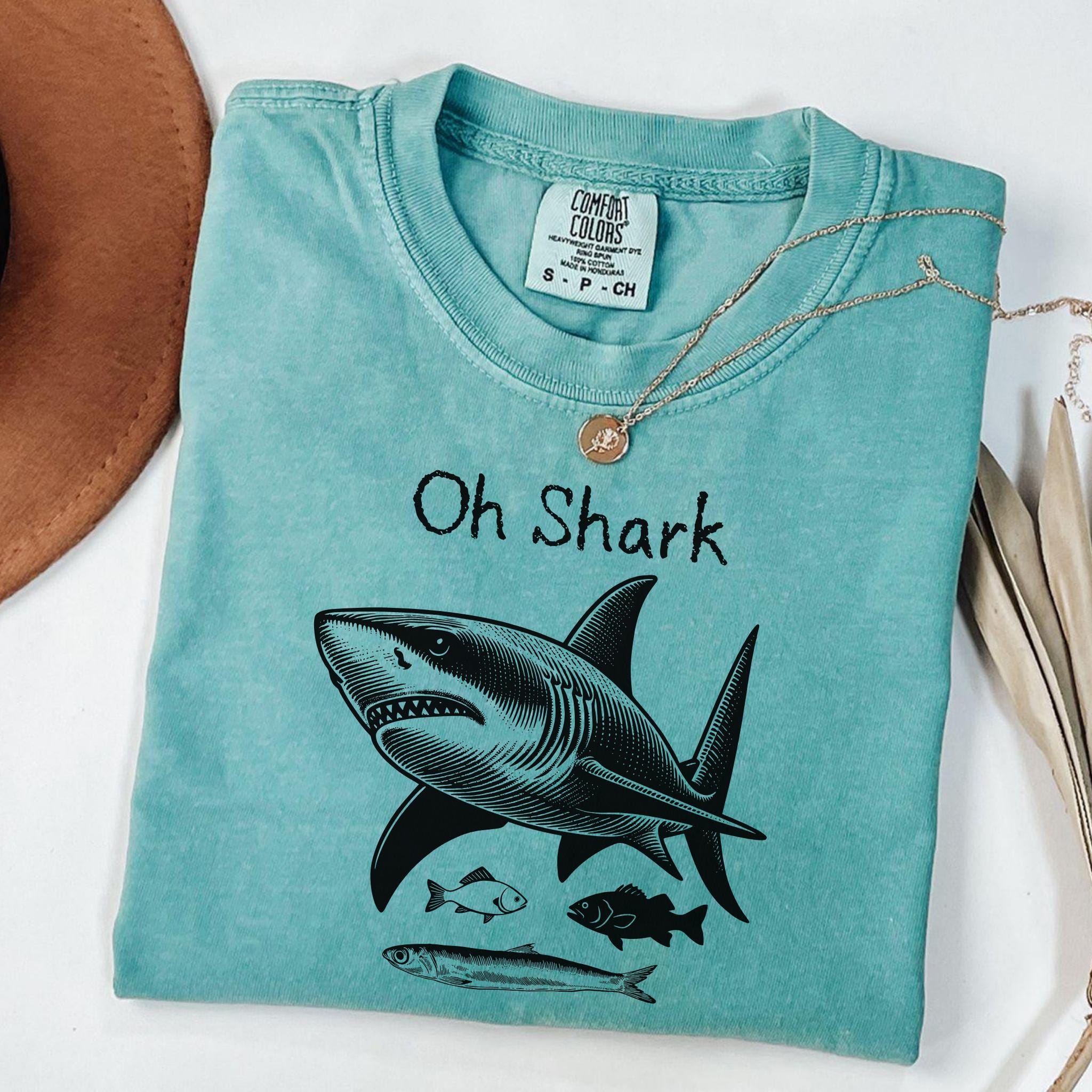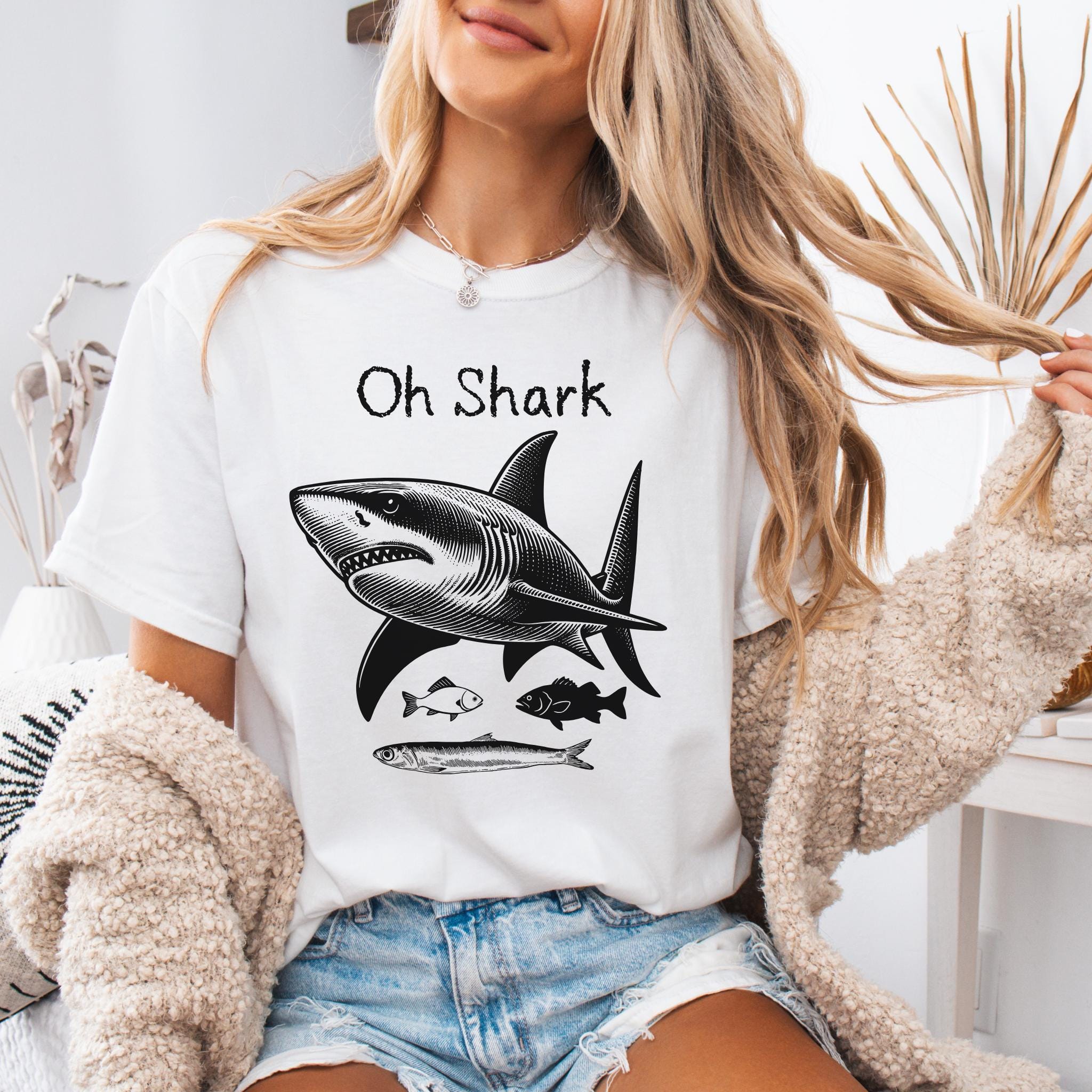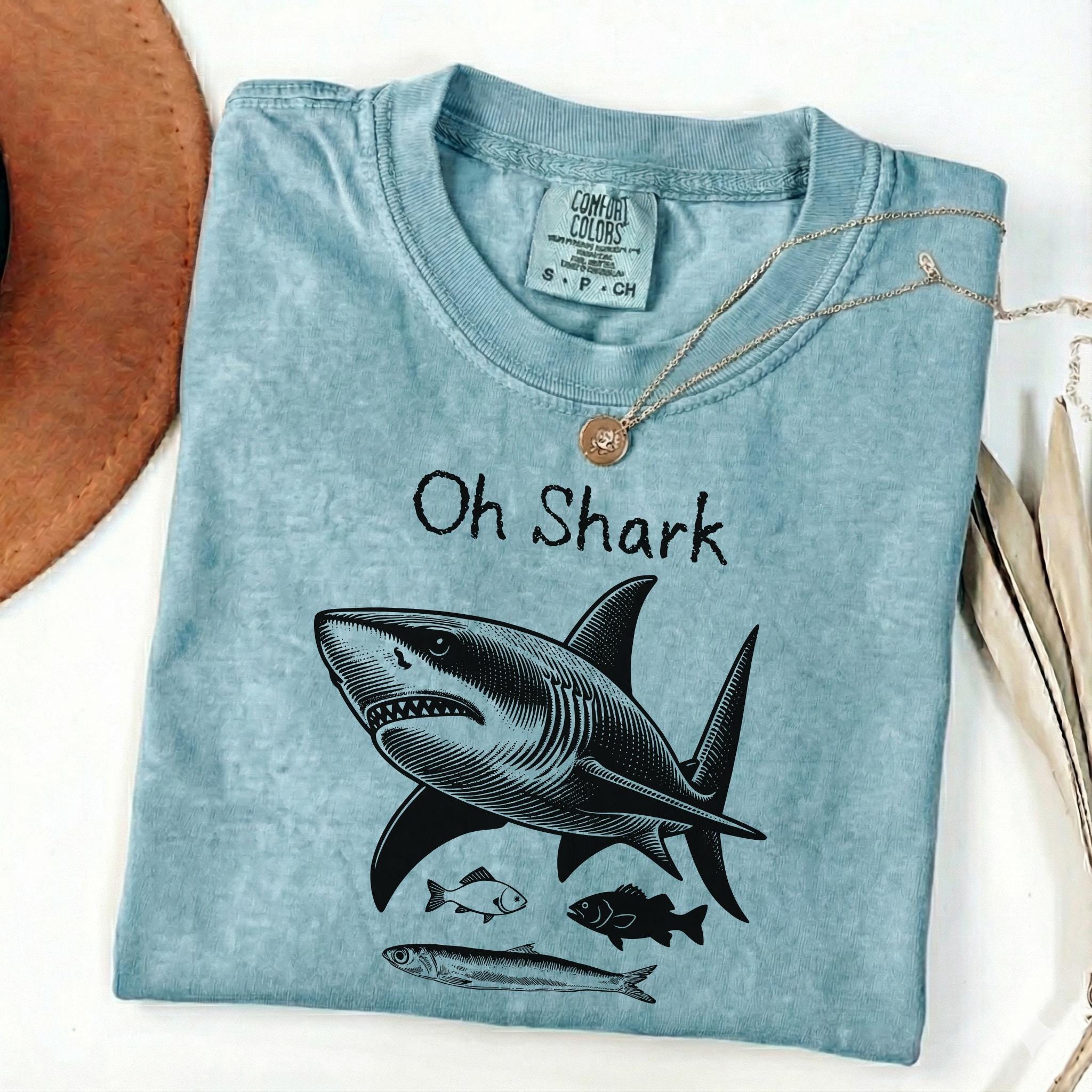Make waves with this bold and playful “Oh Shark” vintage-inspired graphic tee. Featuring a detailed engraved-style shark illustration with smaller fish beneath, this design blends classic marine art with a humorous twist. The hand-drawn linework gives it a timeless, old-school nautical aesthetic — perfect for ocean lovers, beachgoers, and shark enthusiasts.