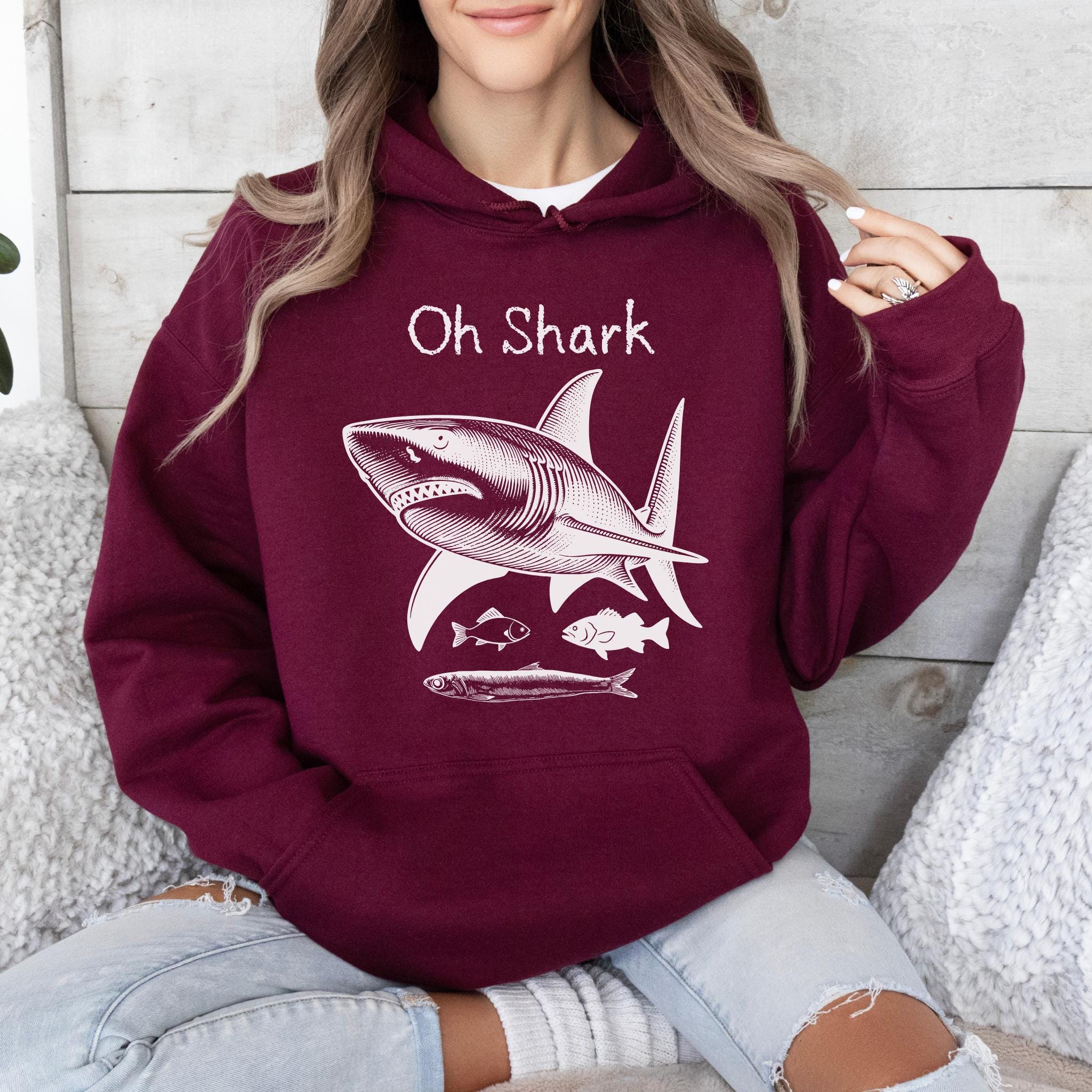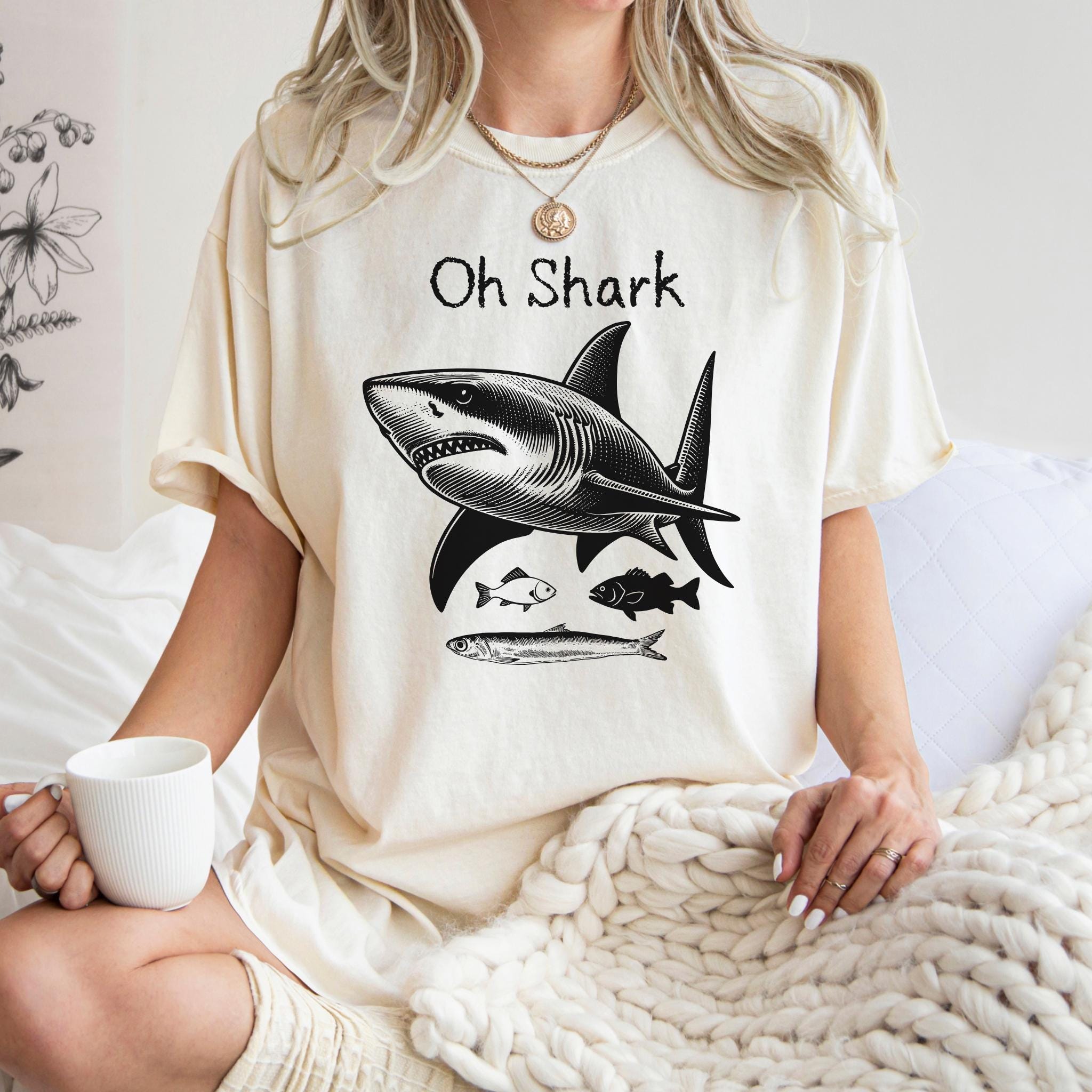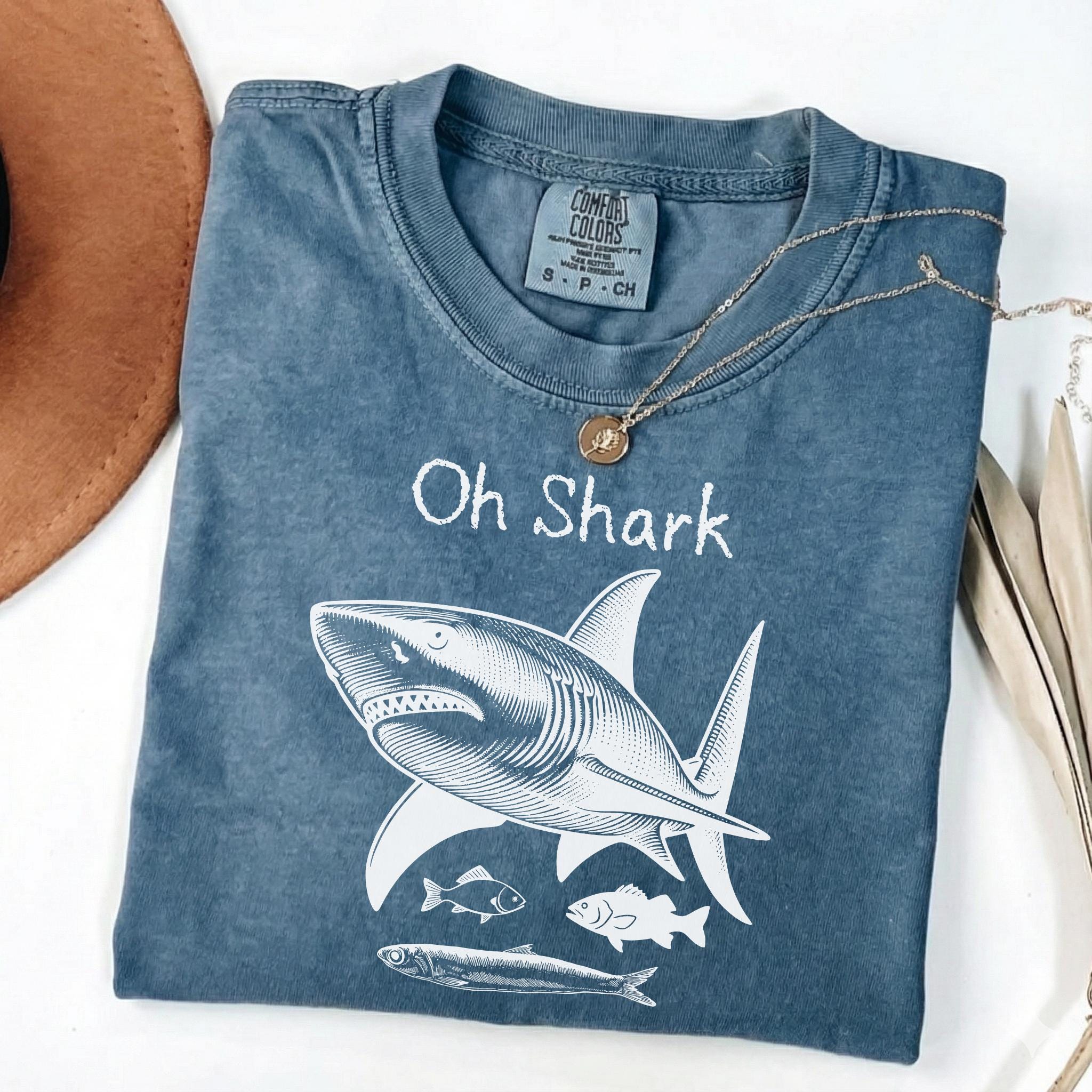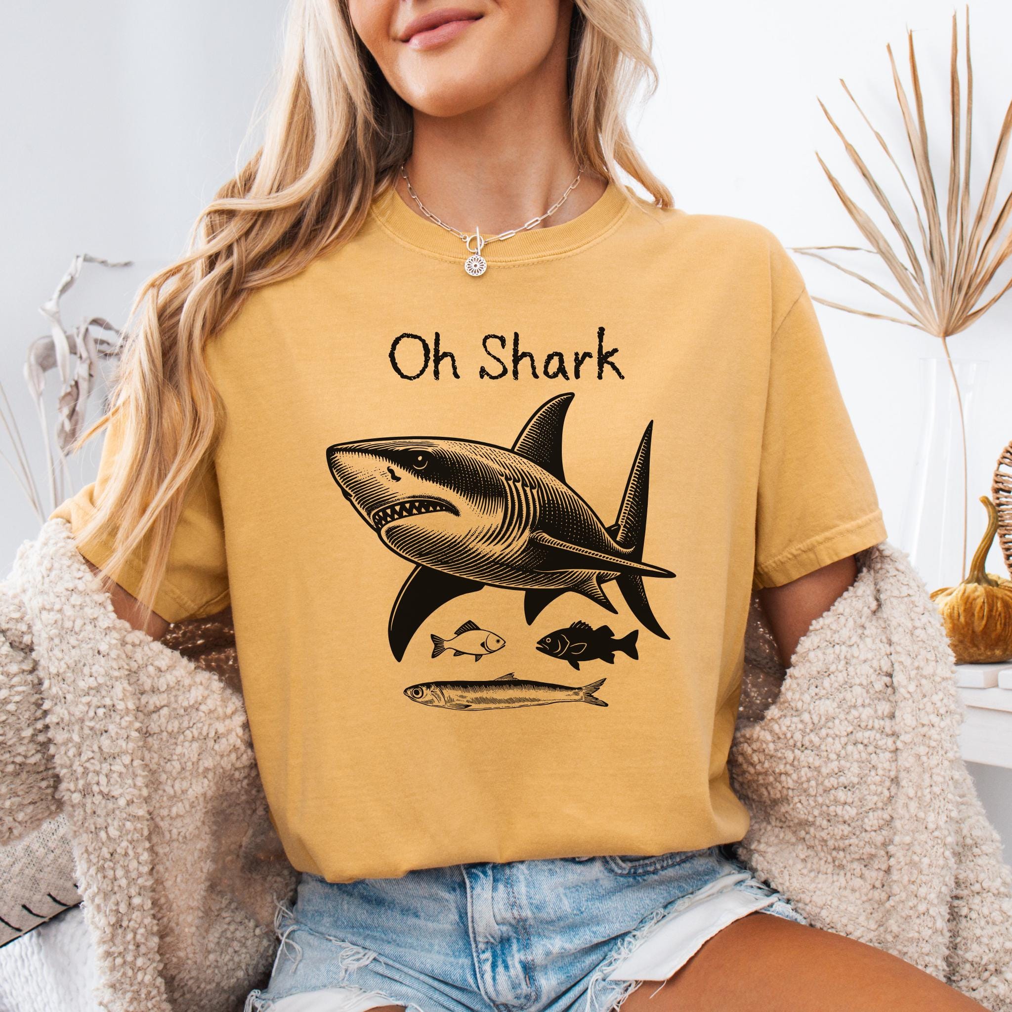 Make waves with this bold and playful “Oh Shark” vintage-inspired graphic tee. Featuring a detailed engraved-style shark illustration with smaller fish beneath, this design blends classic marine art with a humorous twist. The hand-drawn linework gives it a timeless, old-school nautical aesthetic — perfect for ocean lovers, beachgoers, and shark enthusiasts.