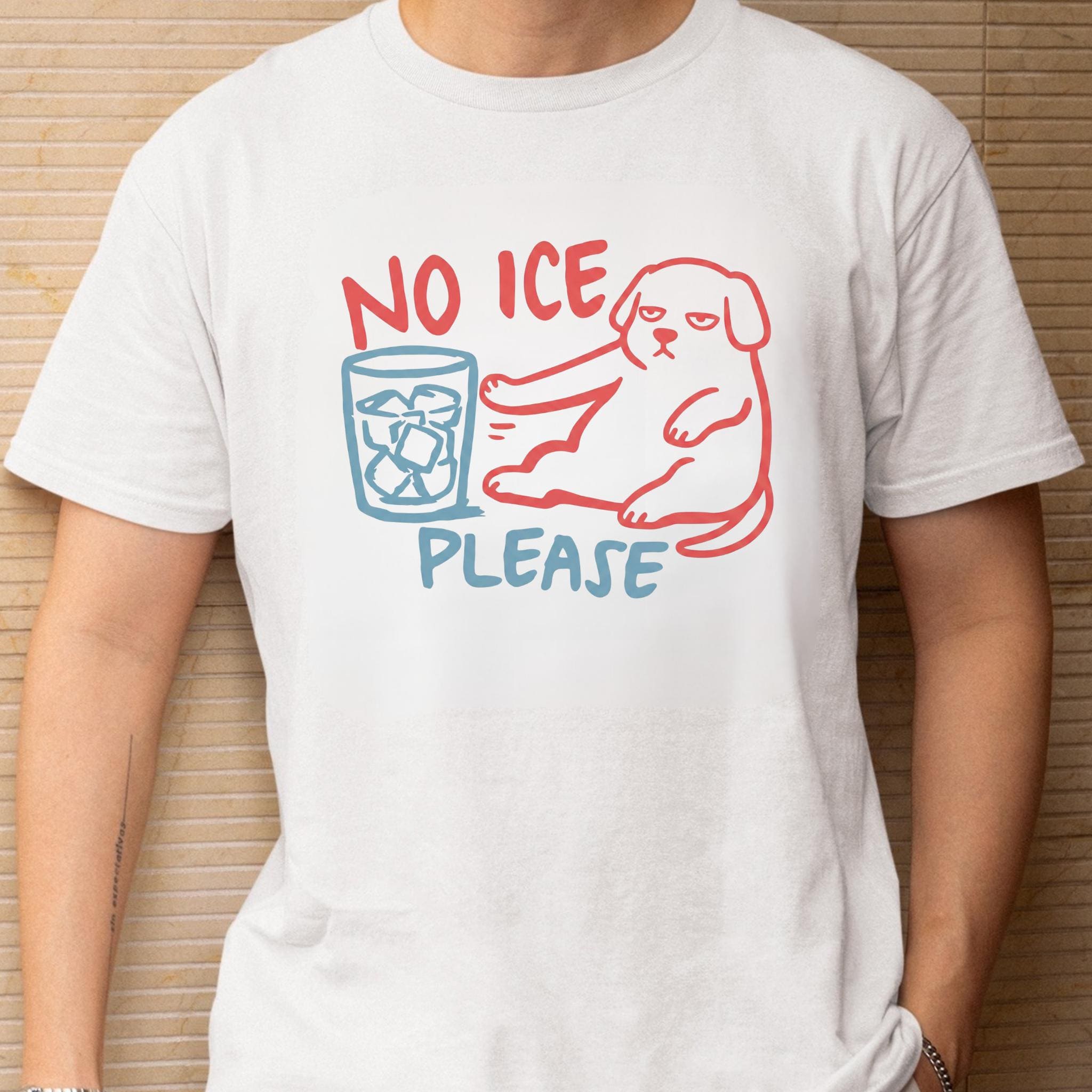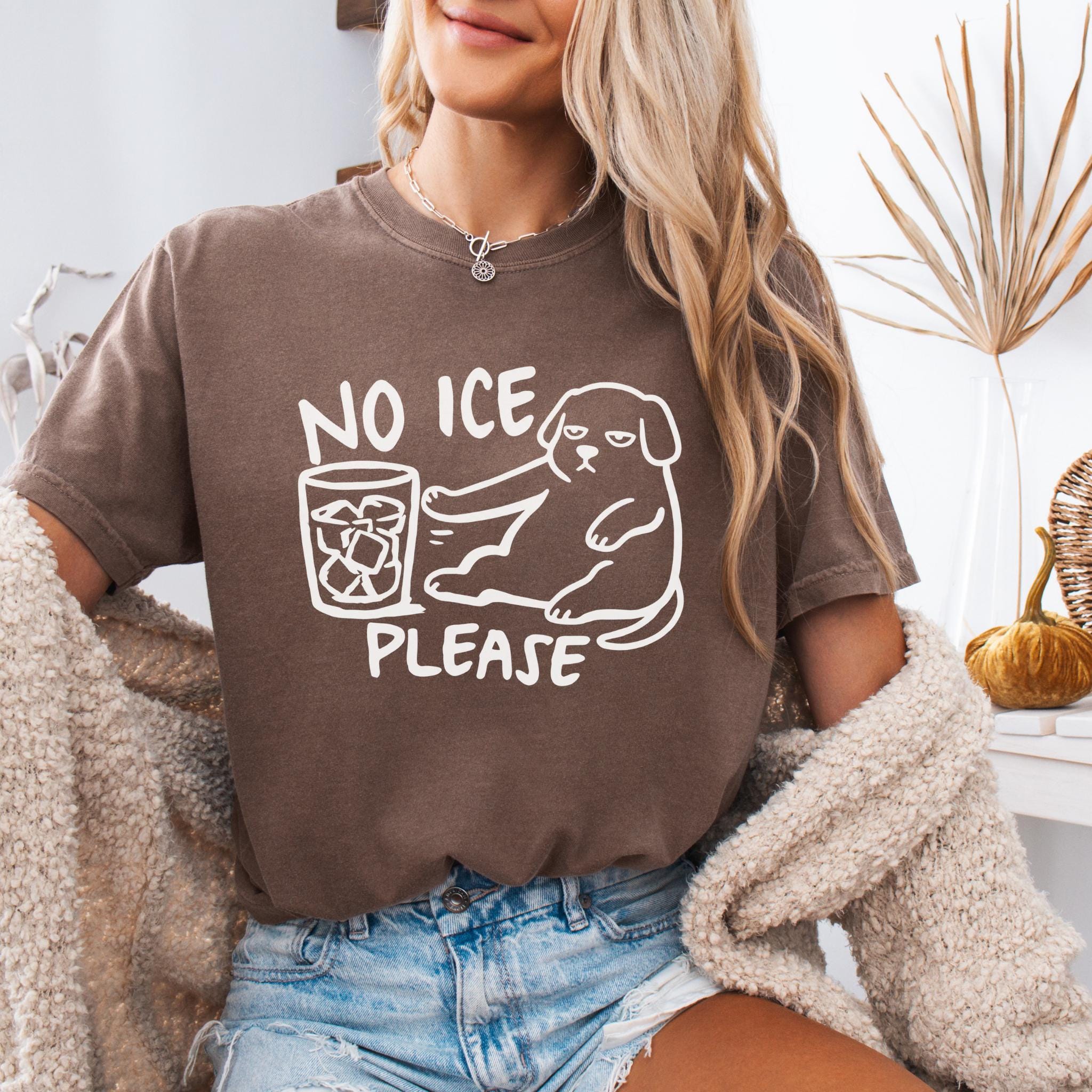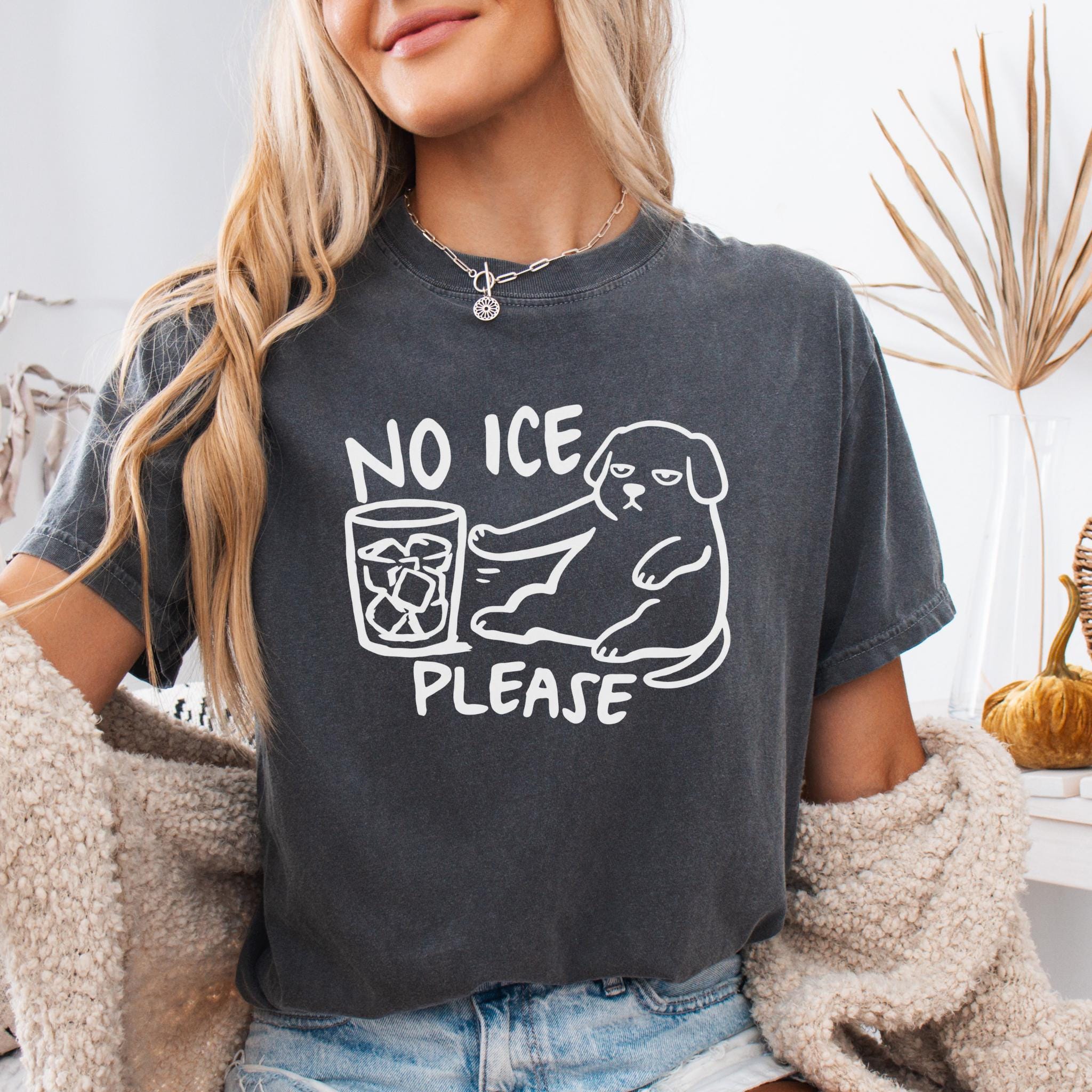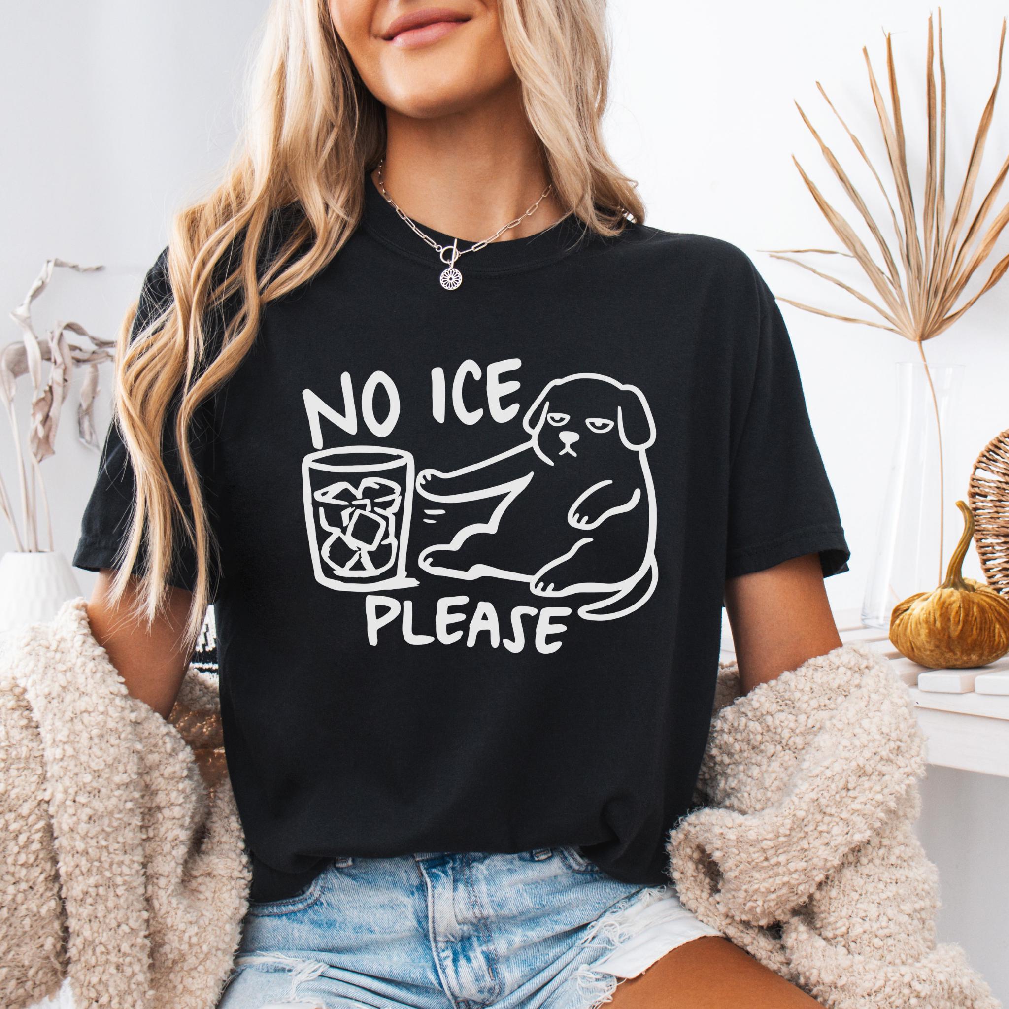 This “NO ICE PLEASE DOG” graphic tee features a simple line-art style dog pushing away a glass full of ice — the perfect visual for anyone who is tired of paying for a cup full of cubes instead of a real drink.
