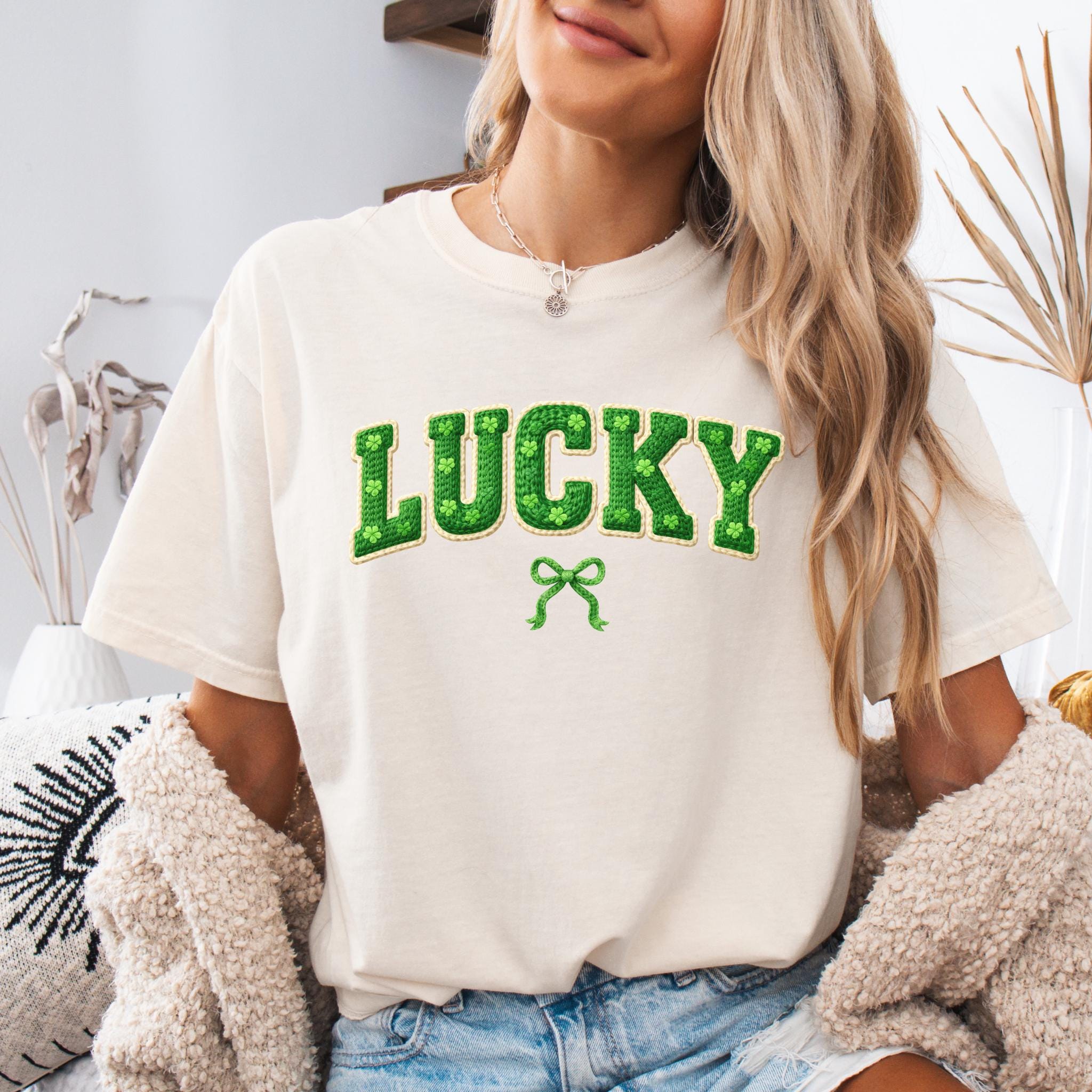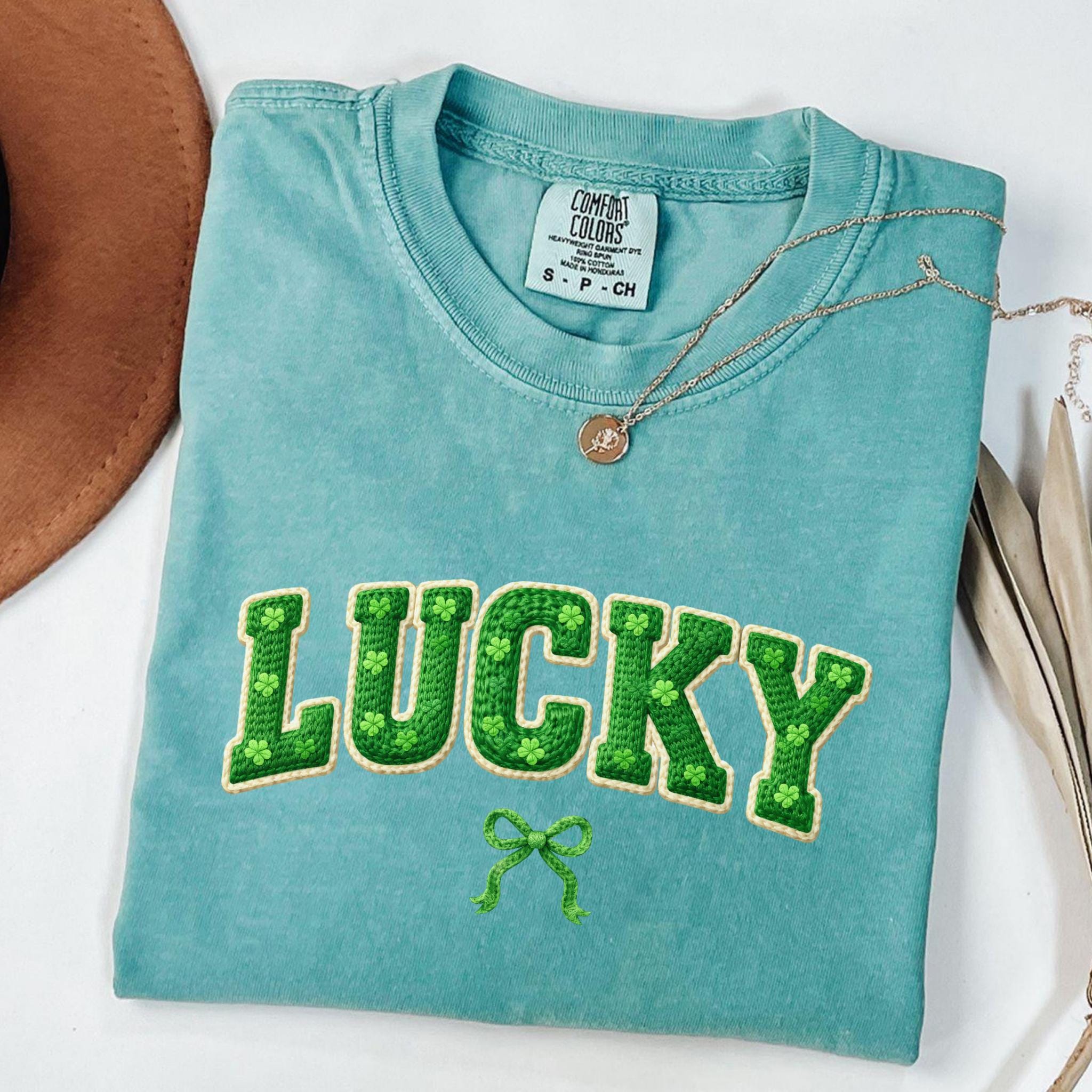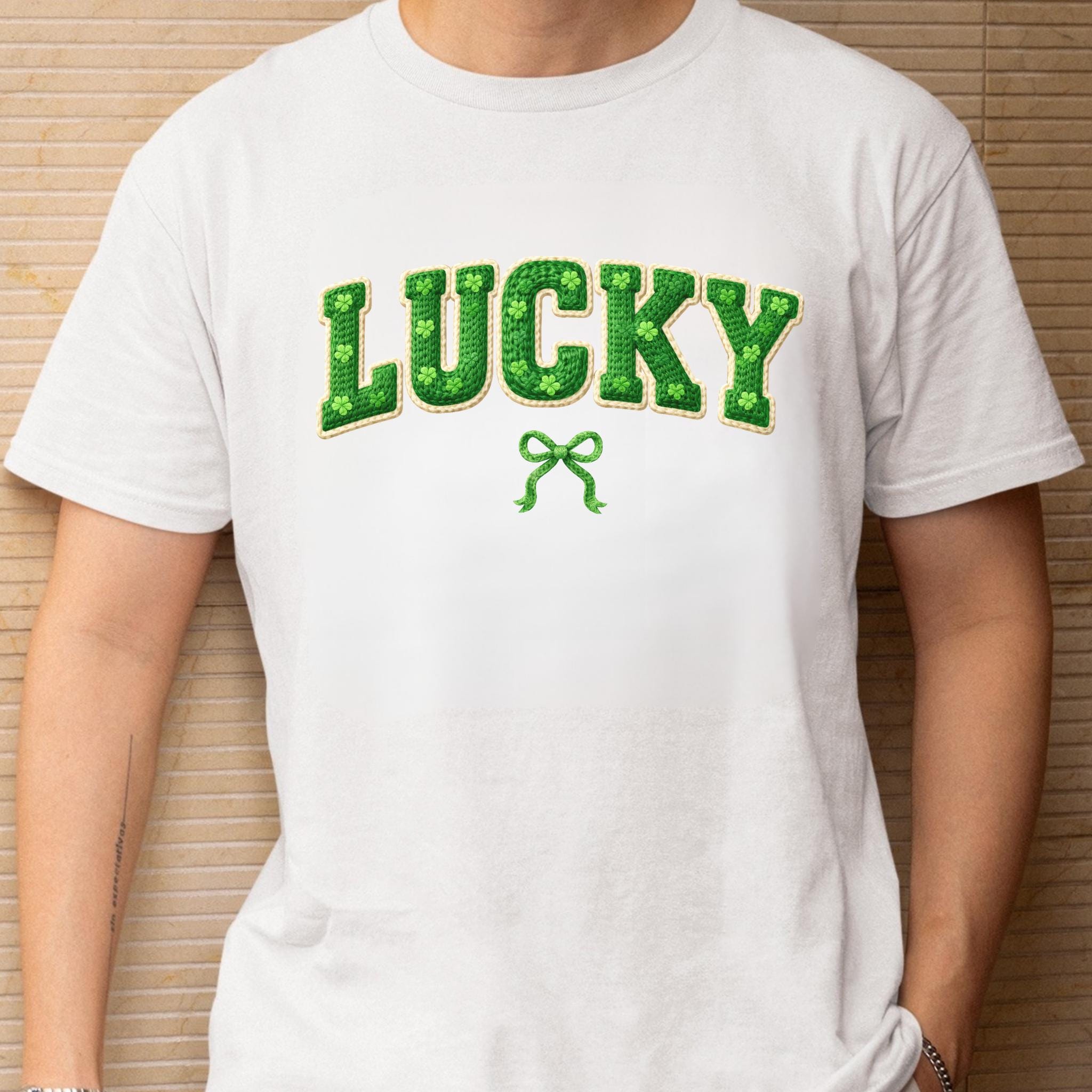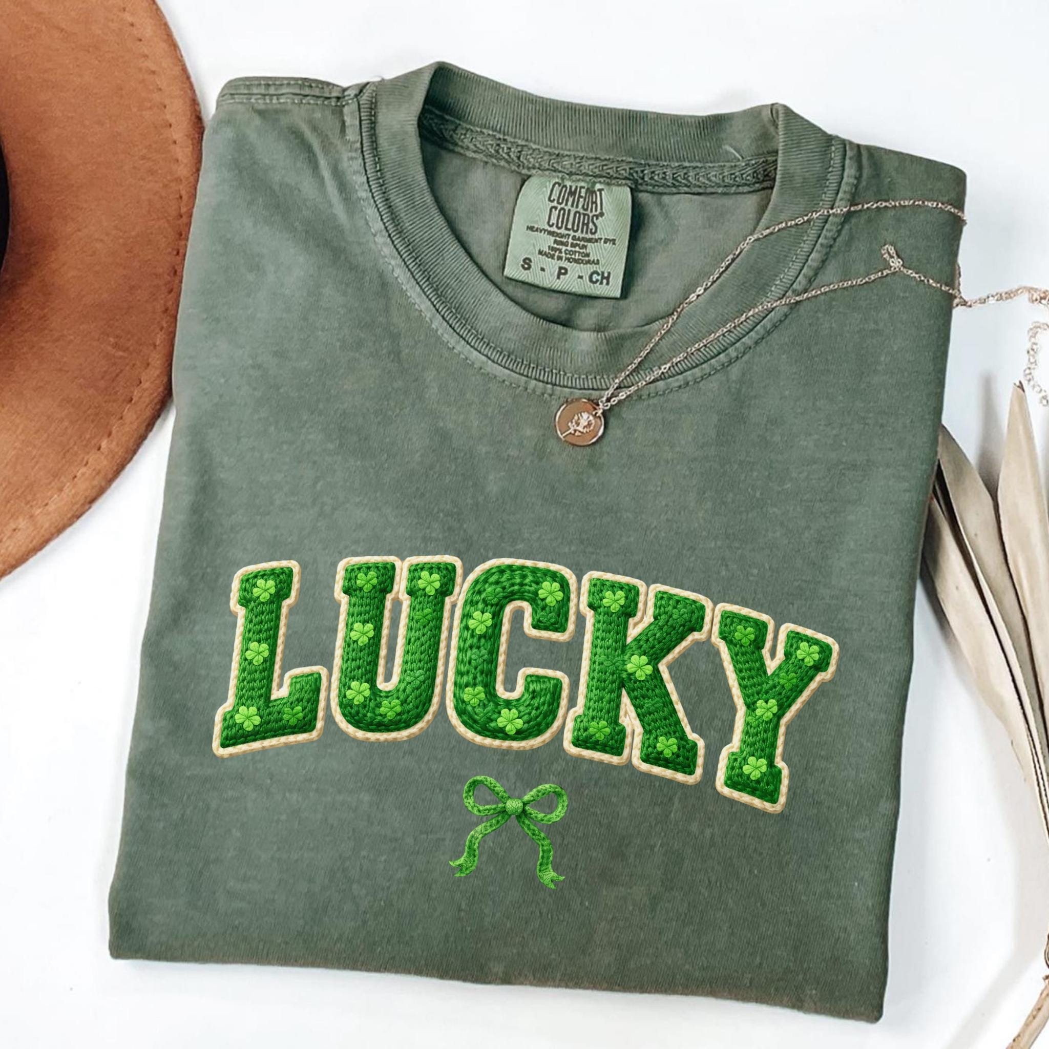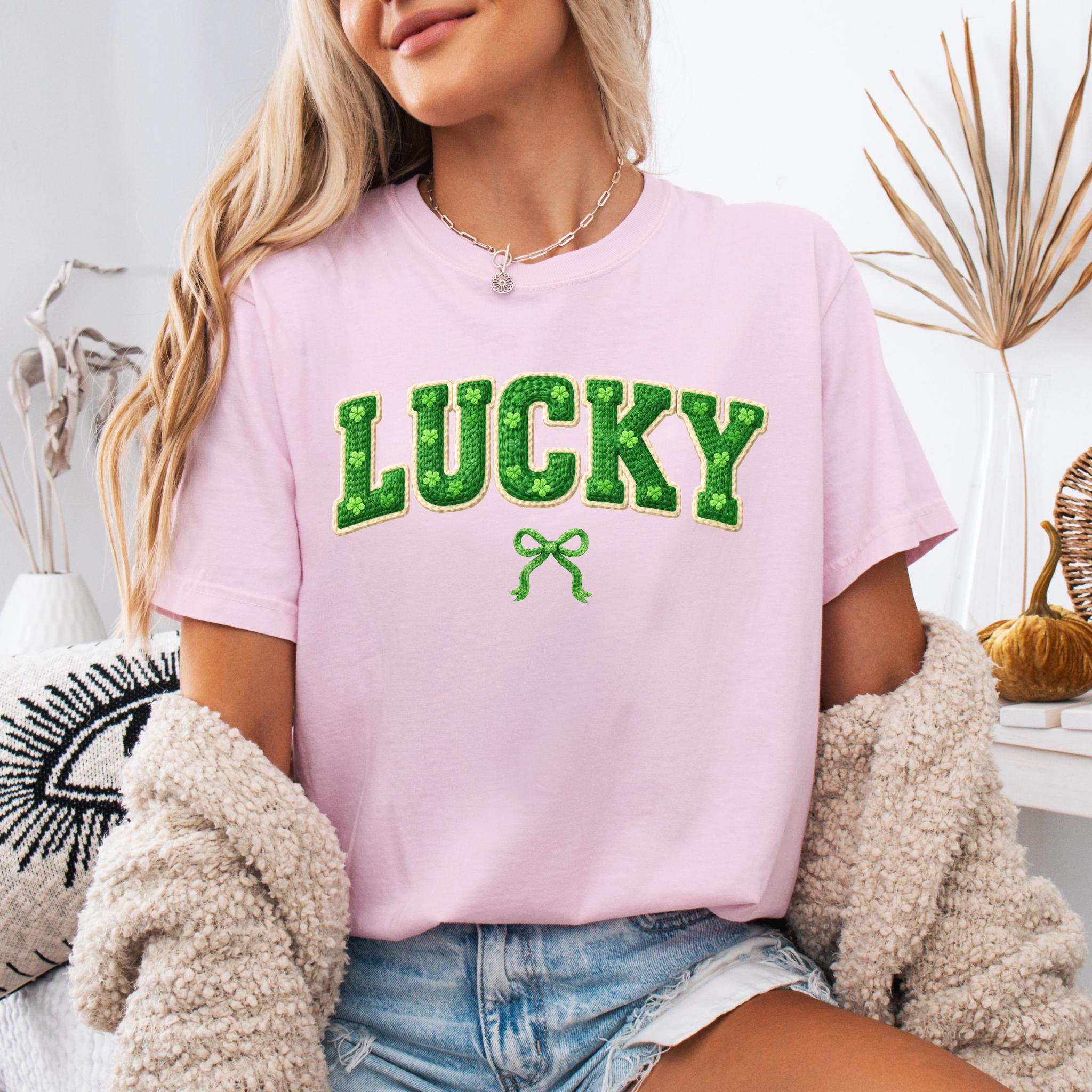 This “LUCKY” graphic tee features a detailed Faux Knitted Yarn Effect design that mimics the texture of real stitched embroidery and chunky sweater knit — without the bulk. The letters are styled with shamrock-inspired detailing and finished with a soft bow accent, creating a warm, preppy aesthetic.