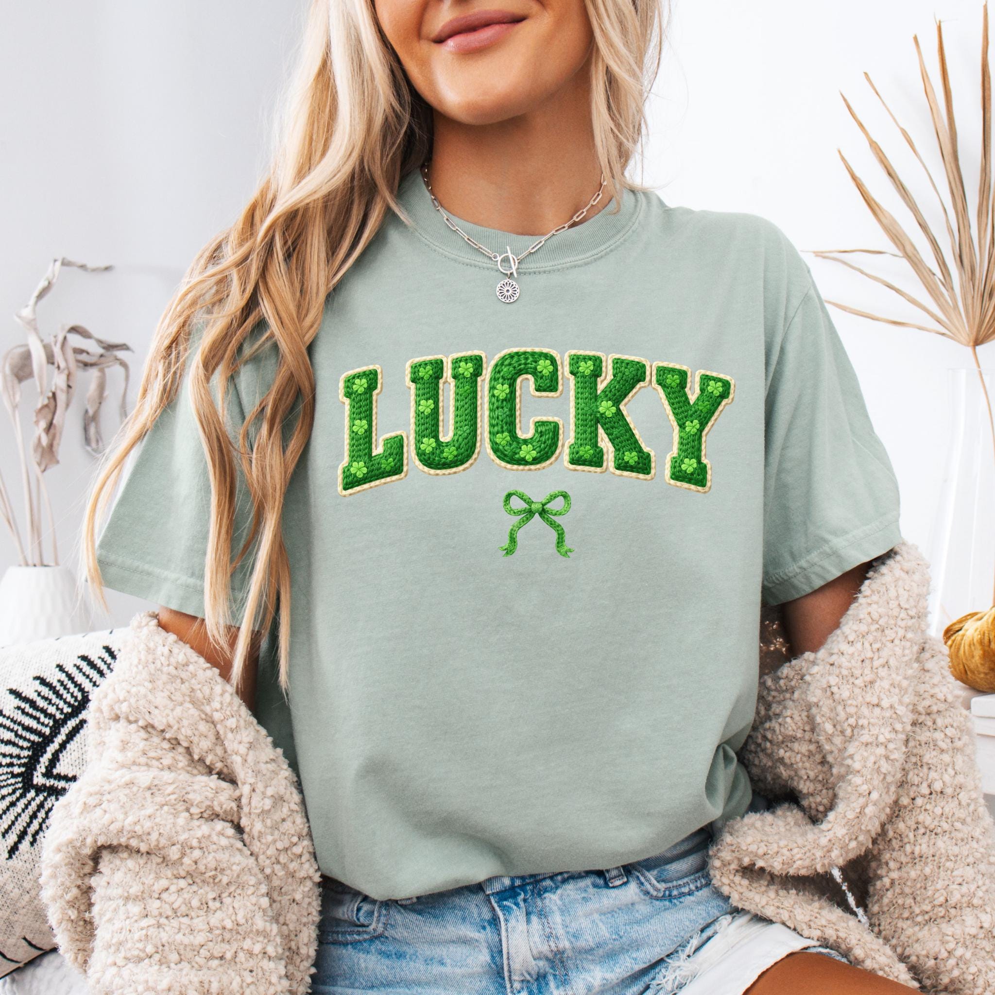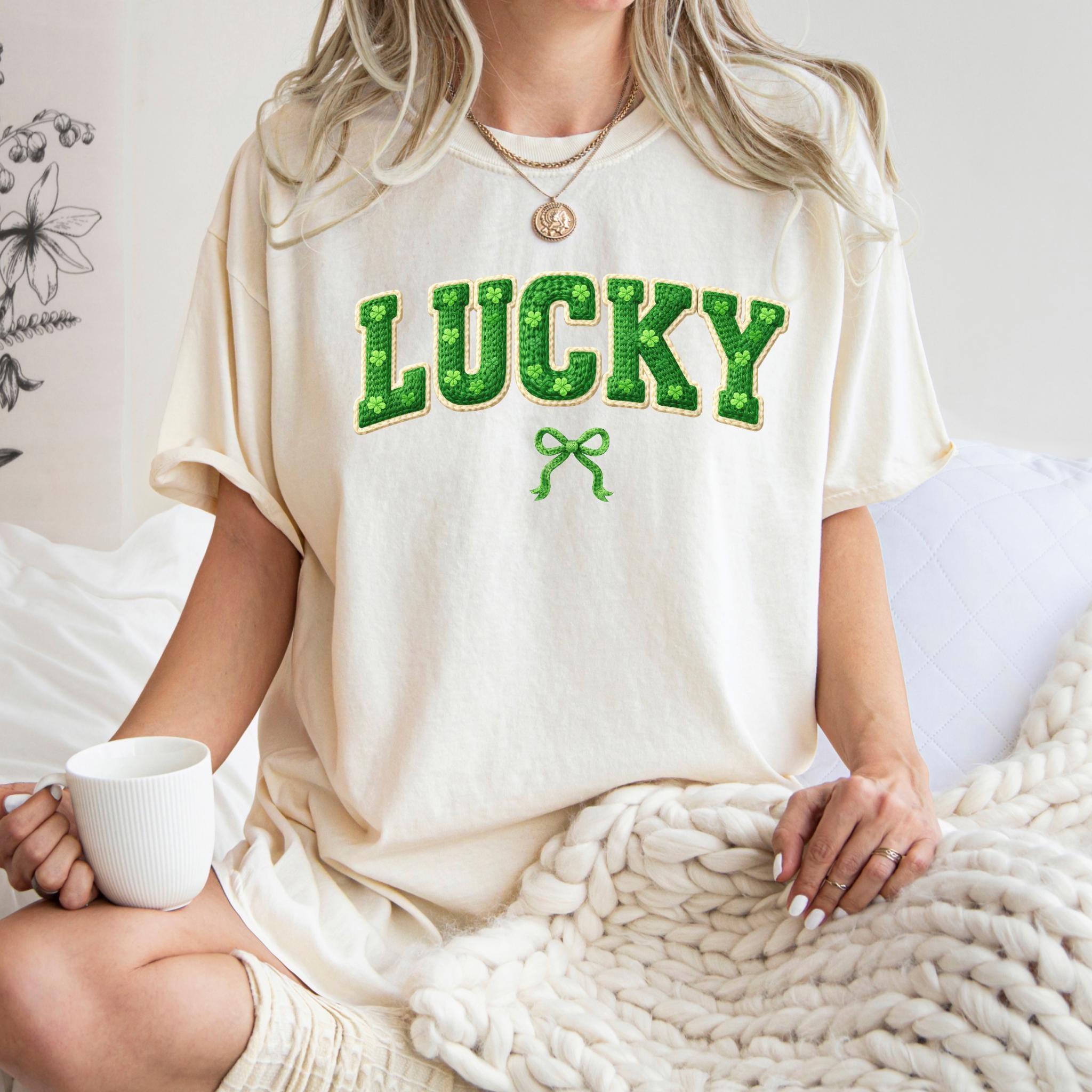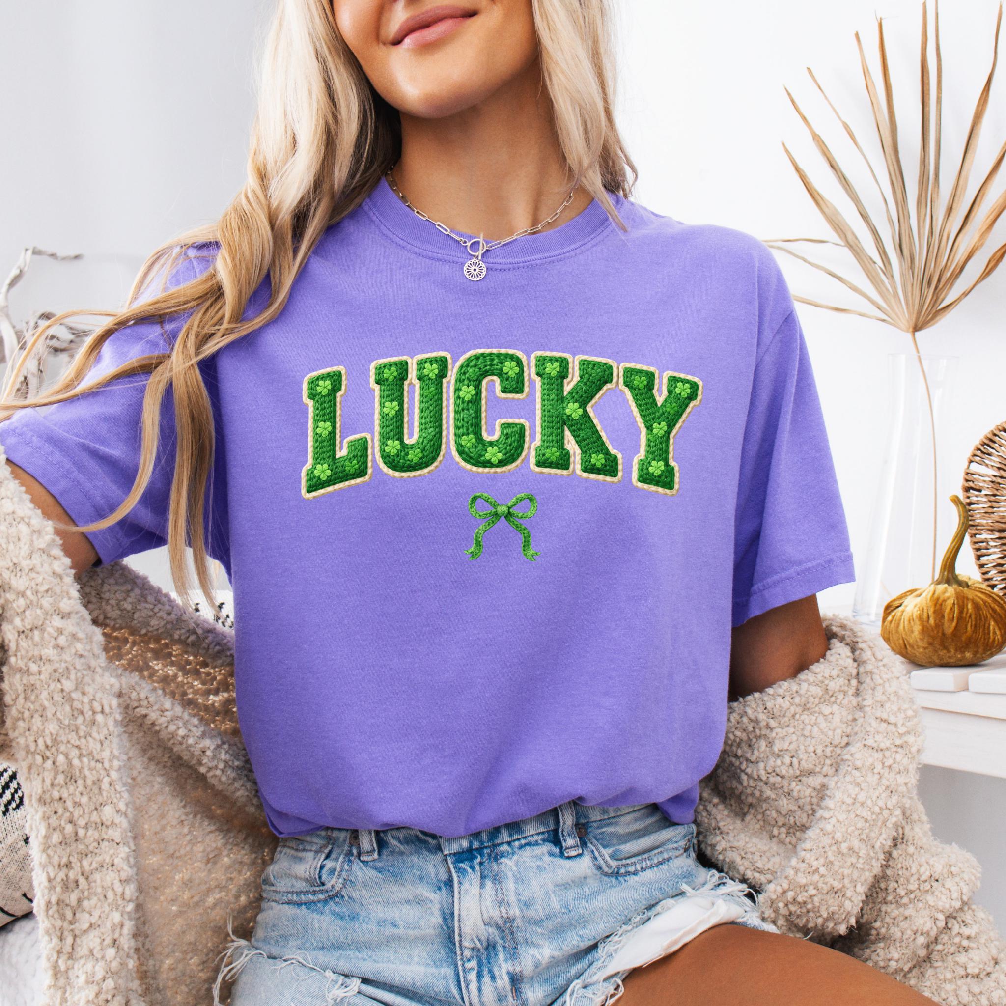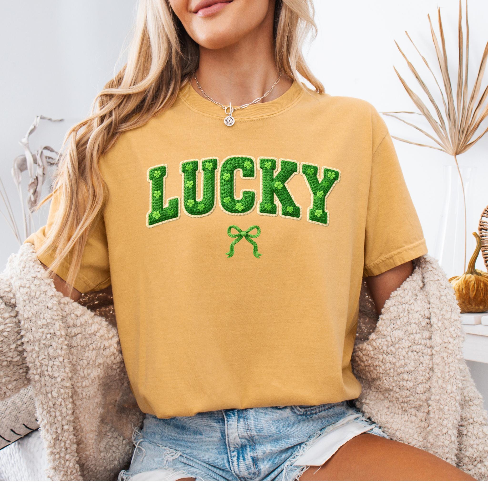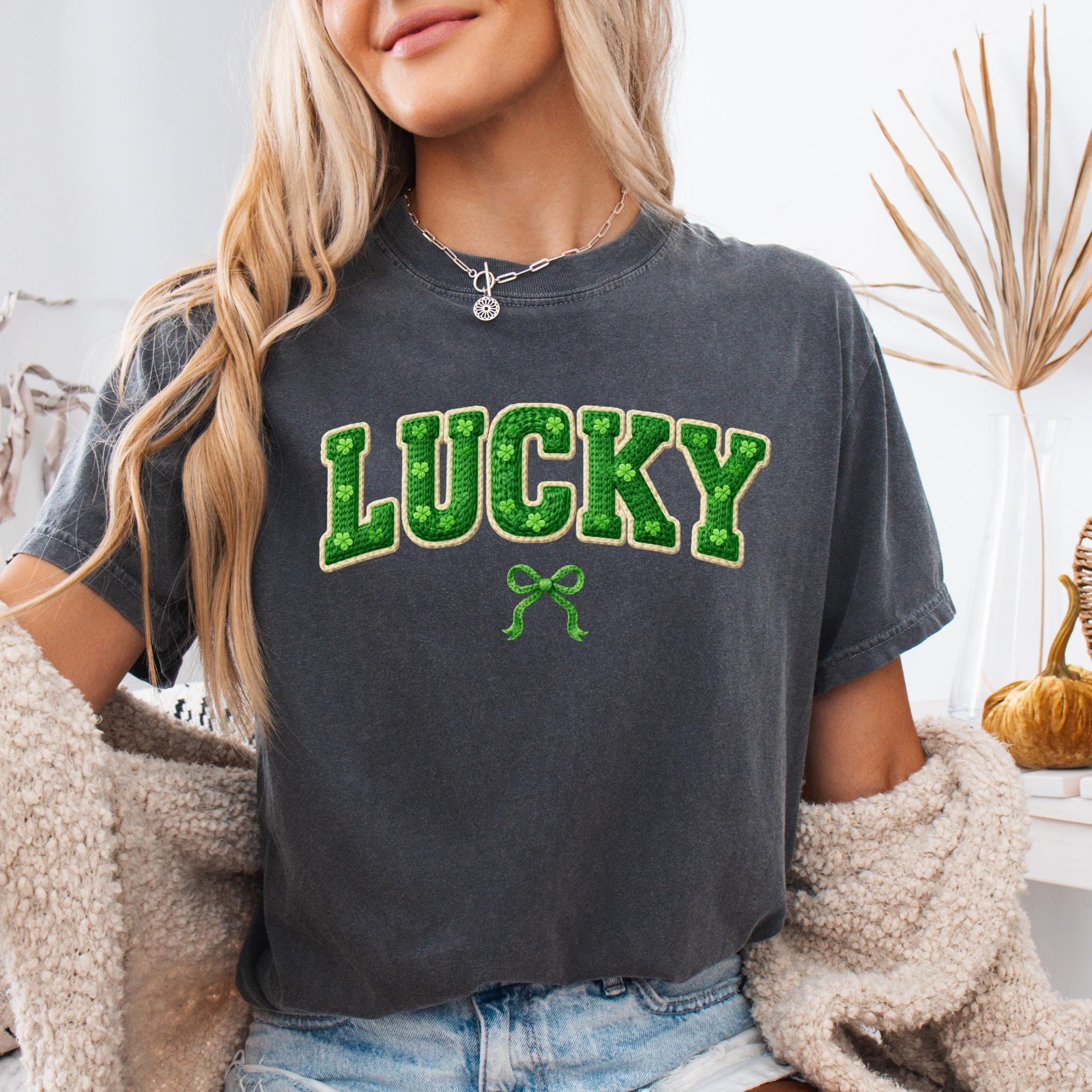 This “LUCKY” graphic tee features a detailed Faux Knitted Yarn Effect design that mimics the texture of real stitched embroidery and chunky sweater knit — without the bulk. The letters are styled with shamrock-inspired detailing and finished with a soft bow accent, creating a warm, preppy aesthetic.