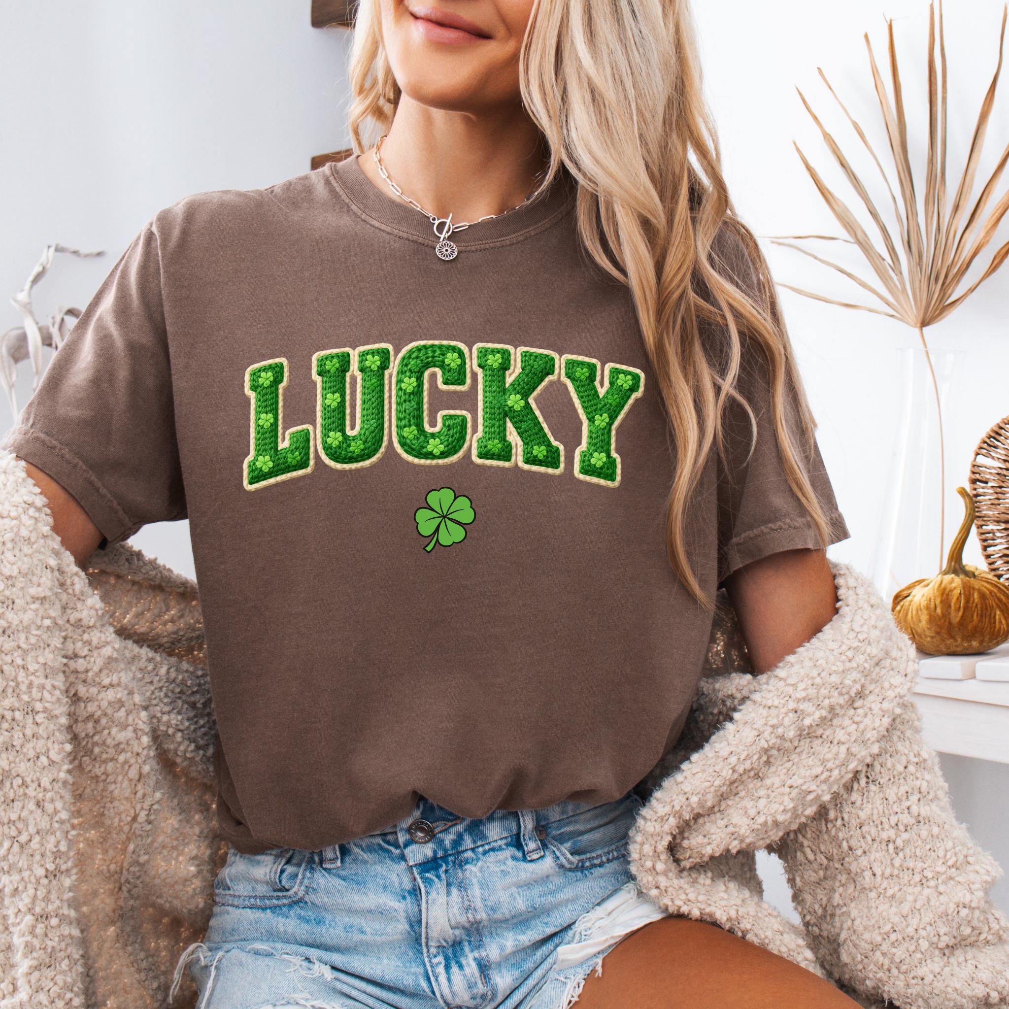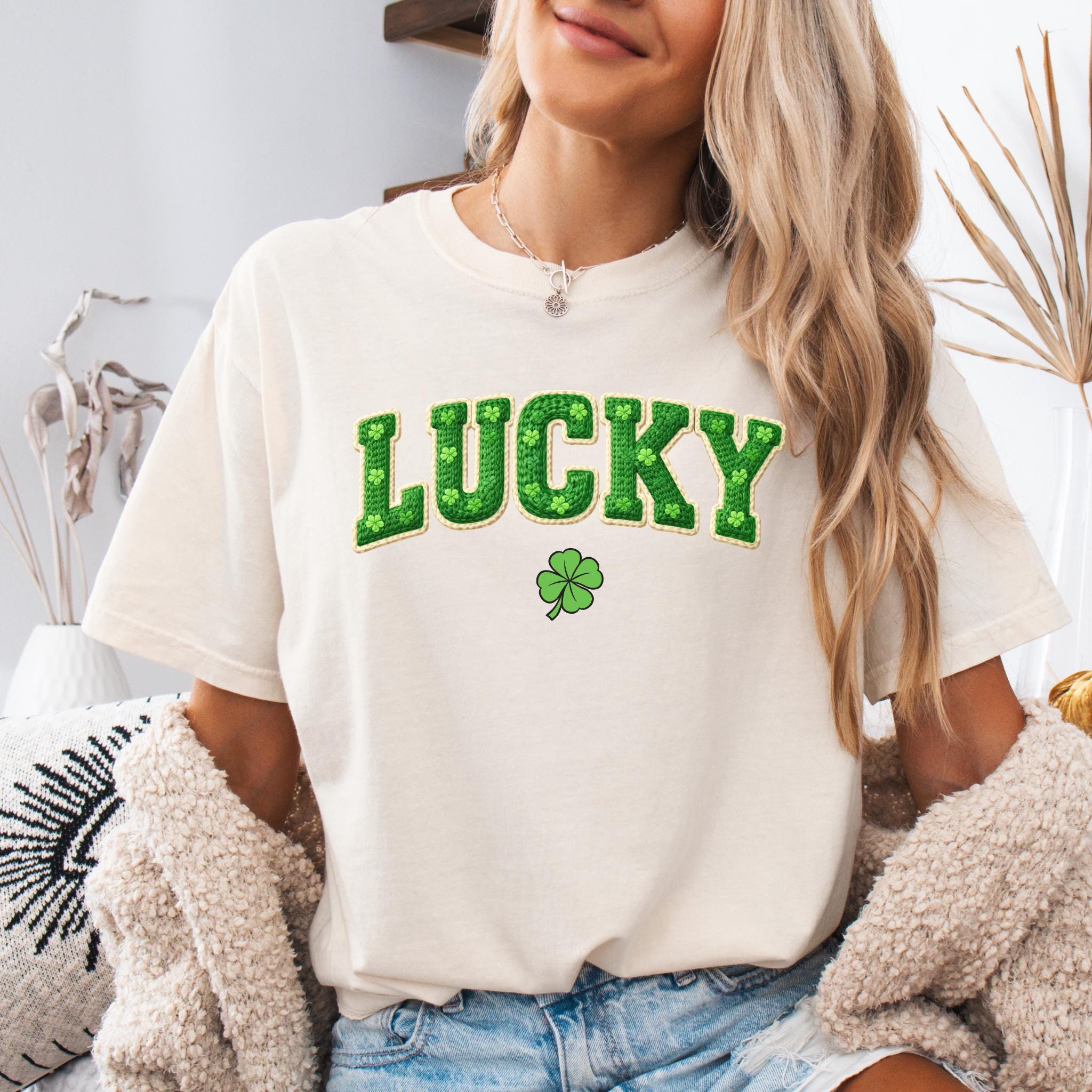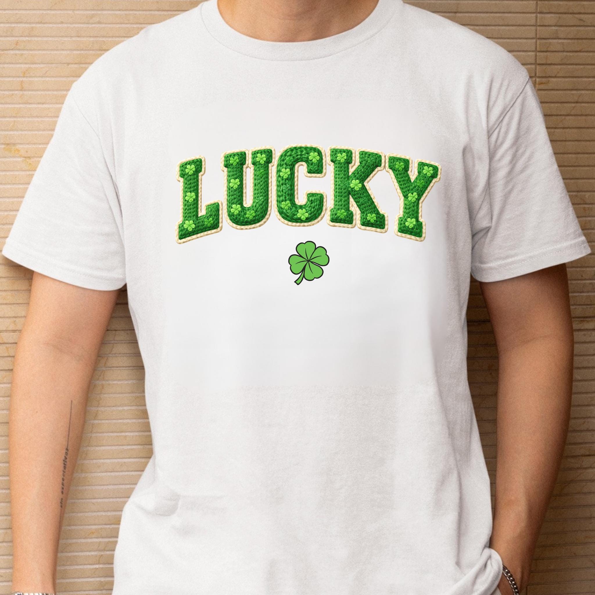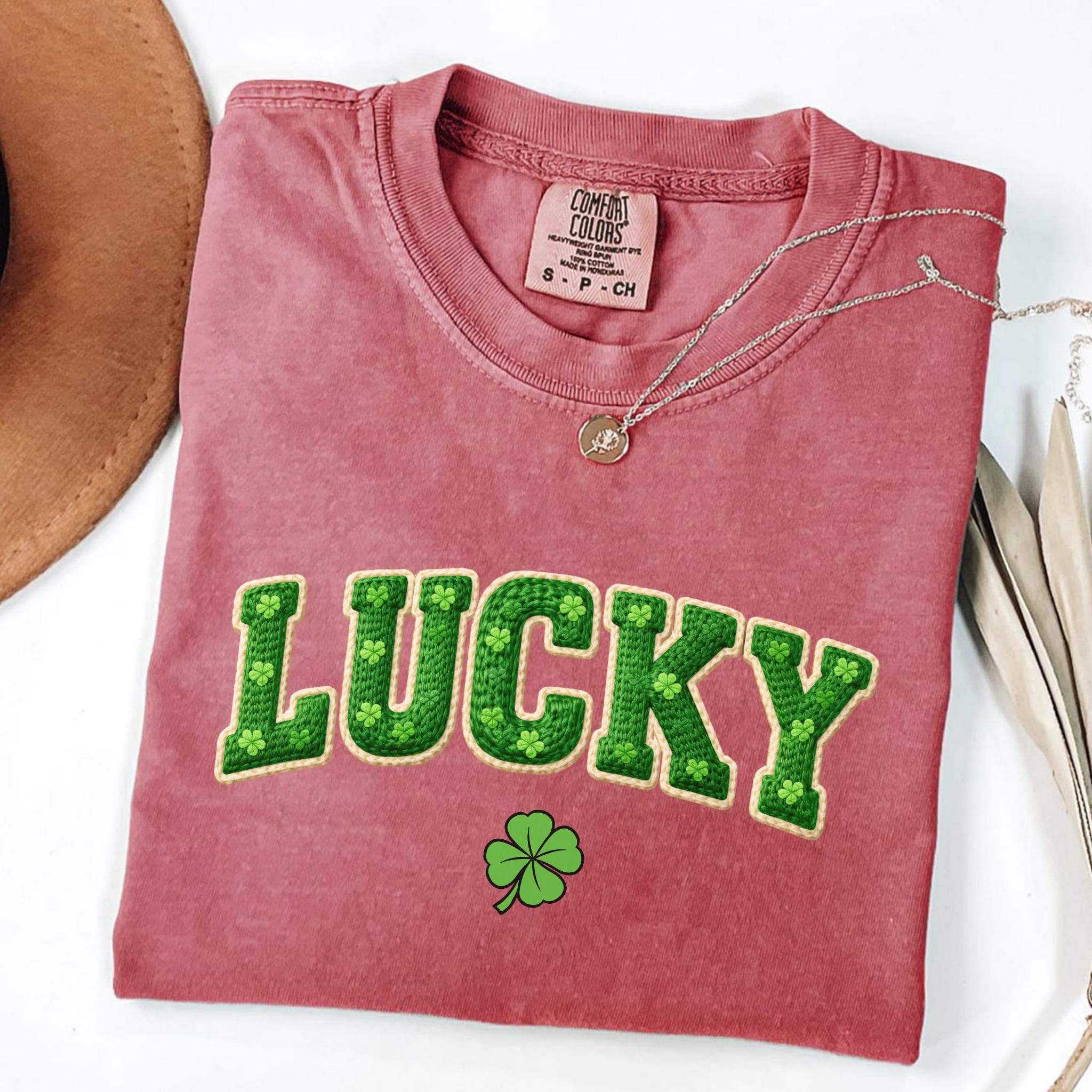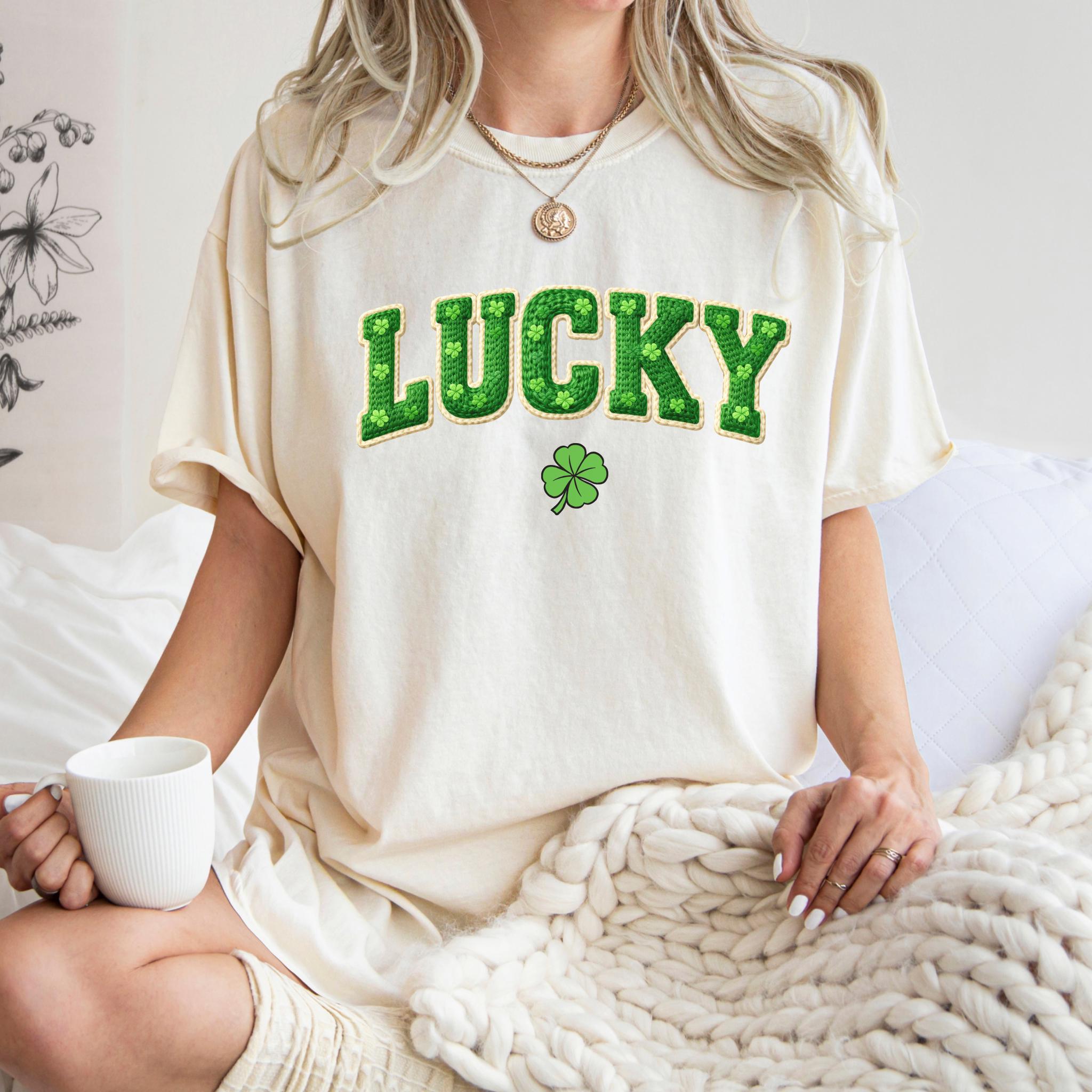 This “LUCKY” graphic tee features a detailed Faux Knitted Yarn design that mimics the texture of real stitched embroidery and chunky sweater knit — without the bulk. The letters are styled with shamrock-inspired detailing and finished with a soft bow accent, creating a warm, preppy aesthetic.