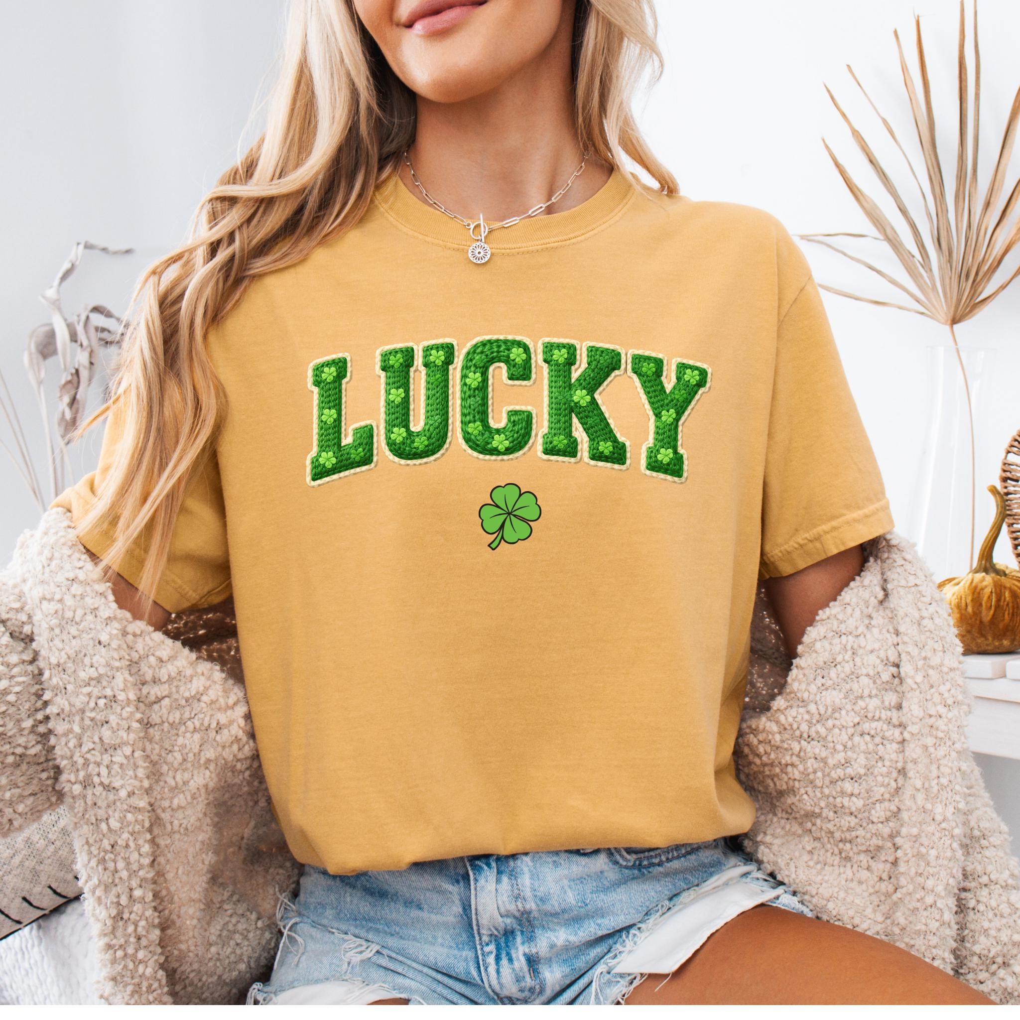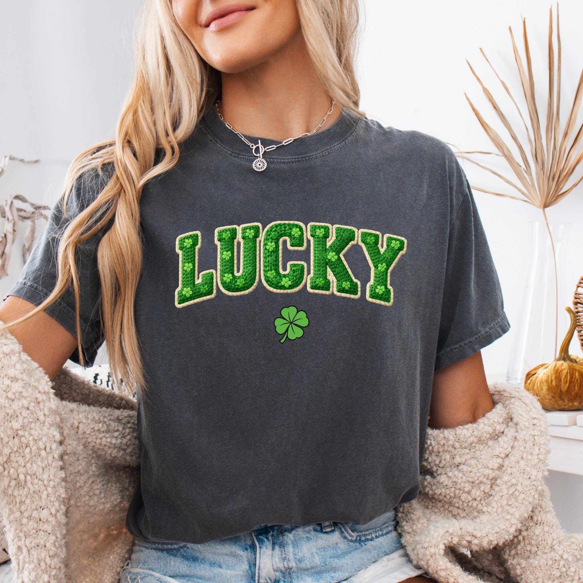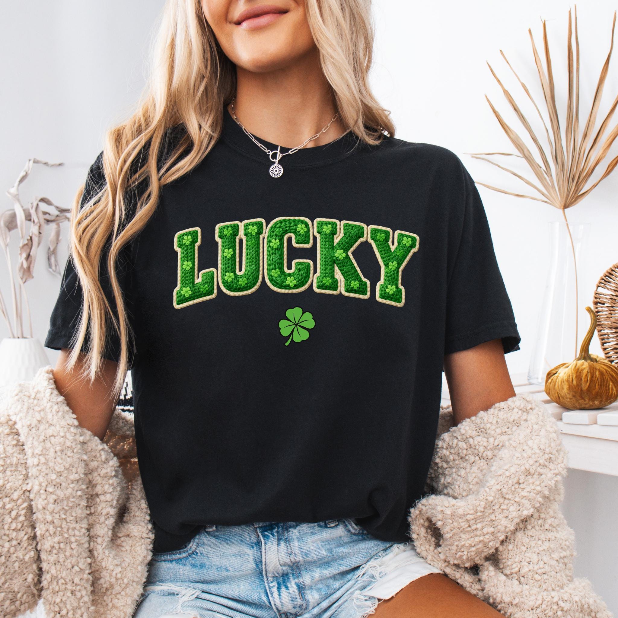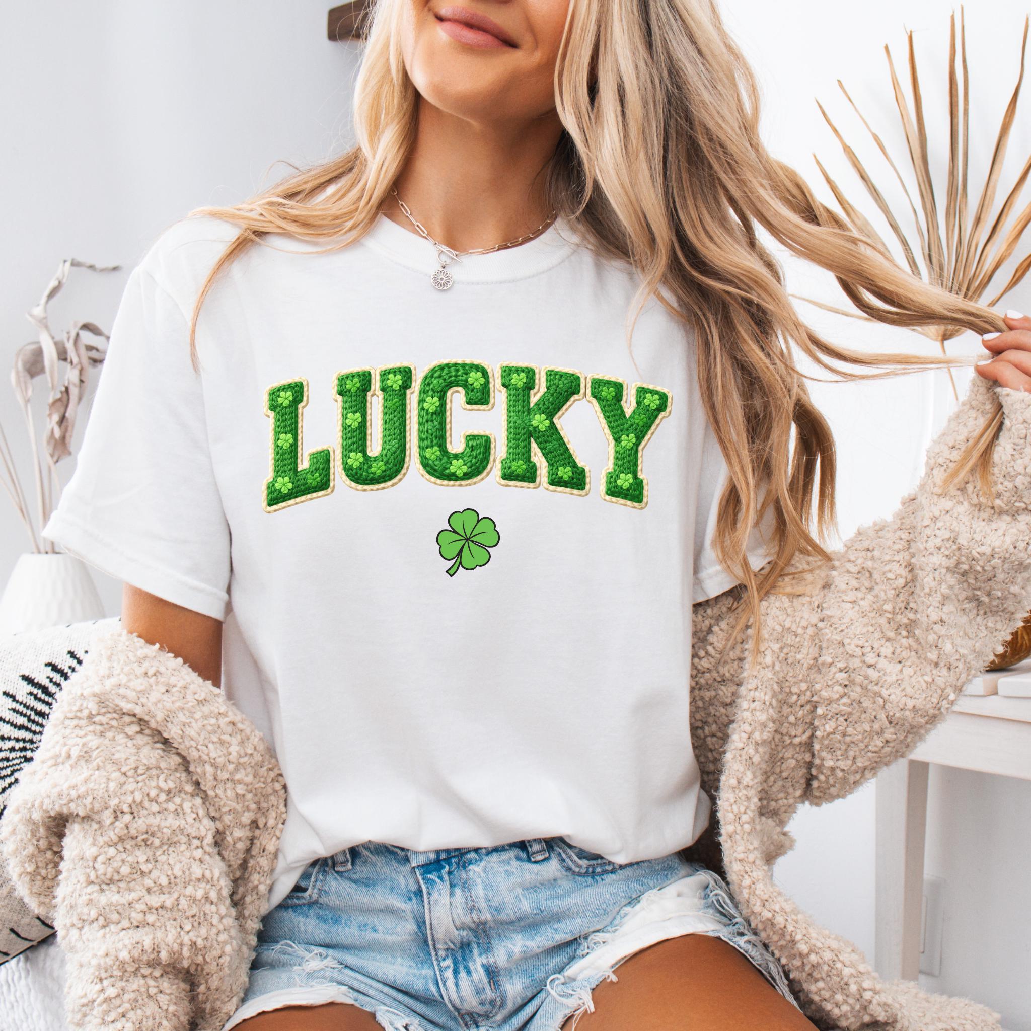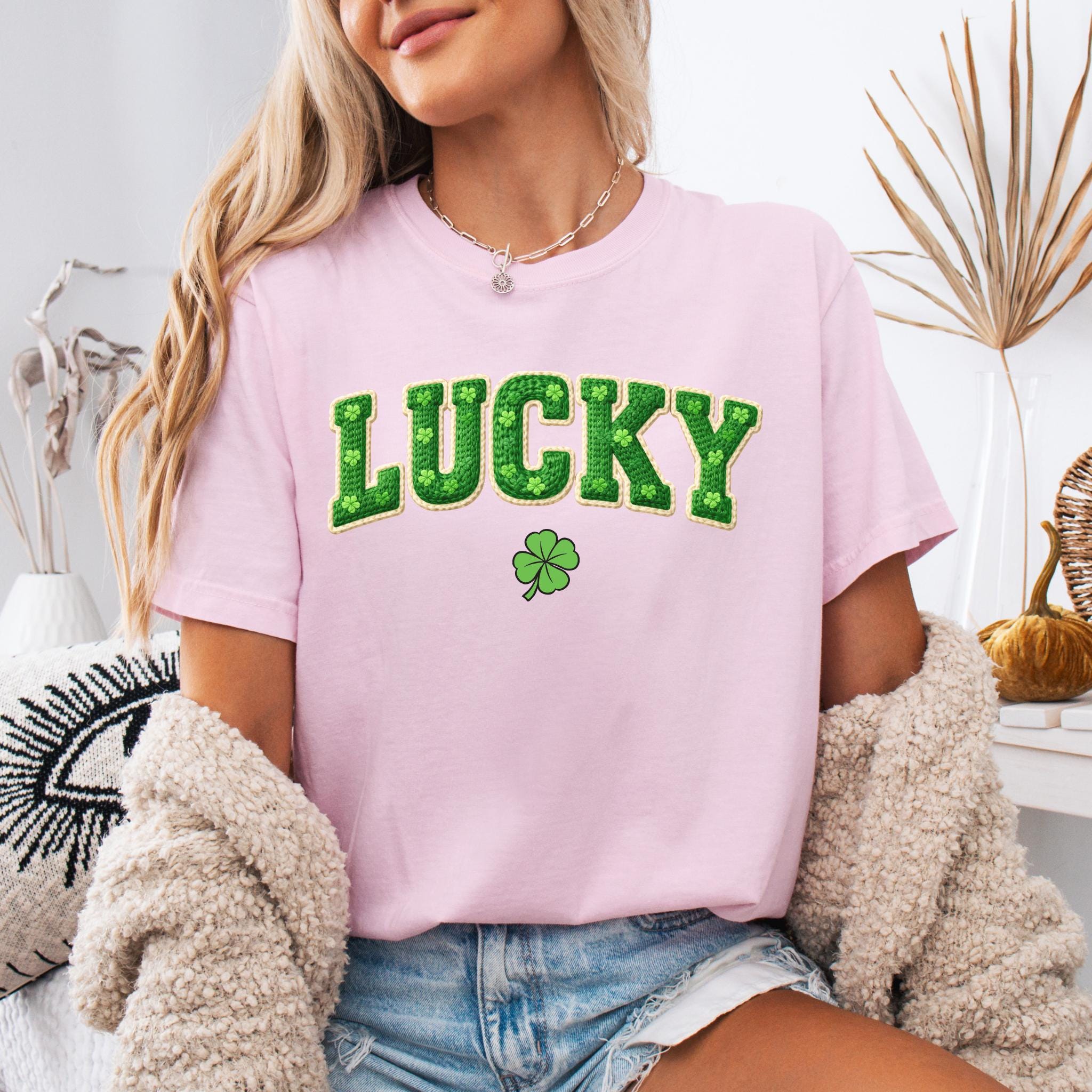 This “LUCKY” graphic tee features a detailed Faux Knitted Yarn design that mimics the texture of real stitched embroidery and chunky sweater knit — without the bulk. The letters are styled with shamrock-inspired detailing and finished with a soft bow accent, creating a warm, preppy aesthetic.