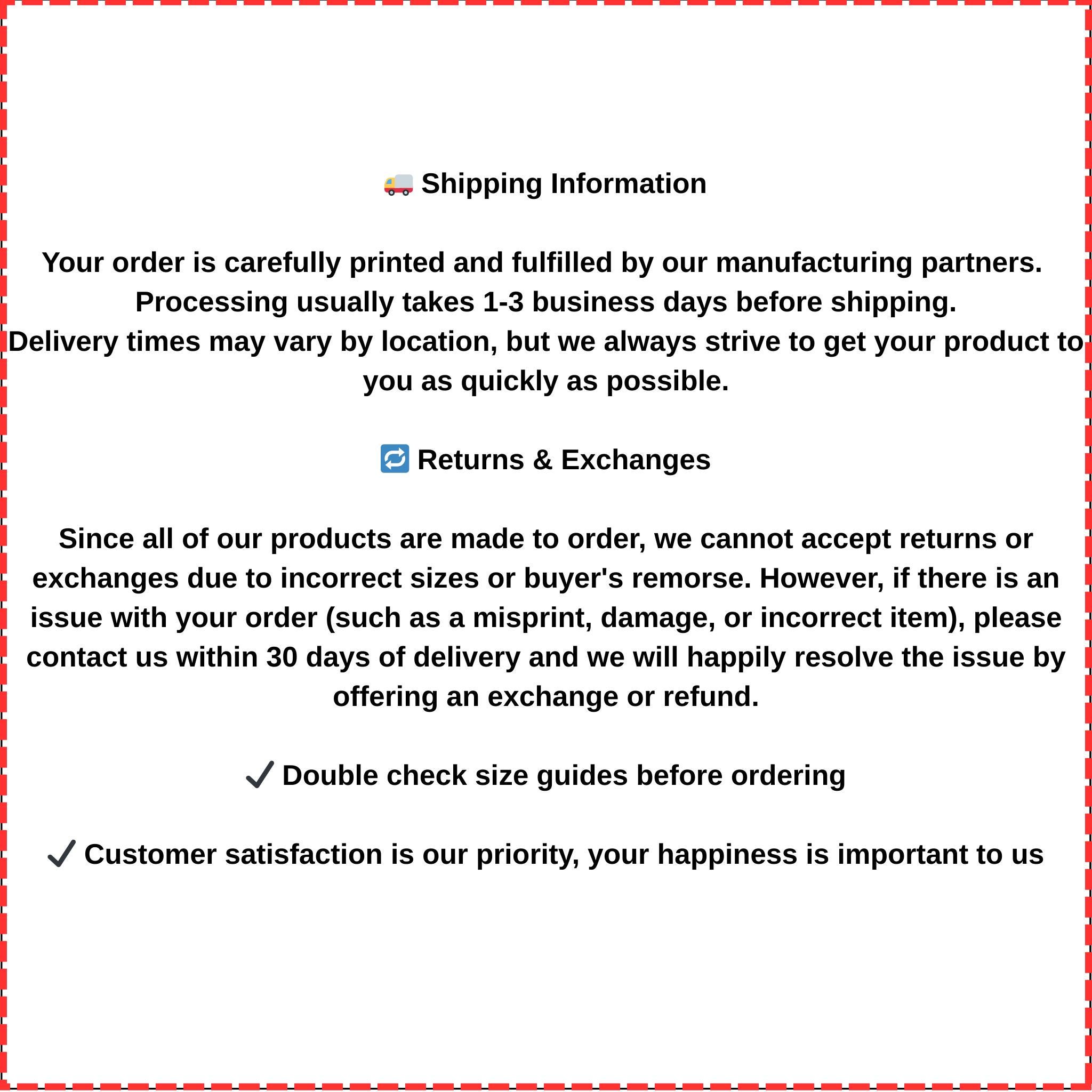 Since all of our products are made to order, we cannot accept returns or exchanges due to incorrect sizes or buyer's remorse. However, if there is an issue with your order (such as a misprint, damage, or incorrect item), please contact us within 30 days of delivery and we will happily resolve the issue by offering an exchange or refund.