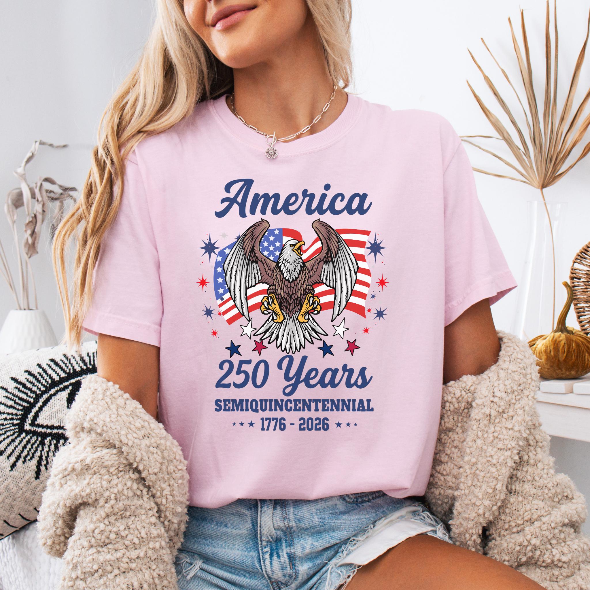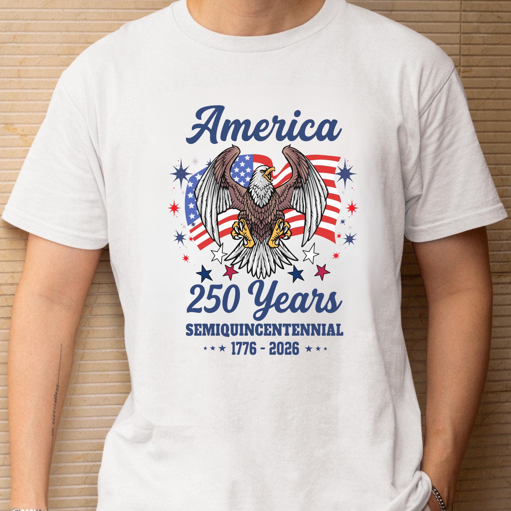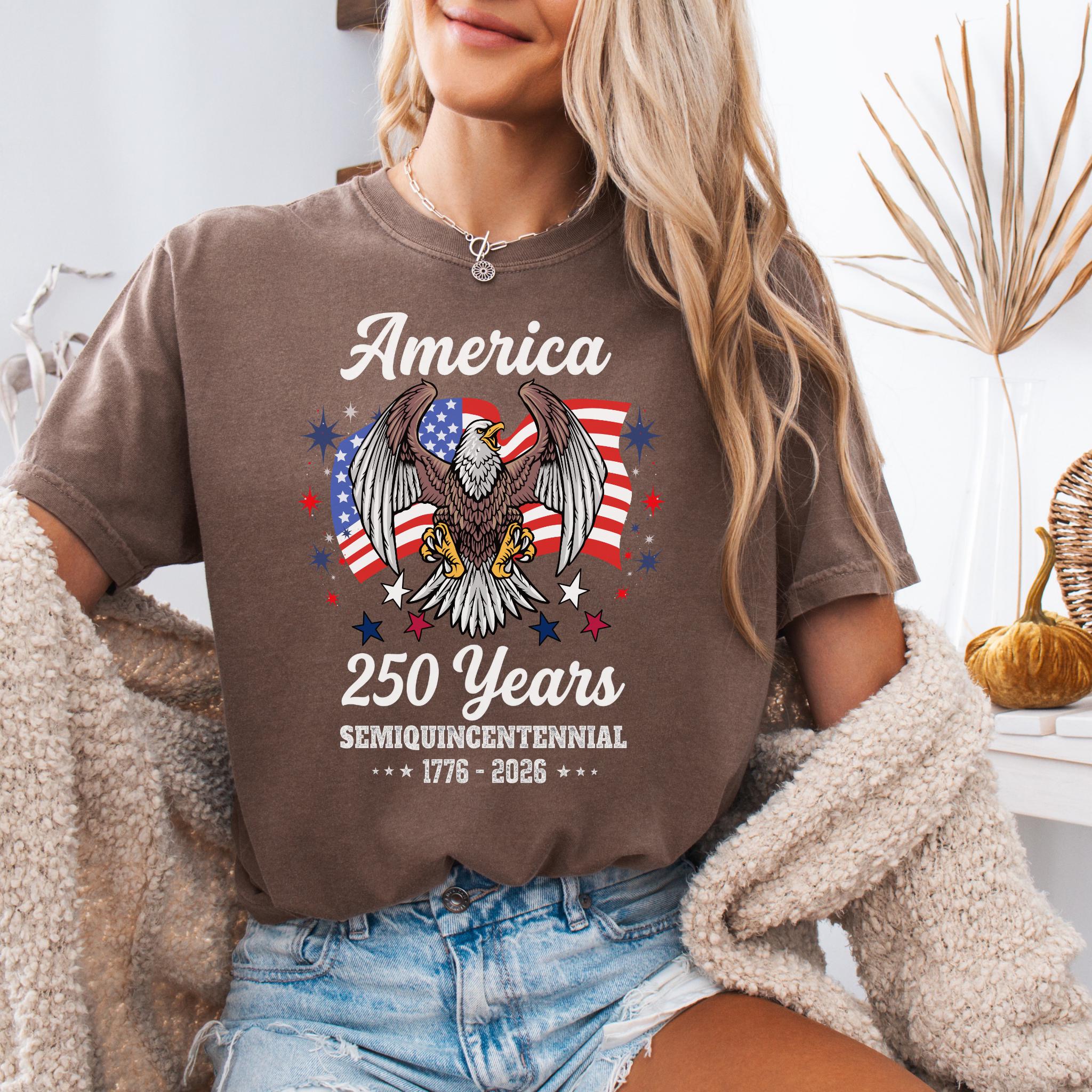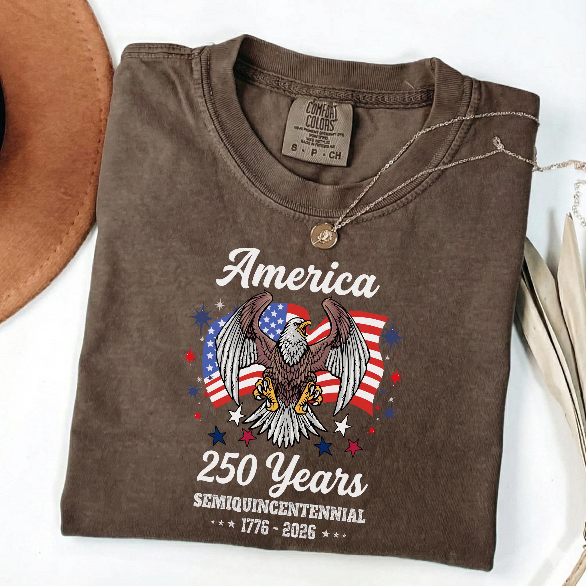 Celebrate America 250 Years Patriotic Eagle (1776–2026) with this bold patriotic eagle design honoring the United States Semiquincentennial. Featuring a powerful bald eagle with American flag backdrop, this graphic represents strength, freedom, and national pride.