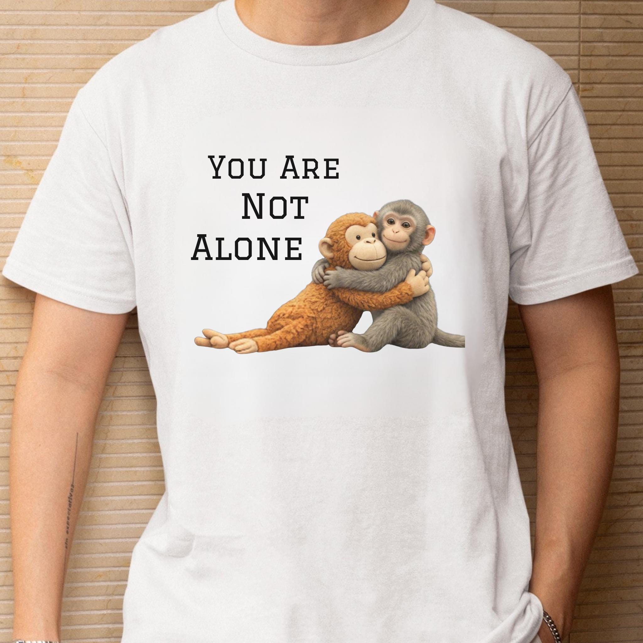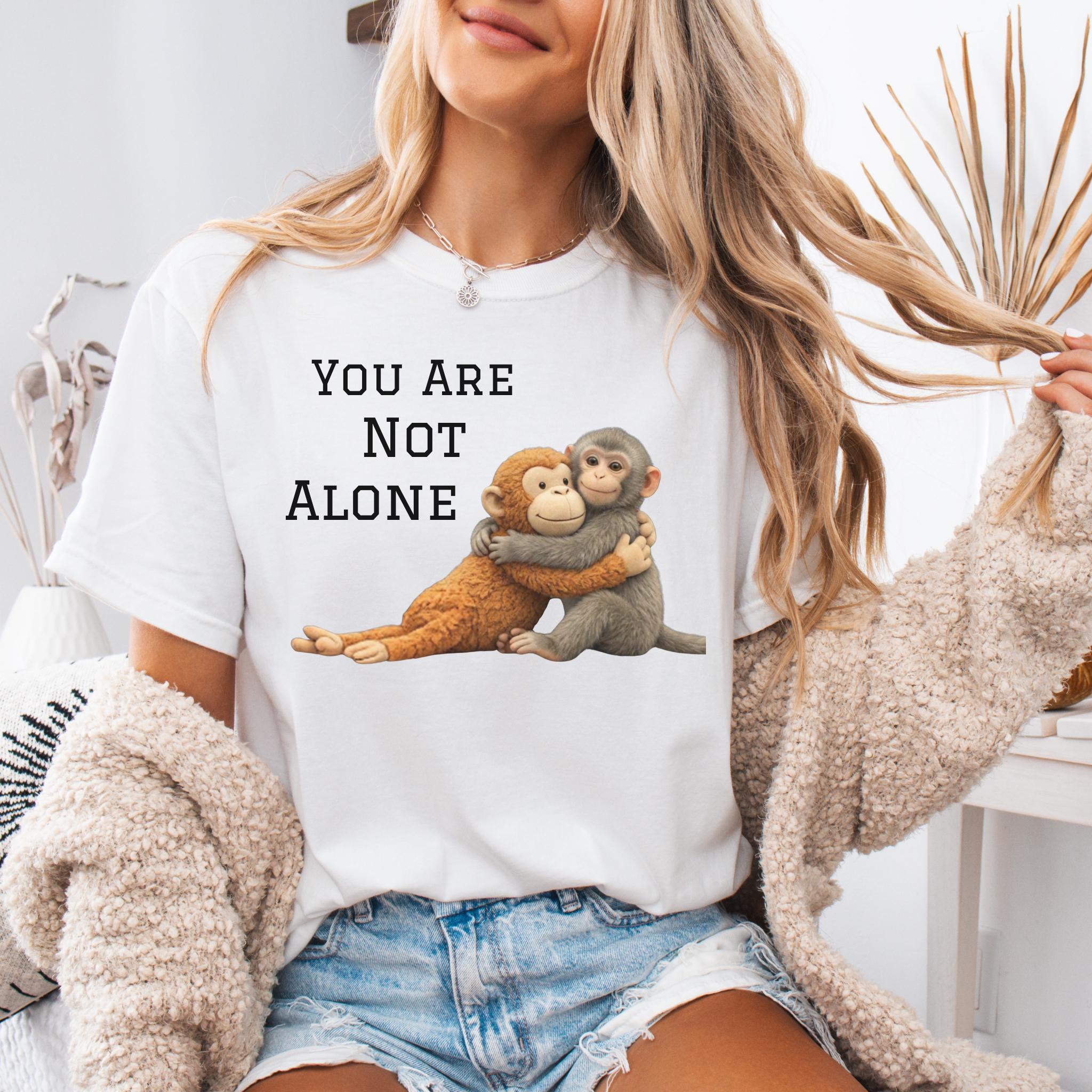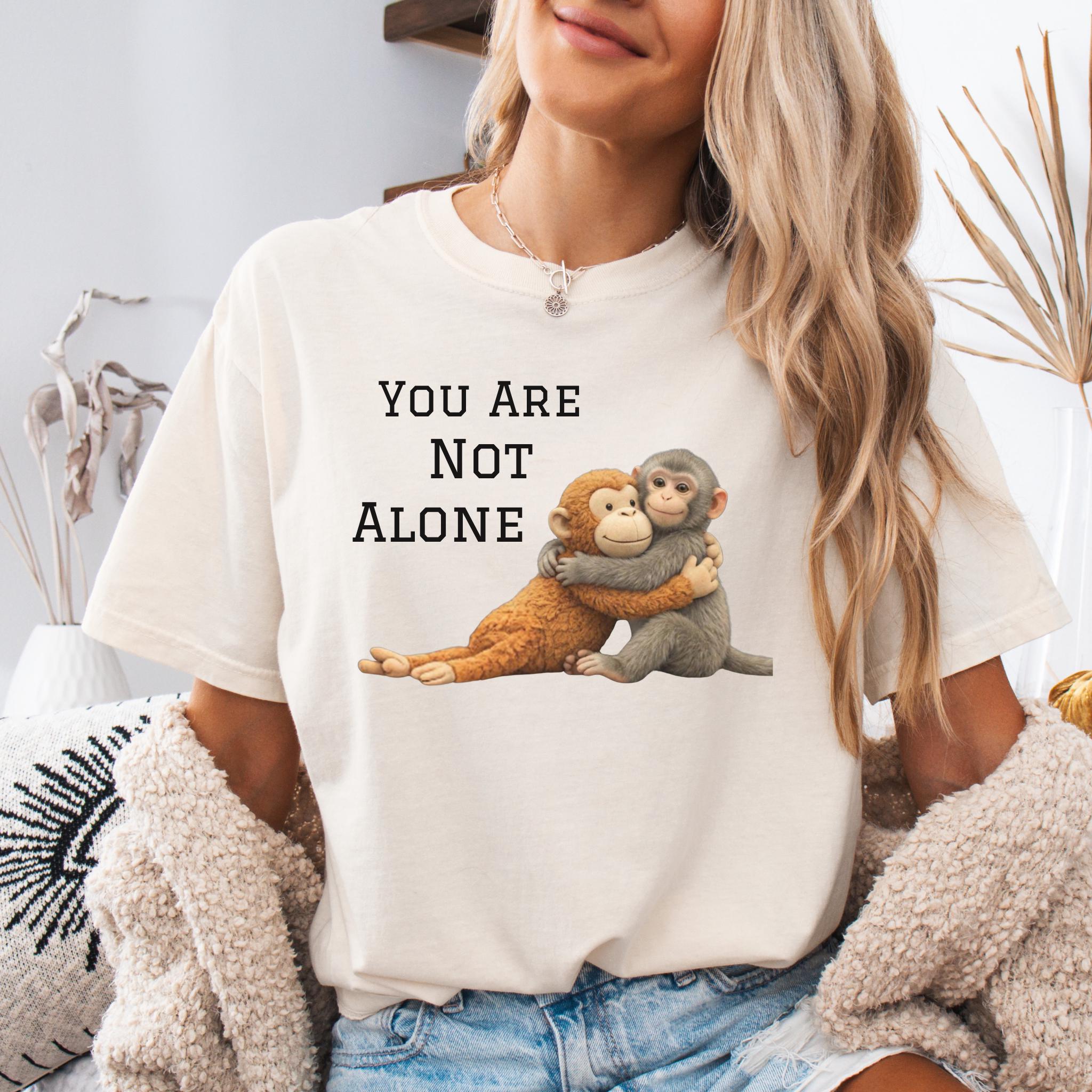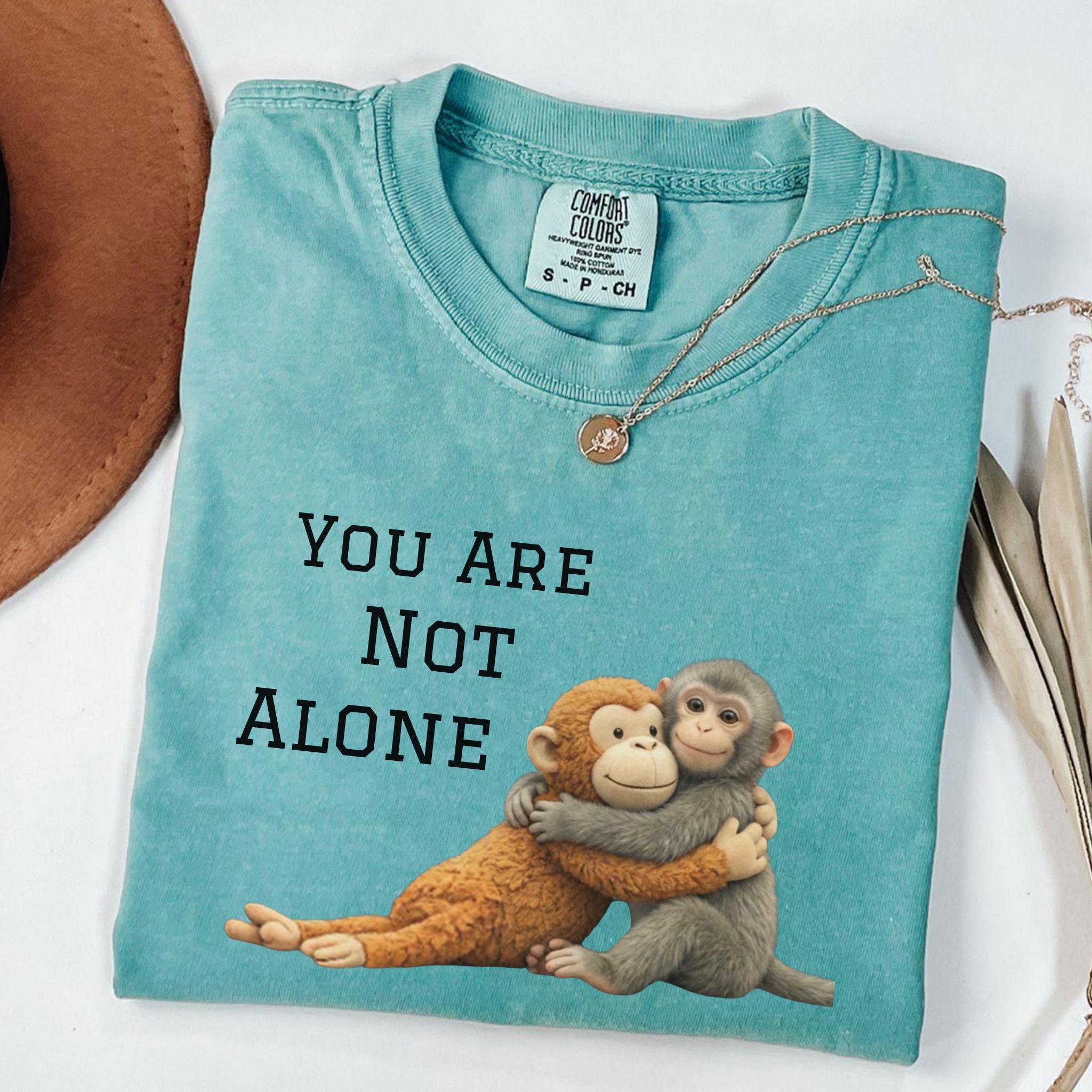 This heartfelt design features two baby monkeys hugging under the message “You Are Not Alone Punch.”