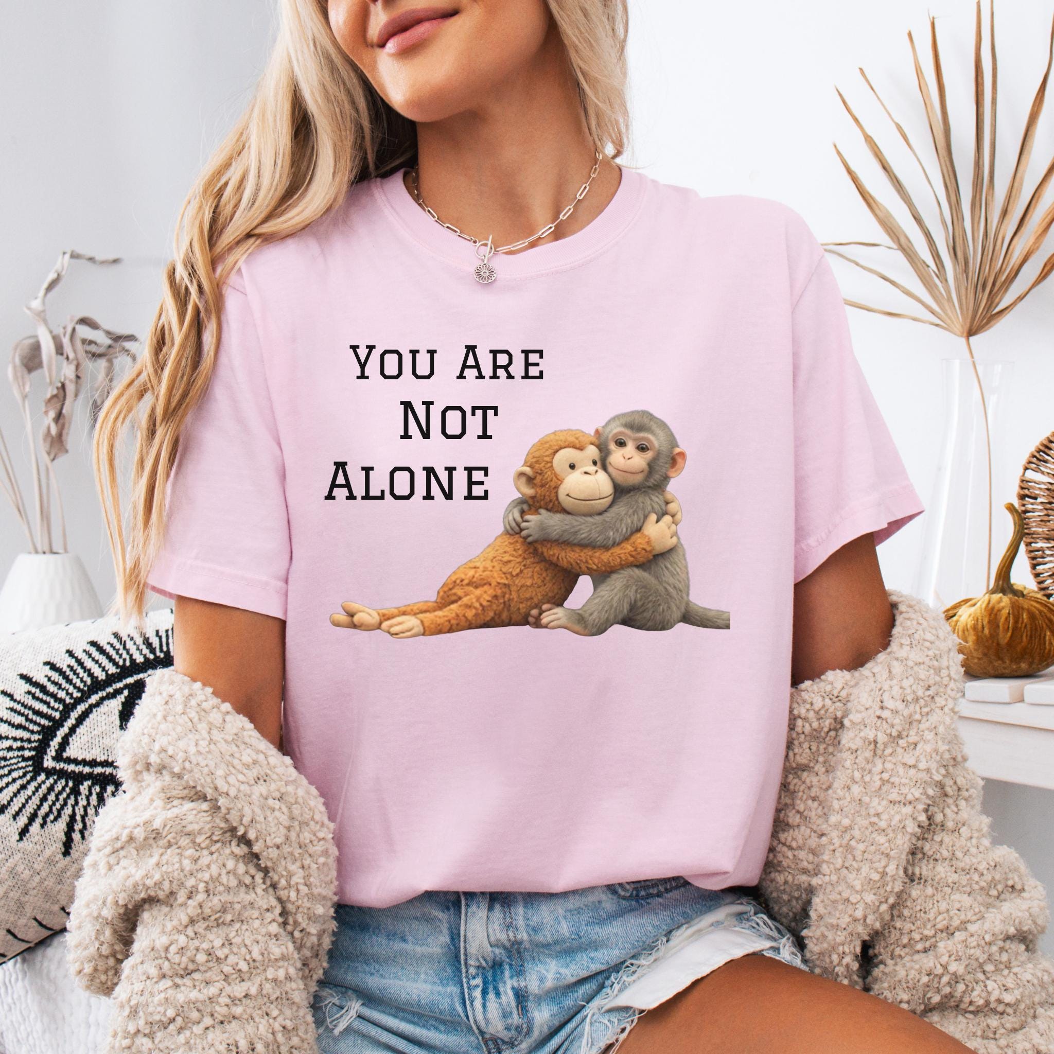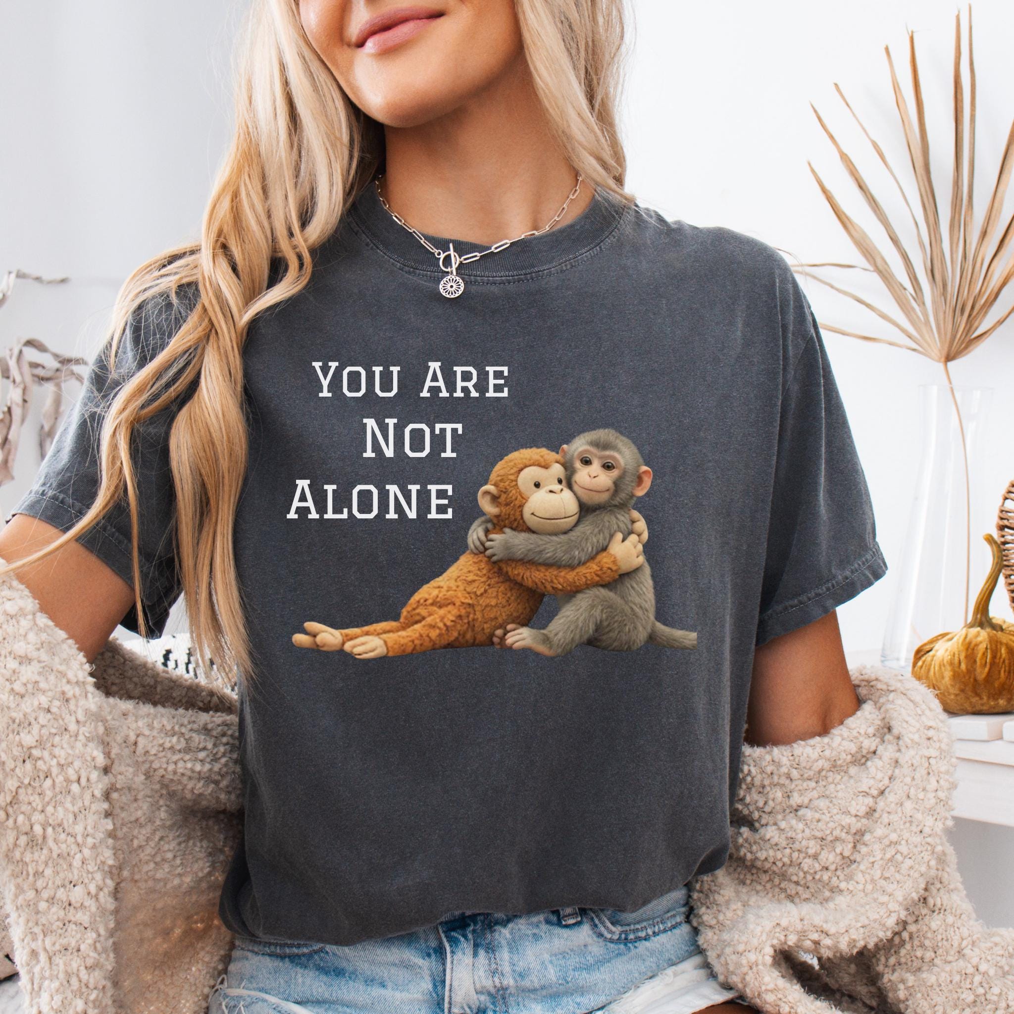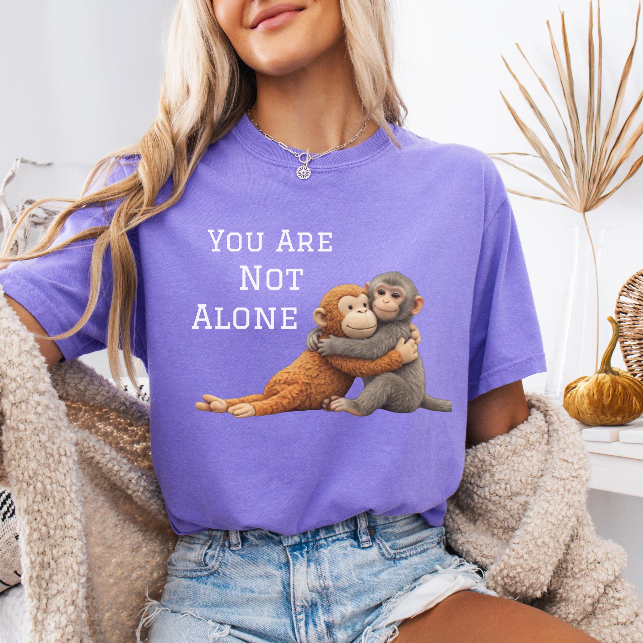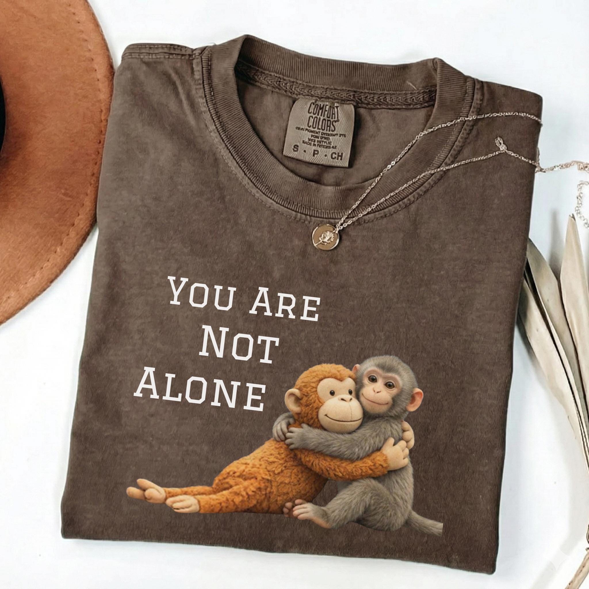 This heartfelt design features two baby monkeys hugging under the message “You Are Not Alone Punch.”