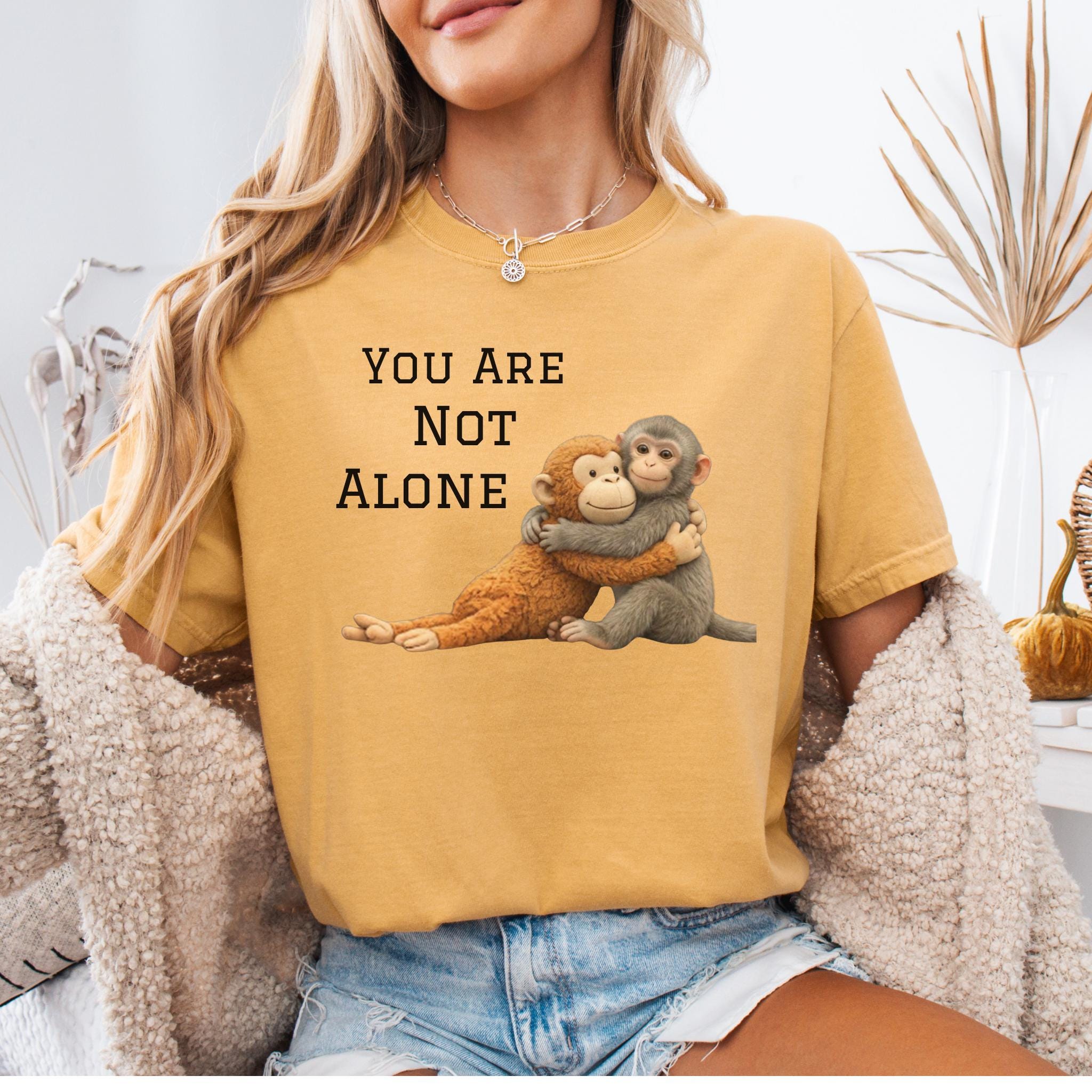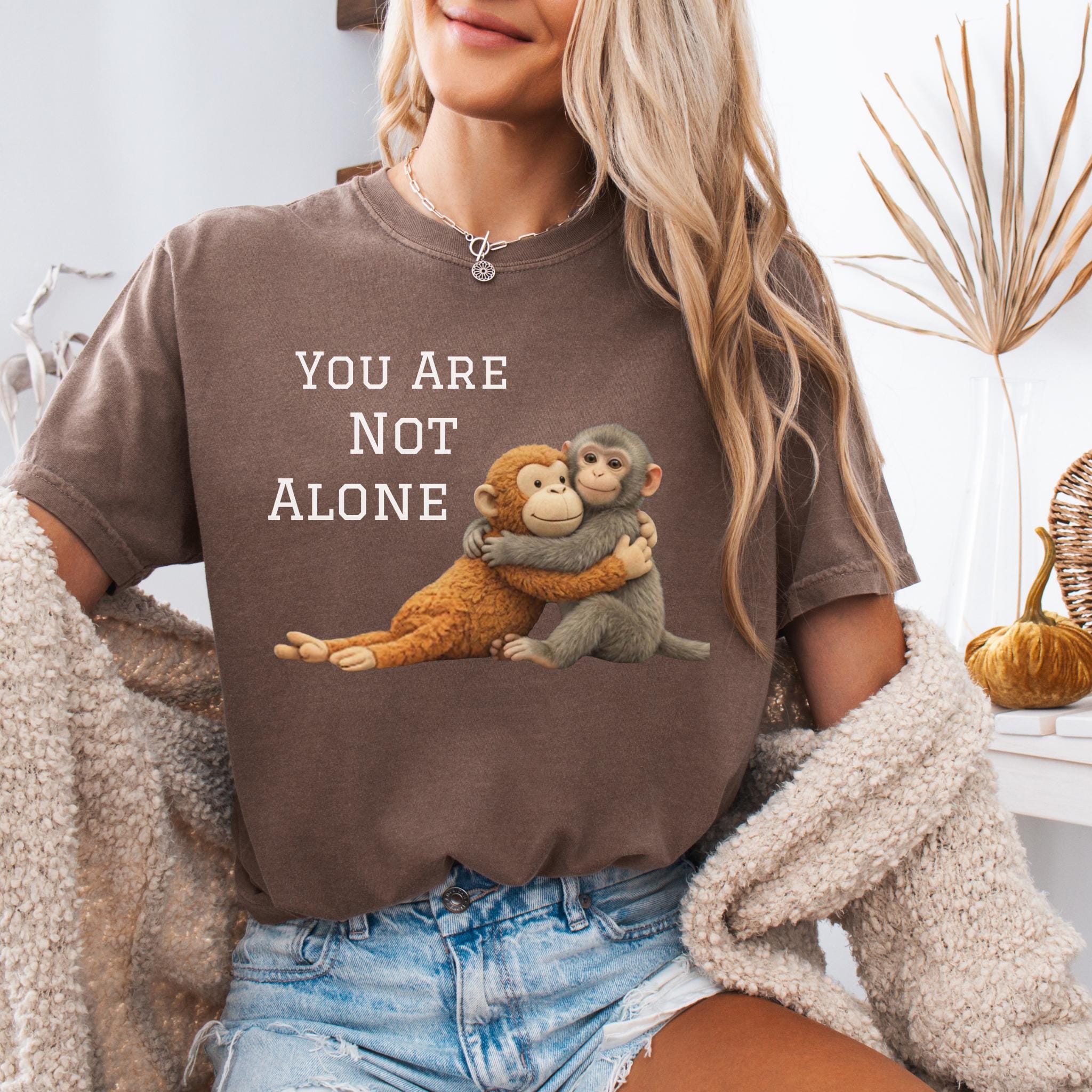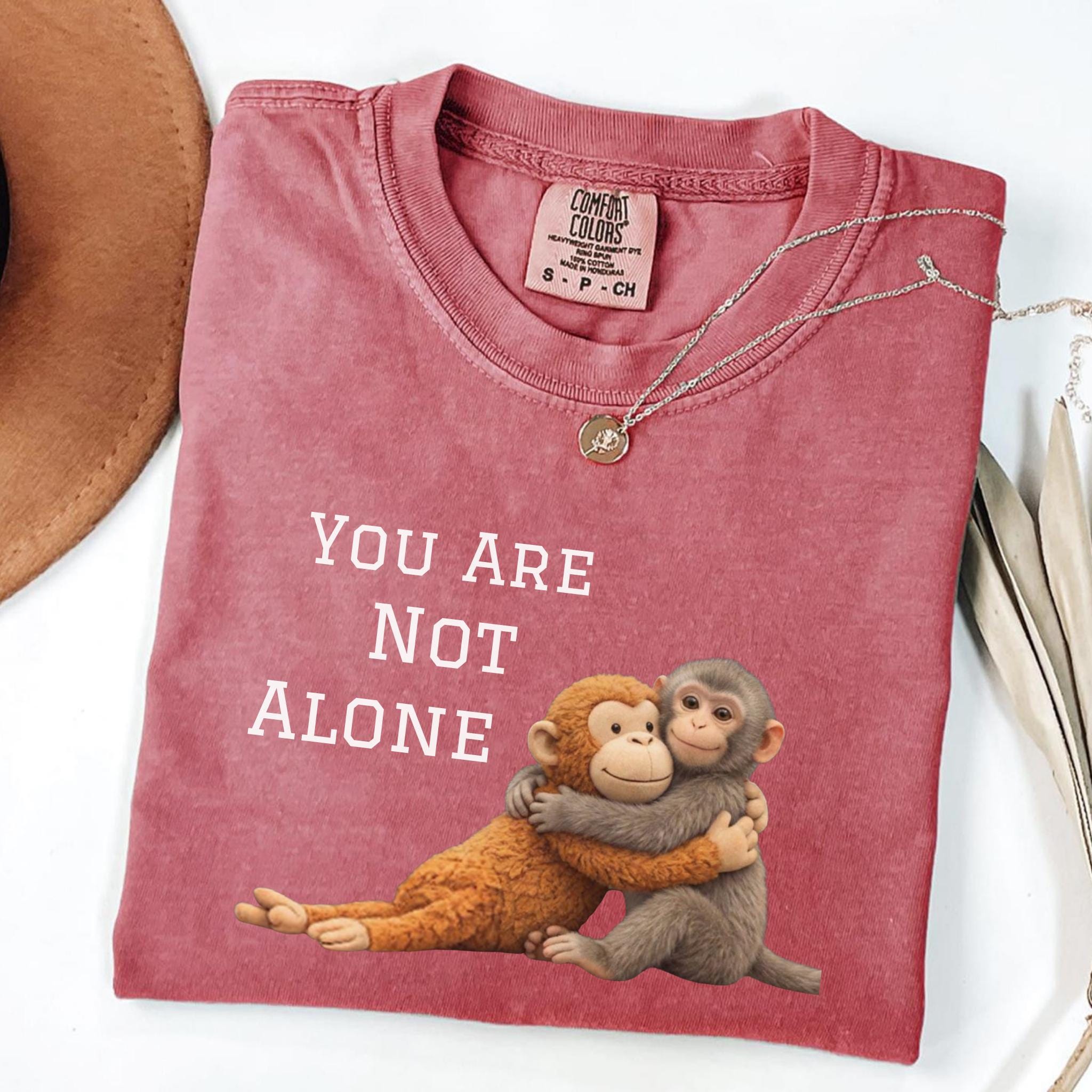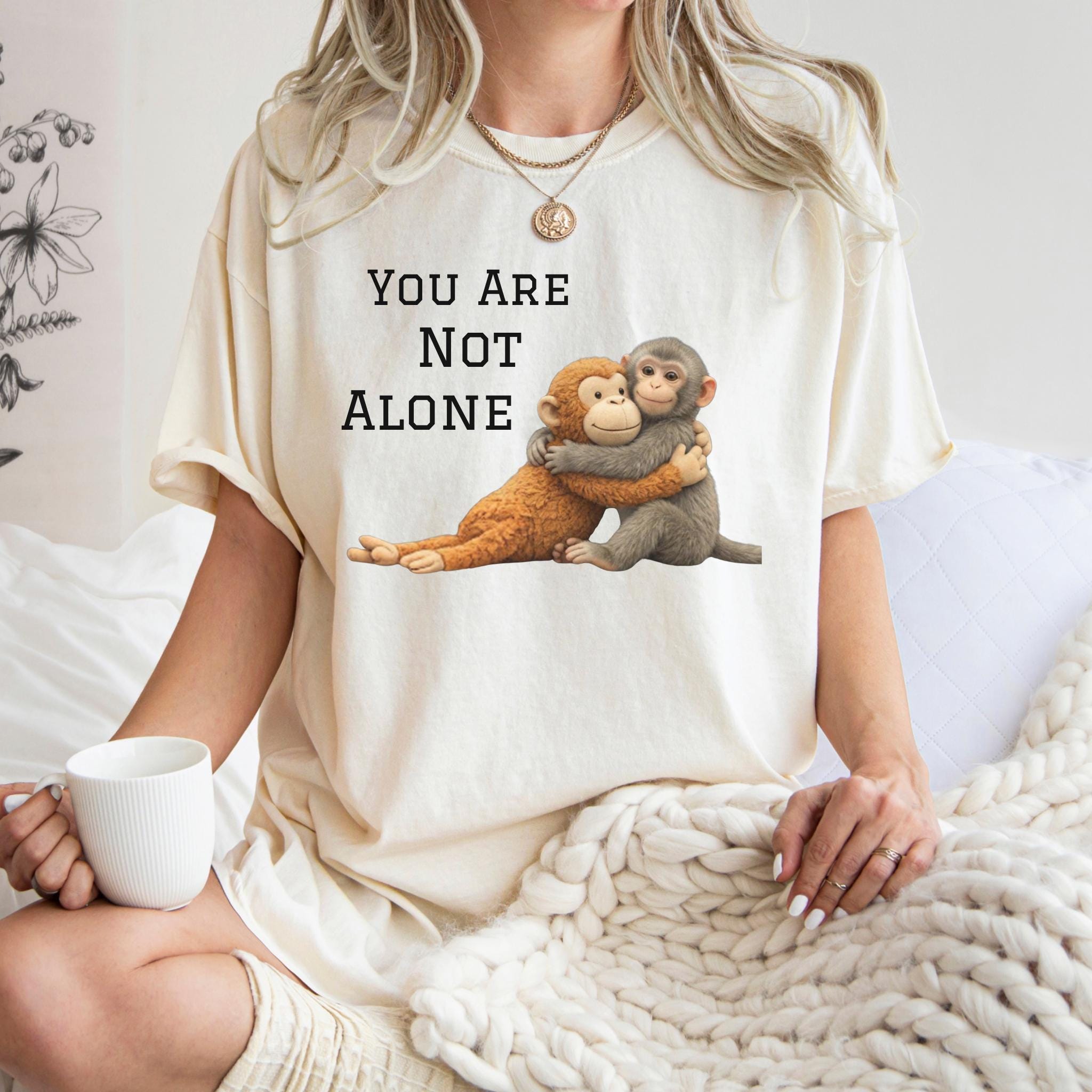 This heartfelt design features two baby monkeys hugging under the message “You Are Not Alone Punch.”