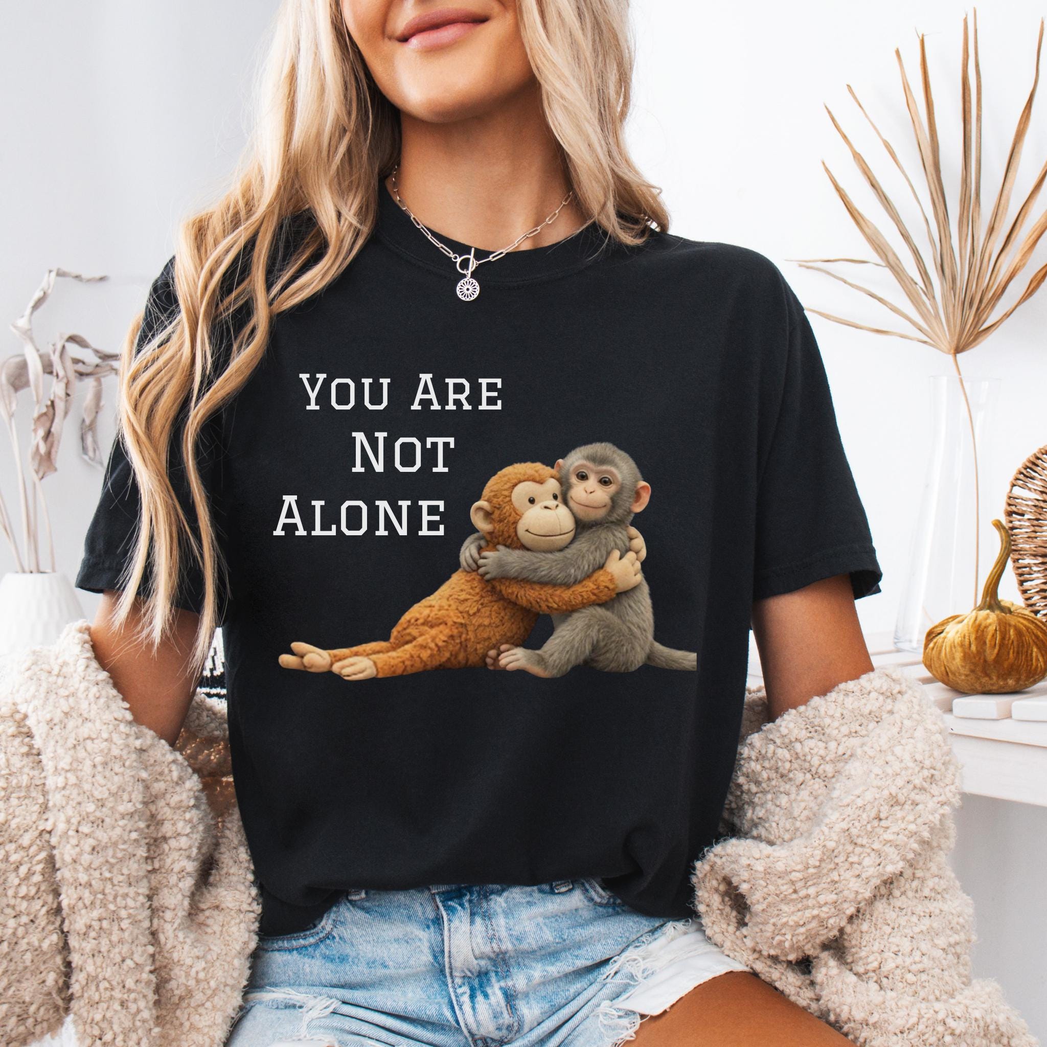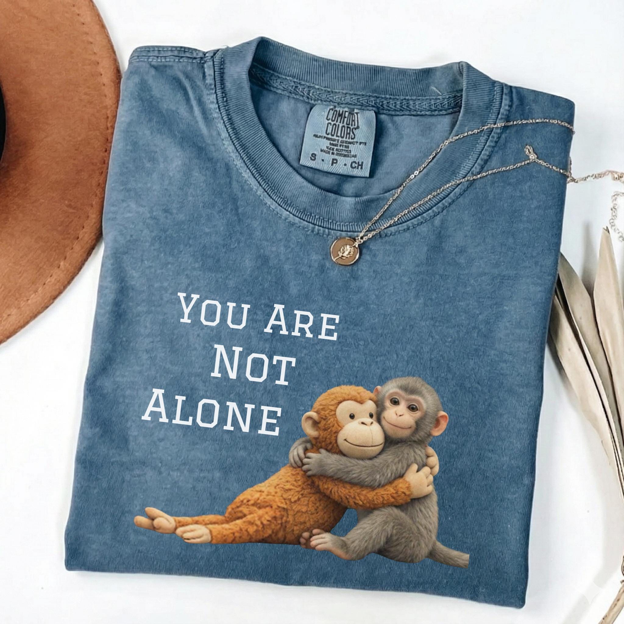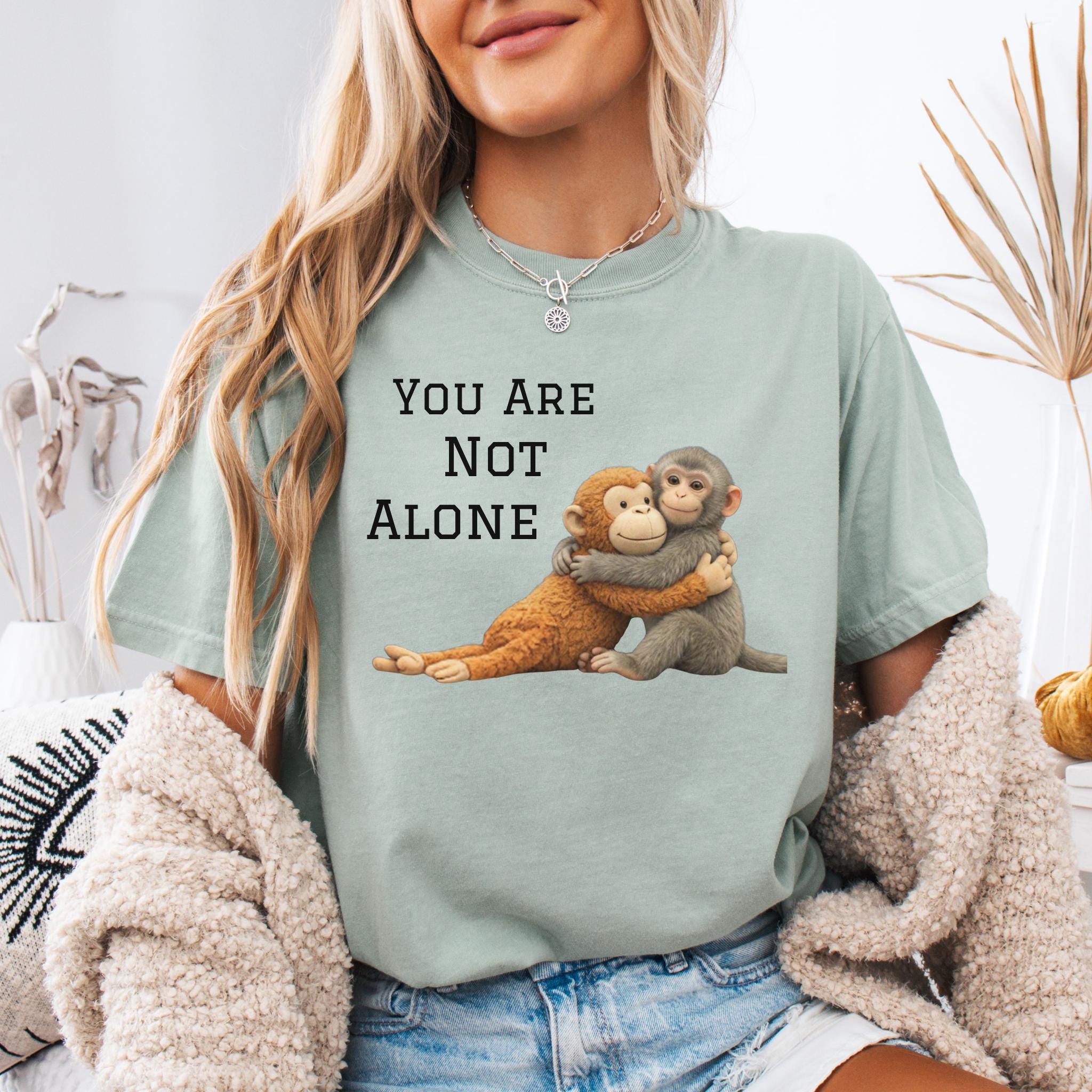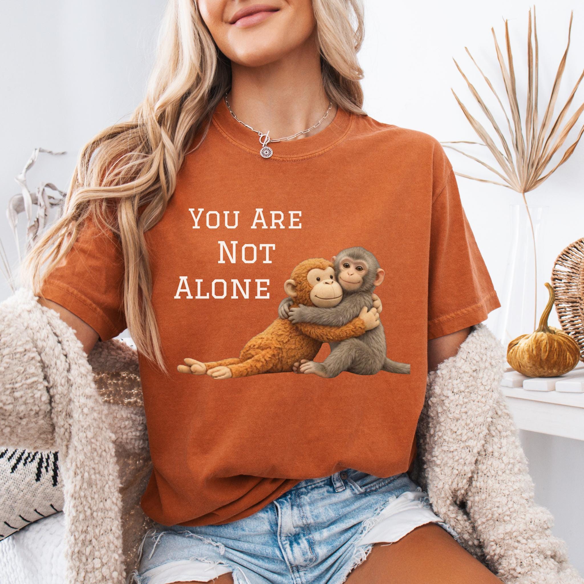 This heartfelt design features two baby monkeys hugging under the message “You Are Not Alone Punch.”