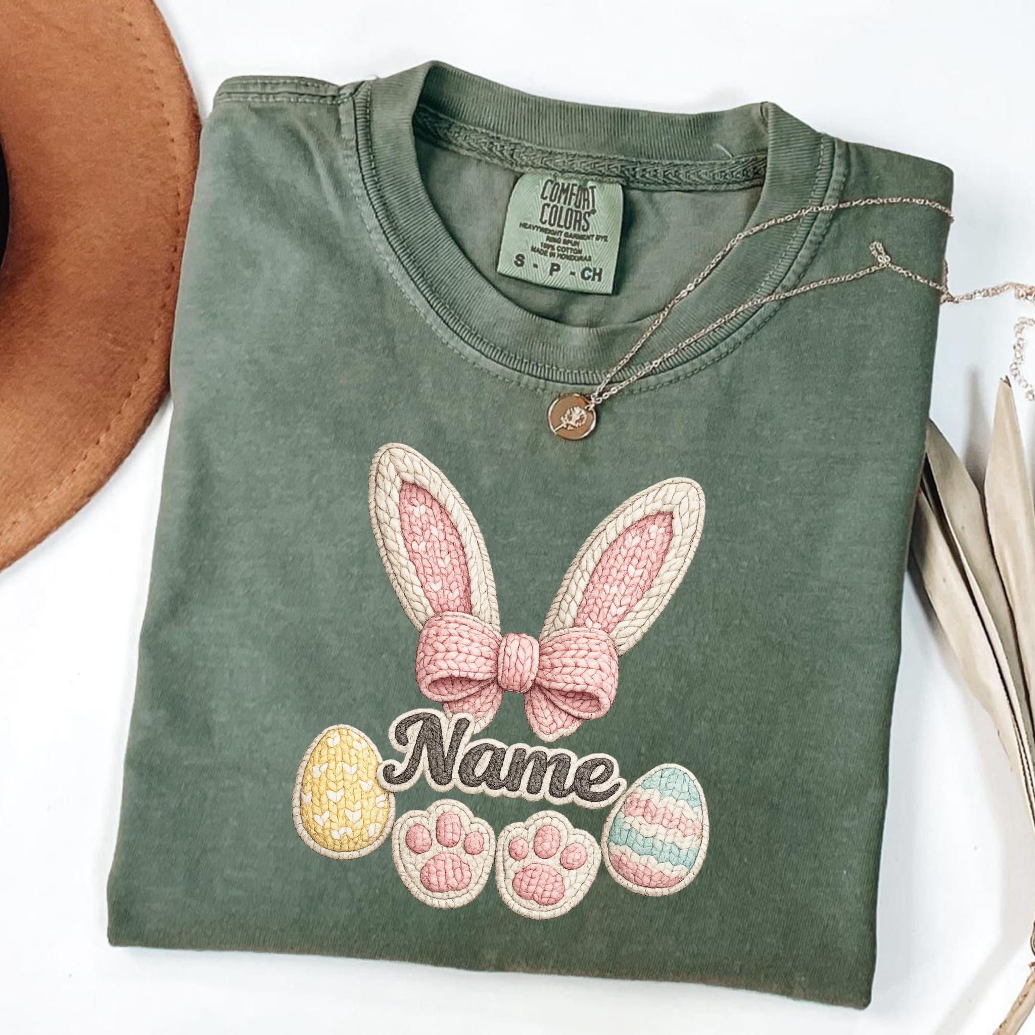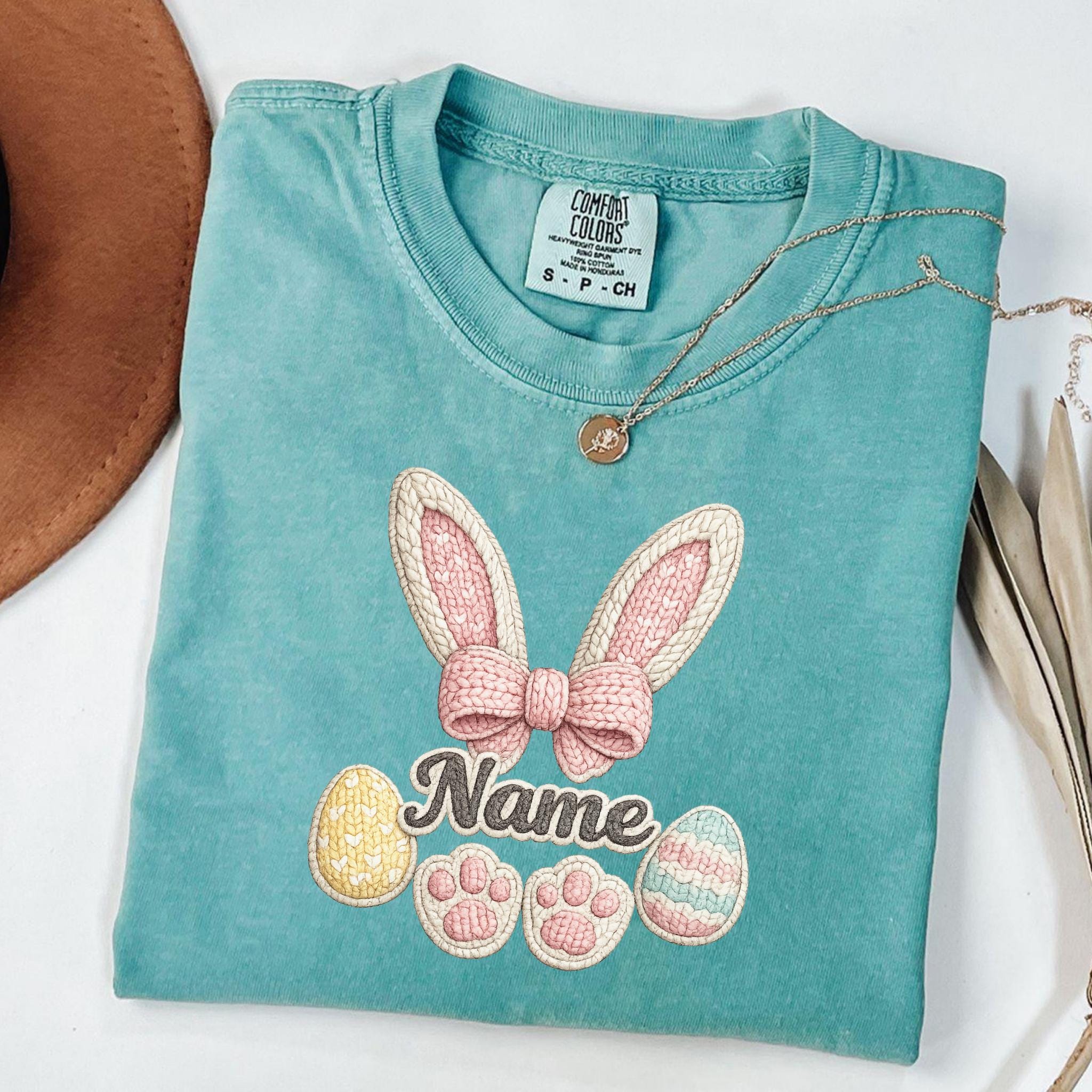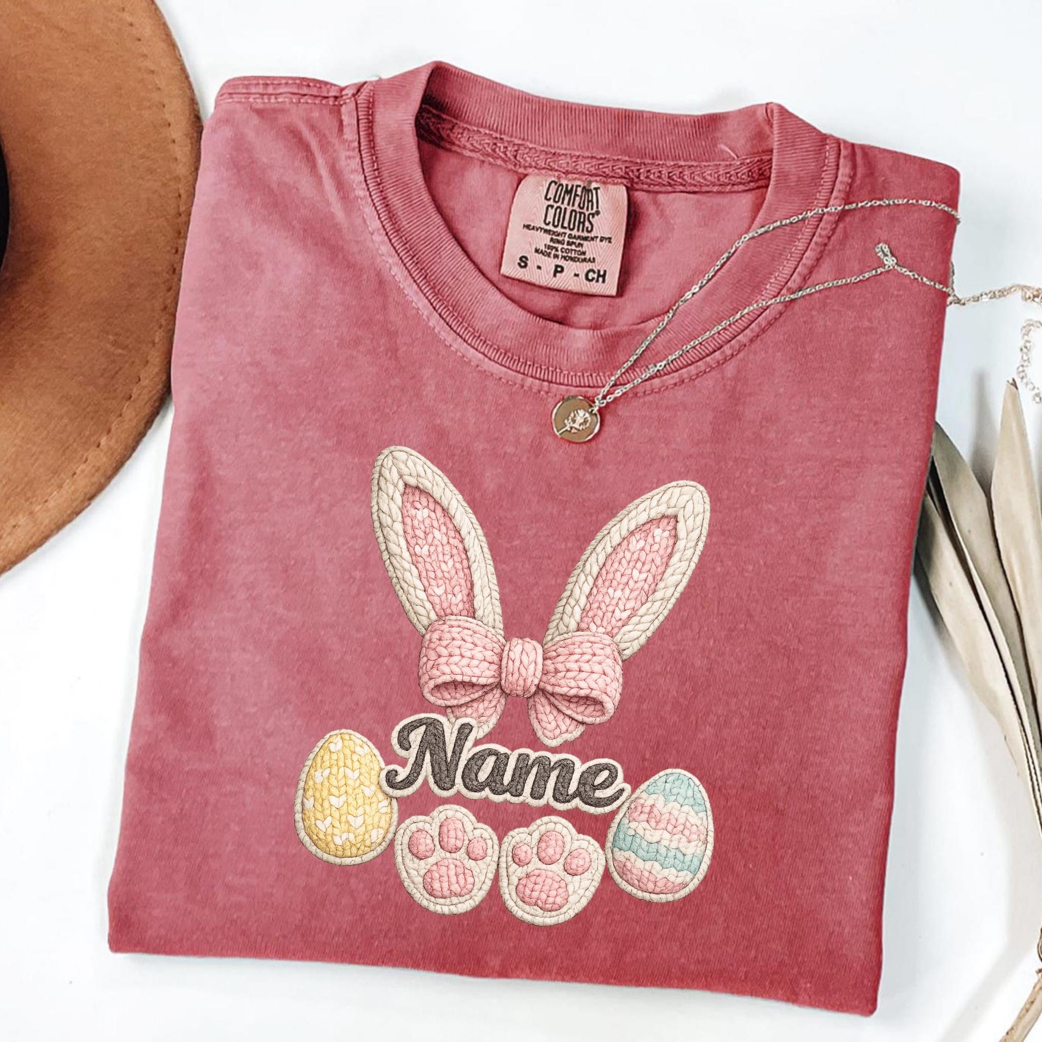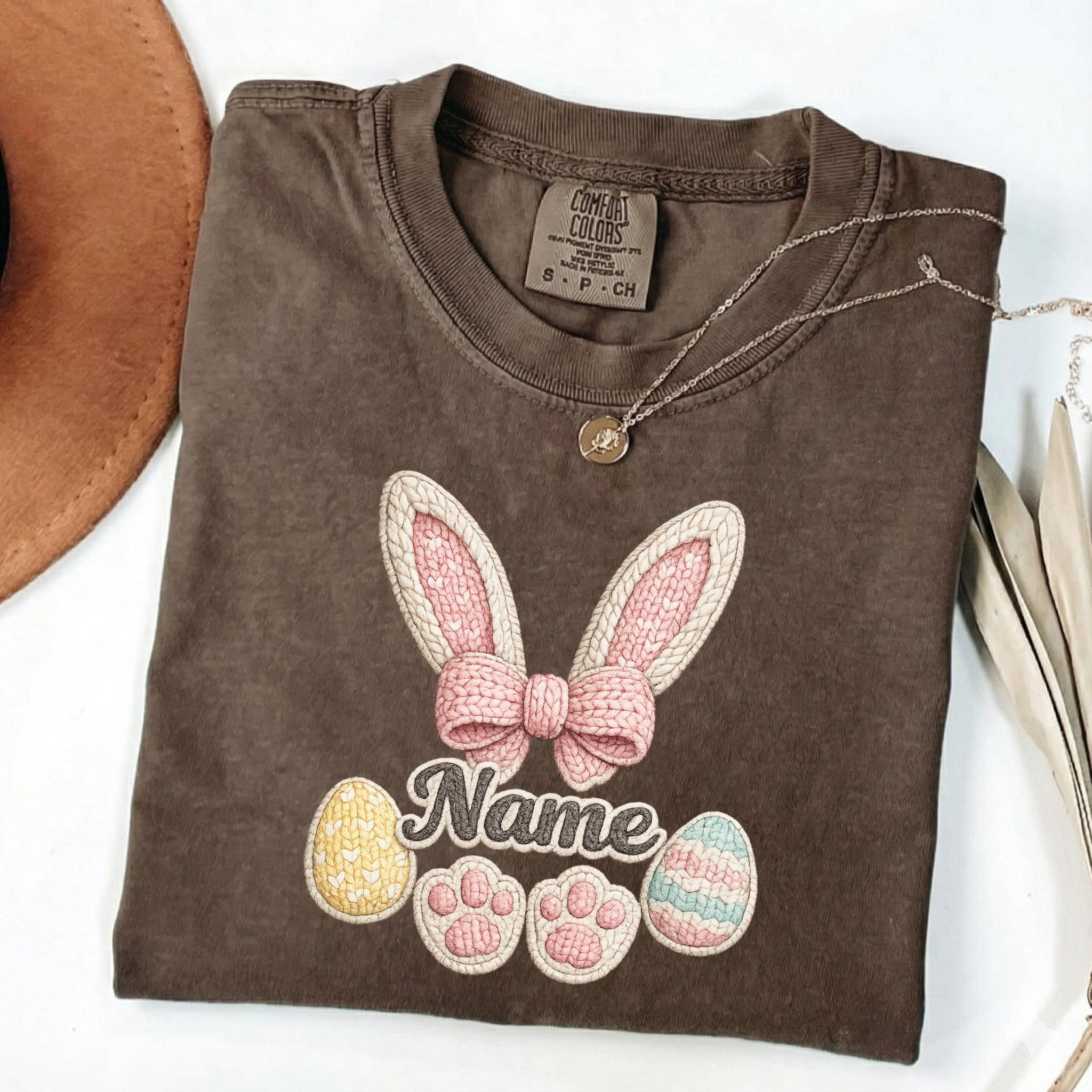 This Custom Name Easter Shirt features bunny ears, a soft bow, pastel Easter eggs, and paw prints designed with a printed embroidery texture effect.