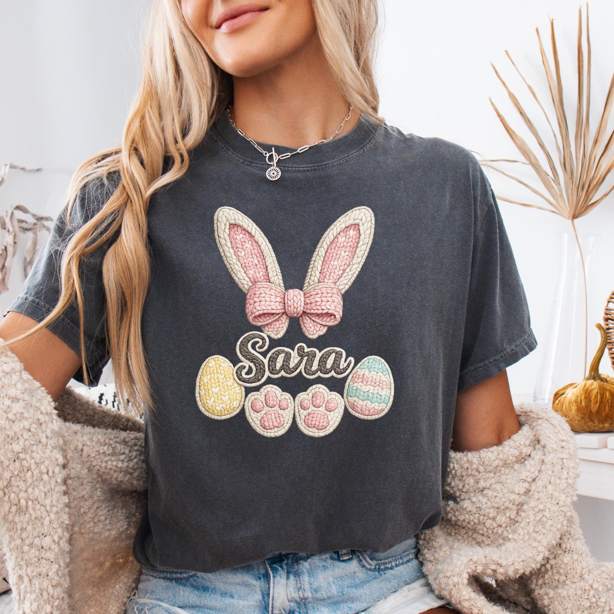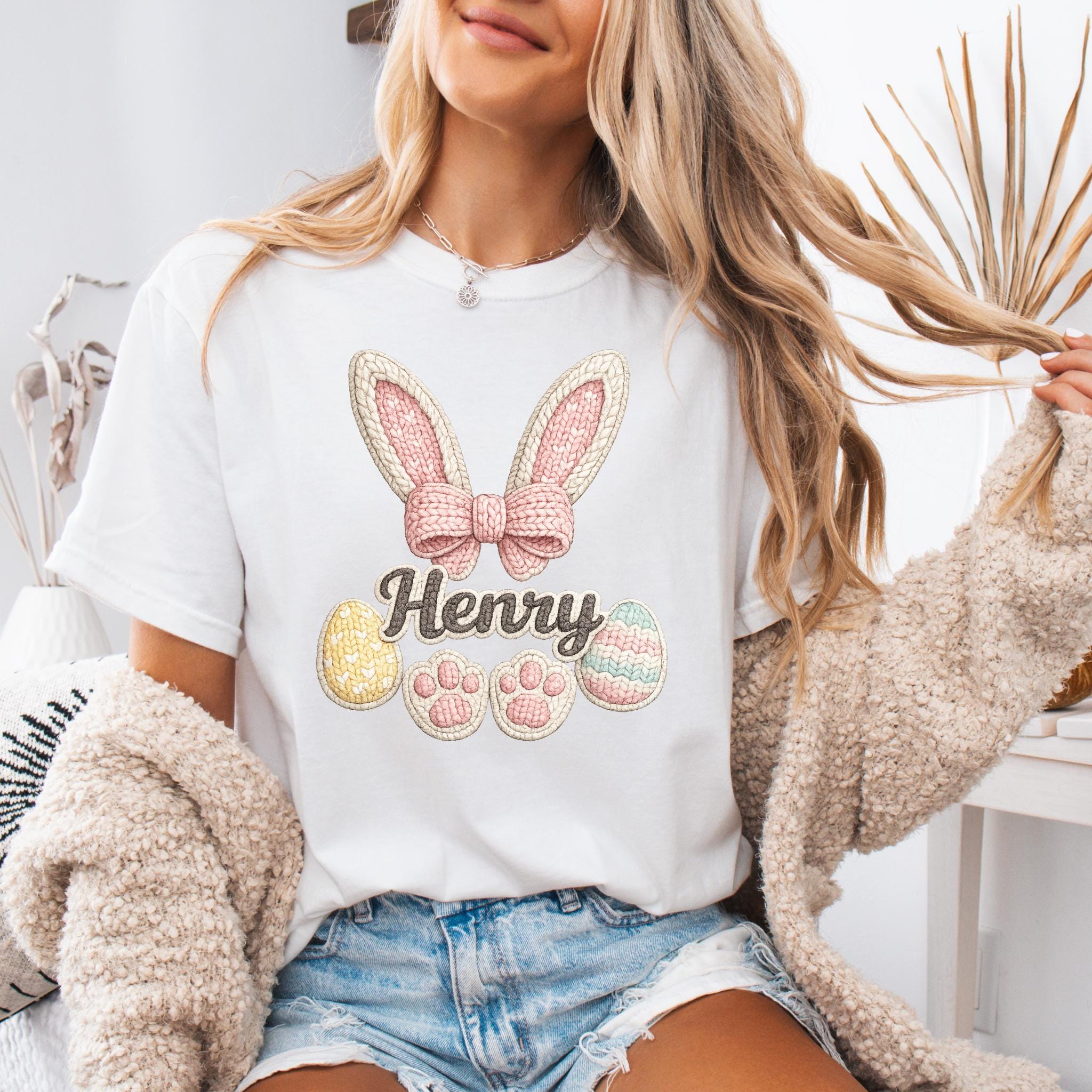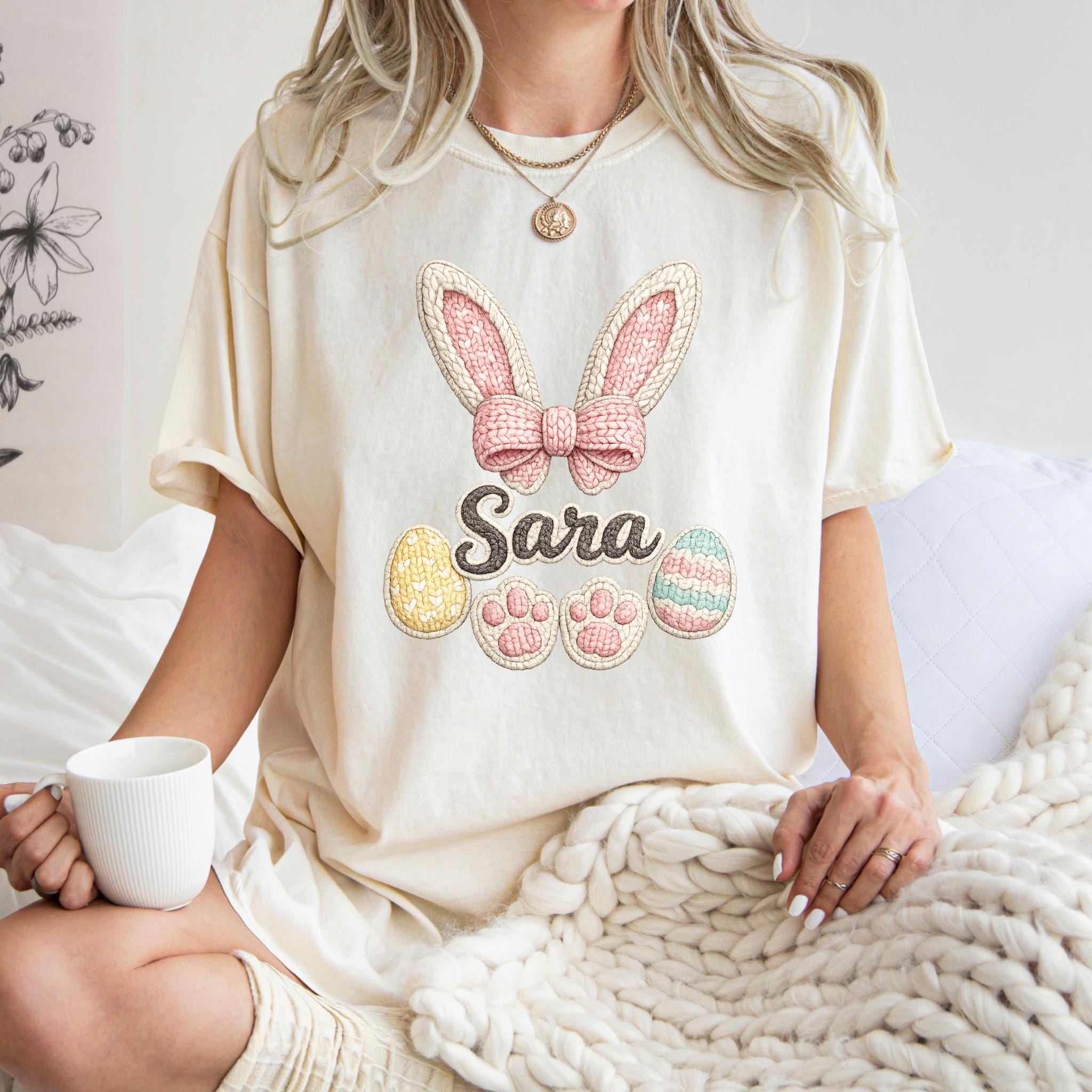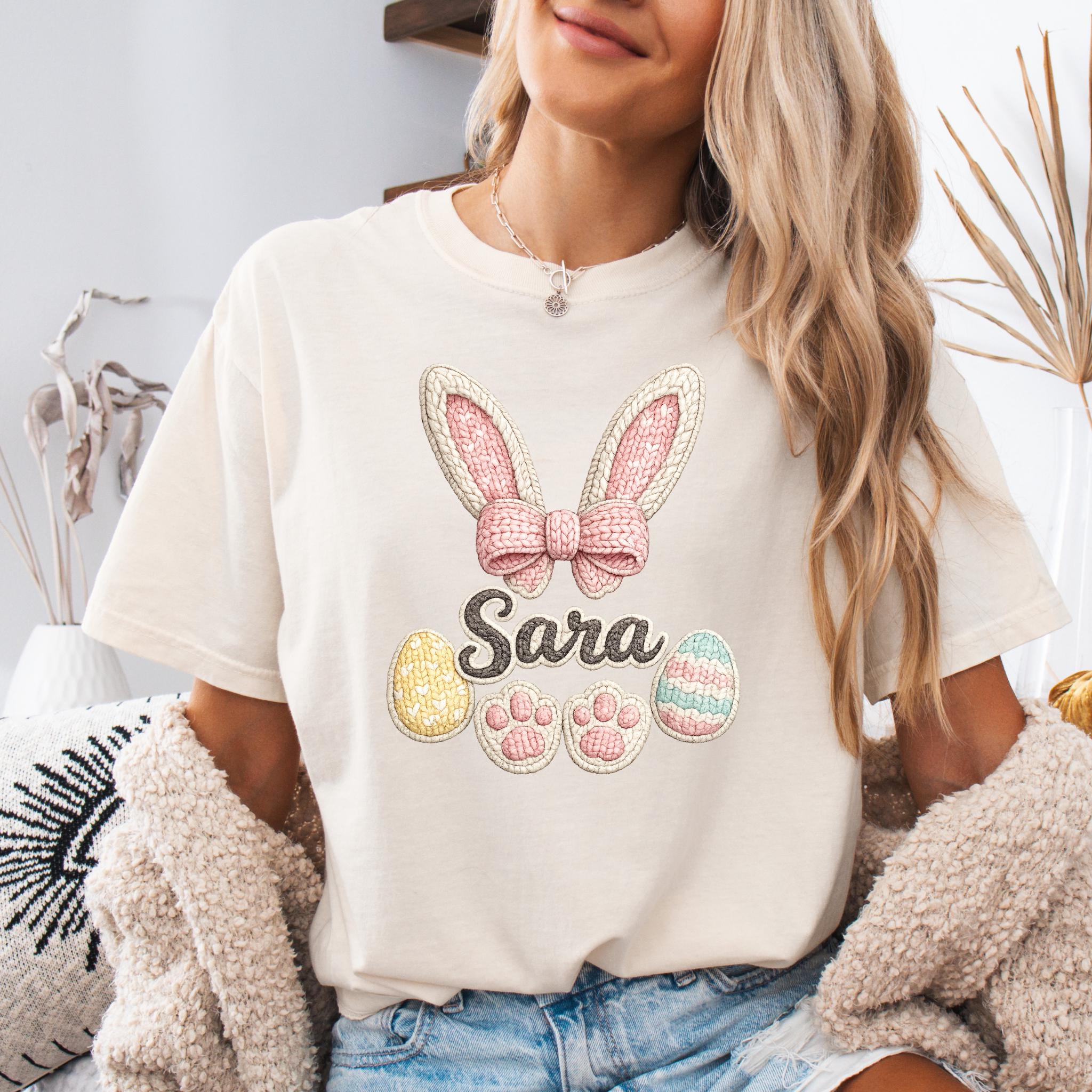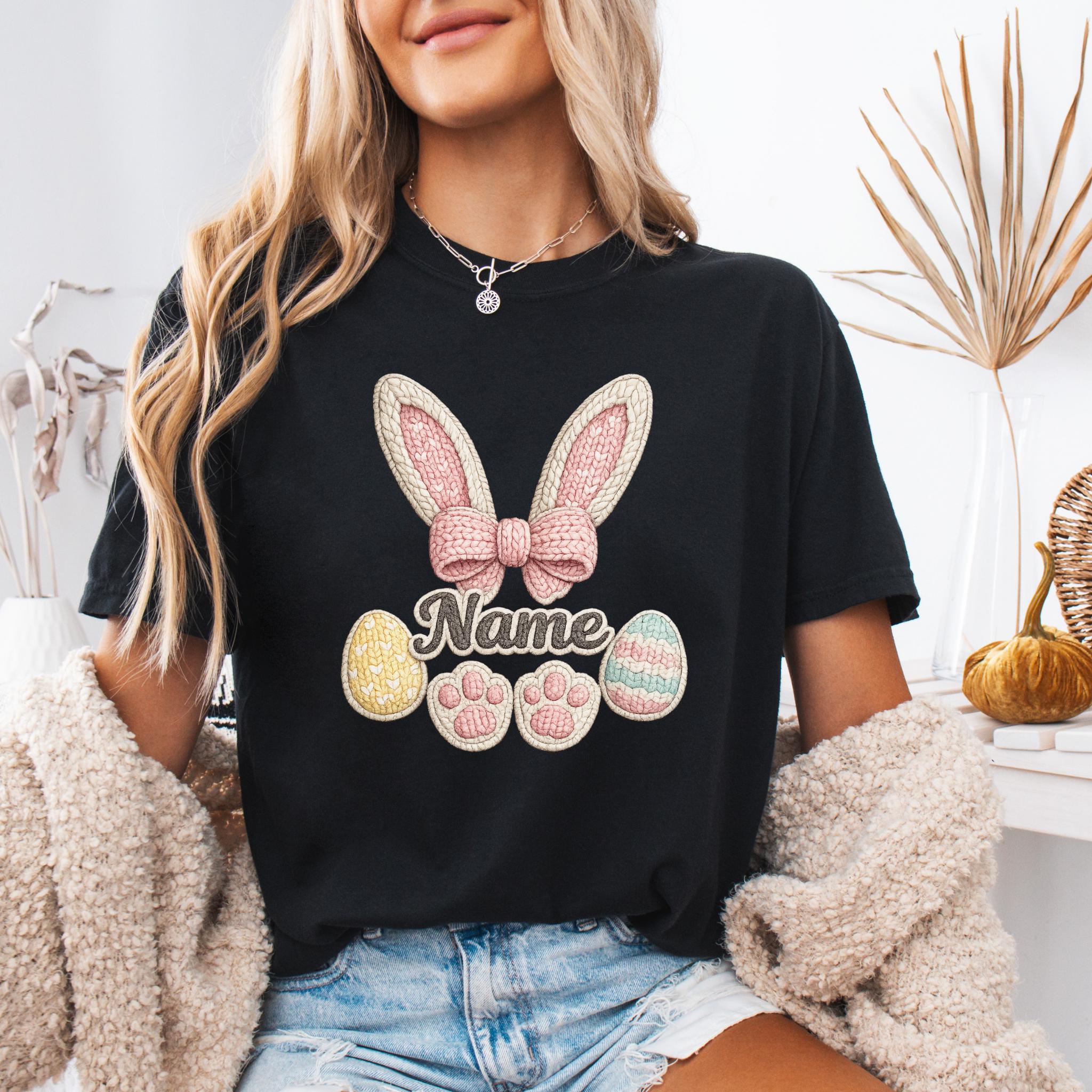 This Custom Name Easter Shirt features bunny ears, a soft bow, pastel Easter eggs, and paw prints designed with a printed embroidery texture effect.