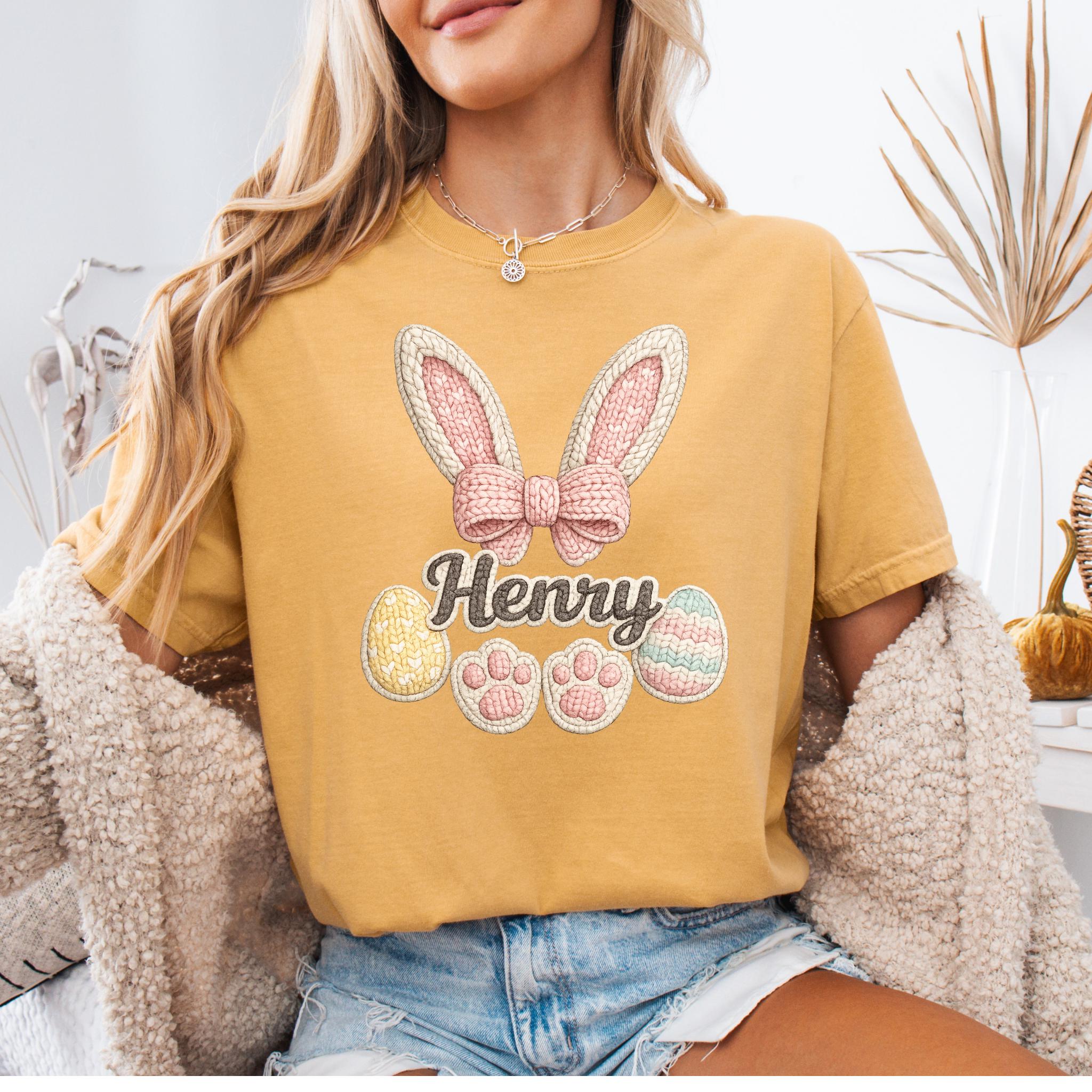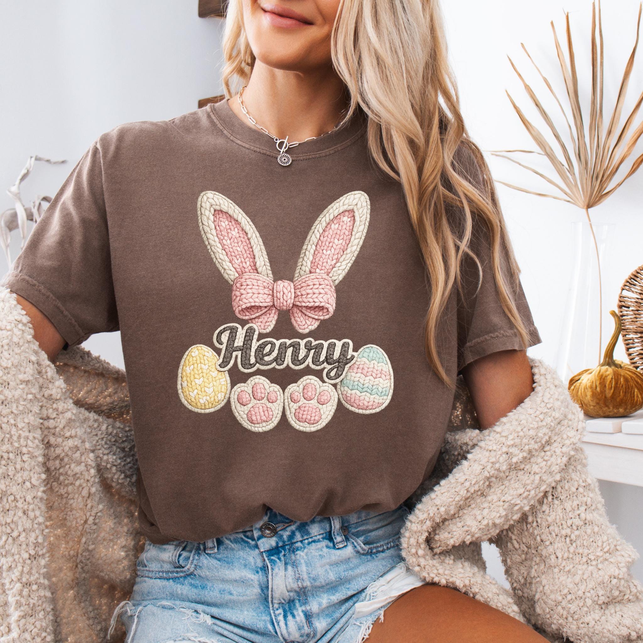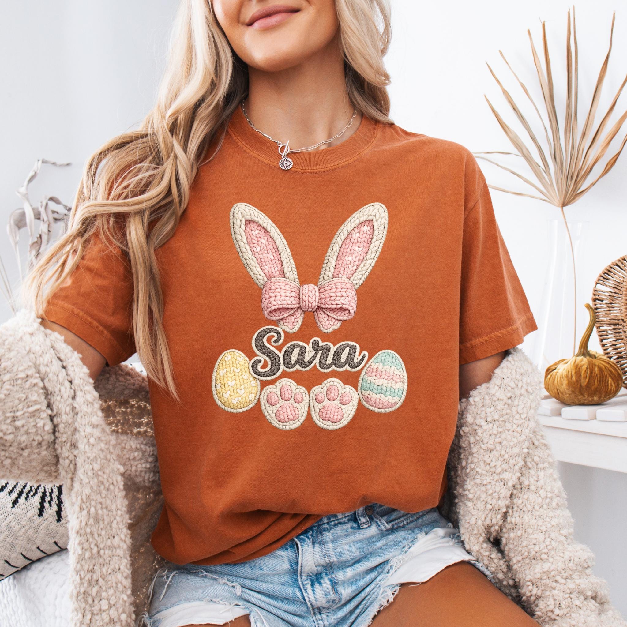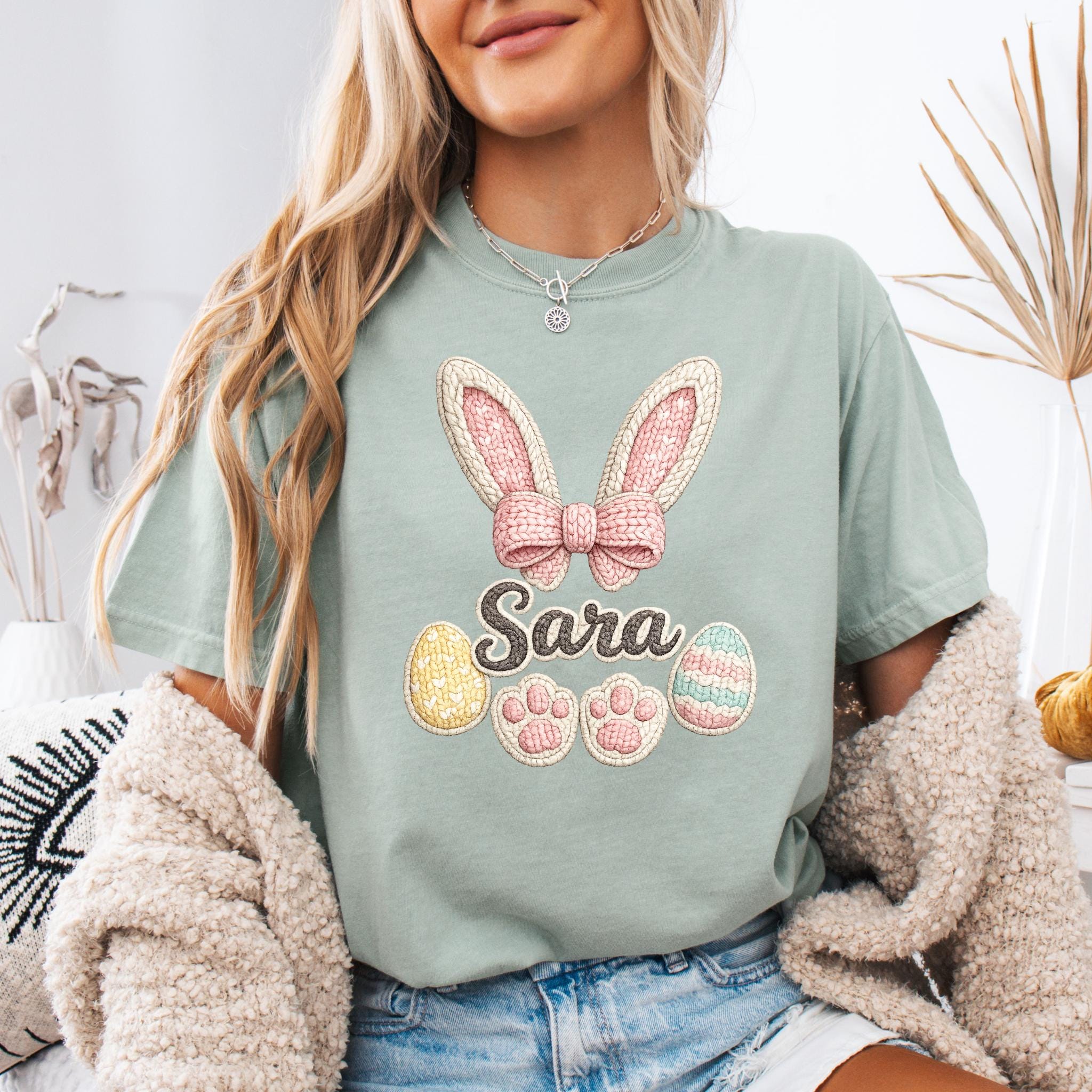 This Custom Name Easter Shirt features bunny ears, a soft bow, pastel Easter eggs, and paw prints designed with a printed embroidery texture effect.