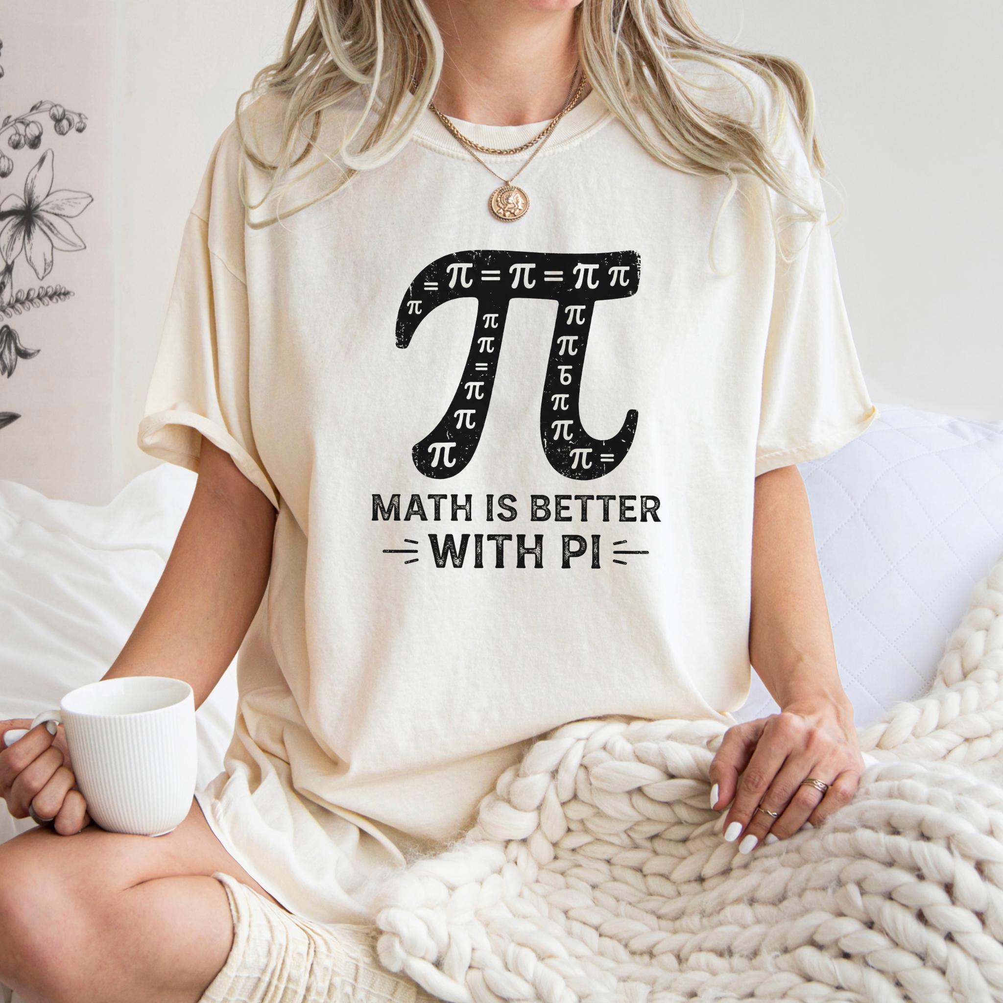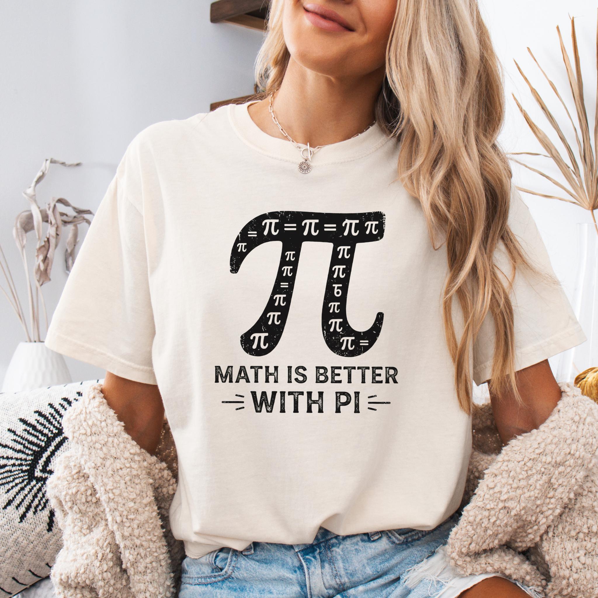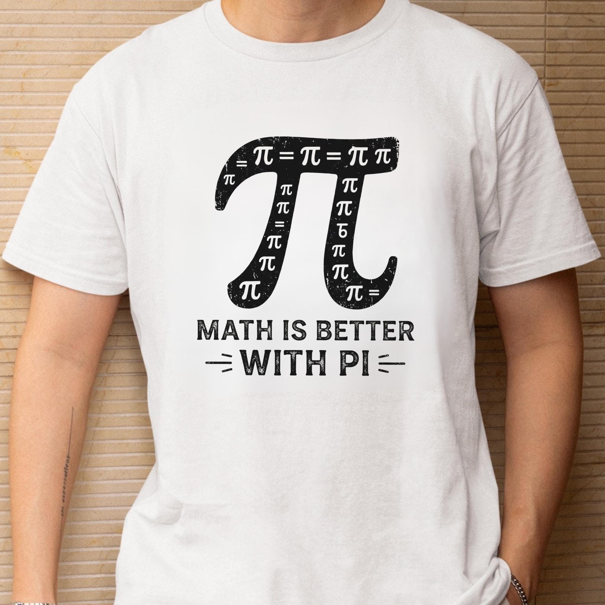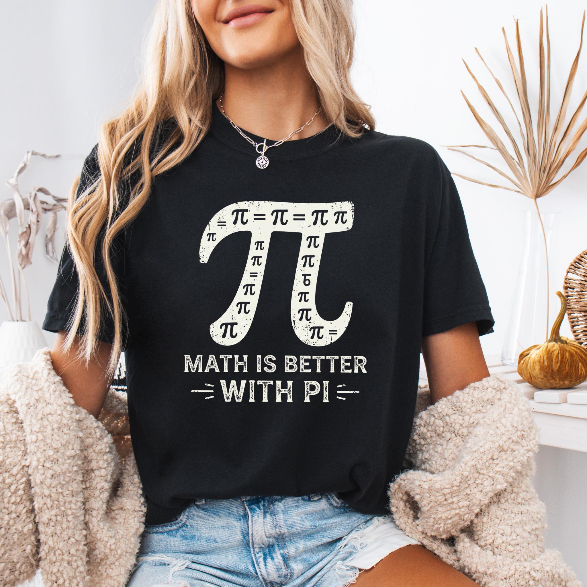 This bold “Math Is Better With Pi” shirt features a large vintage-style π symbol filled with mathematical expressions and repeated pi symbols. A perfect design for math teachers, STEM educators, students, and math lovers.