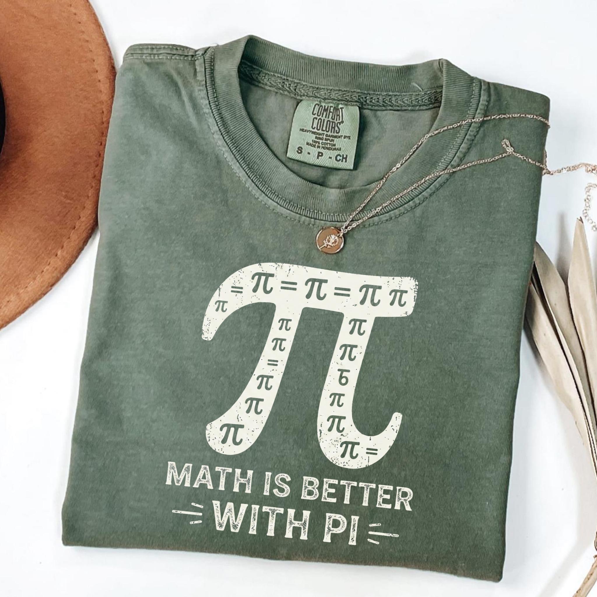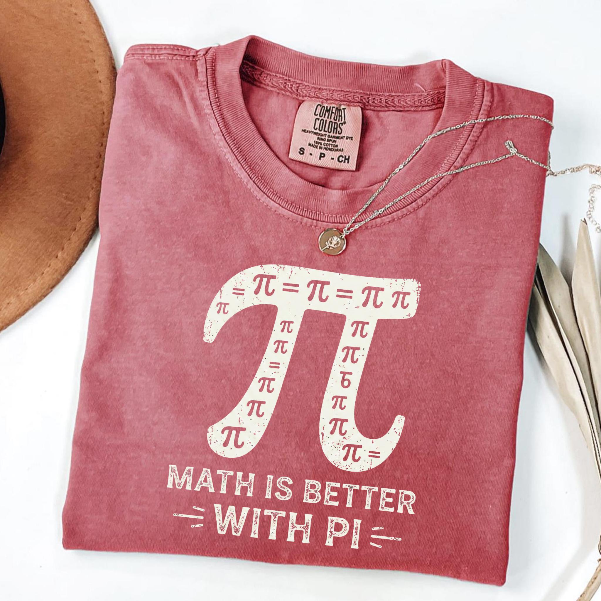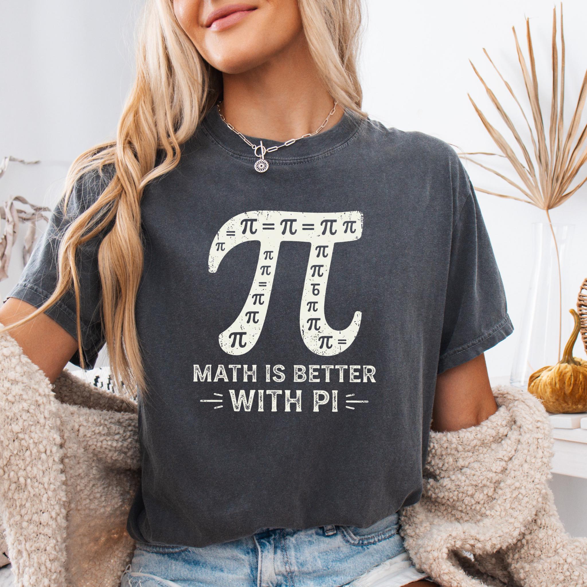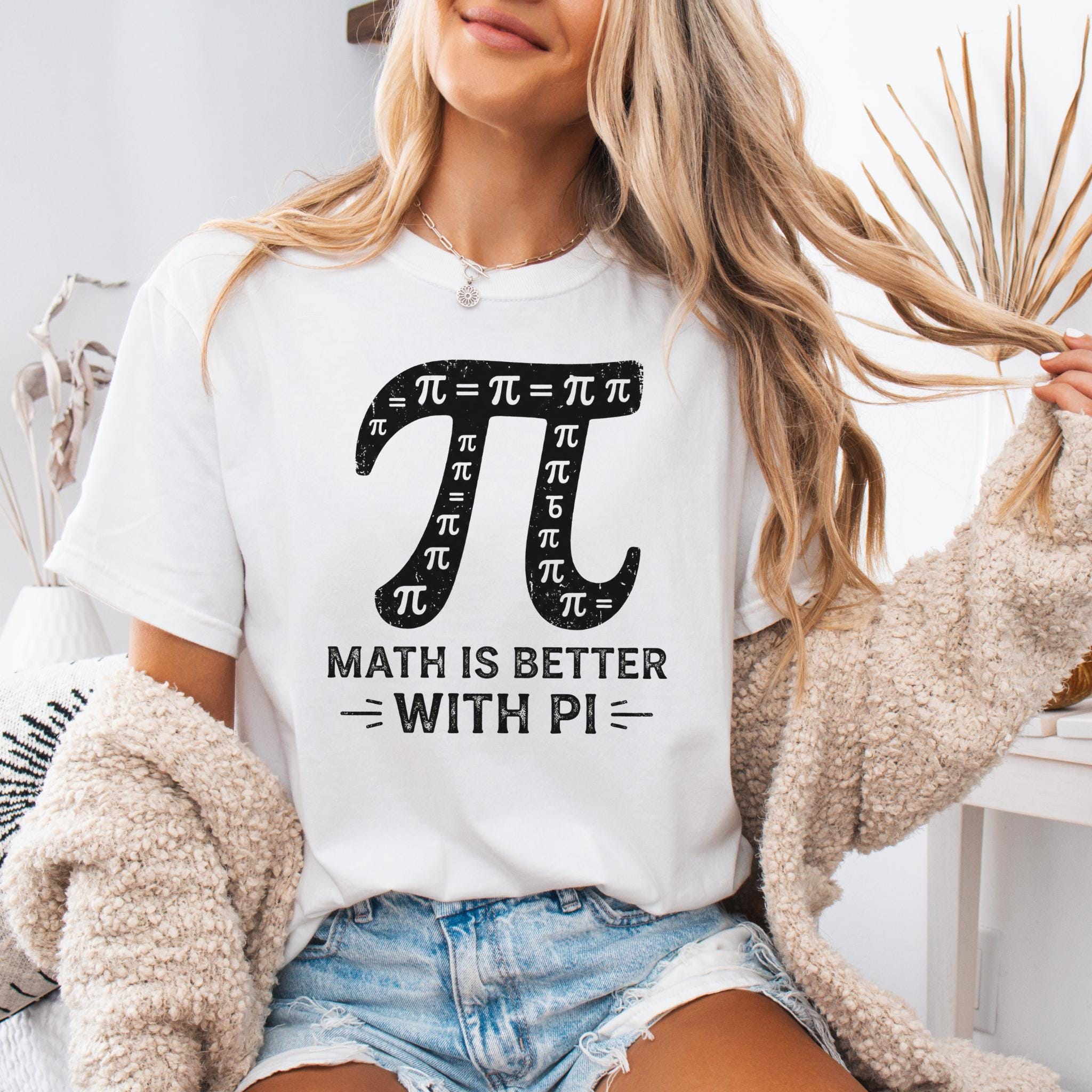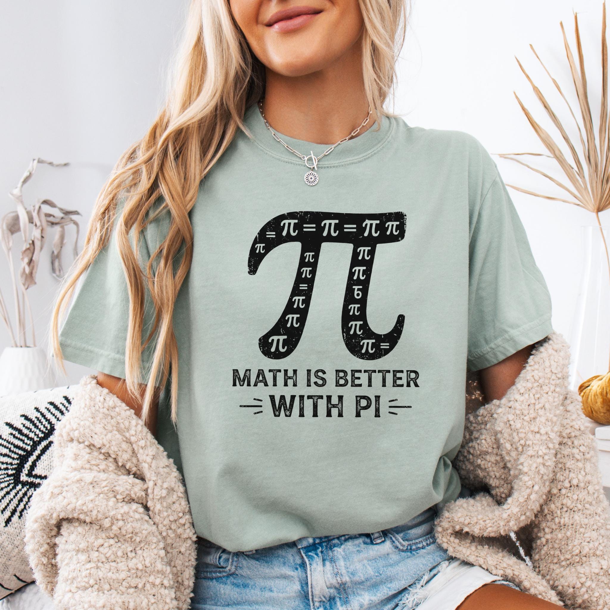 This bold “Math Is Better With Pi” shirt features a large vintage-style π symbol filled with mathematical expressions and repeated pi symbols. A perfect design for math teachers, STEM educators, students, and math lovers.