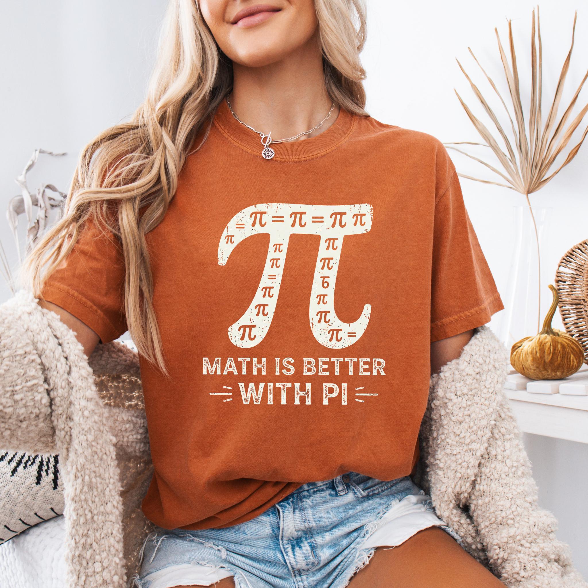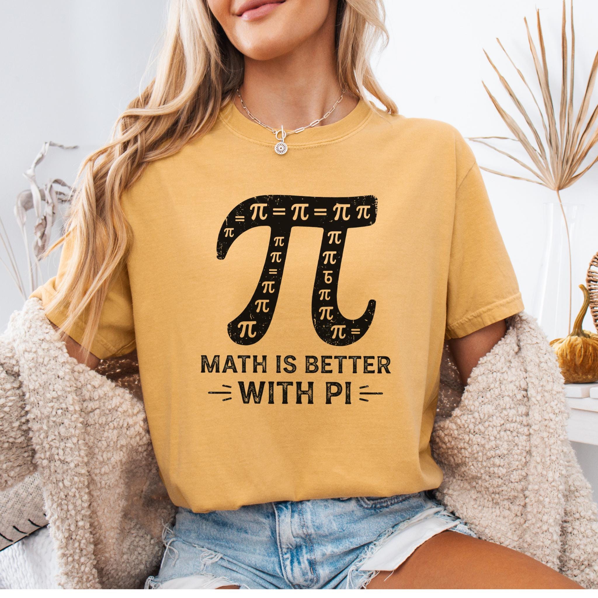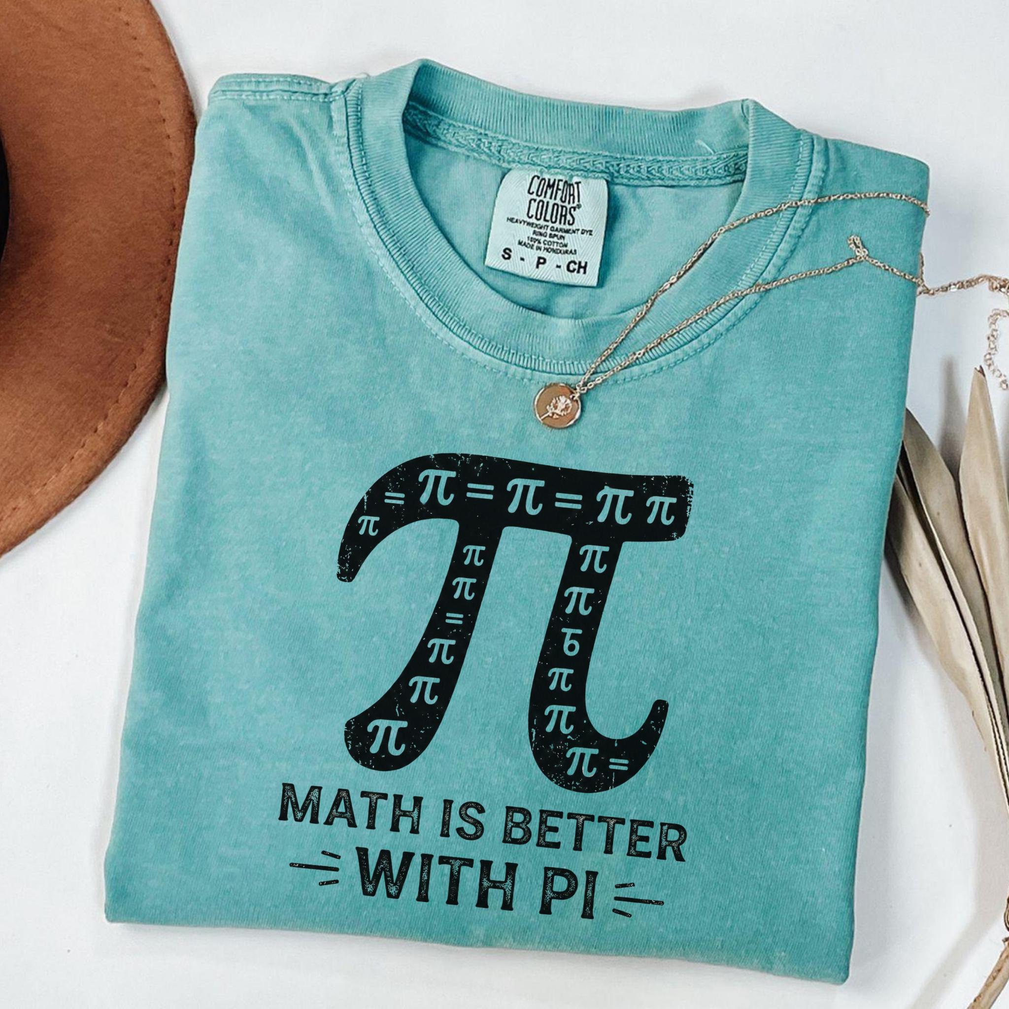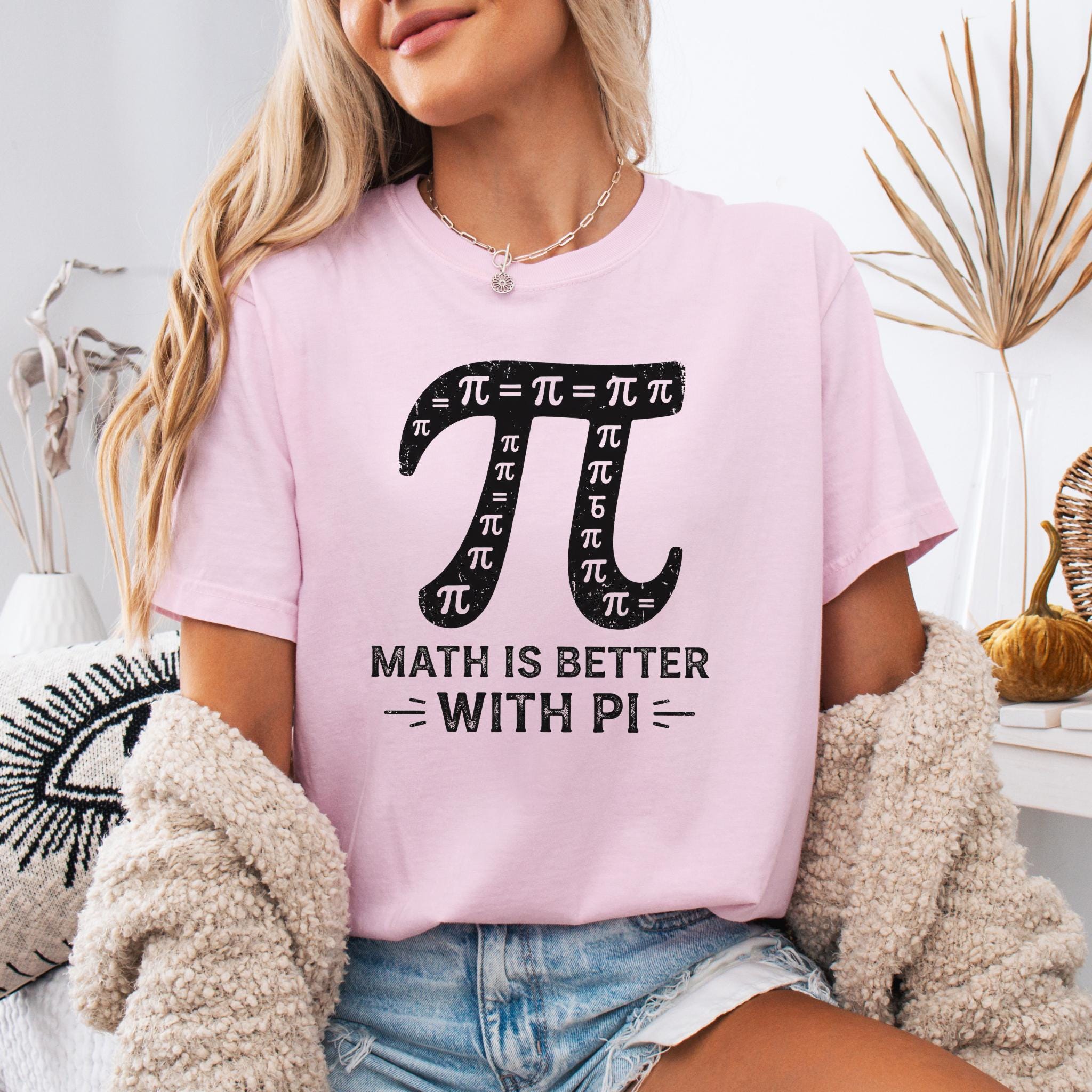 This bold “Math Is Better With Pi” shirt features a large vintage-style π symbol filled with mathematical expressions and repeated pi symbols. A perfect design for math teachers, STEM educators, students, and math lovers.