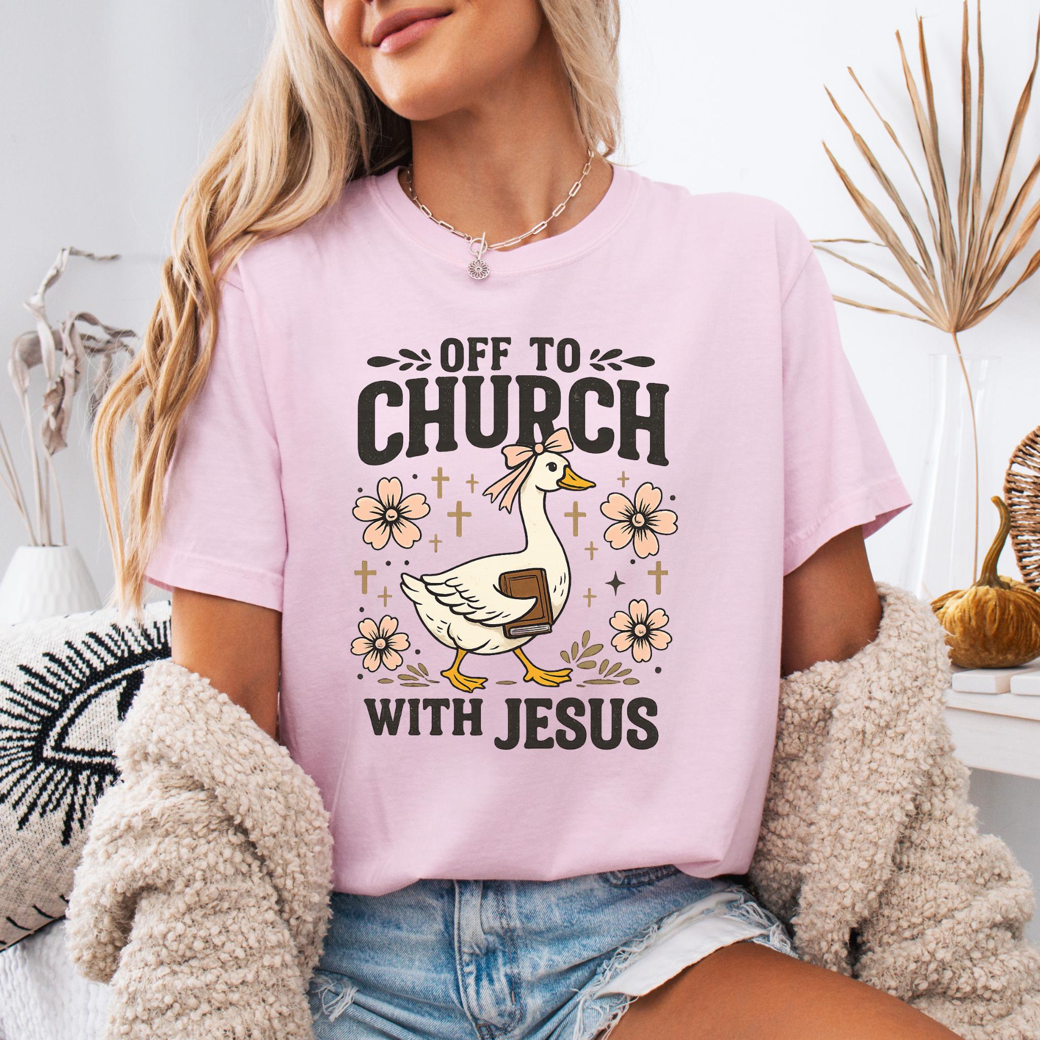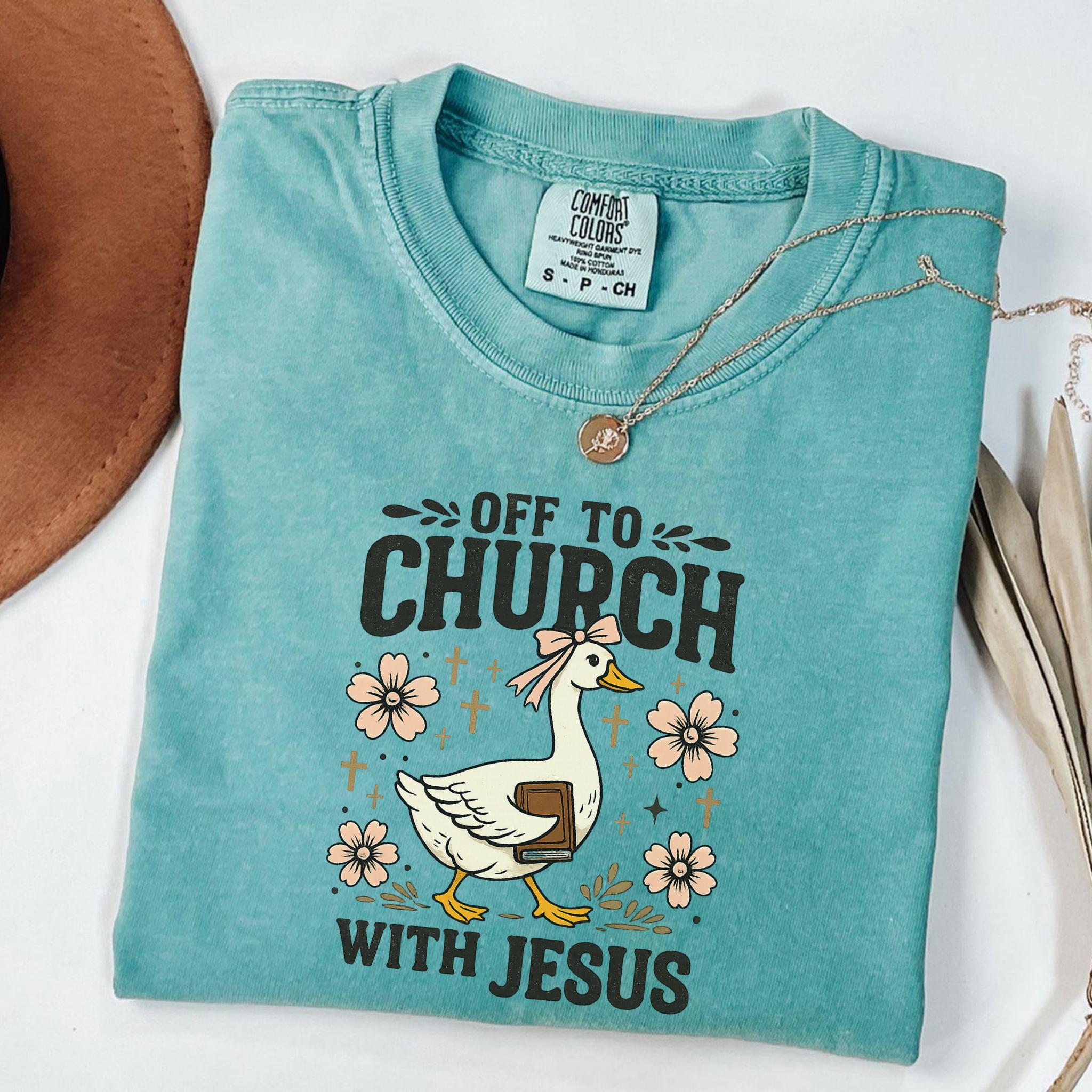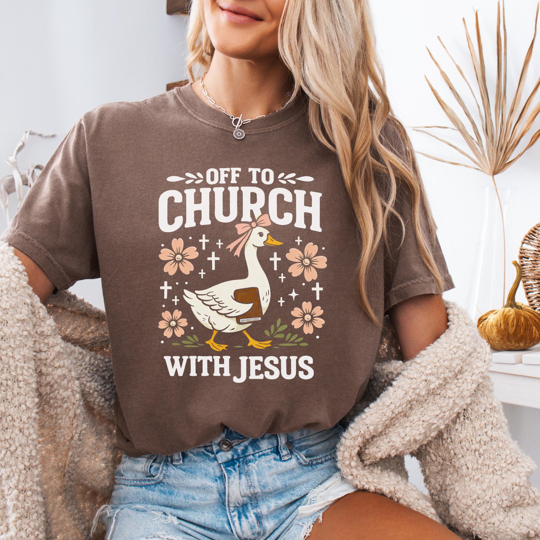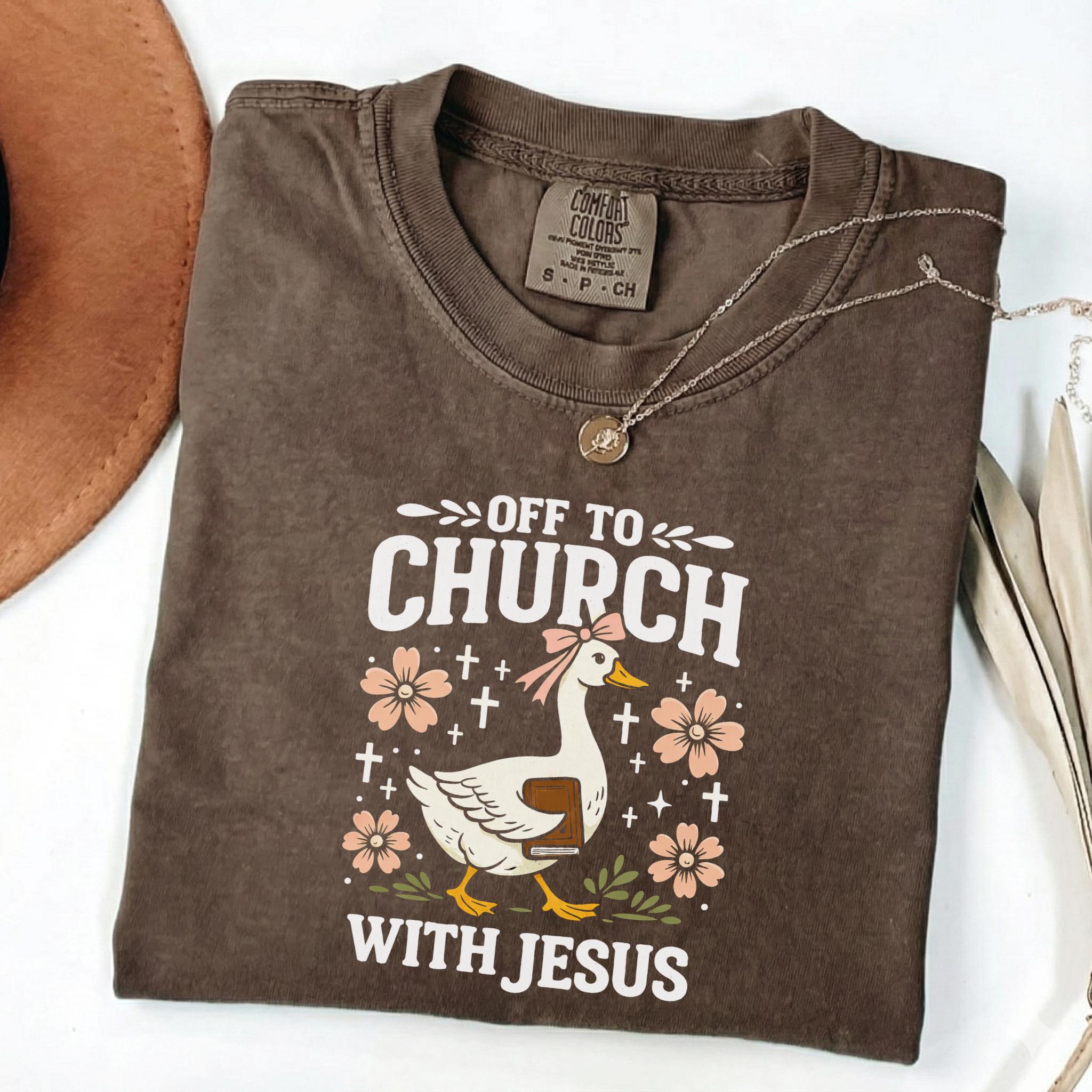 Show your faith with a touch of humor with this adorable “Off To Church With Jesus” Christian goose shirt.