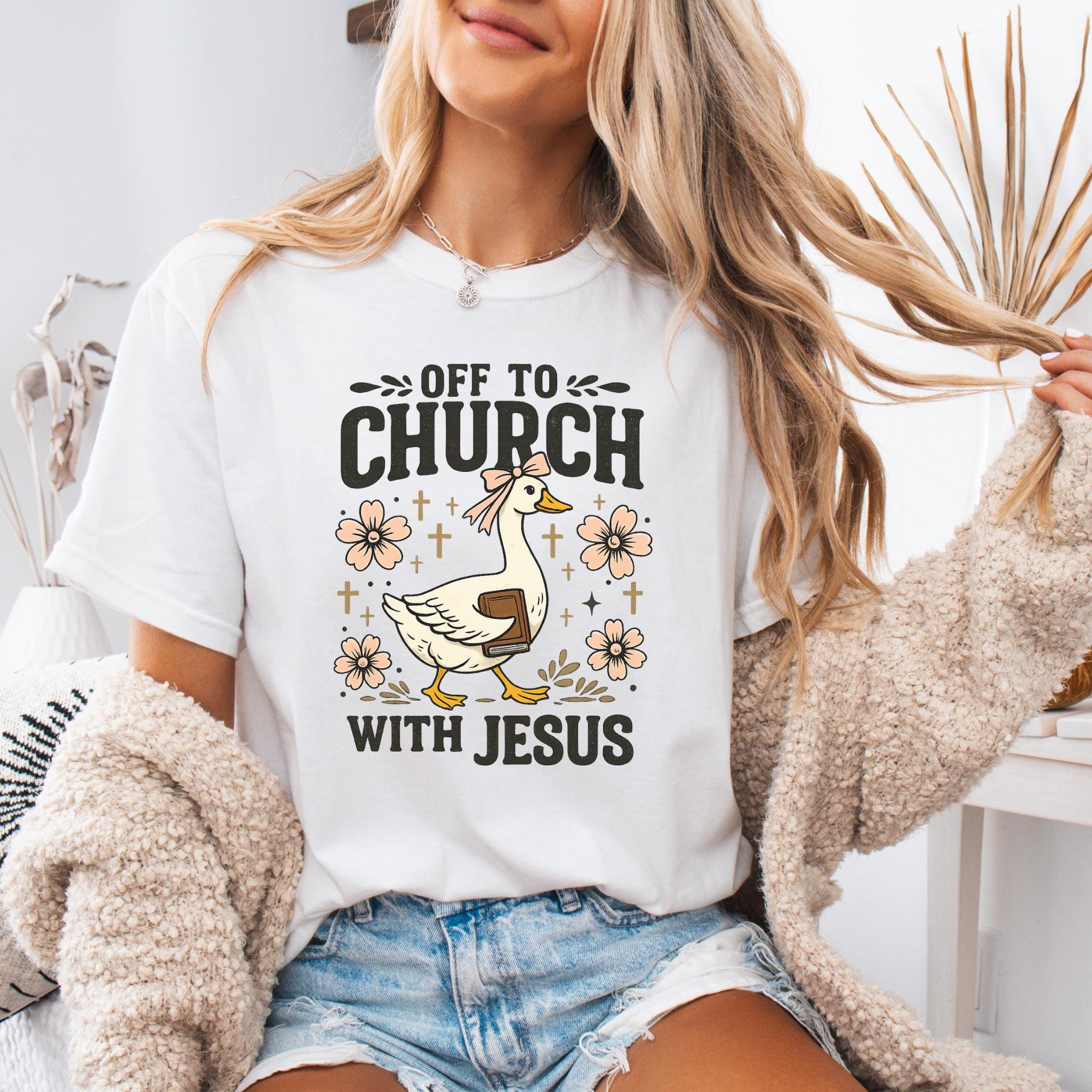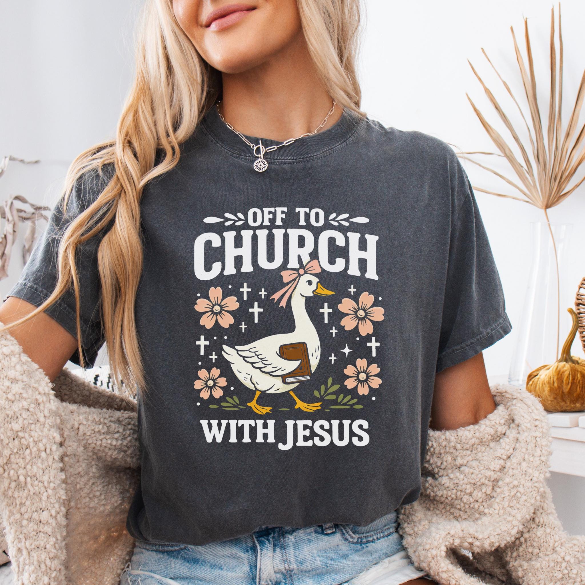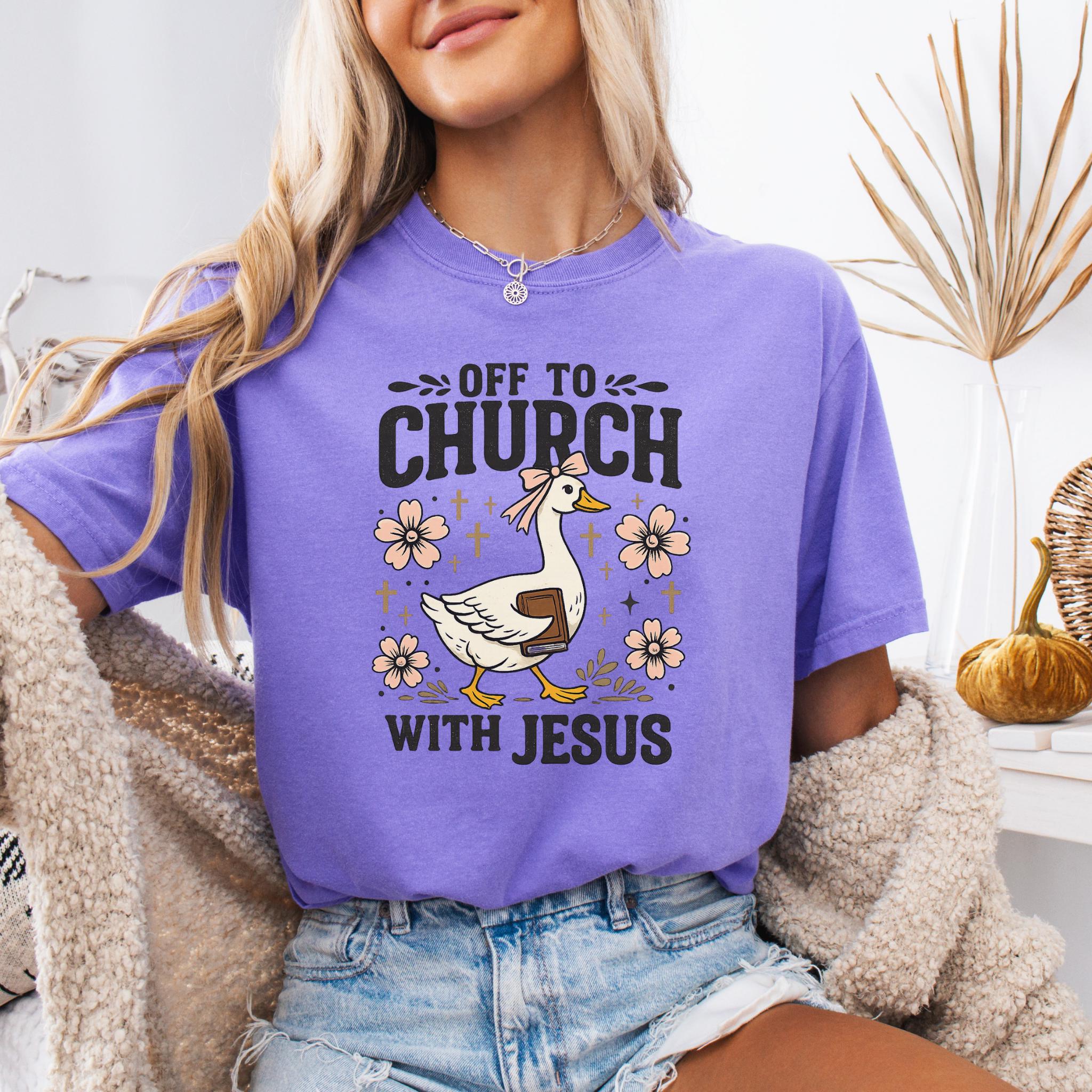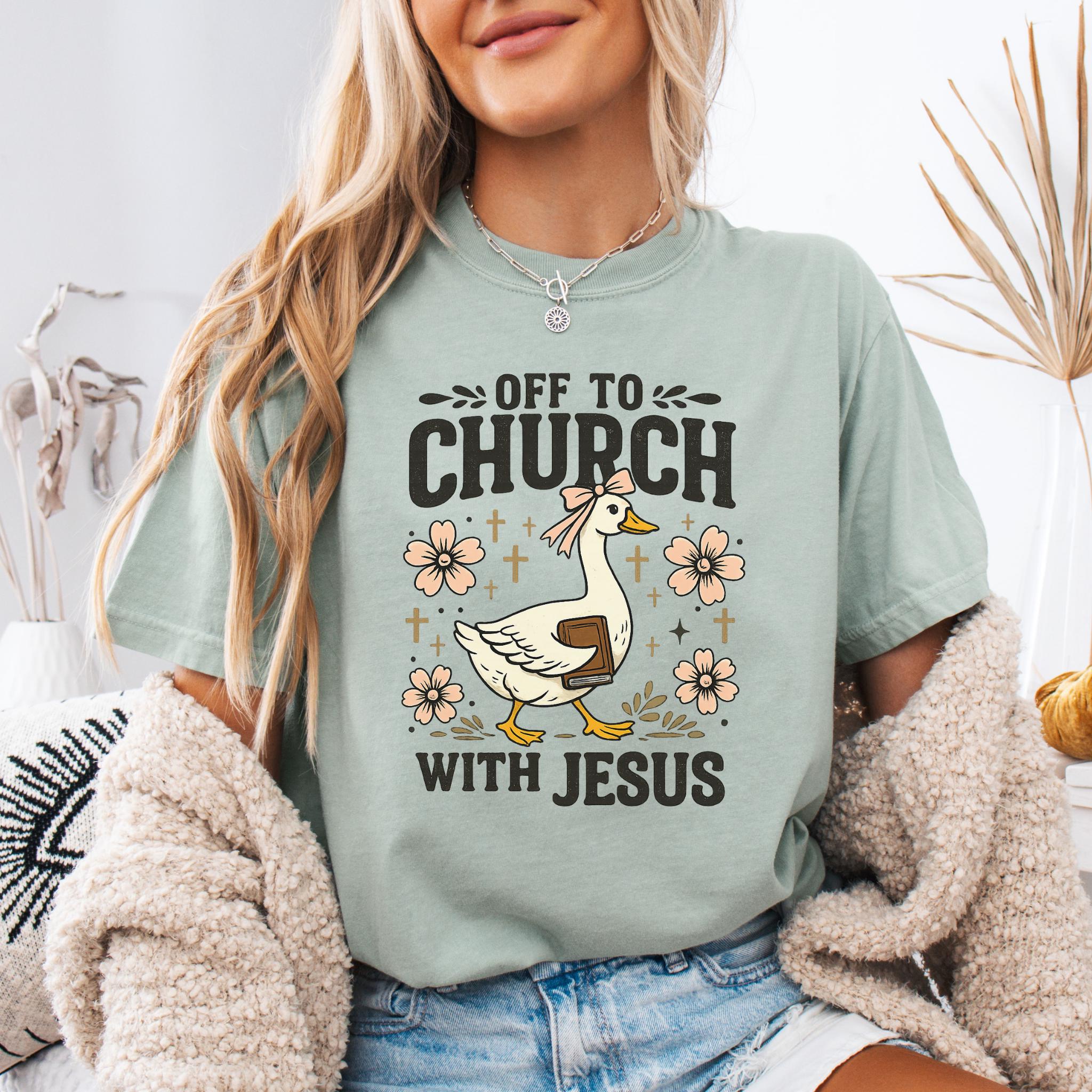 Show your faith with a touch of humor with this adorable “Off To Church With Jesus” Christian goose shirt.