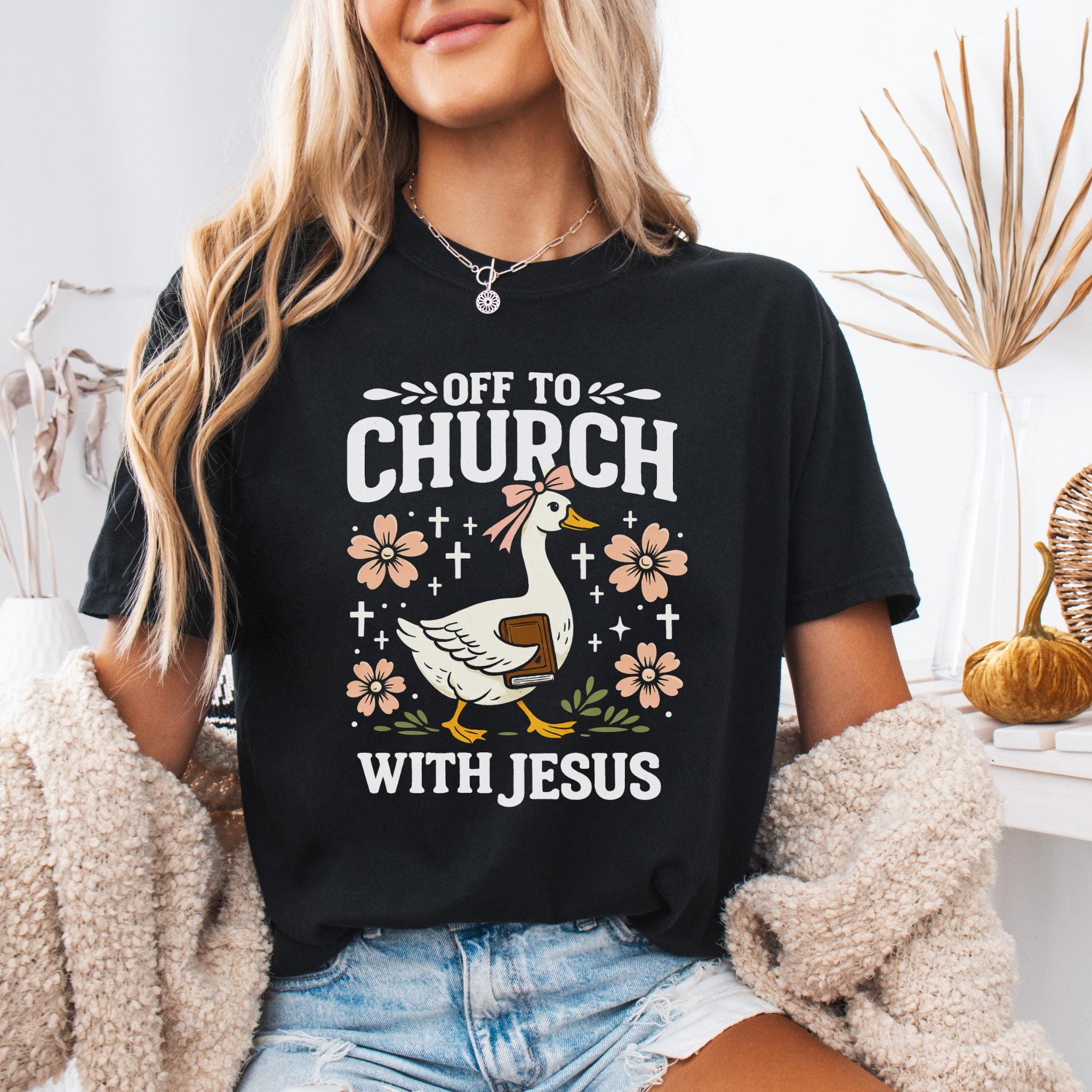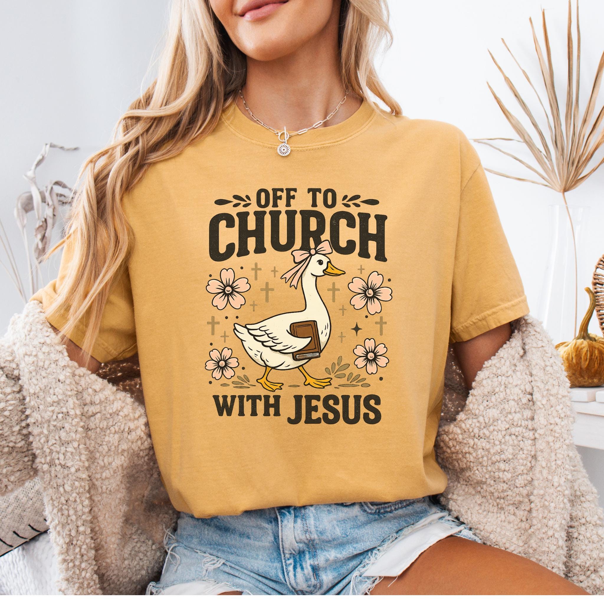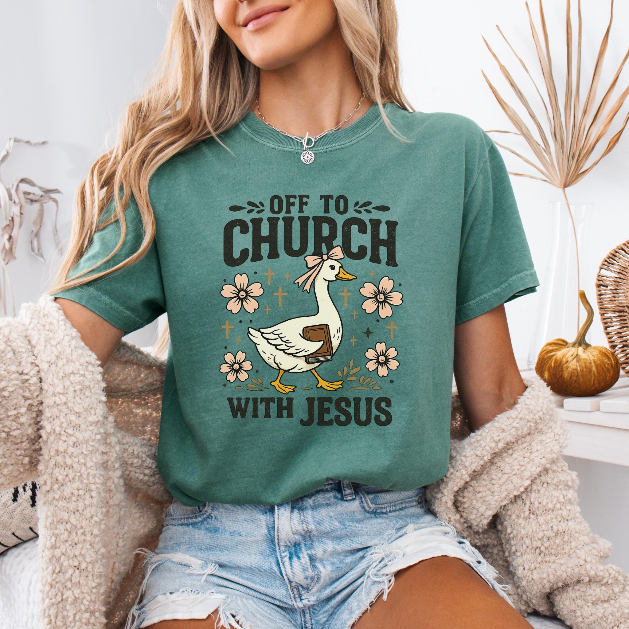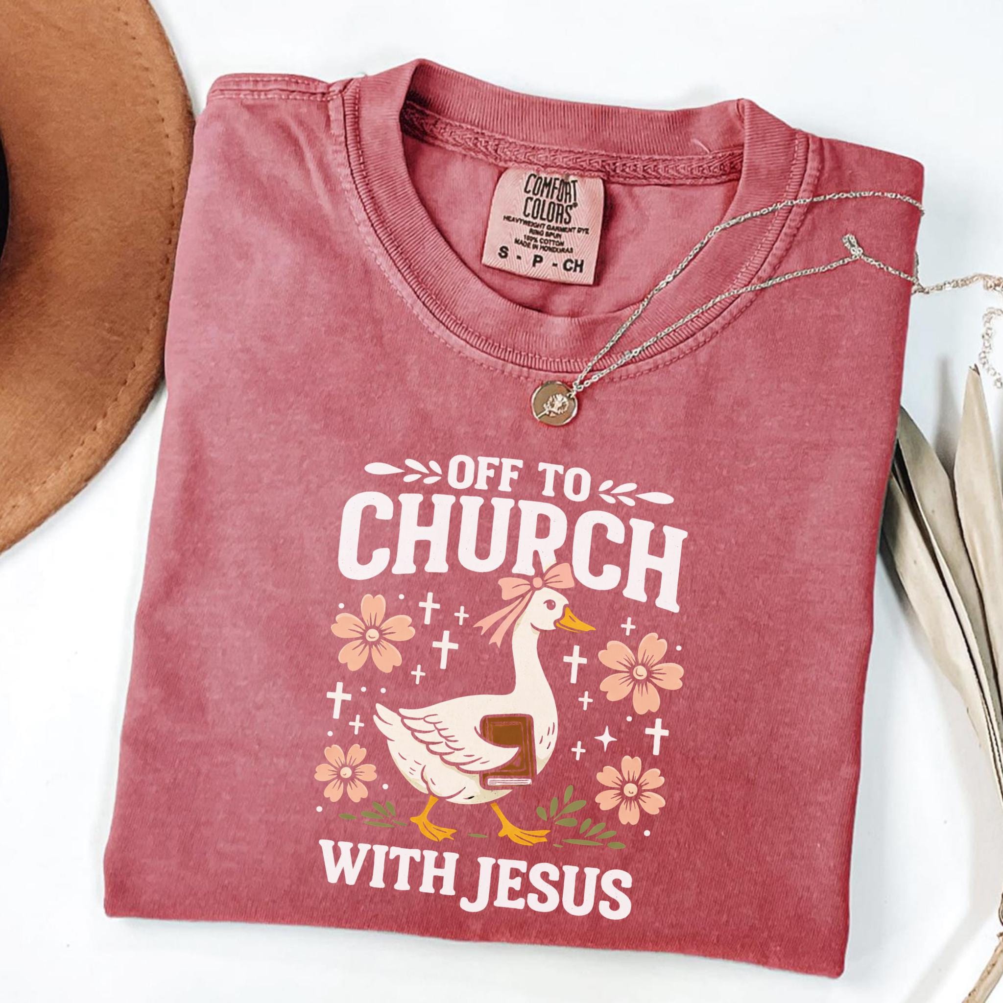 Show your faith with a touch of humor with this adorable “Off To Church With Jesus” Christian goose shirt.
