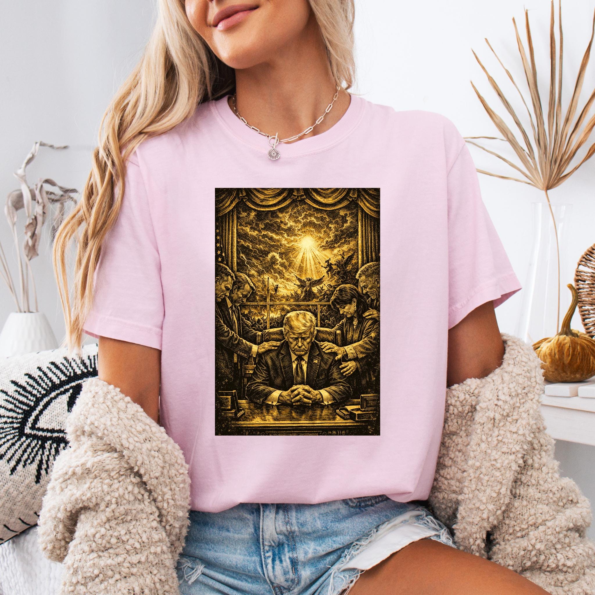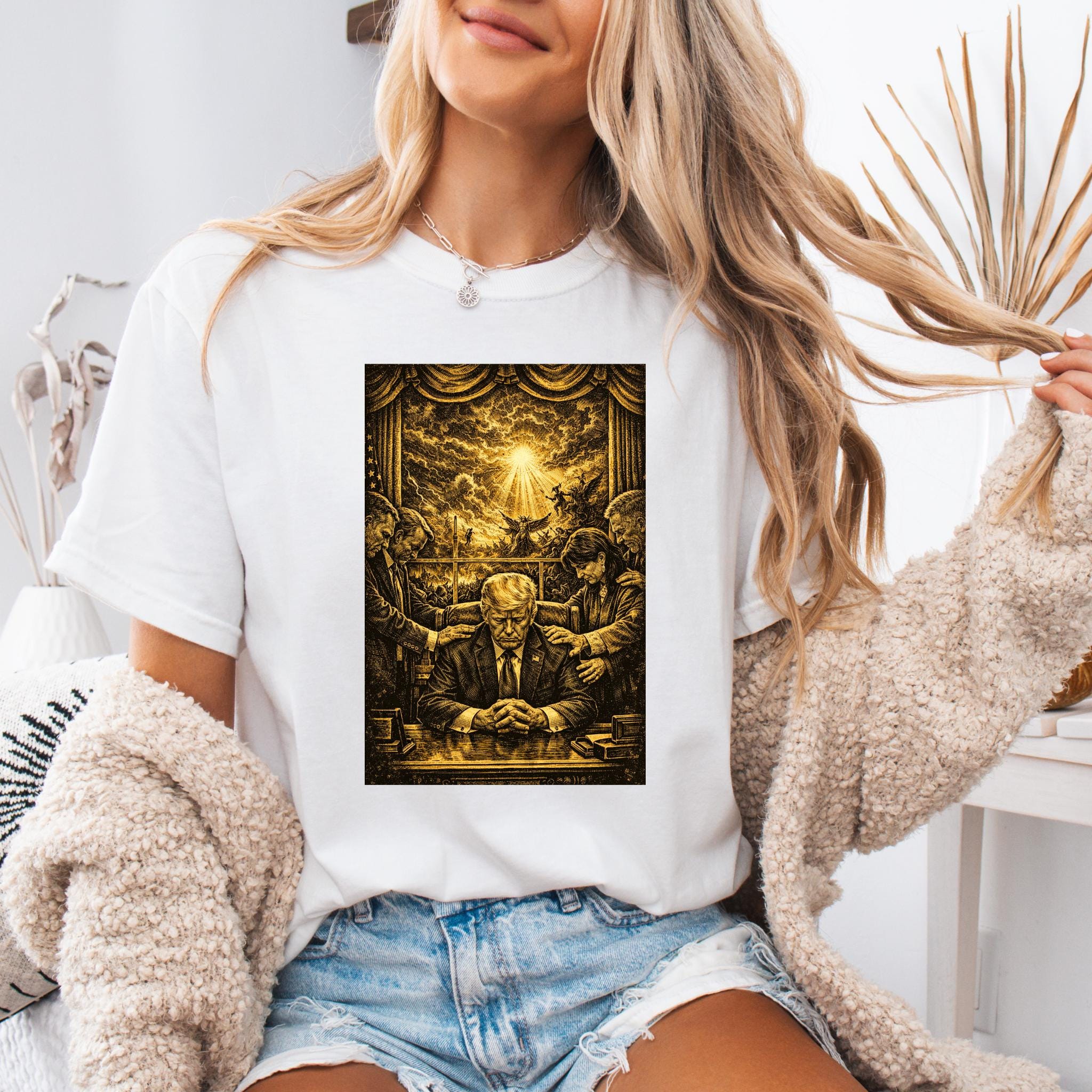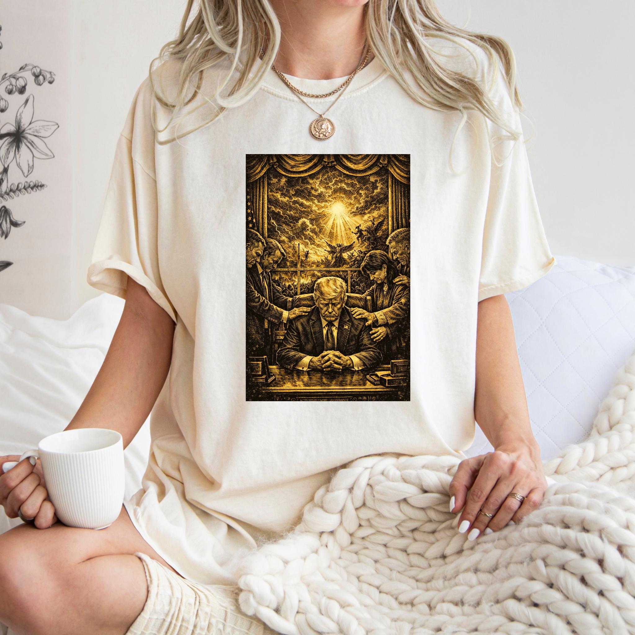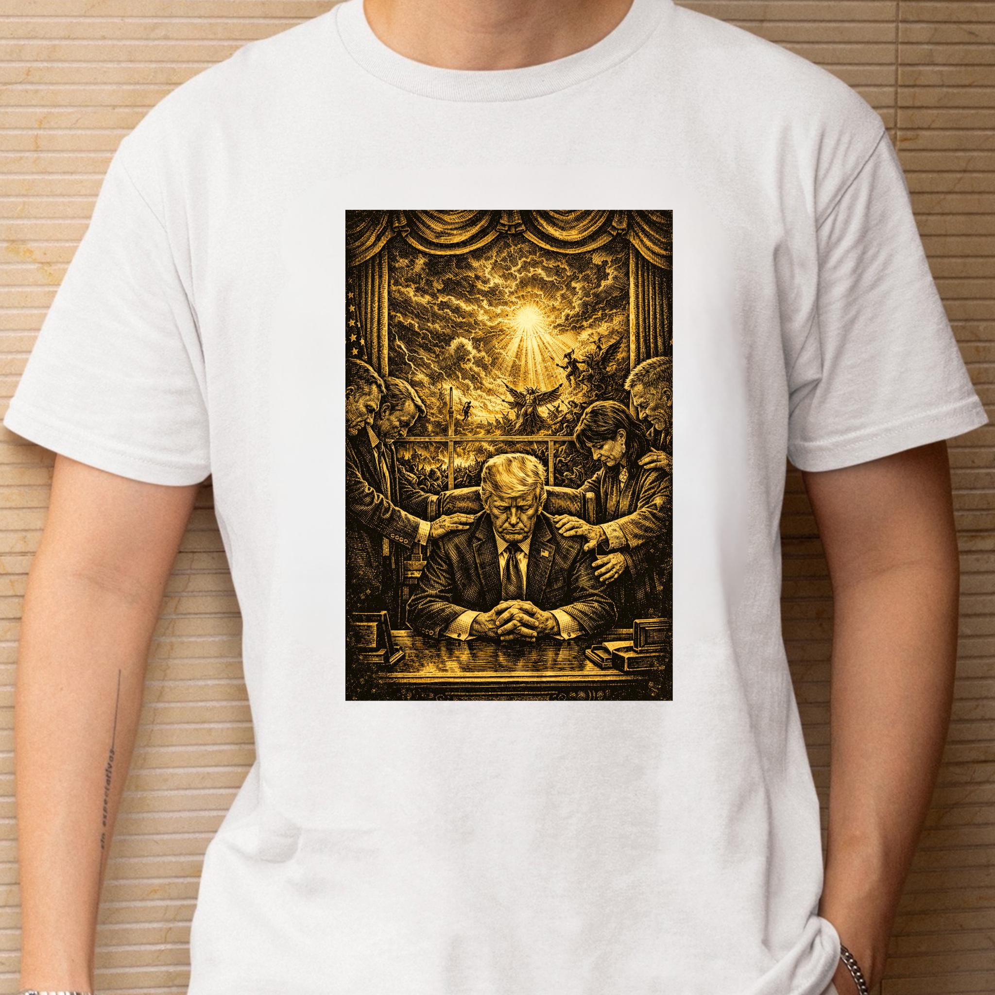 This powerful graphic shirt features a dramatic scene inspired by themes of faith, Anti Trump prayer, and leadership, combining symbolic Christian imagery with a bold political atmosphere.