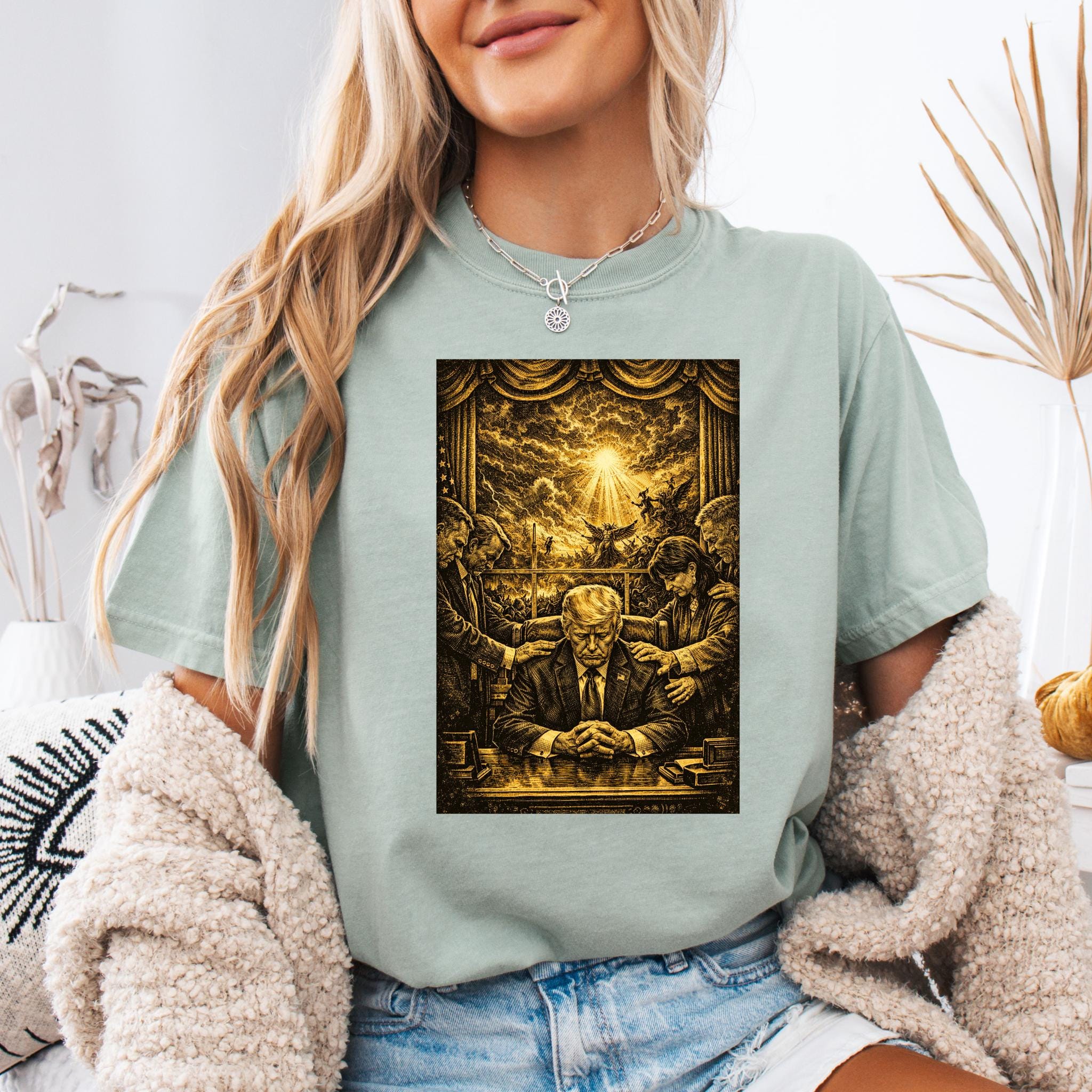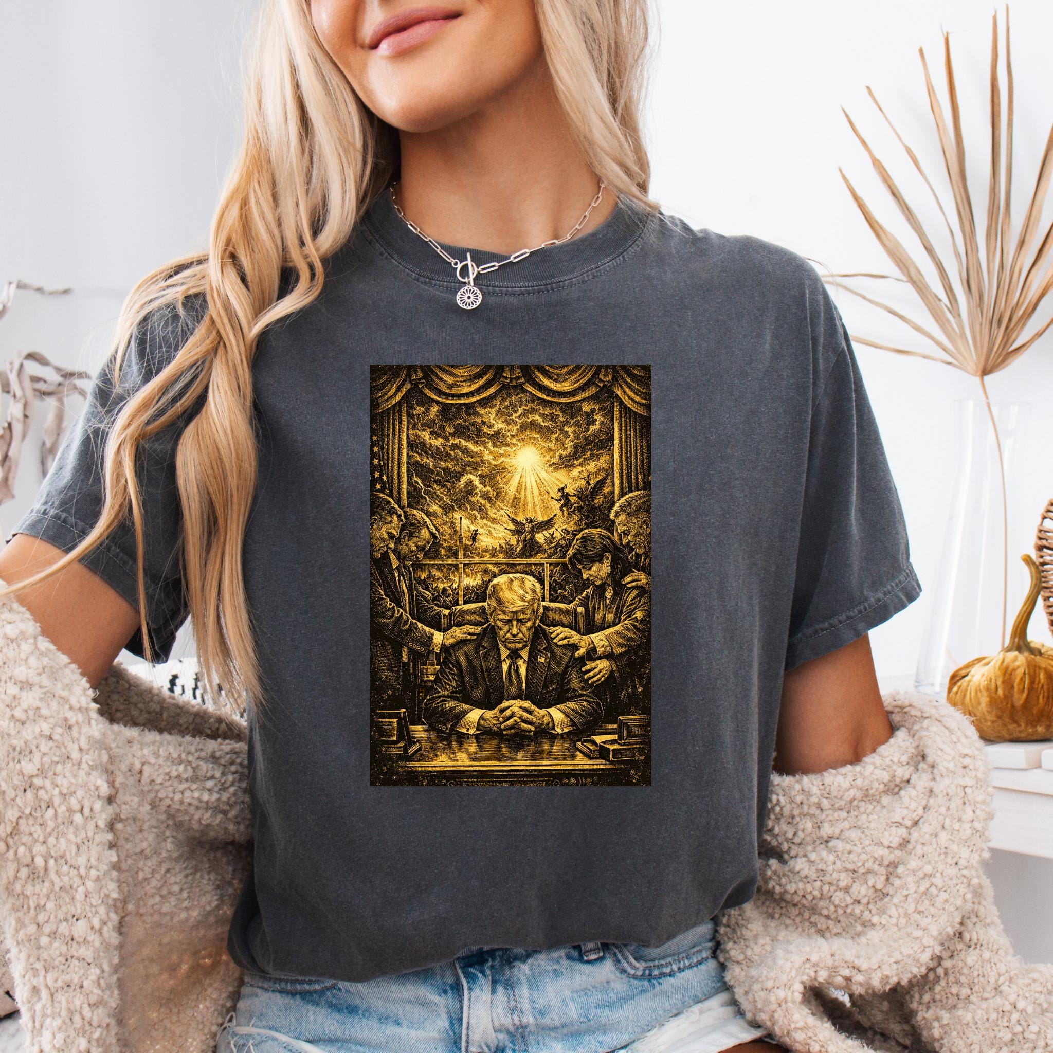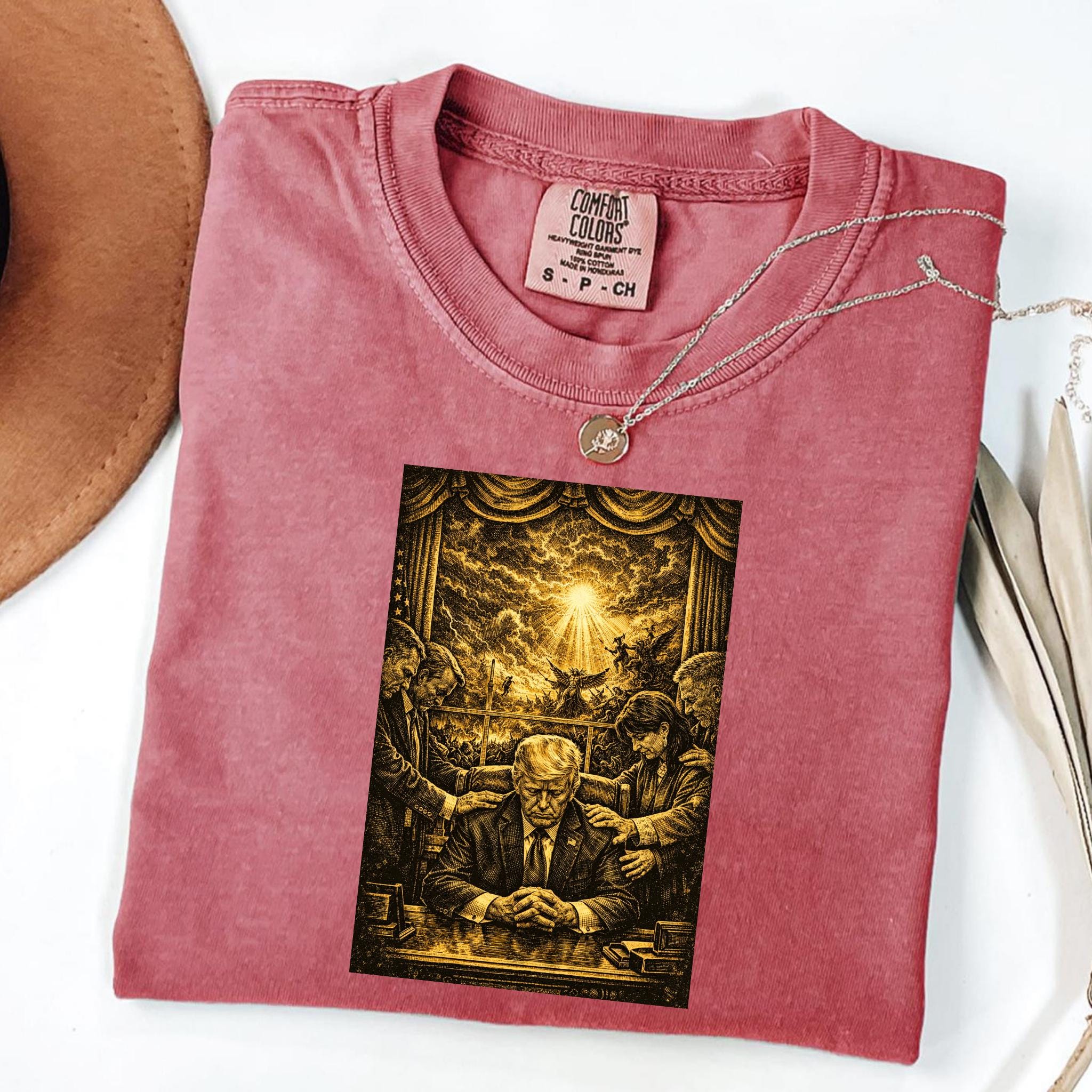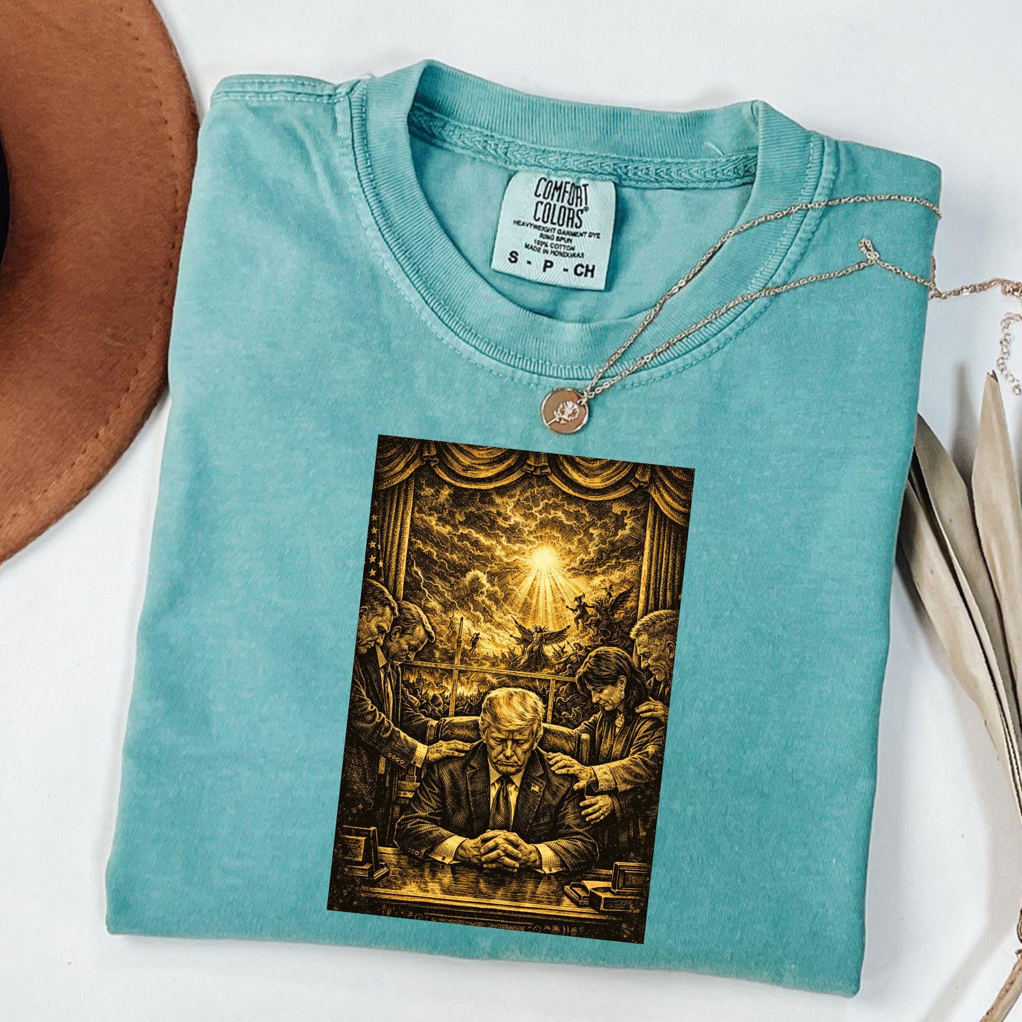 This powerful graphic shirt features a dramatic scene inspired by themes of faith, Anti Trump prayer, and leadership, combining symbolic Christian imagery with a bold political atmosphere.