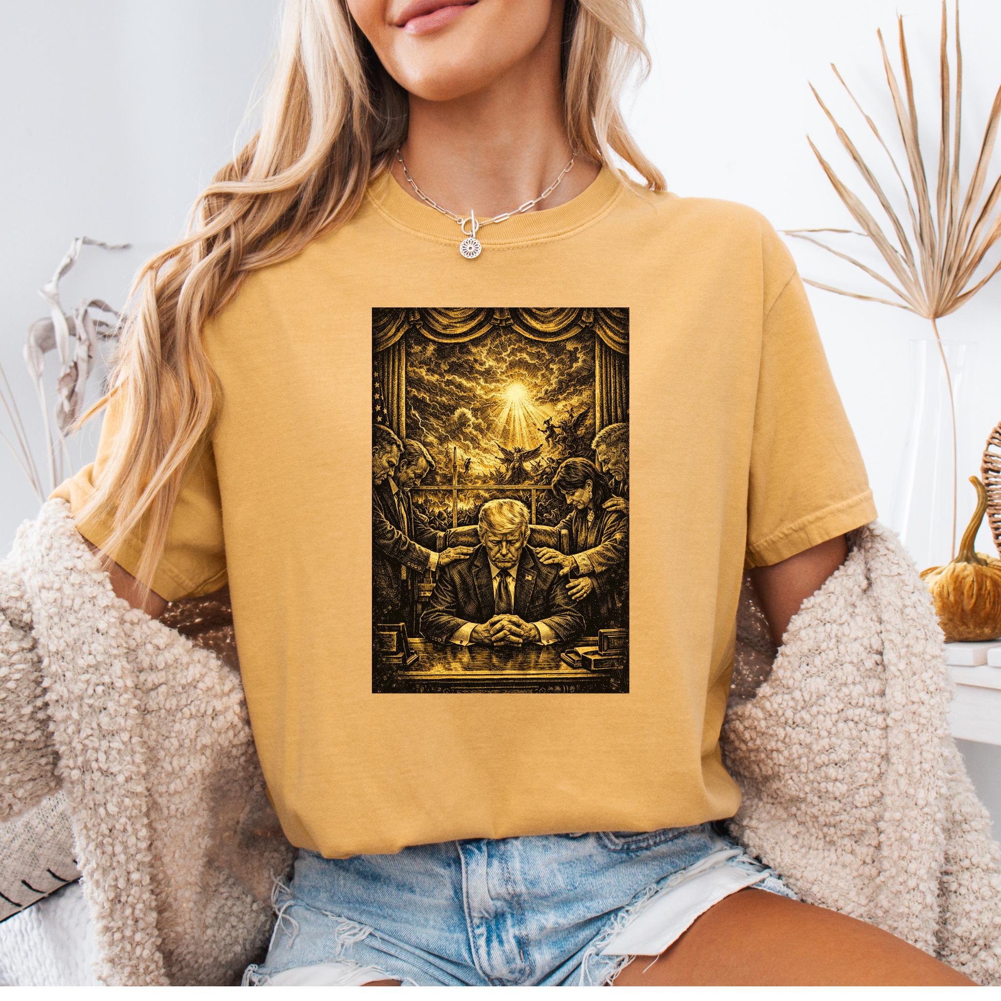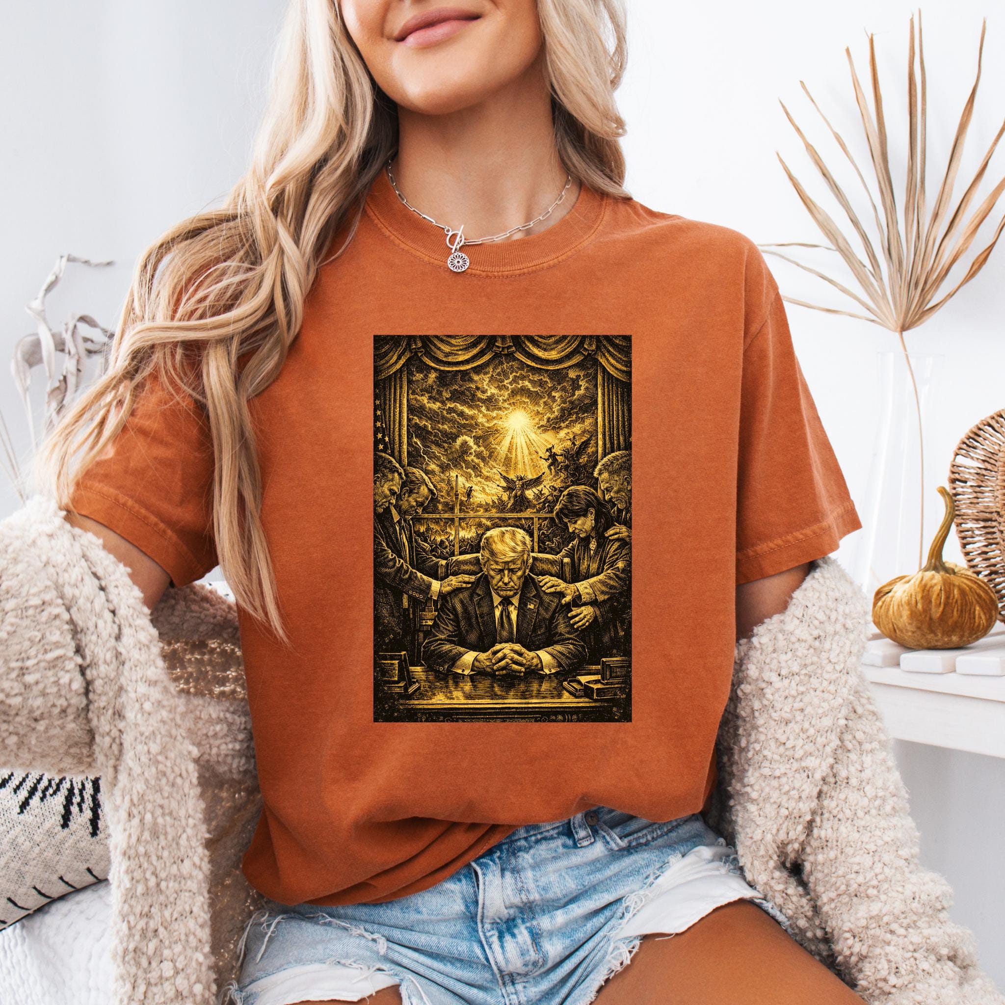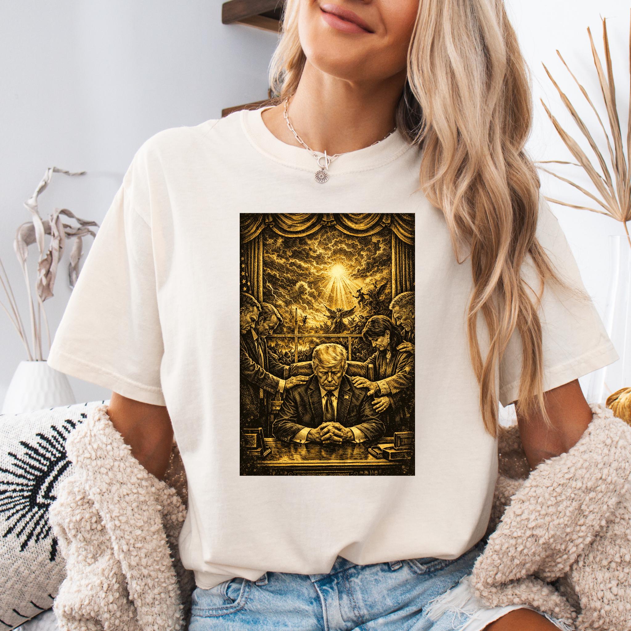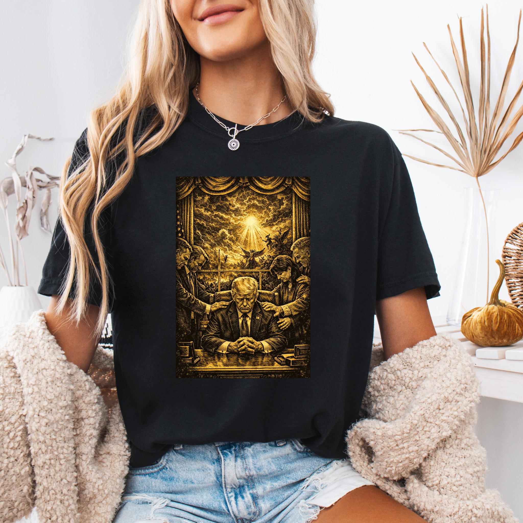 This powerful graphic shirt features a dramatic scene inspired by themes of faith, Anti Trump prayer, and leadership, combining symbolic Christian imagery with a bold political atmosphere.