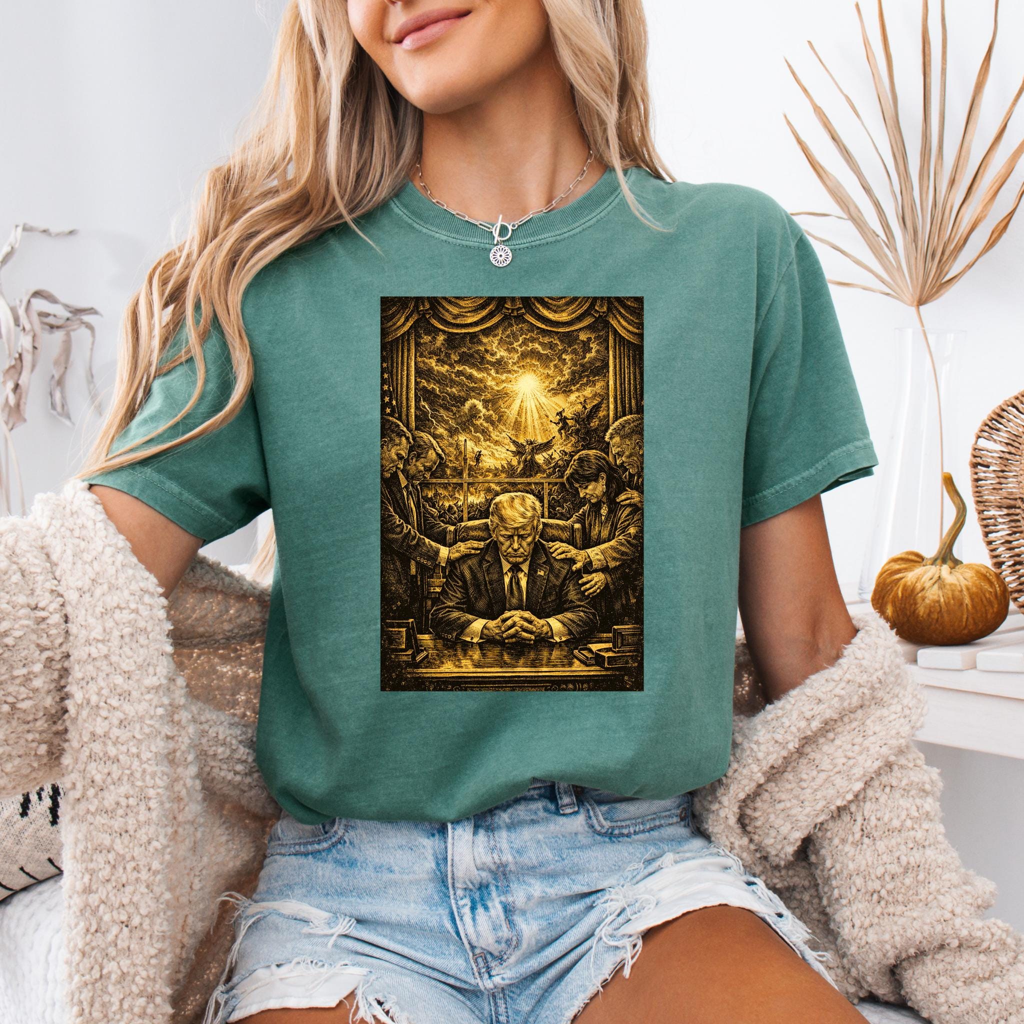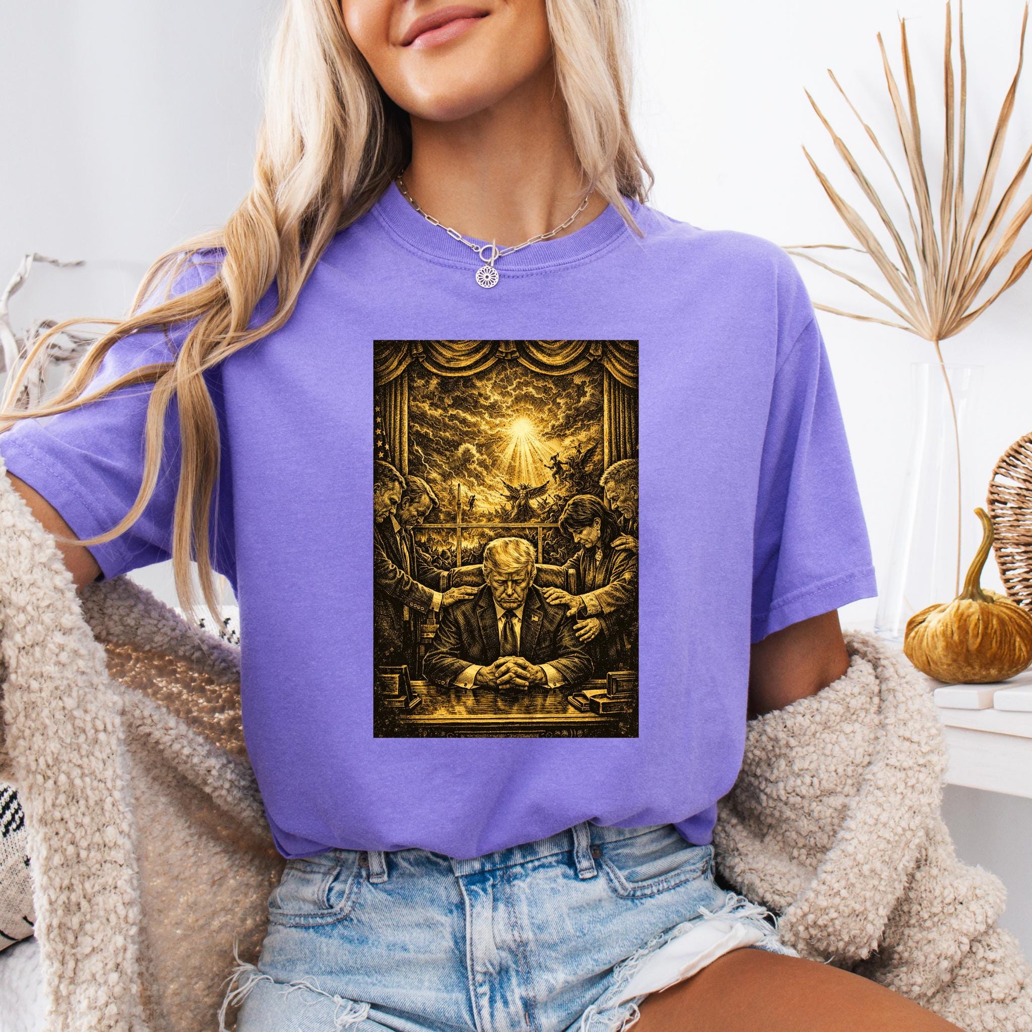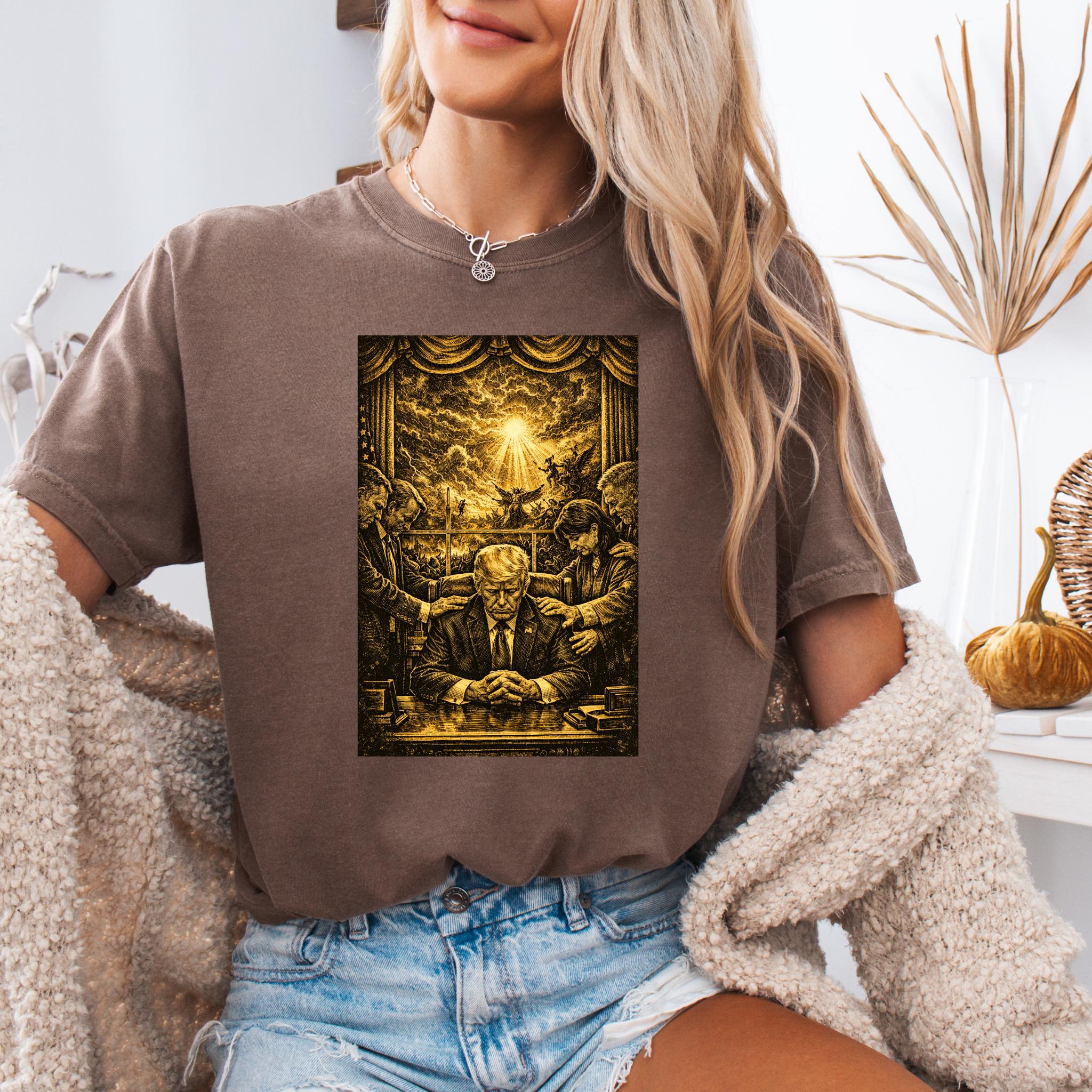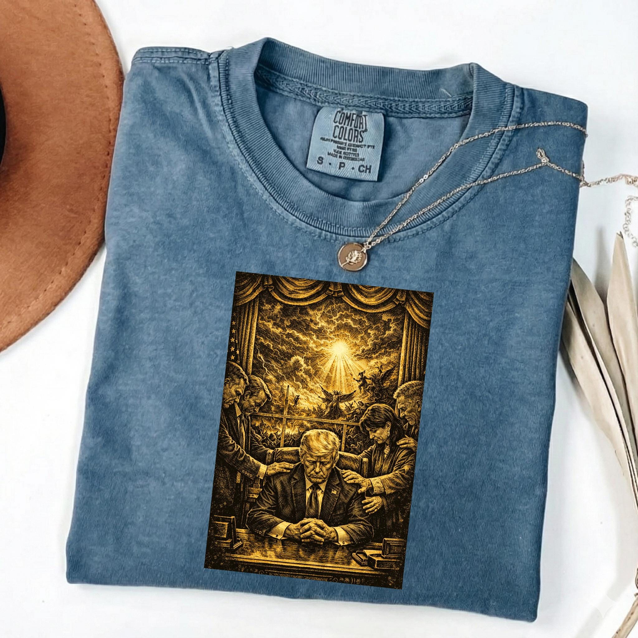 This powerful graphic shirt features a dramatic scene inspired by themes of faith, Anti Trump prayer, and leadership, combining symbolic Christian imagery with a bold political atmosphere.