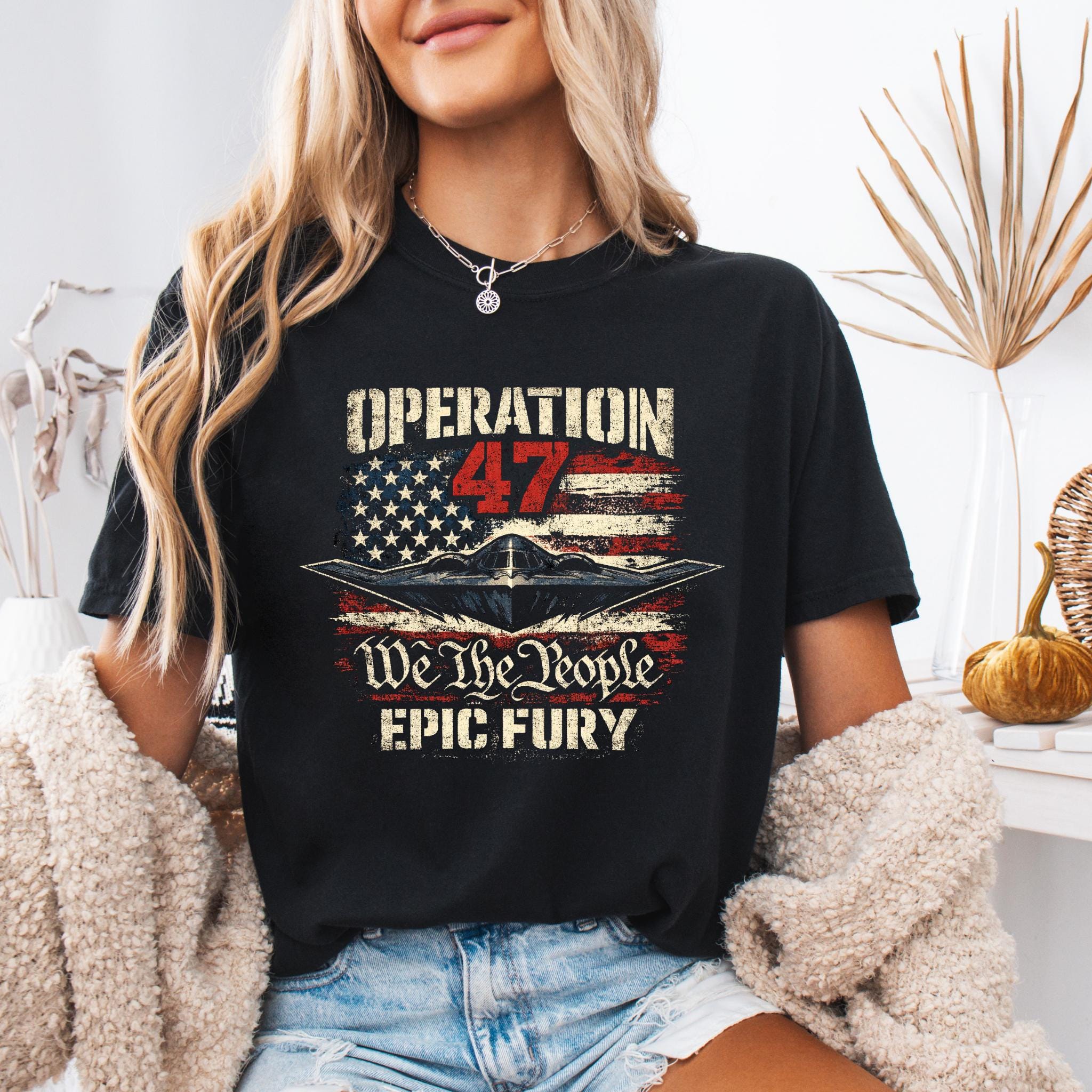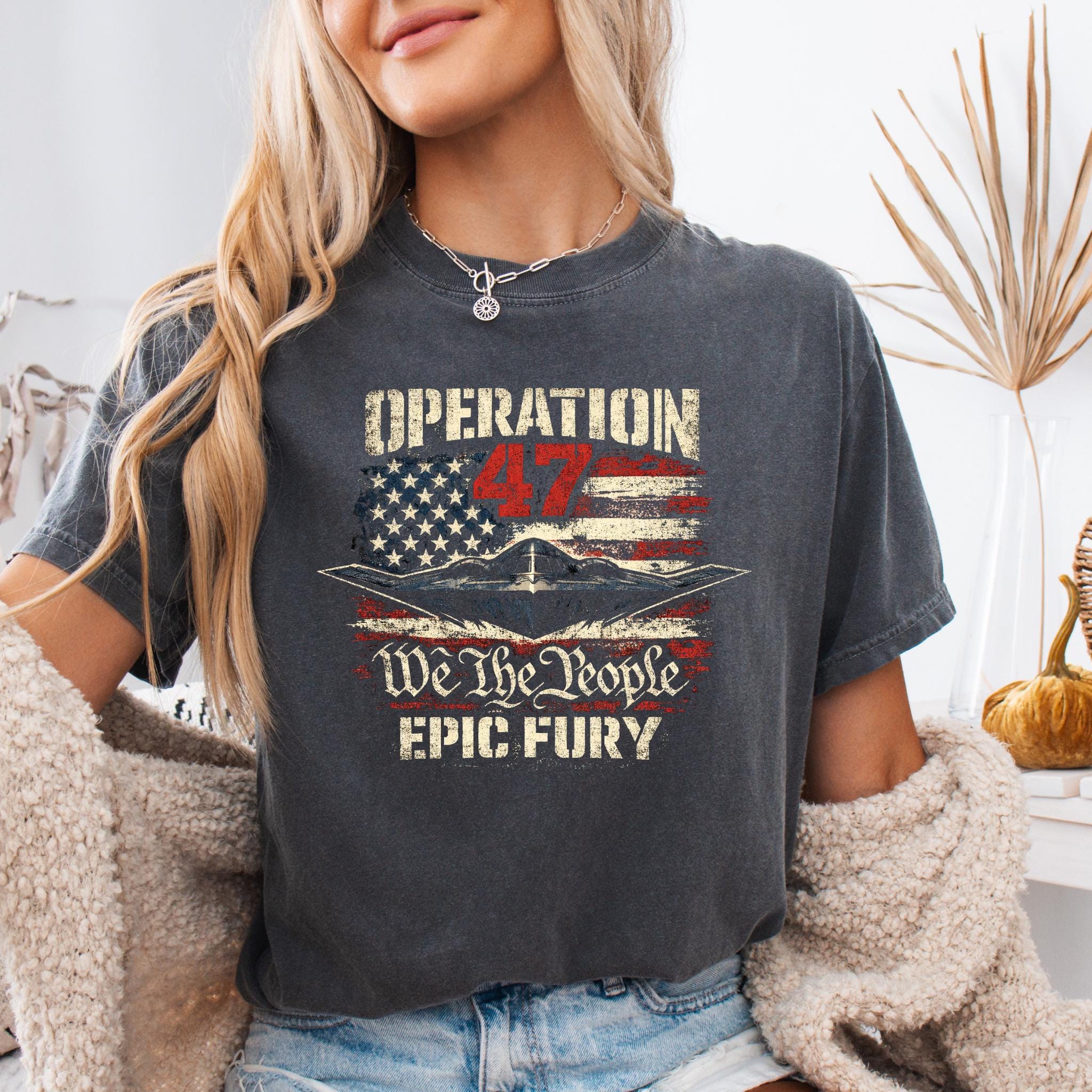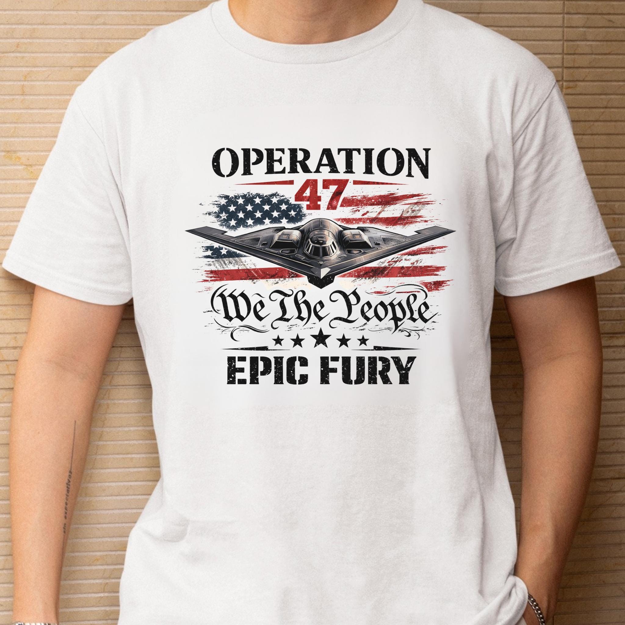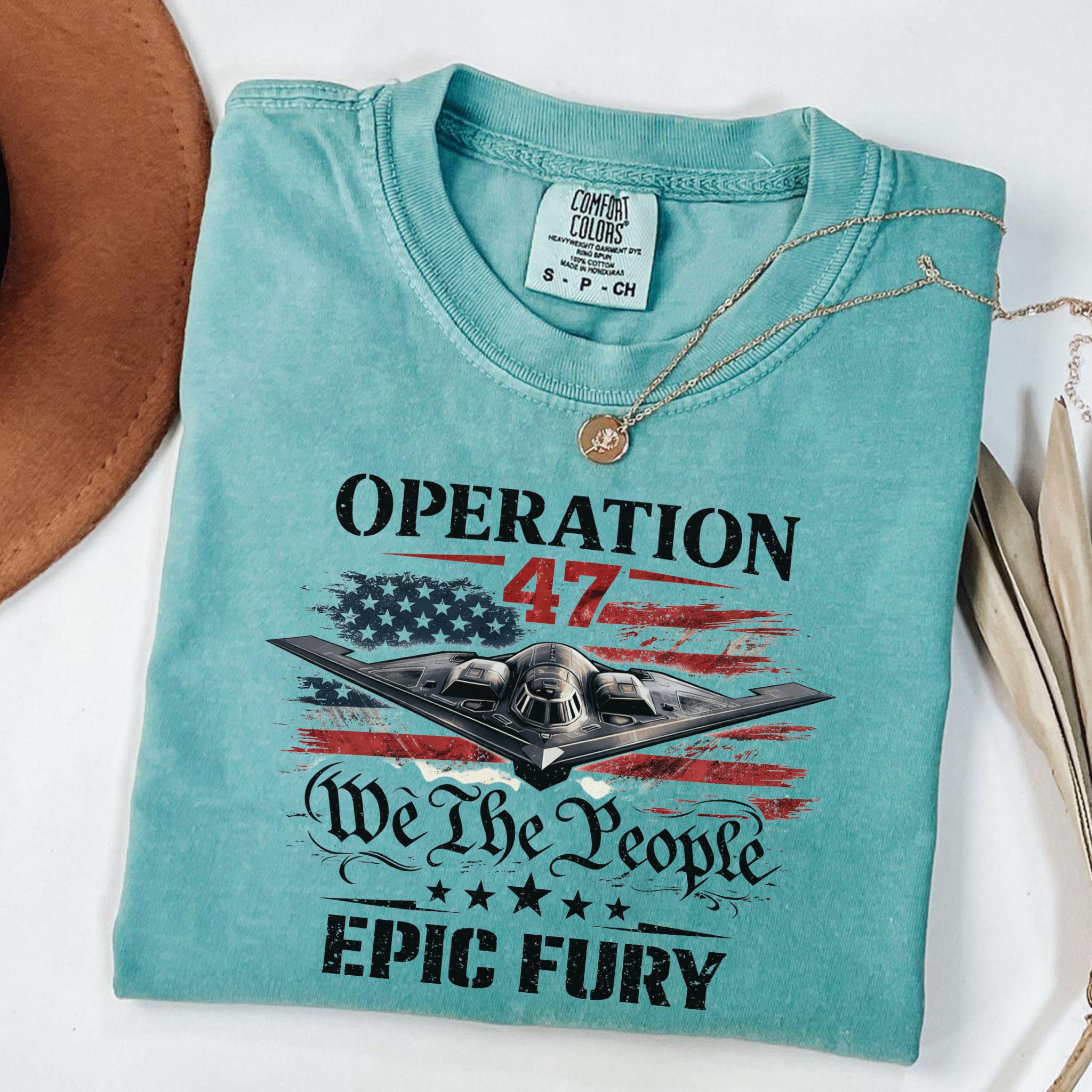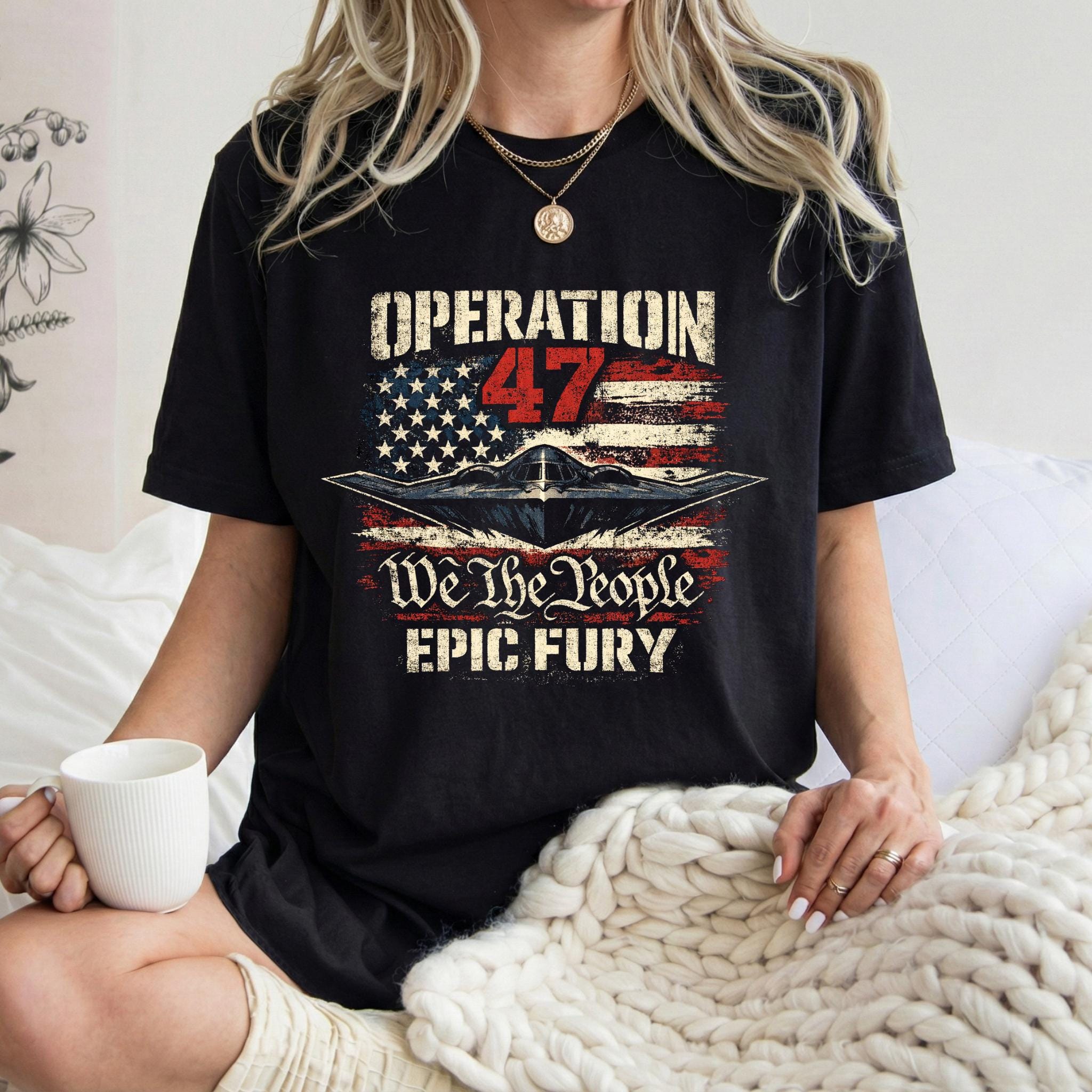 Show your patriotic spirit with this bold Operation 47 patriotic aviation shirt featuring a powerful stealth aircraft flying over a distressed American flag.