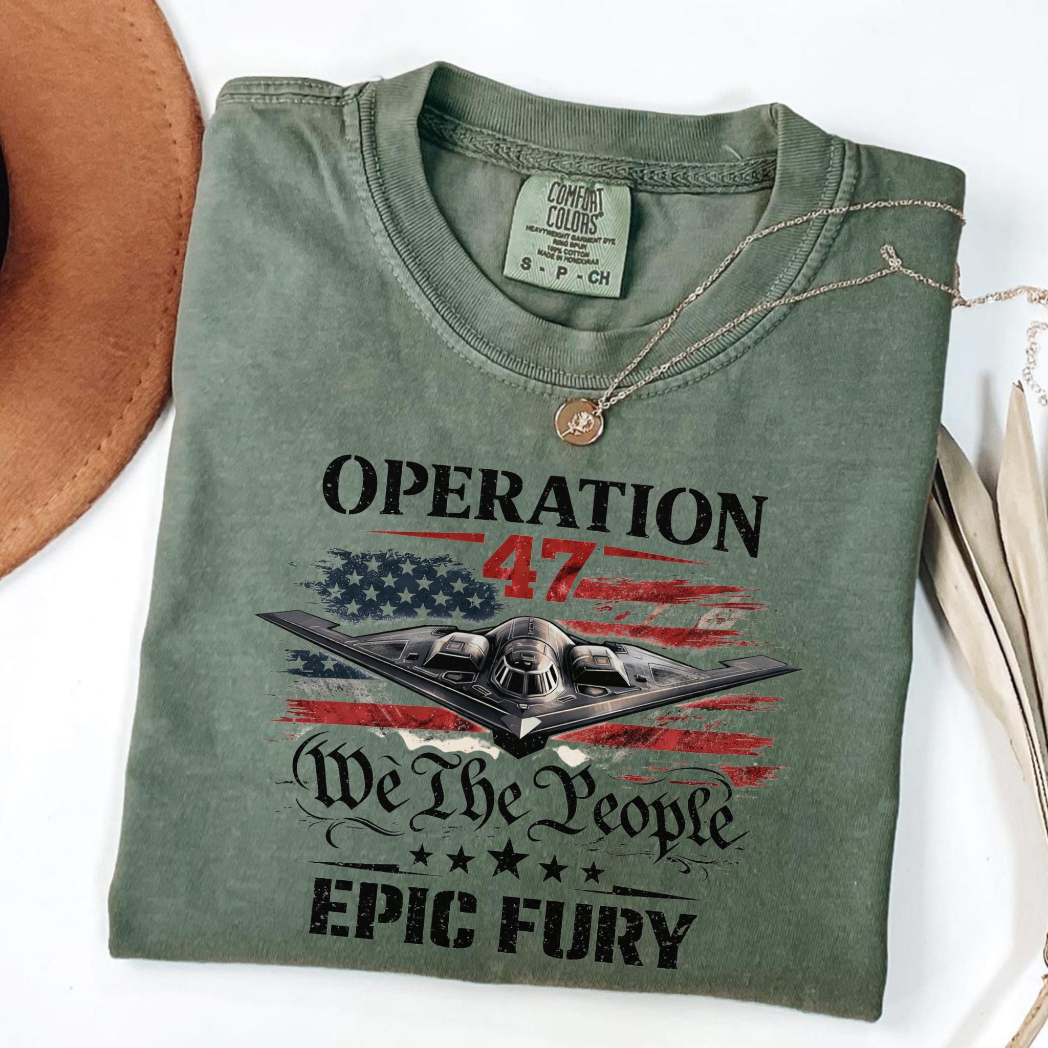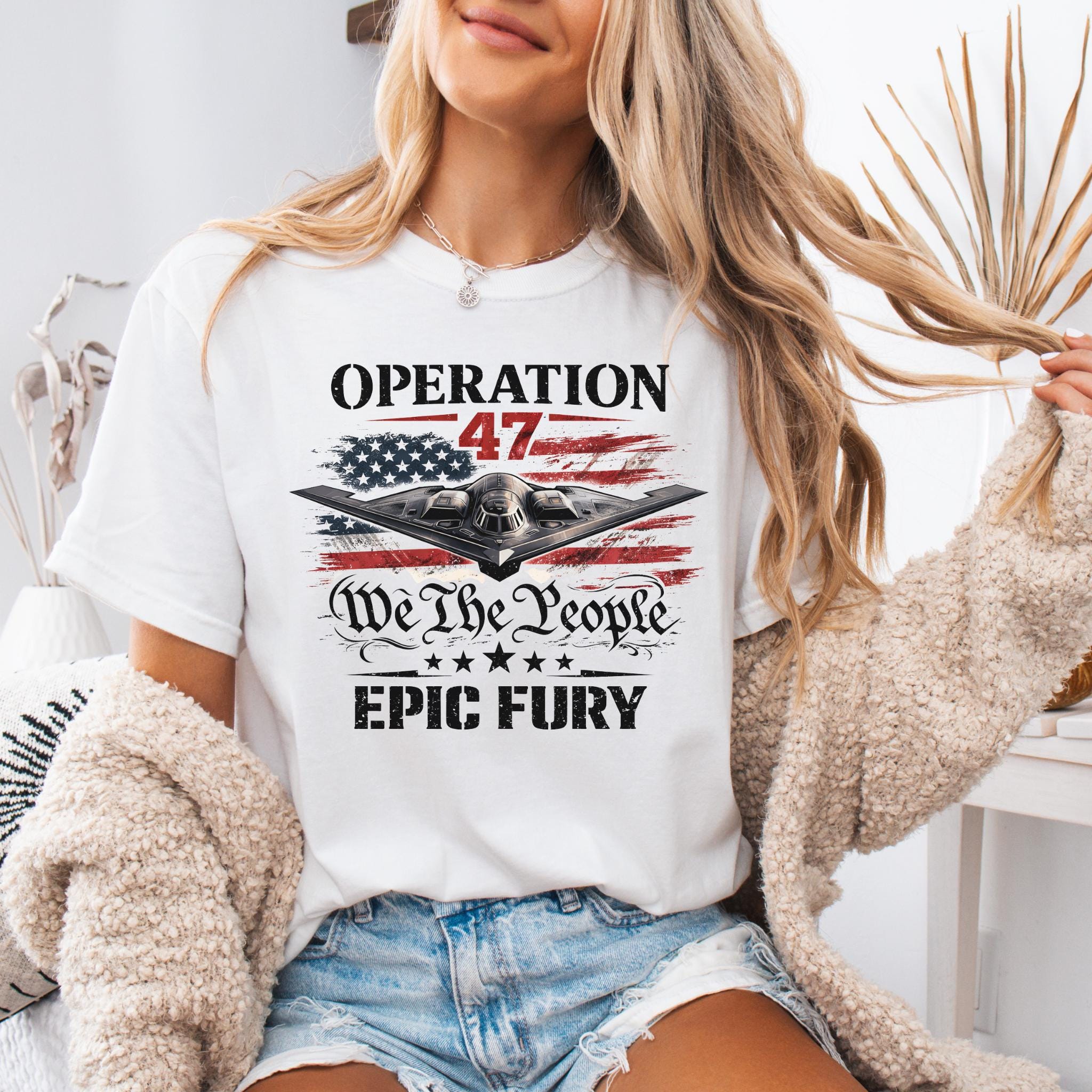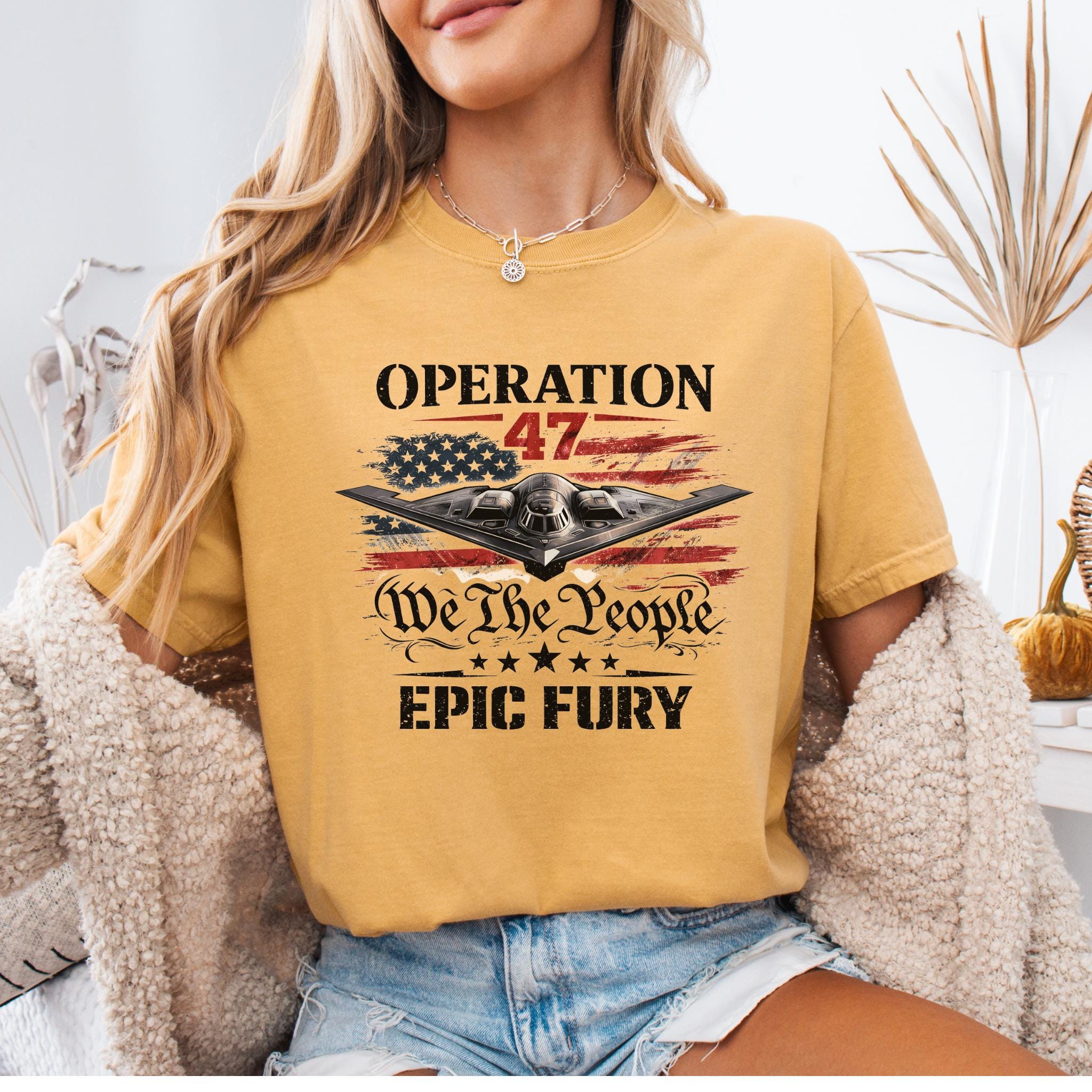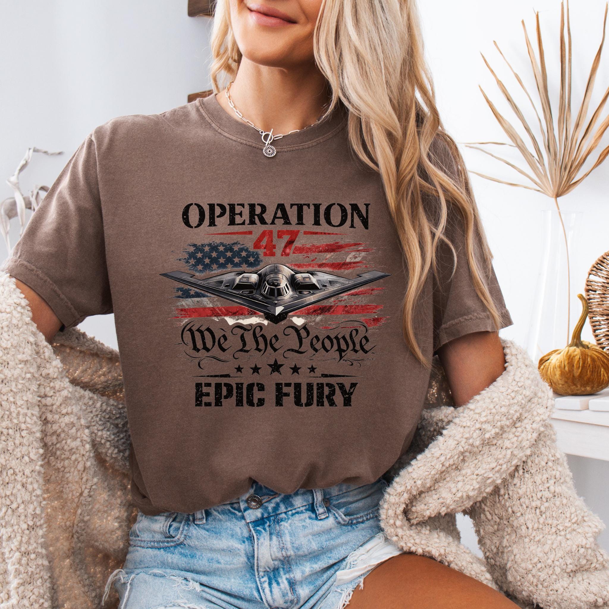 Show your patriotic spirit with this bold Operation 47 patriotic aviation shirt featuring a powerful stealth aircraft flying over a distressed American flag.