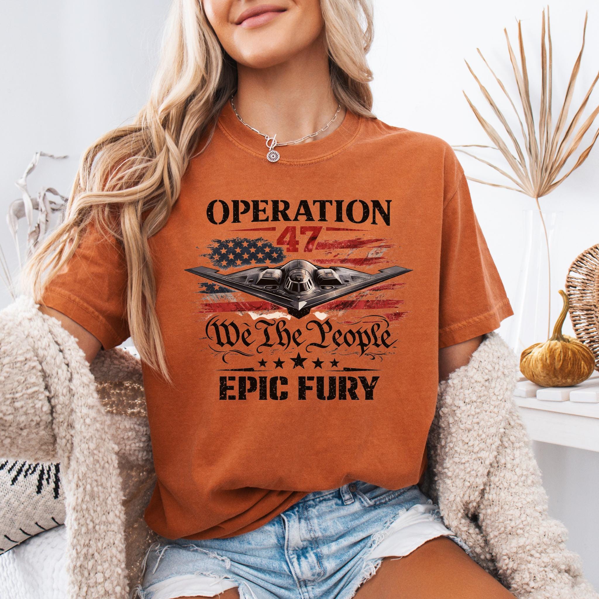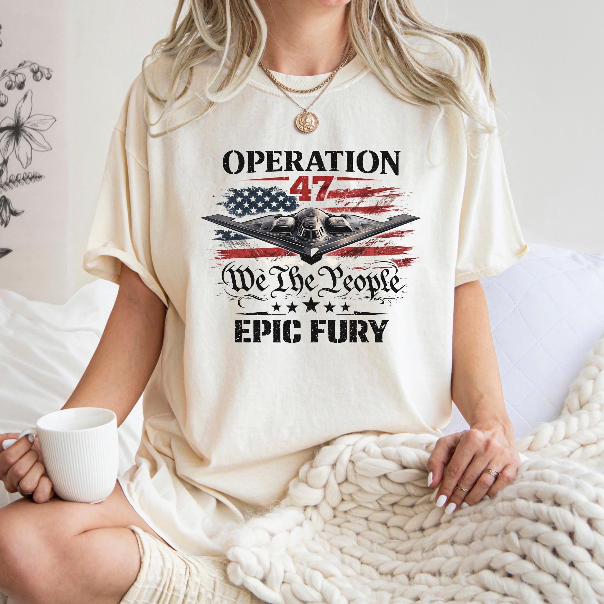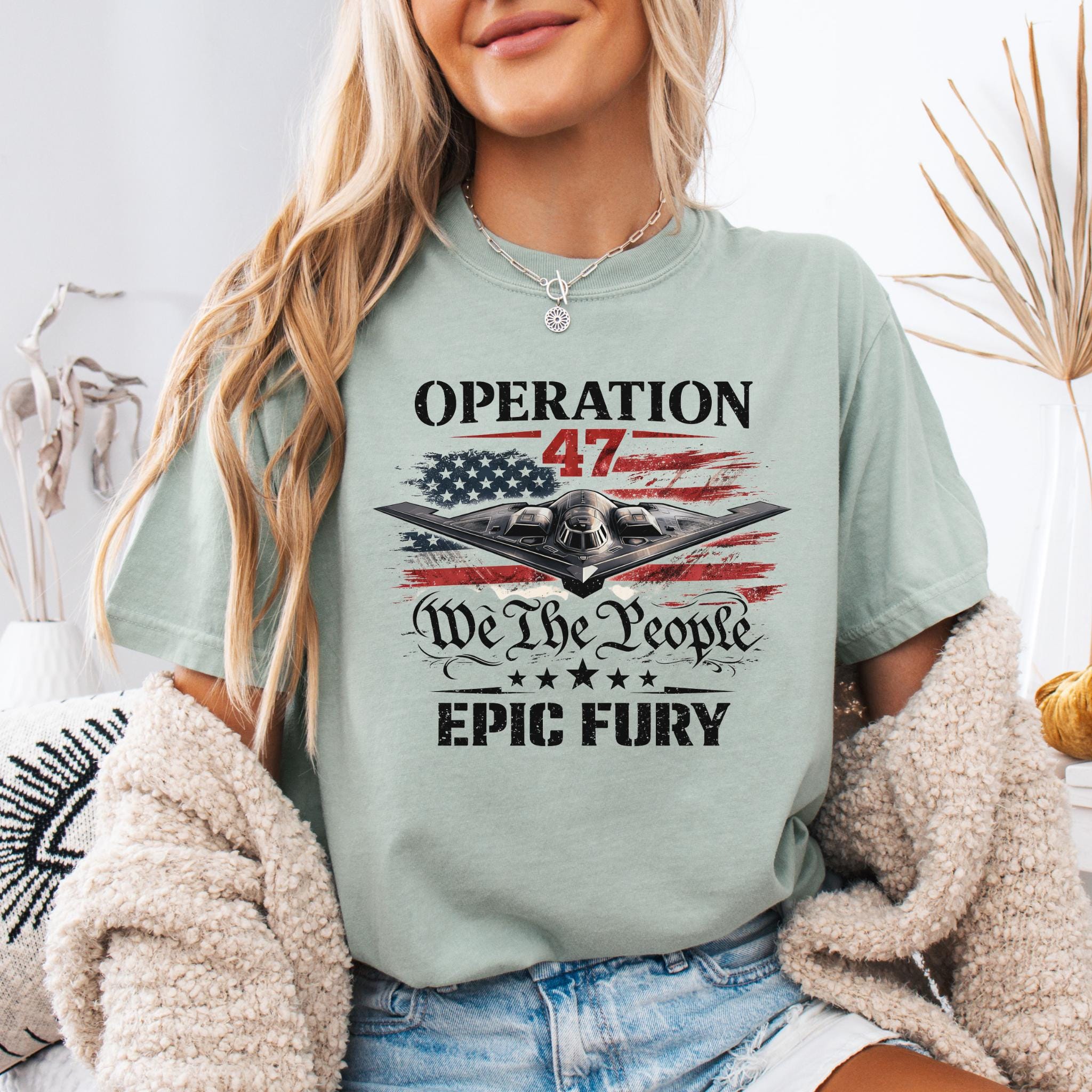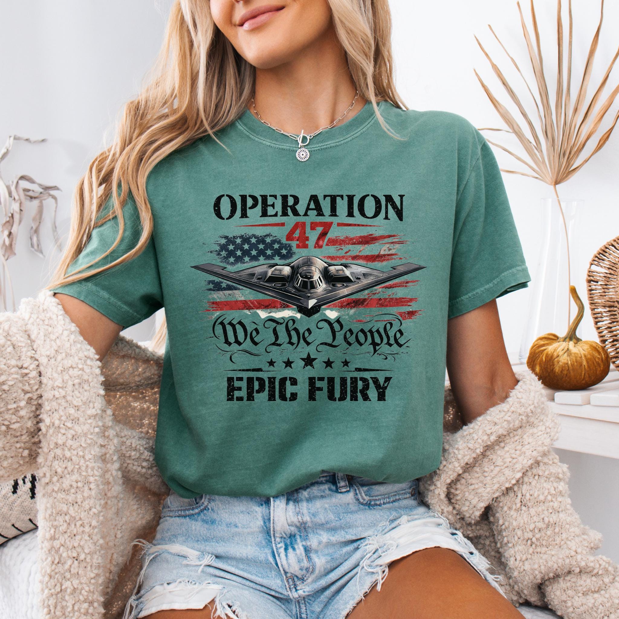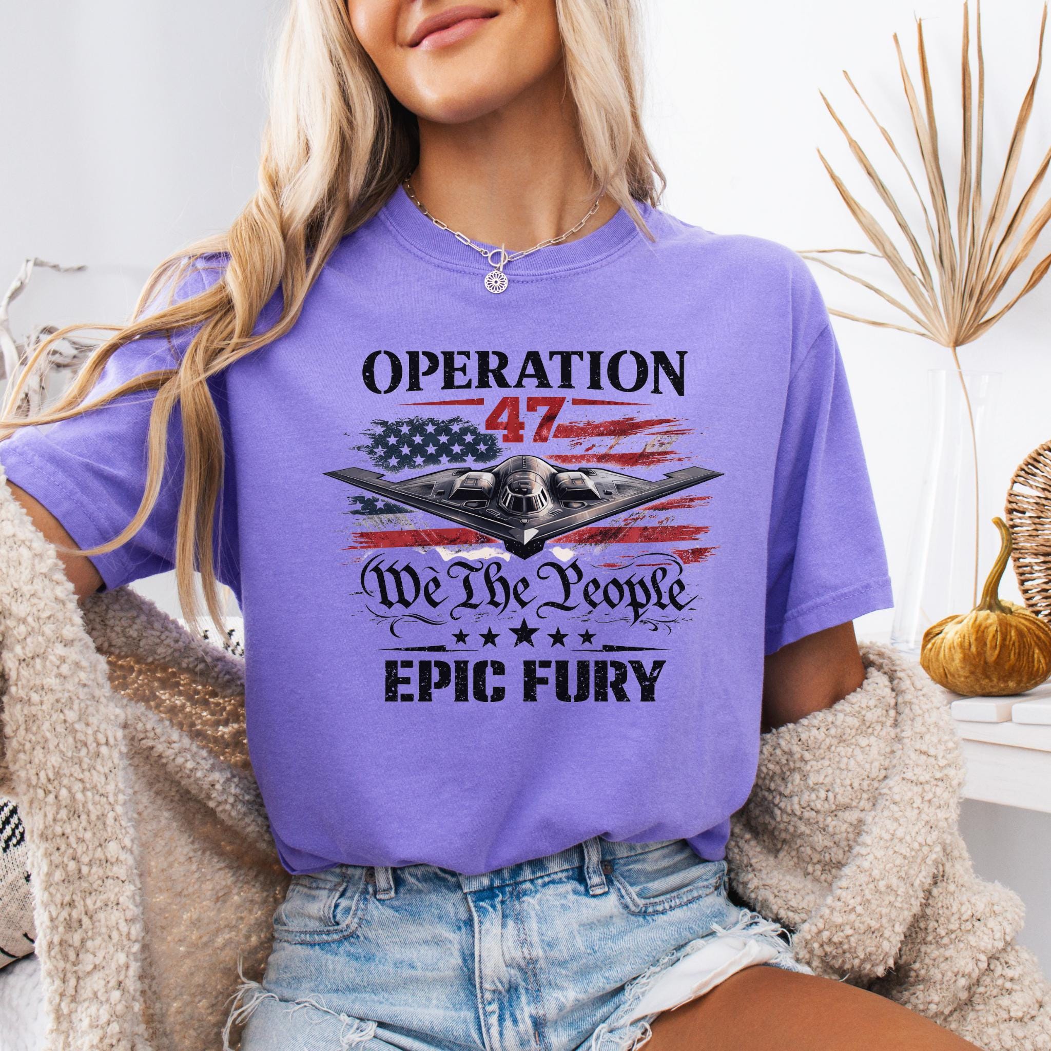 Show your patriotic spirit with this bold Operation 47 patriotic aviation shirt featuring a powerful stealth aircraft flying over a distressed American flag.
