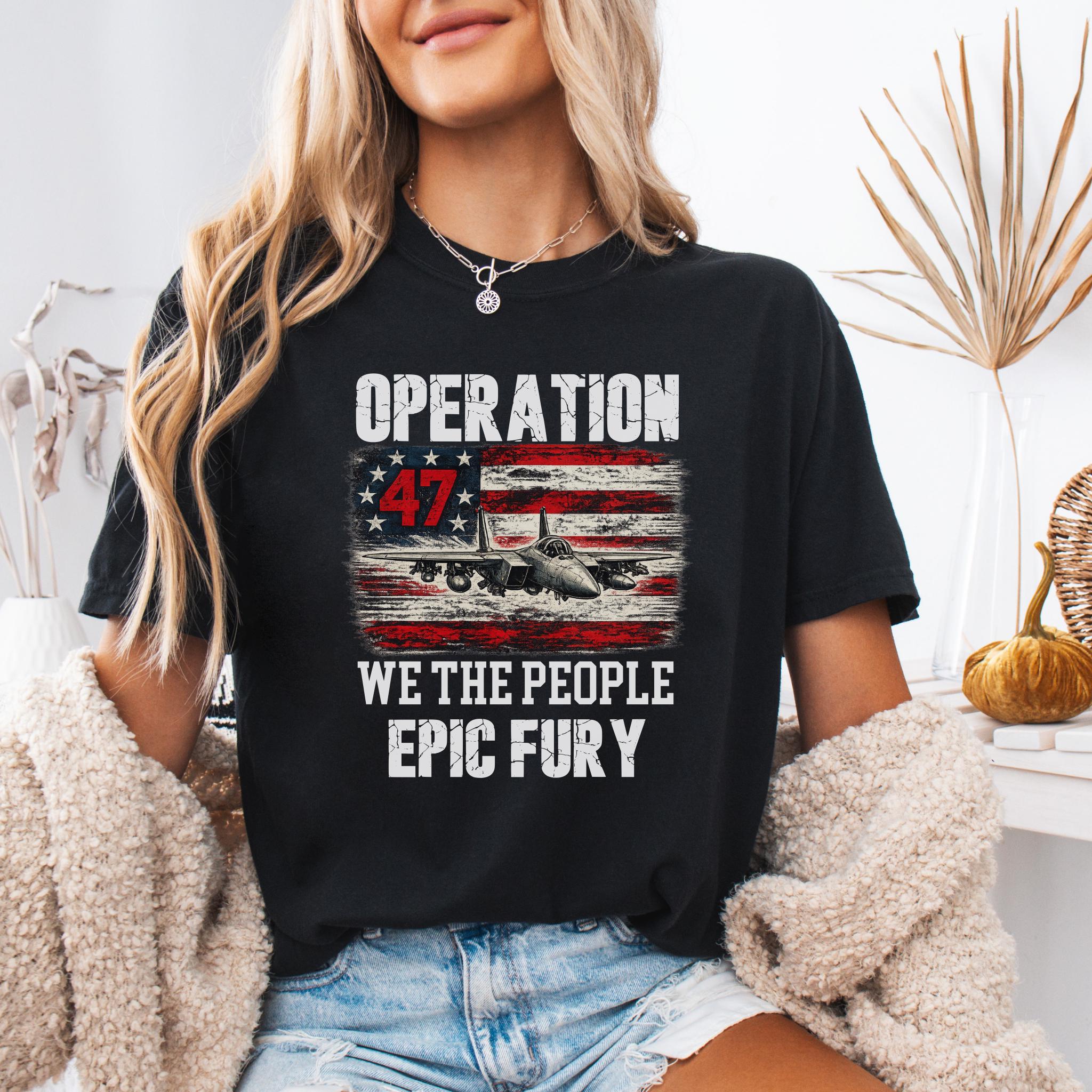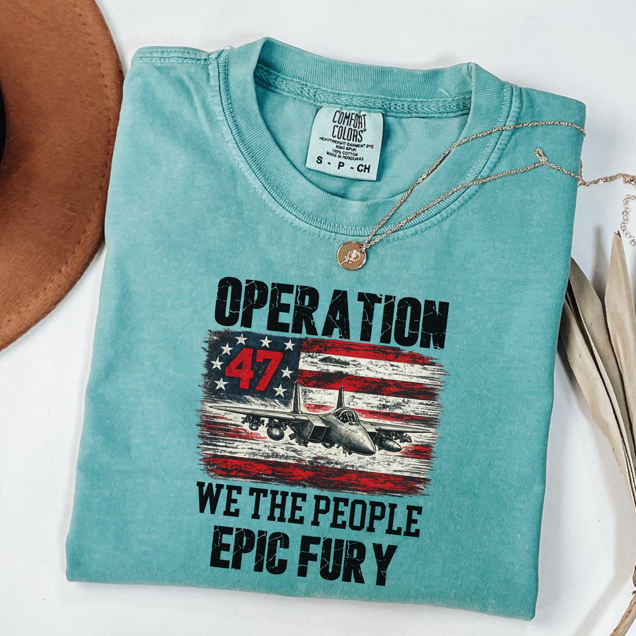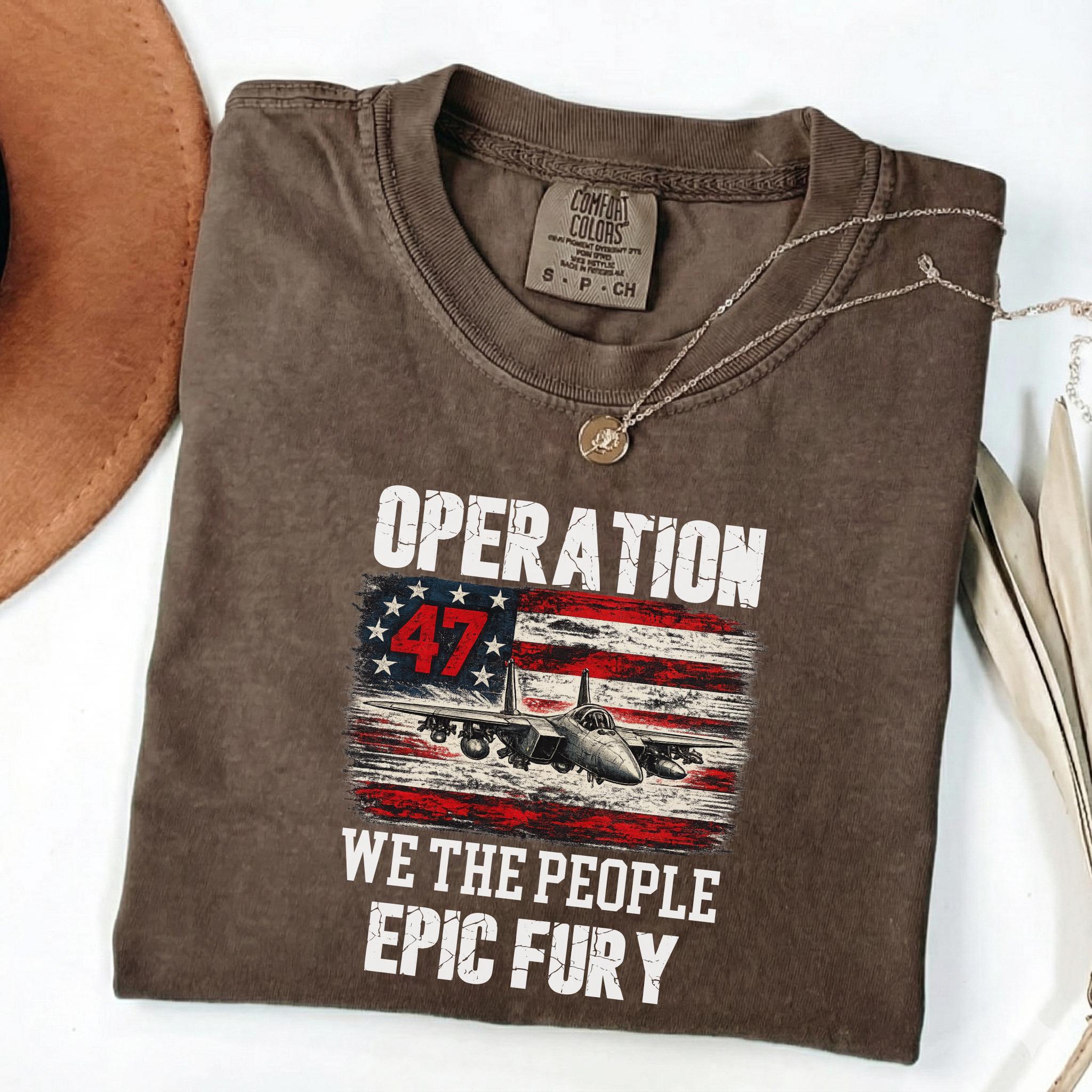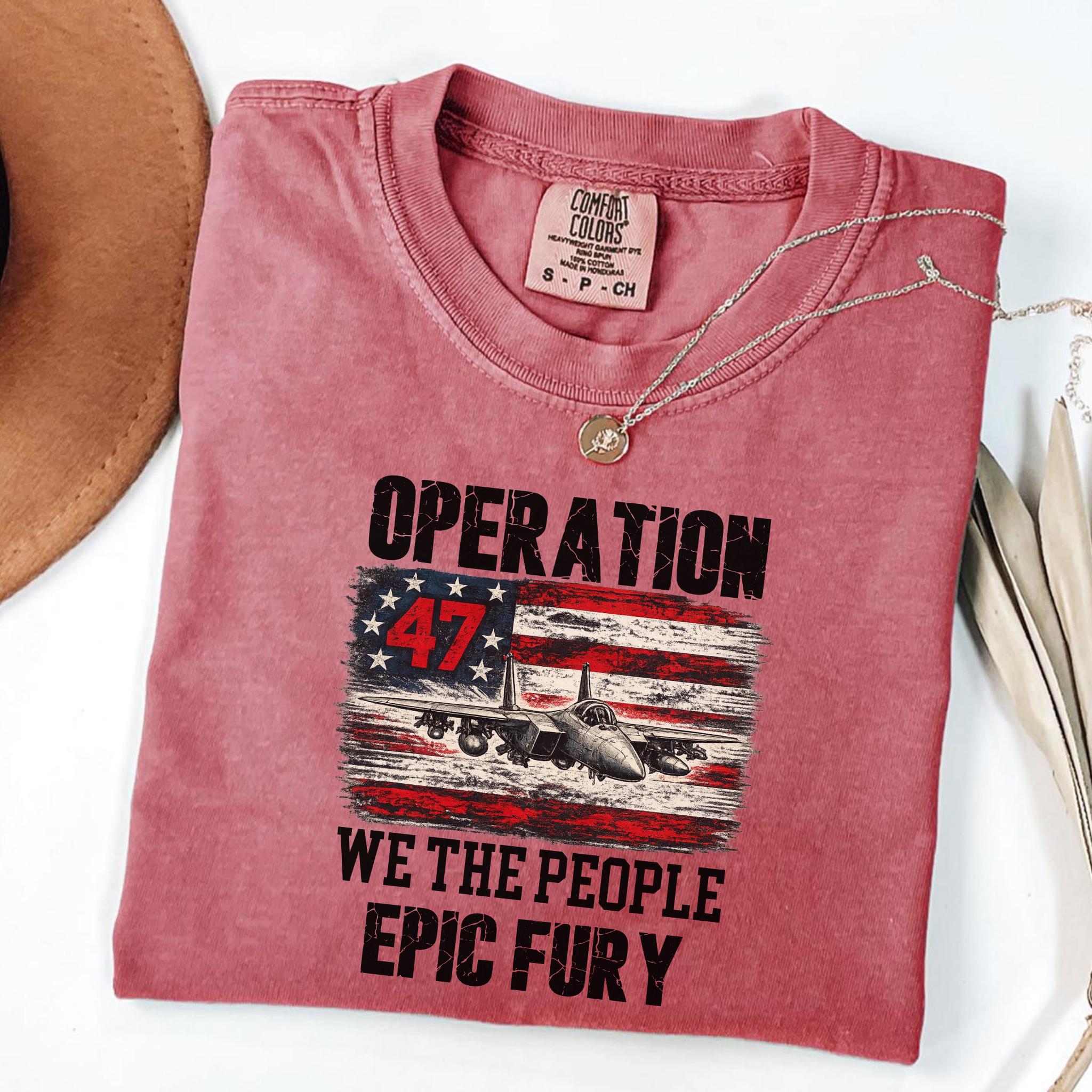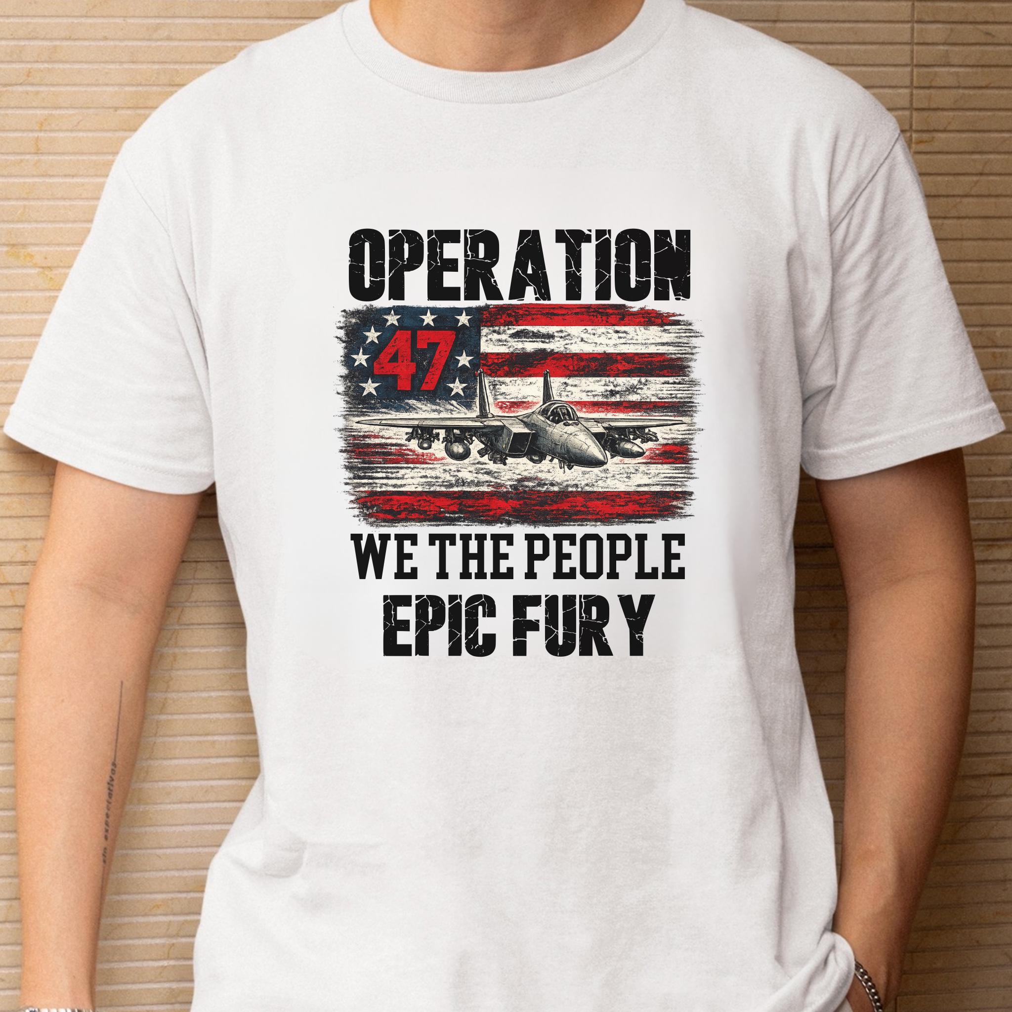 Make a bold patriotic statement with this Operation 47 graphic shirt featuring a fighter jet, distressed American flag artwork, and strong typography with We The People and Epic Fury text.